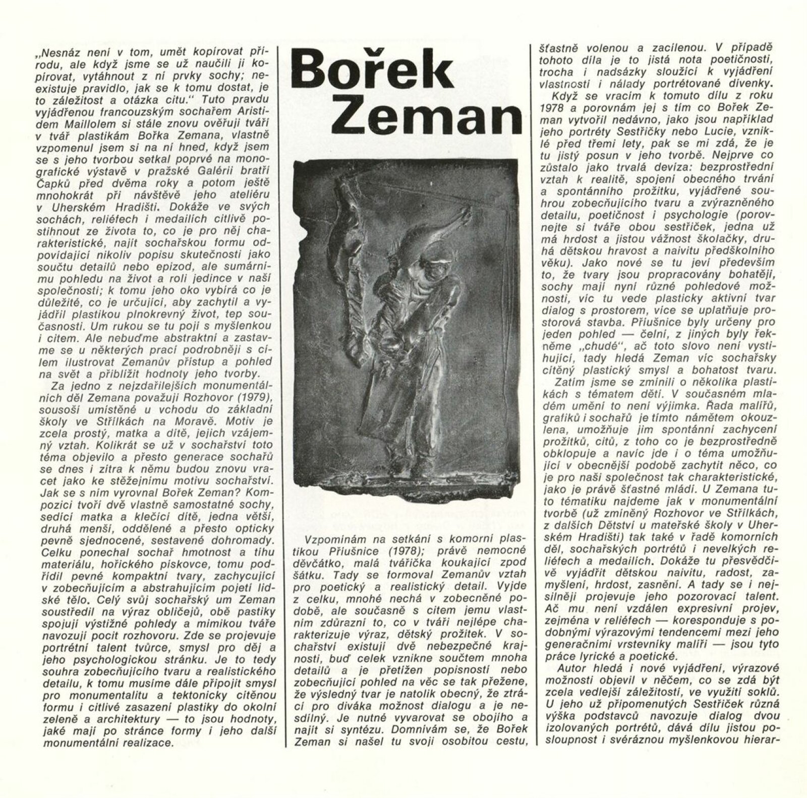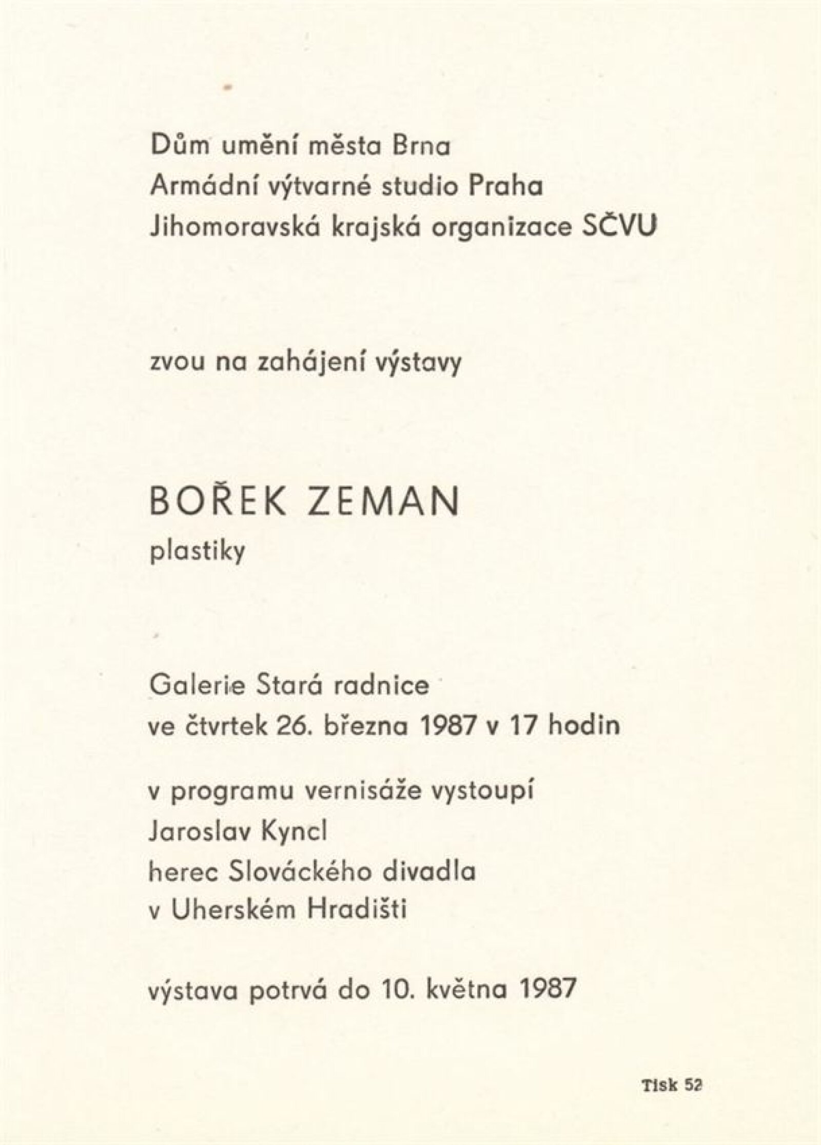 Bořek Zeman. [Plastiky: Galerie Stará radnice, 26. 3. – 10. 5. 1987] / Text :Peter Kováč. – Praha: Armádní výtvarné studio, 1986. – [12] s., obr., portrét, životní data, výstavy, realizace, zastoupení ve sbírkách, slavnostní otevření galerie, GSR 1. – MMB