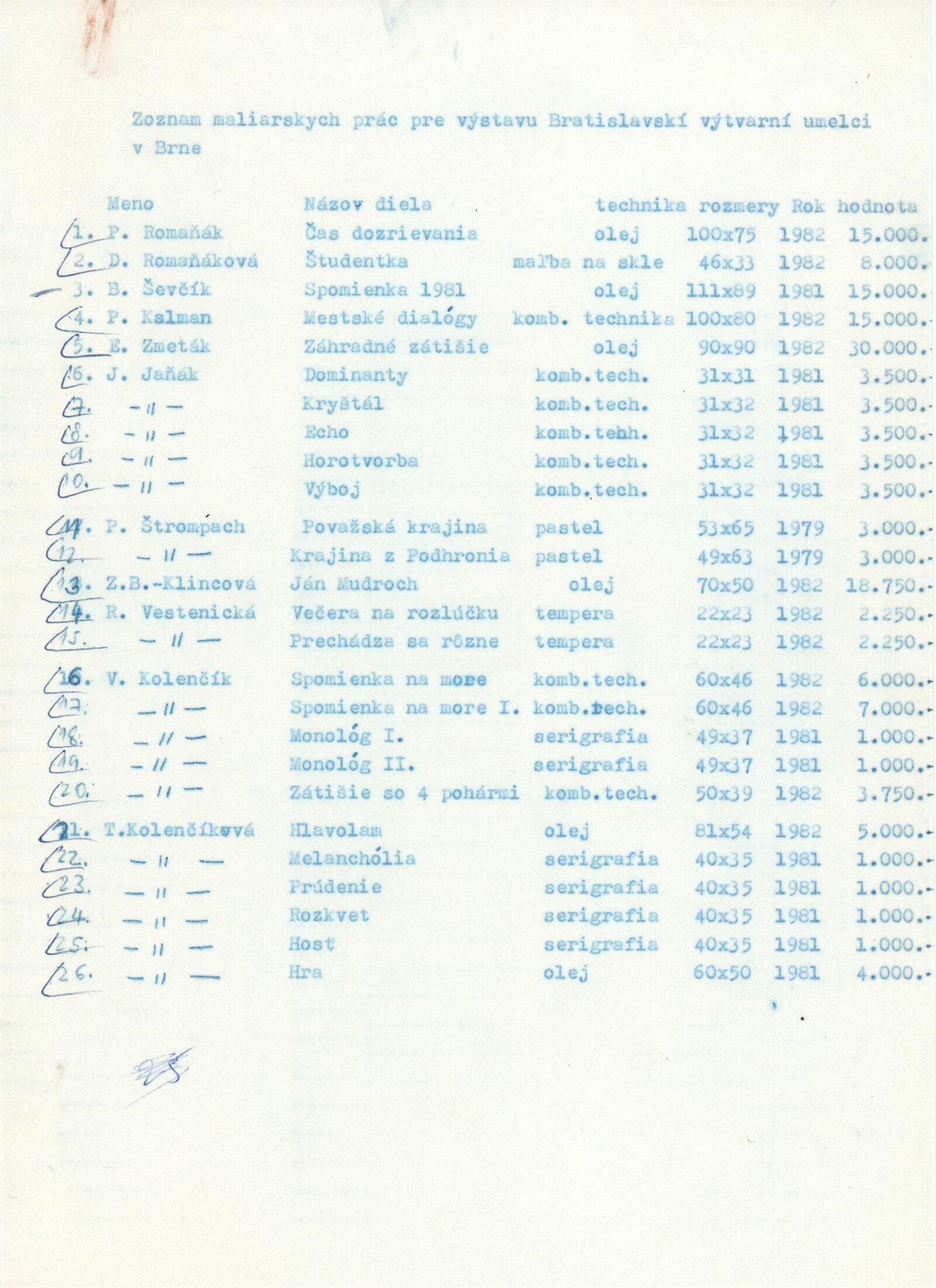 pozvánka, seznam vystavených děl, provozní korespondence, dopis ZSVU 8. 12. 1982, zápis o převzetí vypůjčených děl, recenze v tisku, katalog z celostátní přehlídky Tvorba mladých 1982