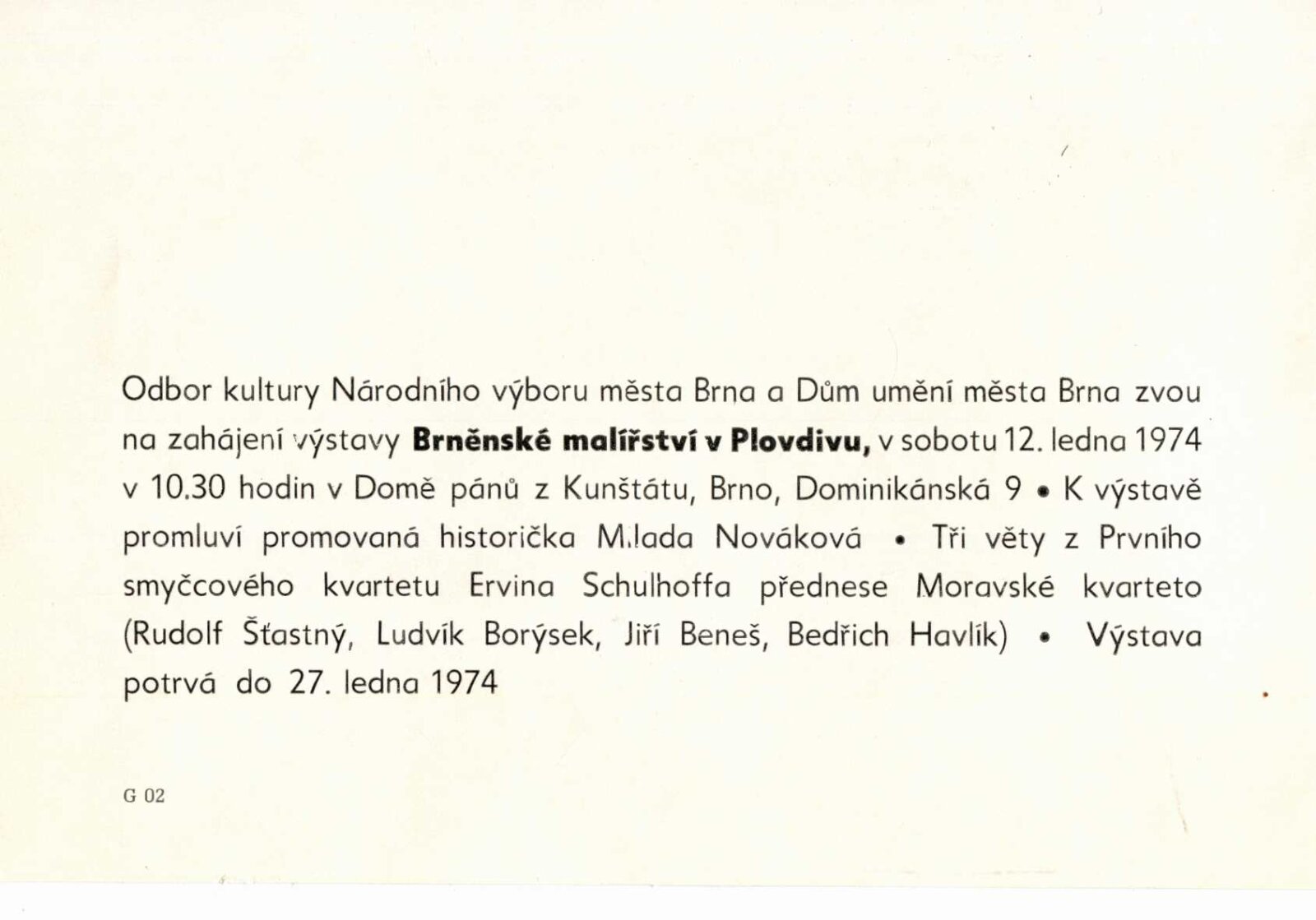 Brněnské malířství v Plovdivu: Dům umění / Dům pánů z Kunštátu, 12. 1. – 3. 2. 1974 / Text: Milada Nováková. – Brno: DUmB, 1973. – 18 s., obr., DPK 560