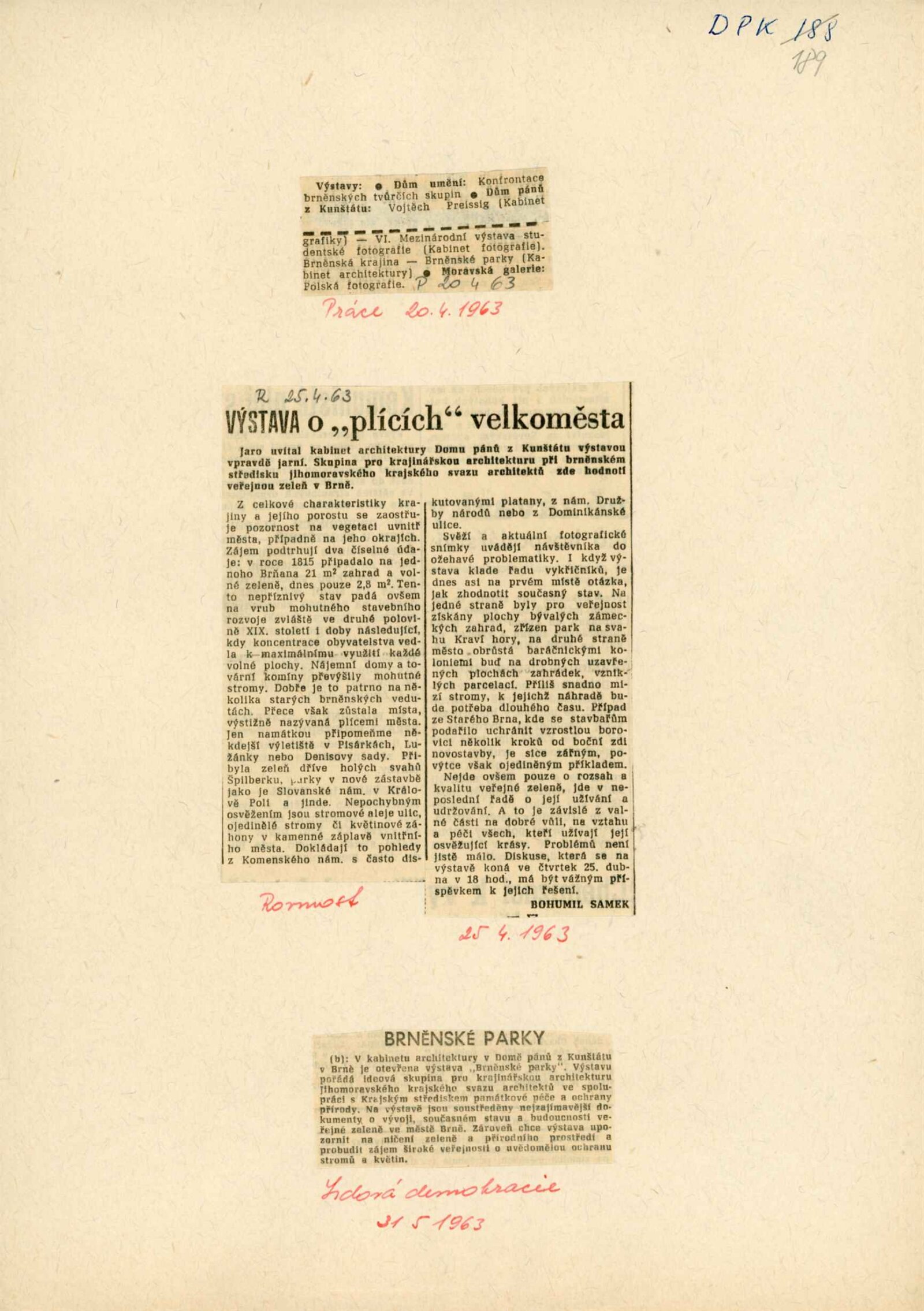 Brněnské parky. Výstava o vývoji a významu veřejné zeleně v Brně: Dům umění města Brna / Dům pánů z Kunštátu, 30. výstava Kabinetu architektury Svazu architektů ČSSR, 5. 4. – 2. 6. 1963 / Brno: Svaz architektů ČSSR, 1963. – 4 s., obr., DPK 189. – MG
