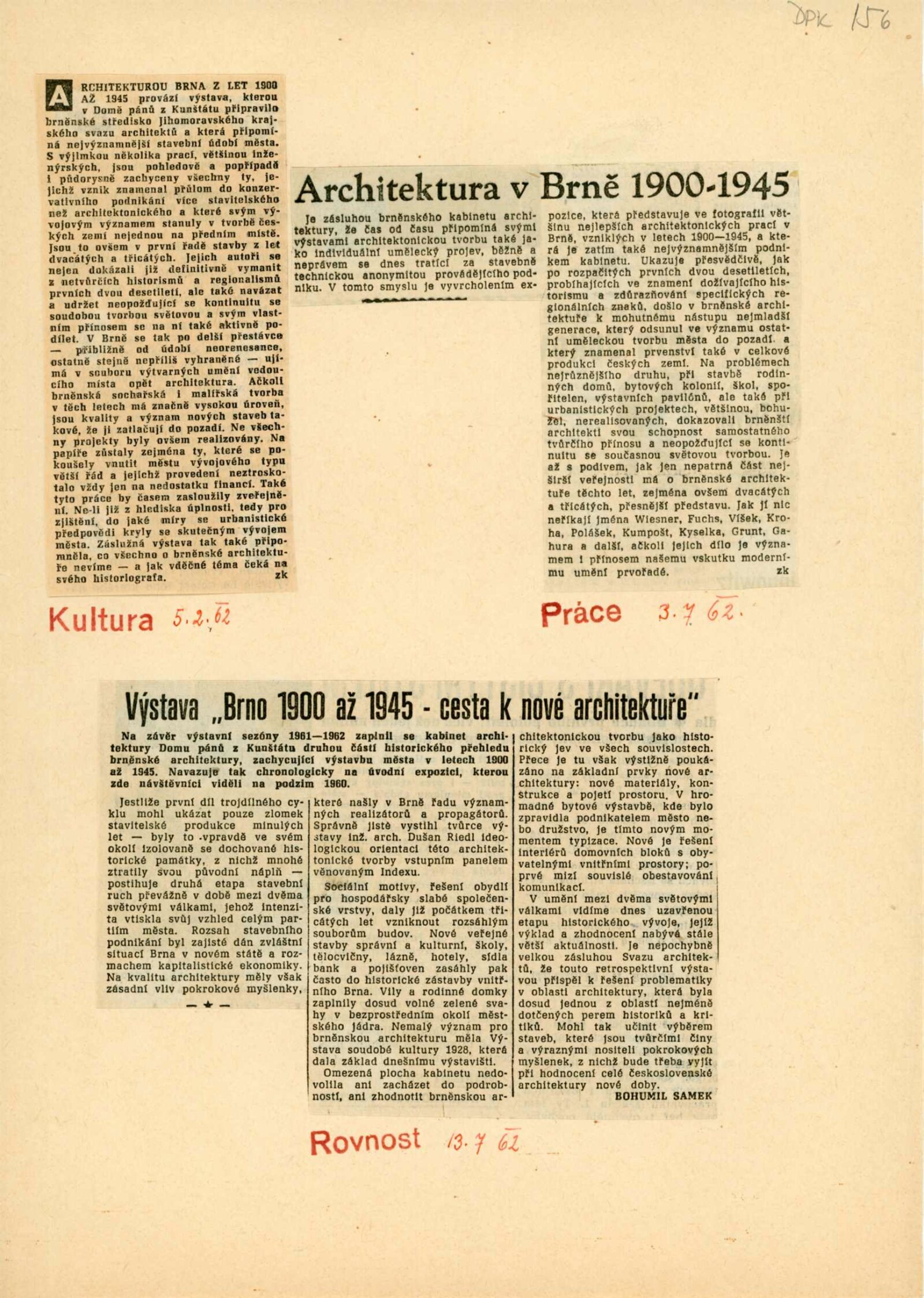 Brno 1900–1945. Cesta k nové architektuře: Dům umění města Brna / Dům pánů z Kunštátu, 25. výstava Kabinetu architektury Svazu architektů ČSSR, 8. 6. – 15. 7. 1962 / Brno: Svaz architektů ČSSR, 1962. – 4 s., obr., DPK 156