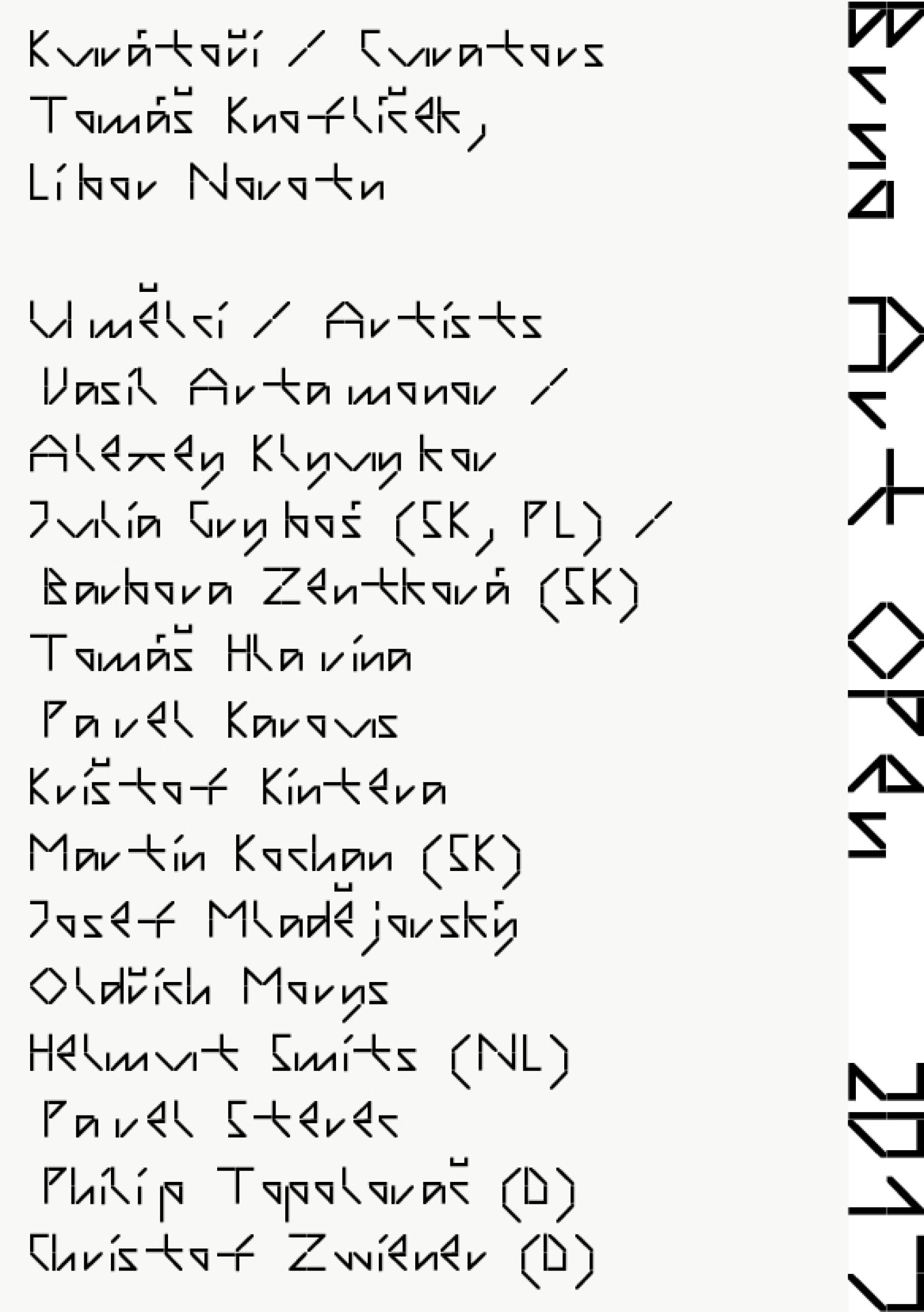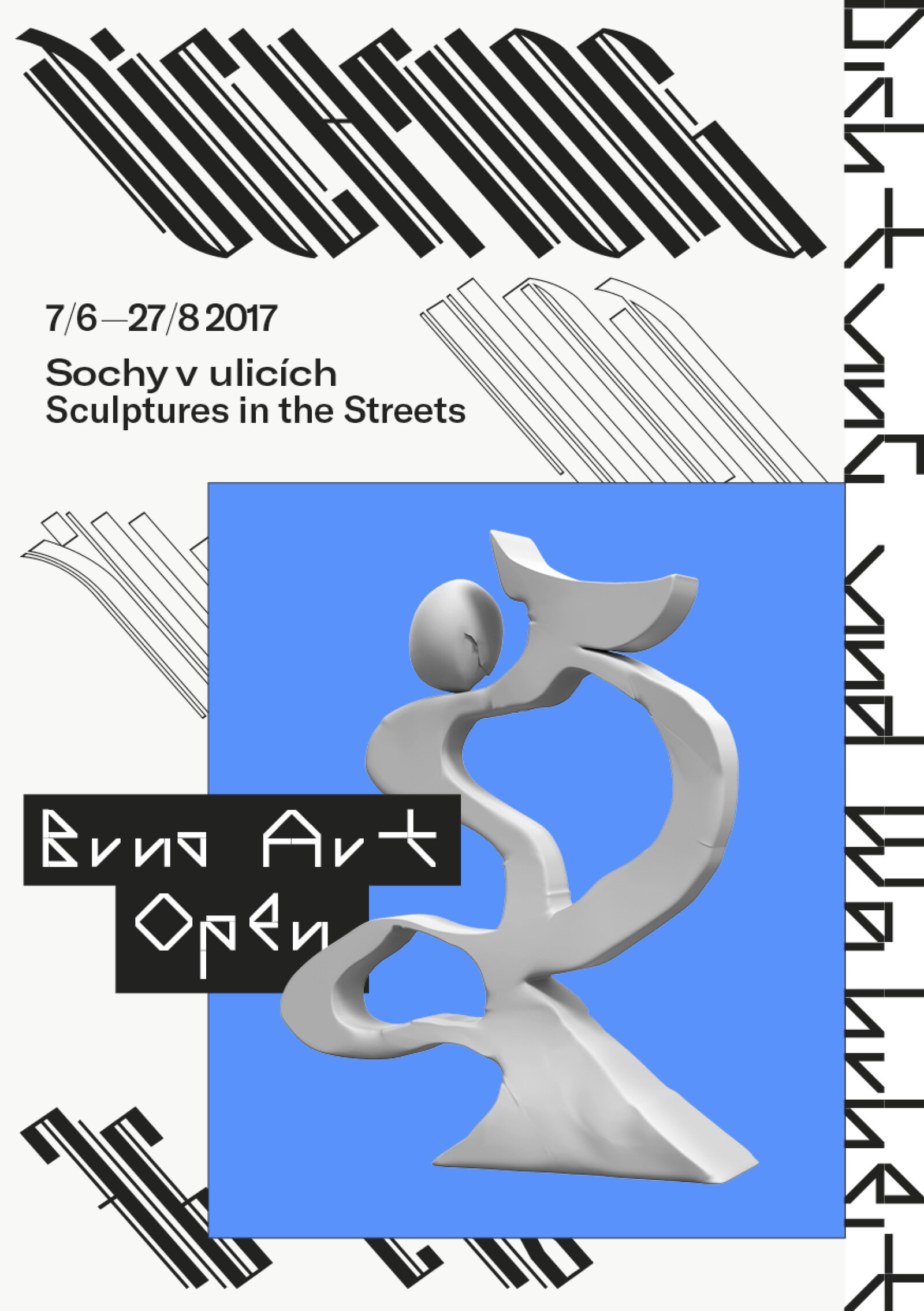 The sixth edition of the festival Sculptures in the Streets (BAO 2017), with the motto “Poetry and Truth”, logically follows up on the intention of the previous years to develop on the theme of “visual art and its function in public space”. The BAO 2017 artistic concept comes from Marek Pokorný, former director of the Moravian Gallery in Brno and present artistic manager of Plato Gallery in Ostrava. He has decided to invite for collaboration curators Tomáš Knoflíček and Libor Novotný, founders and authors of a similar event named Kukačka (Cuckoo) and held since 2010 in Ostrava, albeit without stable institutional background. The festival will introduce thirteen Czech and Slovak artists (Krištof Kintera, Pavel Sterec, Pavel Karous, Martin Kochan, among others) and three international ones.