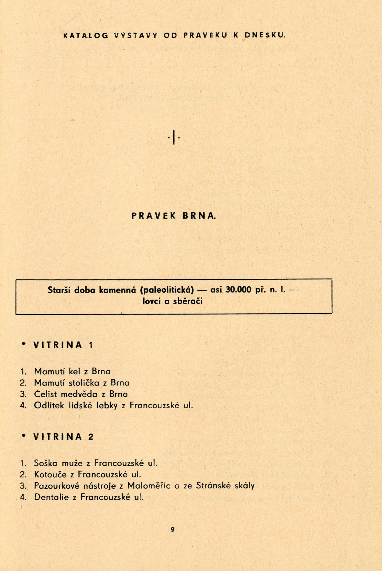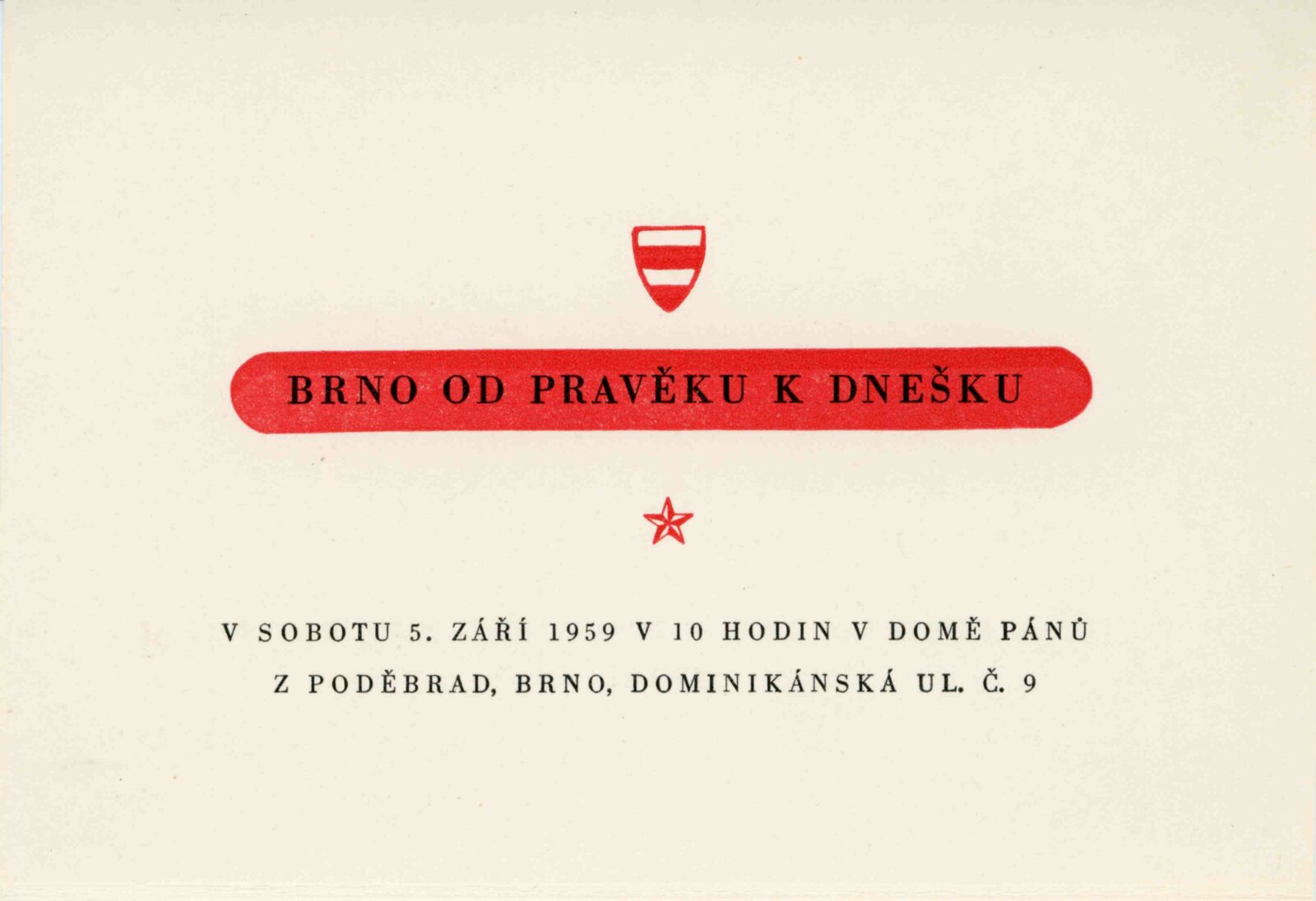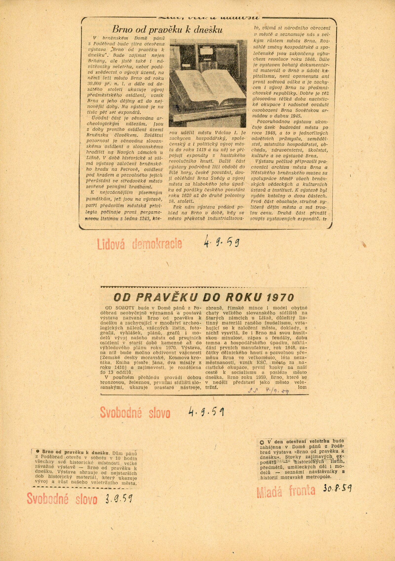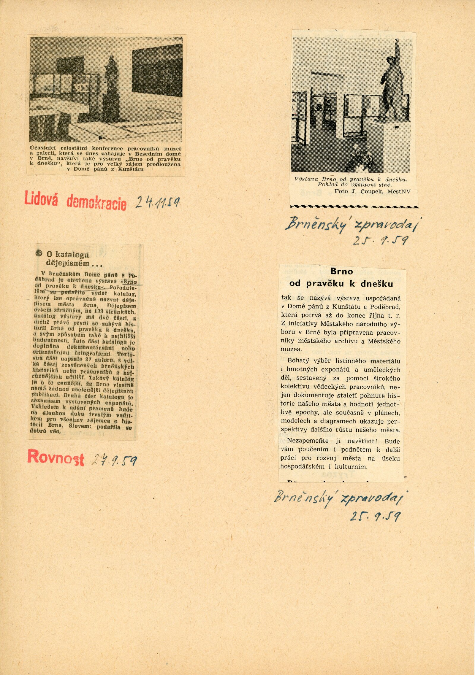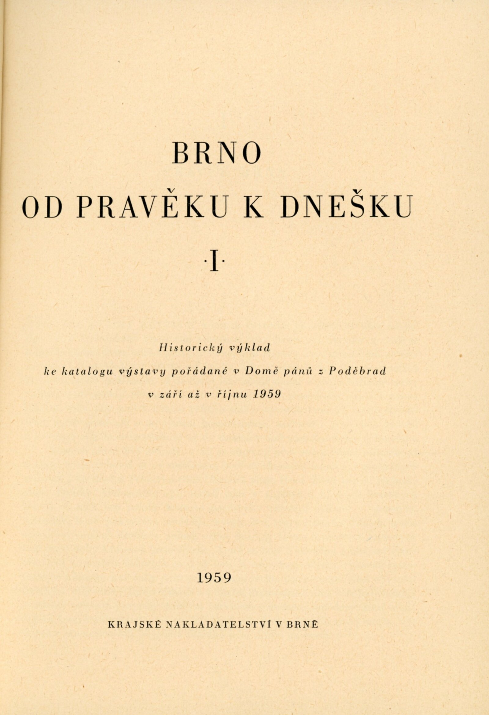 Brno od pravěku k dnešku: Dům umění města Brna / Dům pánů z Kunštátu, 6. 9. – 26. 11. 1959 / 1. Historický výklad ke katalogu výstavy pořádané v Domě pánů z Poděbrad v září až v říjnu 1959. – Brno: Krajské nakladatelství pro Archiv města Brna, 1959. – 133 s., 8 s. obr. příl. / Brno od pravěku k dnešku. 2. Seznam exponátů výstavy pořádané v Domě pánů z Poděbrad v září a v říjnu 1959. – Brno: Krajské nakladatelství pro Archiv města Brna, 1959. – 102 s., DPK 45. – MZK