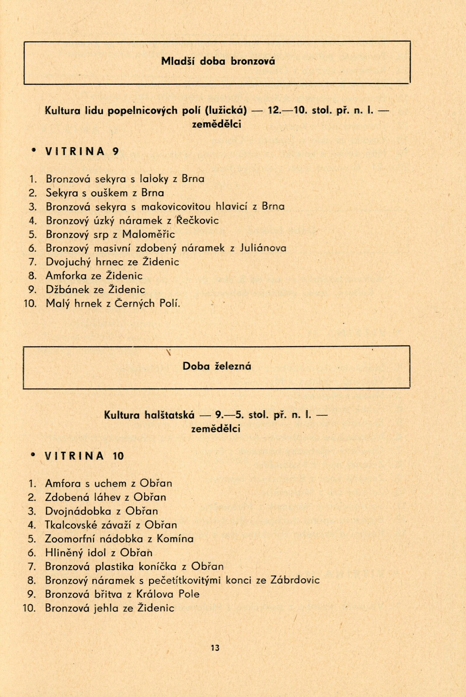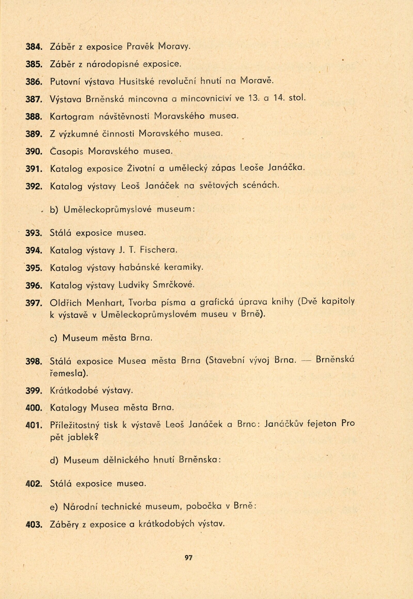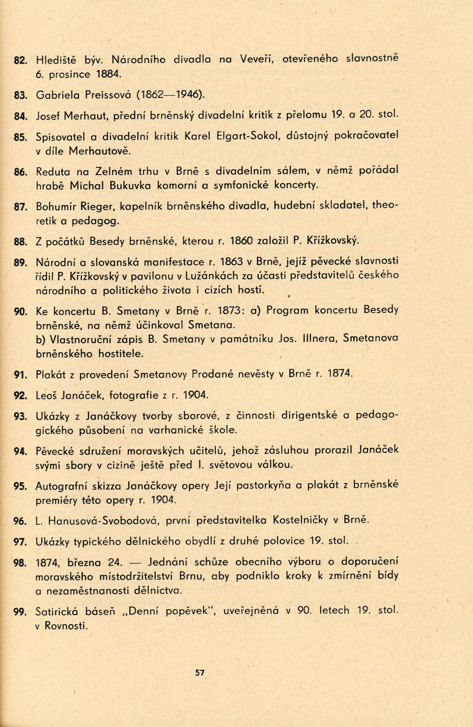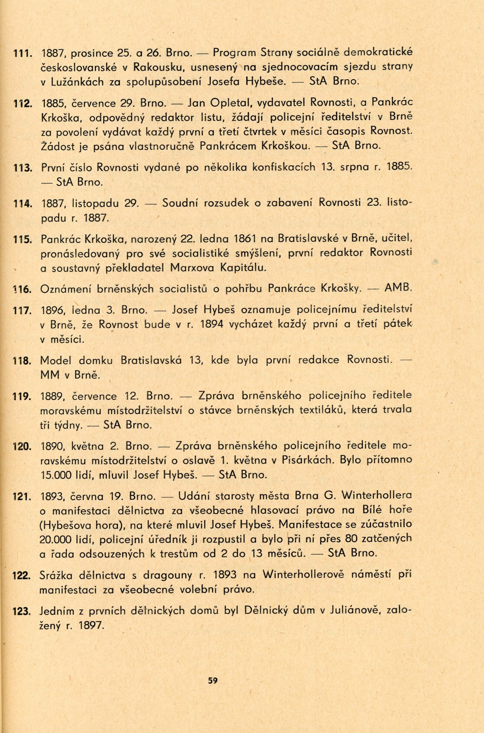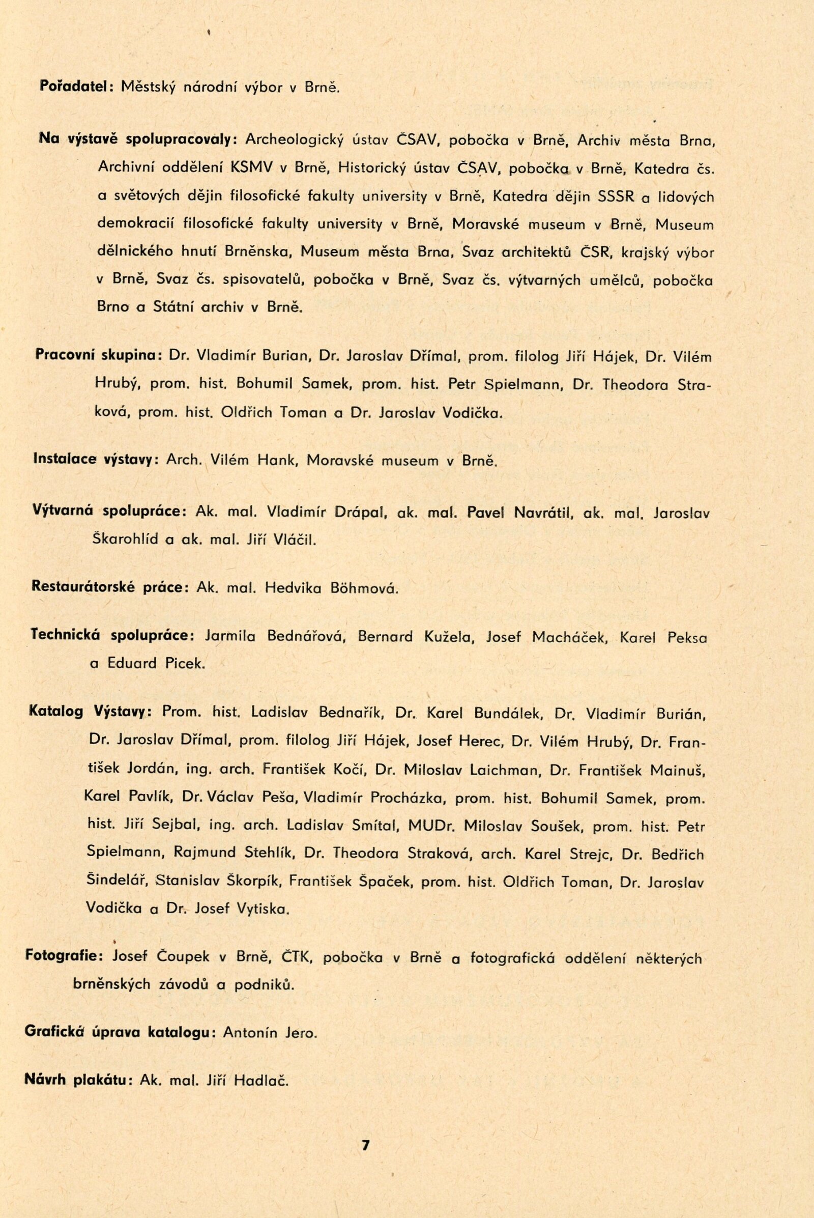 Brno od pravěku k dnešku: Dům umění města Brna / Dům pánů z Kunštátu, 6. 9. – 26. 11. 1959 / 1. Historický výklad ke katalogu výstavy pořádané v Domě pánů z Poděbrad v září až v říjnu 1959. – Brno: Krajské nakladatelství pro Archiv města Brna, 1959. – 133 s., 8 s. obr. příl. / Brno od pravěku k dnešku. 2. Seznam exponátů výstavy pořádané v Domě pánů z Poděbrad v září a v říjnu 1959. – Brno: Krajské nakladatelství pro Archiv města Brna, 1959. – 102 s., DPK 45. – MZK