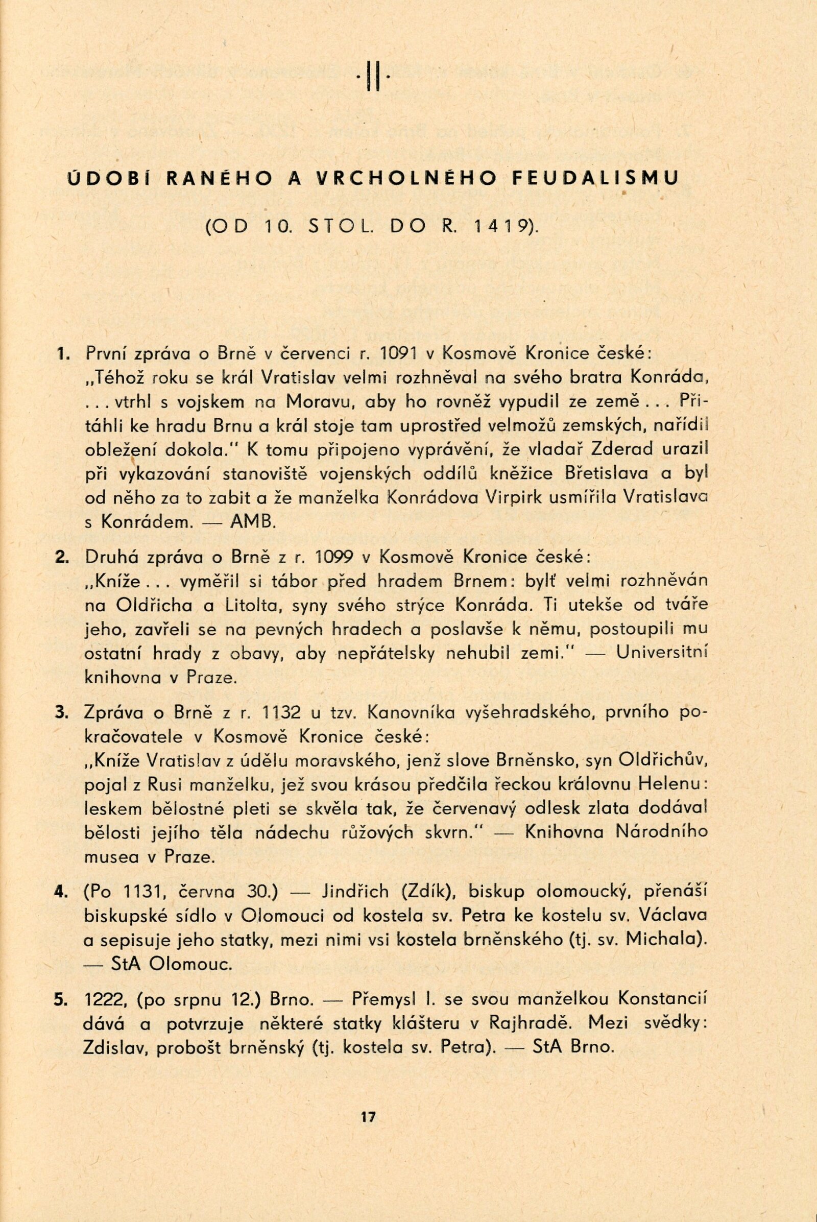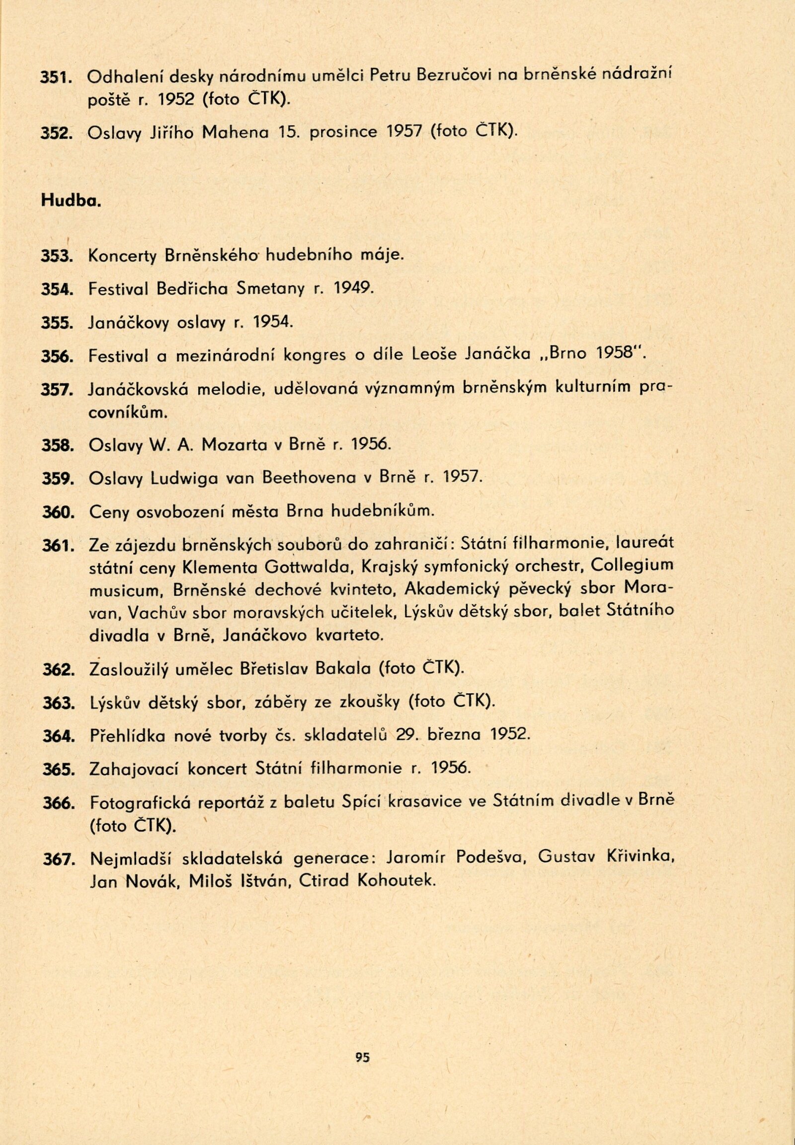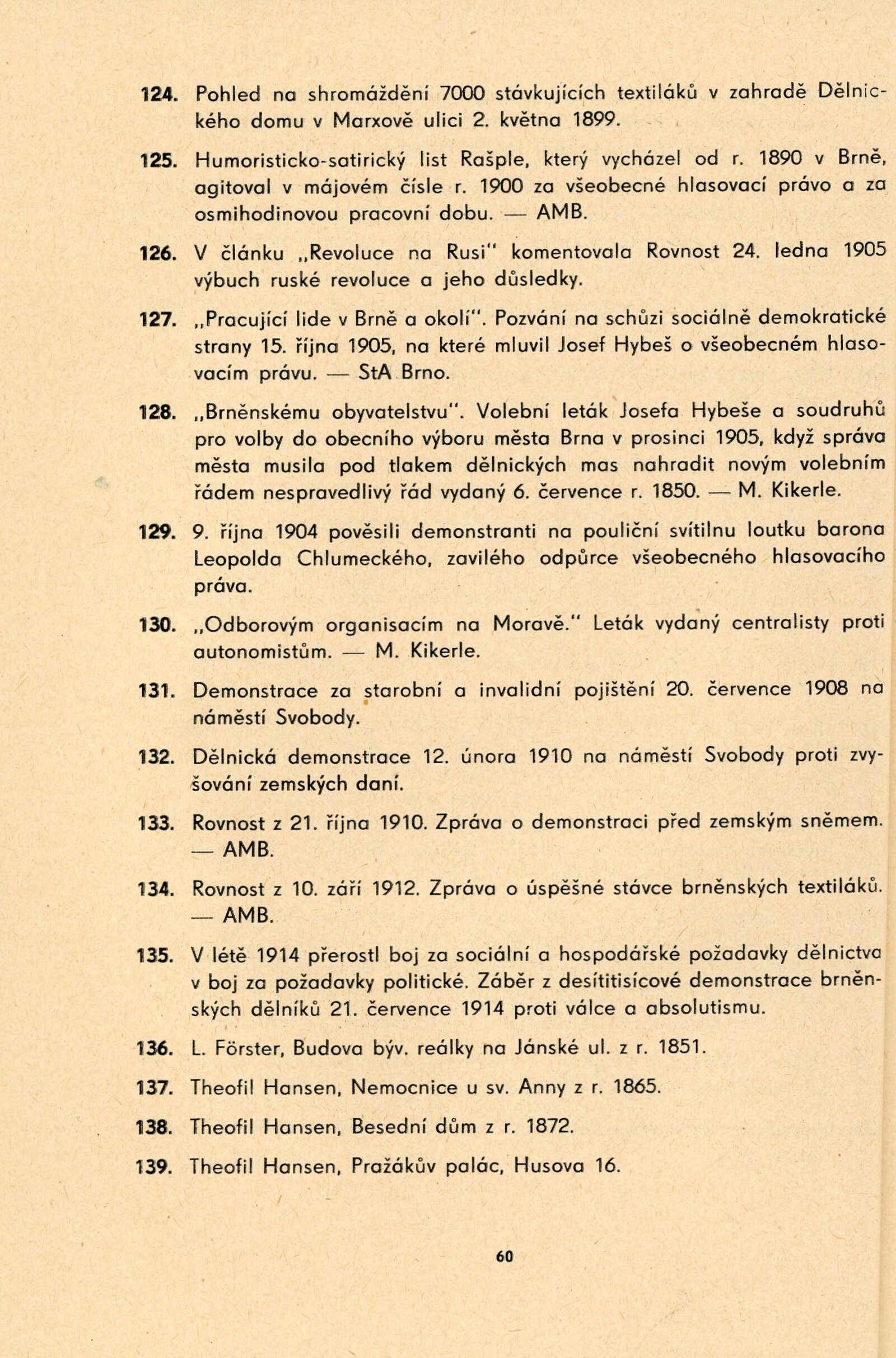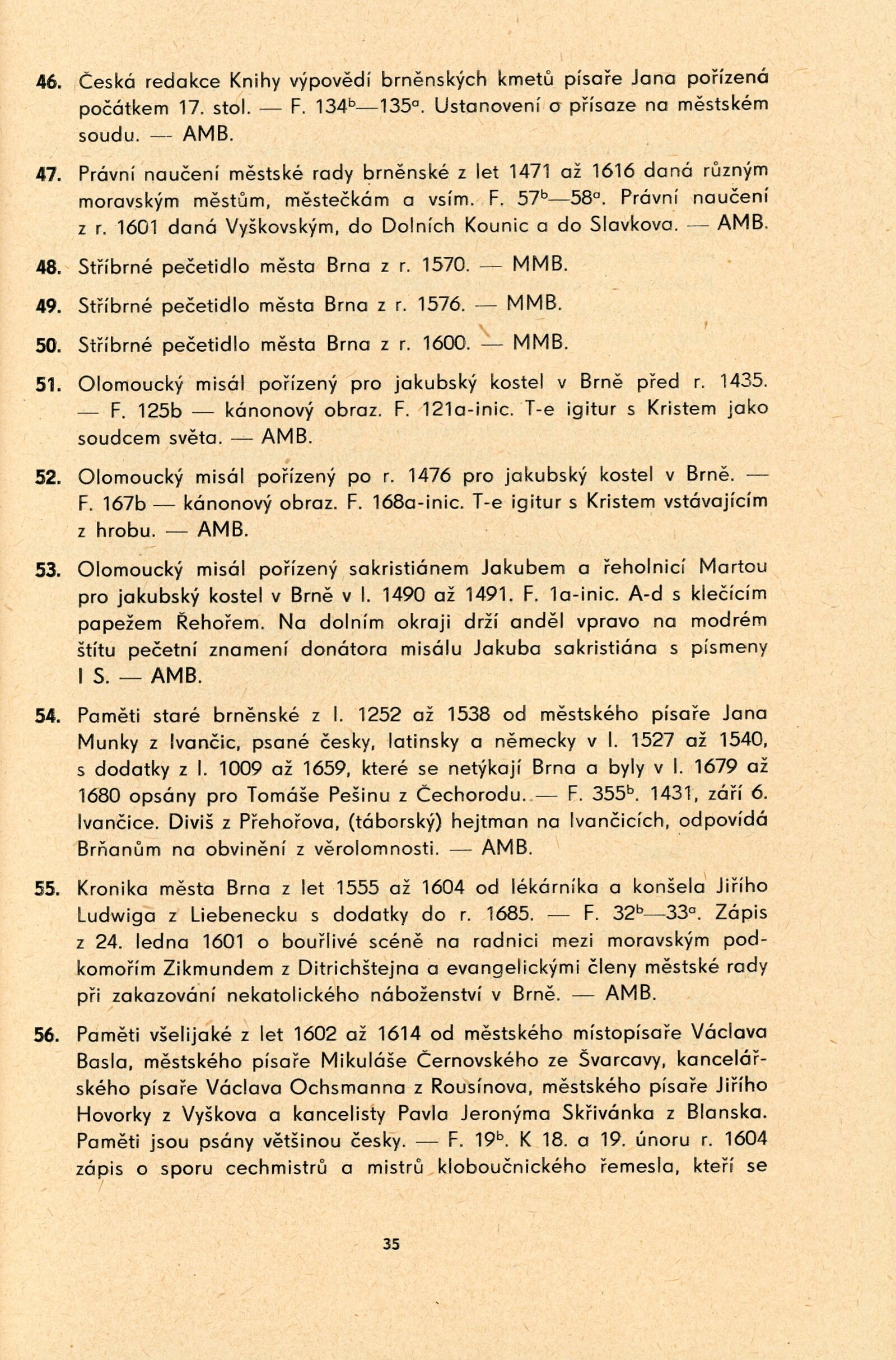 Brno od pravěku k dnešku: Dům umění města Brna / Dům pánů z Kunštátu, 6. 9. – 26. 11. 1959 / 1. Historický výklad ke katalogu výstavy pořádané v Domě pánů z Poděbrad v září až v říjnu 1959. – Brno: Krajské nakladatelství pro Archiv města Brna, 1959. – 133 s., 8 s. obr. příl. / Brno od pravěku k dnešku. 2. Seznam exponátů výstavy pořádané v Domě pánů z Poděbrad v září a v říjnu 1959. – Brno: Krajské nakladatelství pro Archiv města Brna, 1959. – 102 s., DPK 45. – MZK