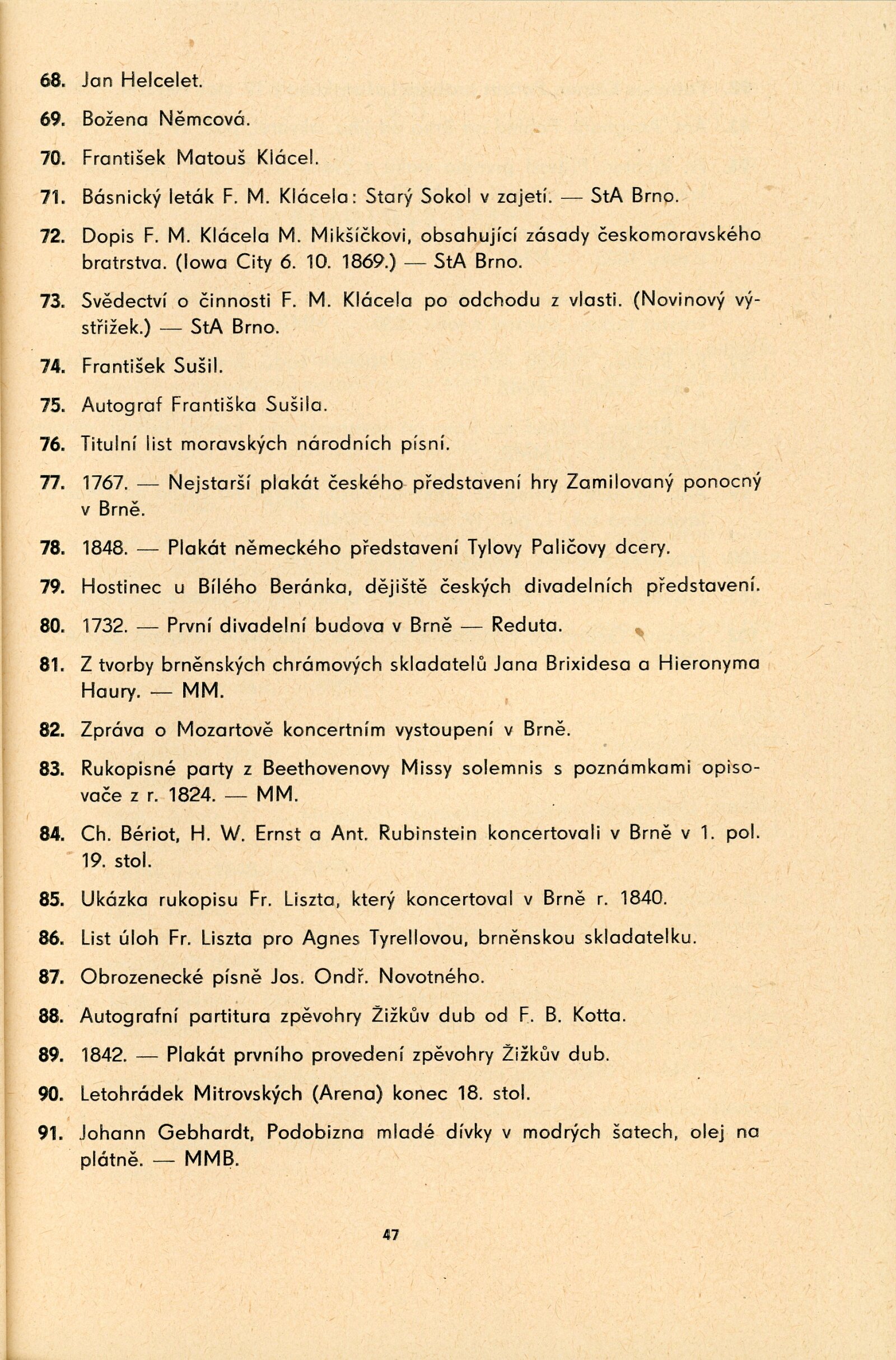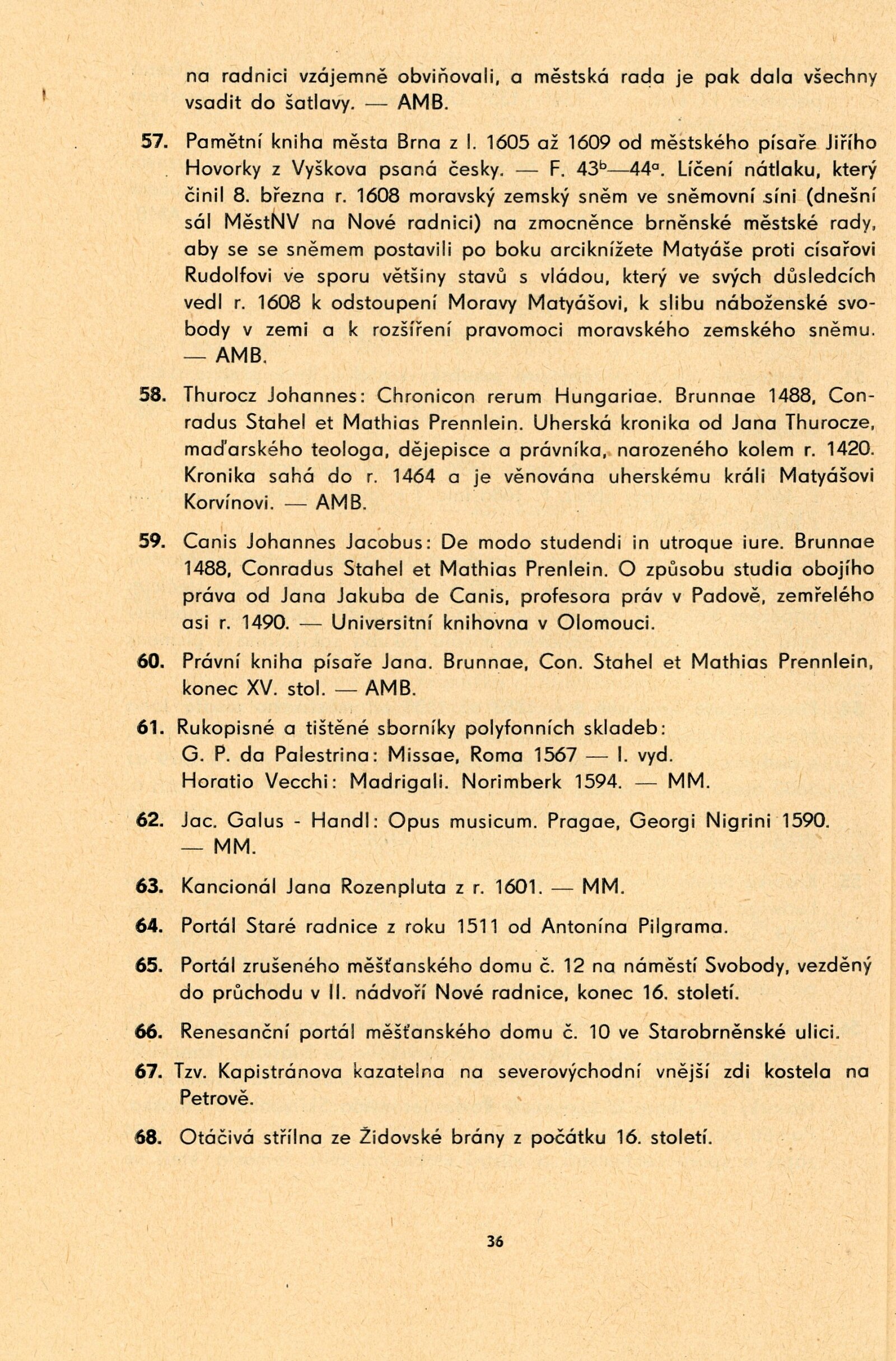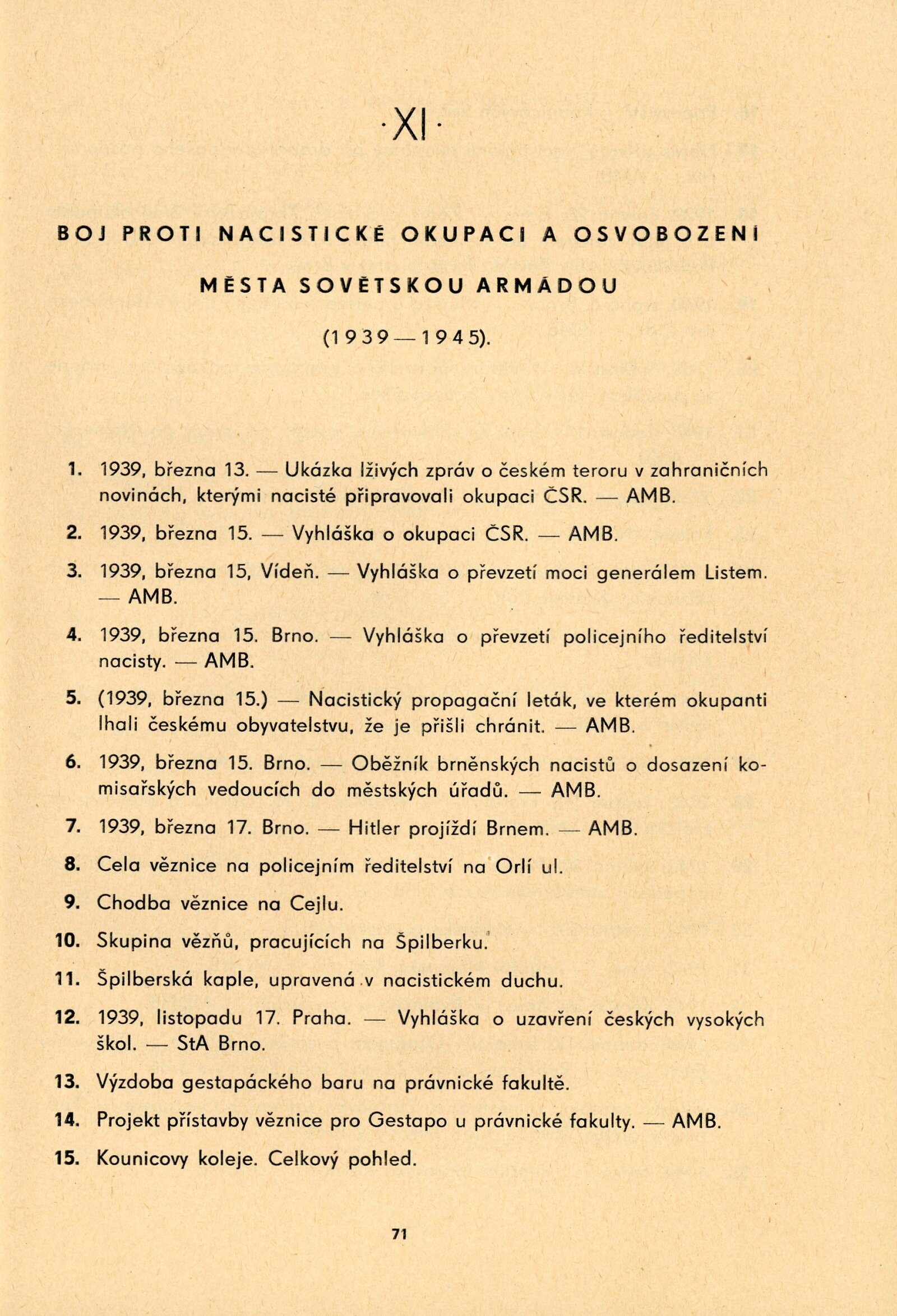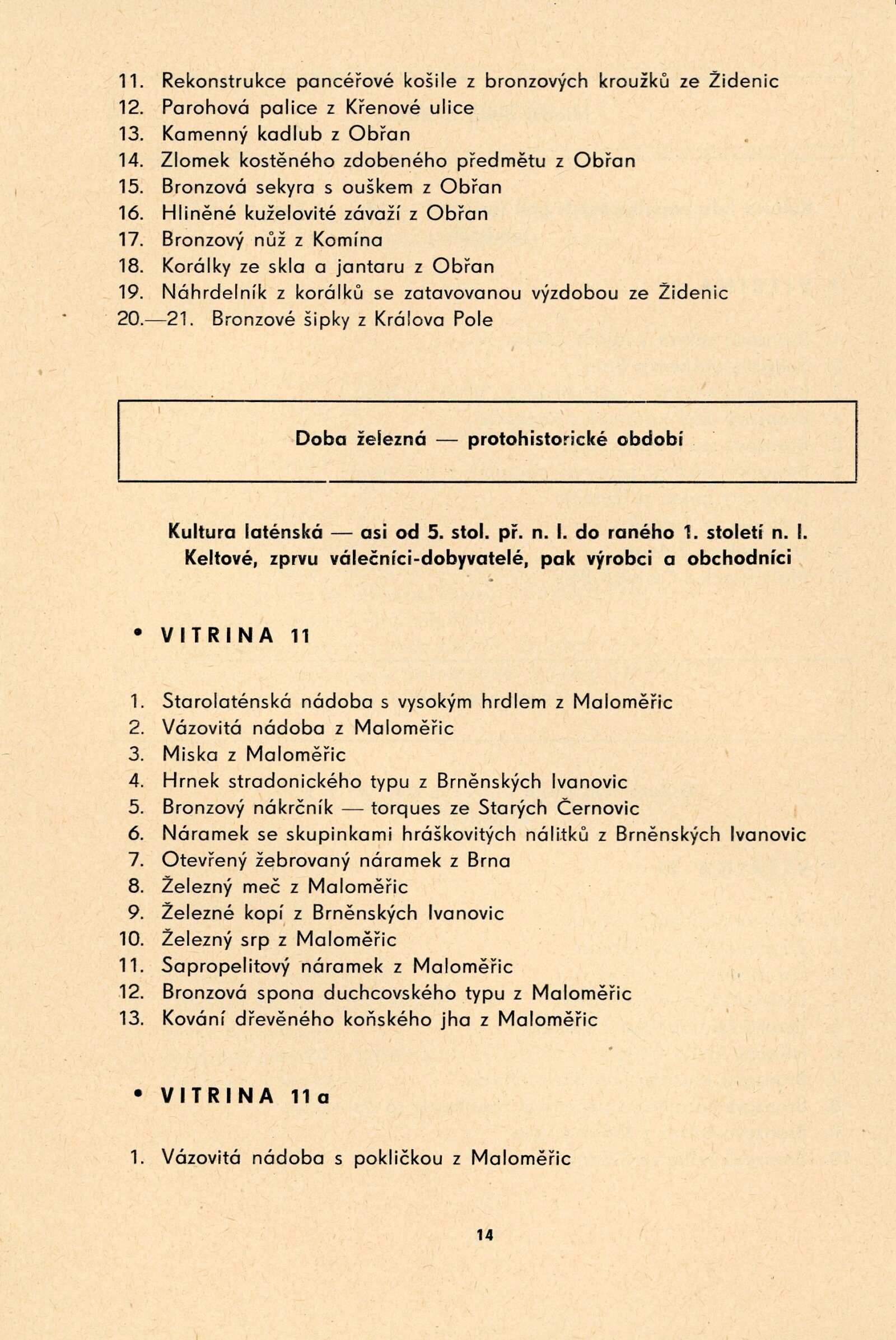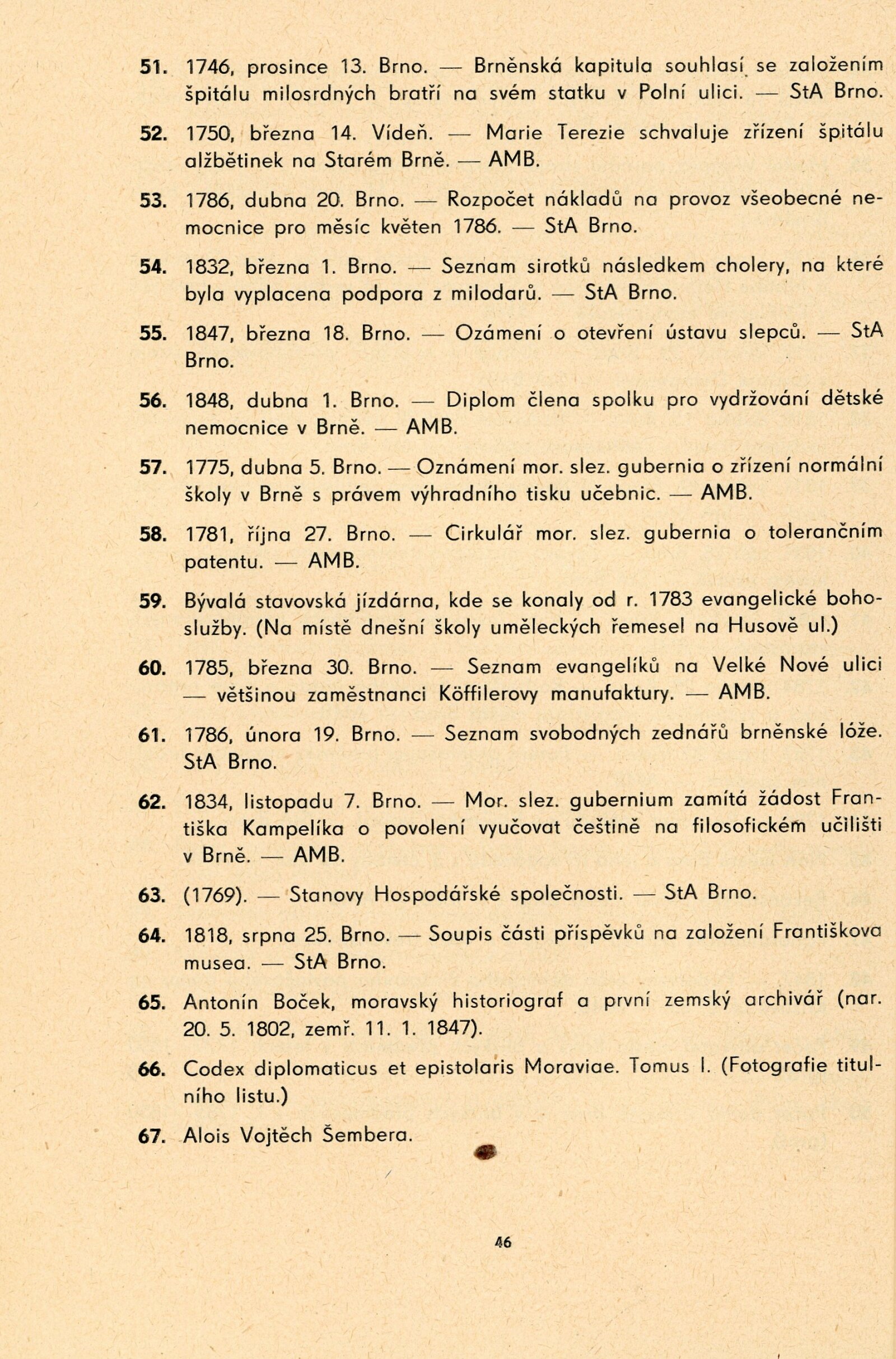 Brno od pravěku k dnešku: Dům umění města Brna / Dům pánů z Kunštátu, 6. 9. – 26. 11. 1959 / 1. Historický výklad ke katalogu výstavy pořádané v Domě pánů z Poděbrad v září až v říjnu 1959. – Brno: Krajské nakladatelství pro Archiv města Brna, 1959. – 133 s., 8 s. obr. příl. / Brno od pravěku k dnešku. 2. Seznam exponátů výstavy pořádané v Domě pánů z Poděbrad v září a v říjnu 1959. – Brno: Krajské nakladatelství pro Archiv města Brna, 1959. – 102 s., DPK 45. – MZK
