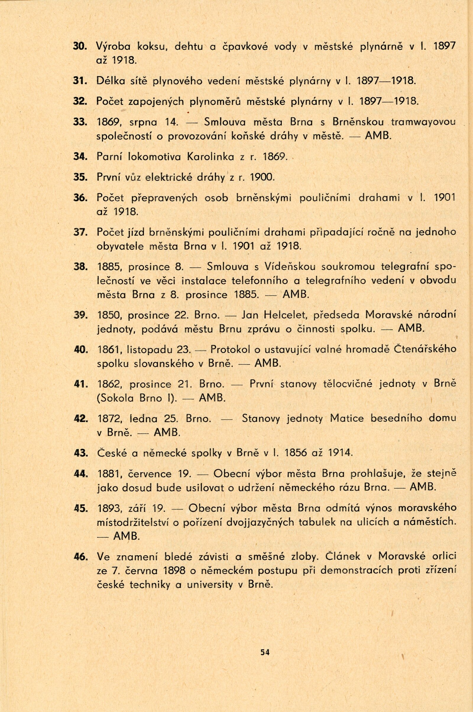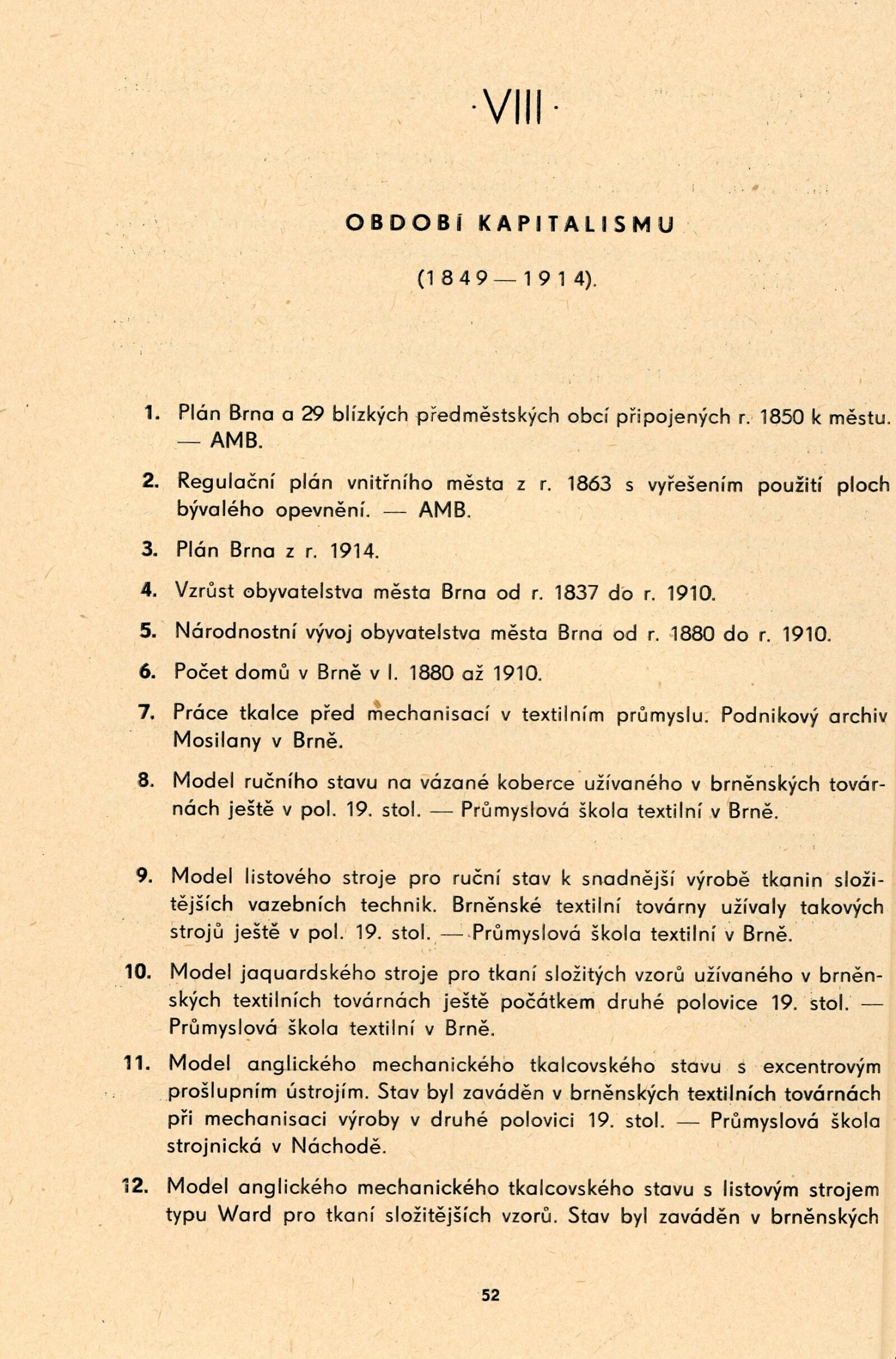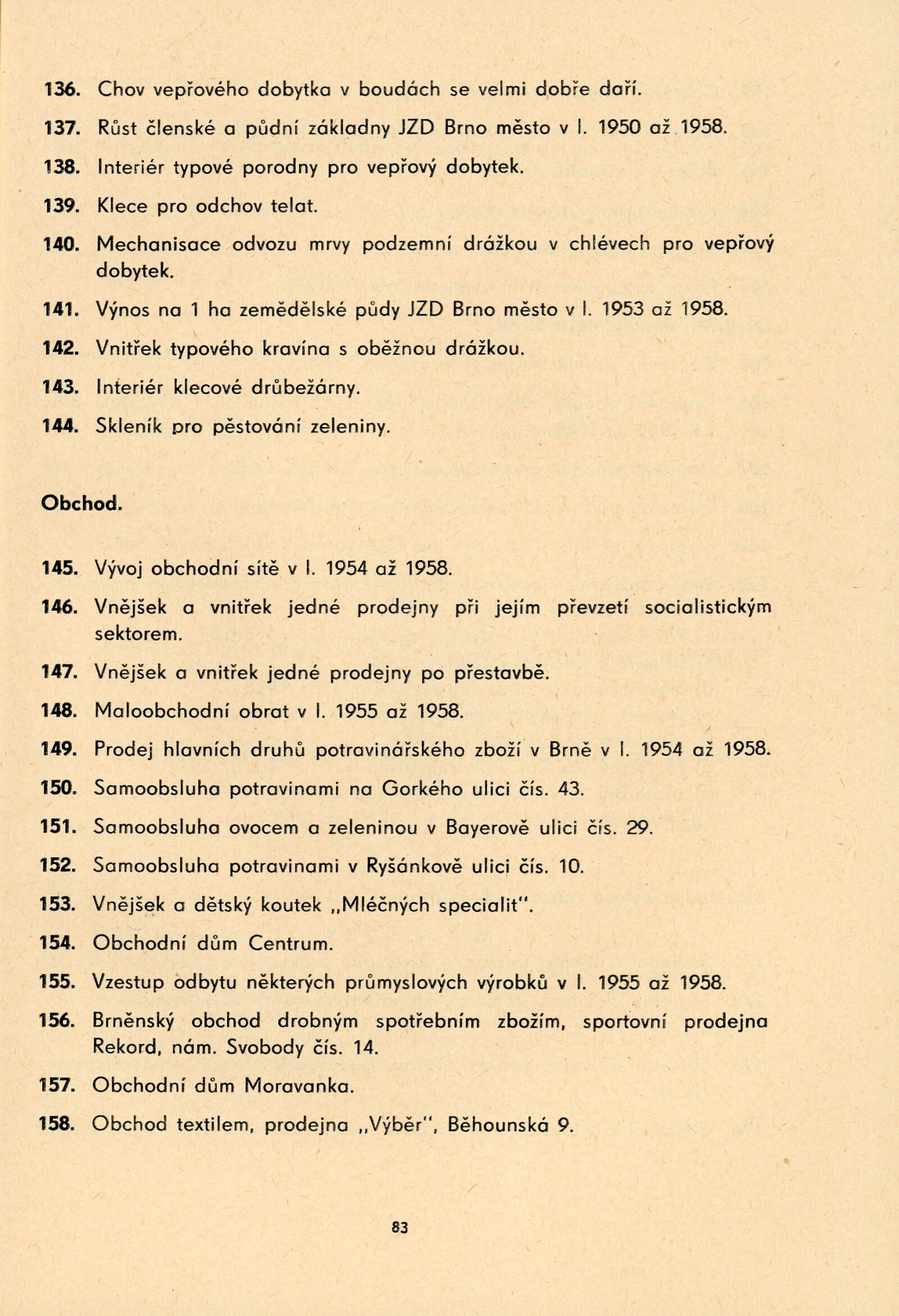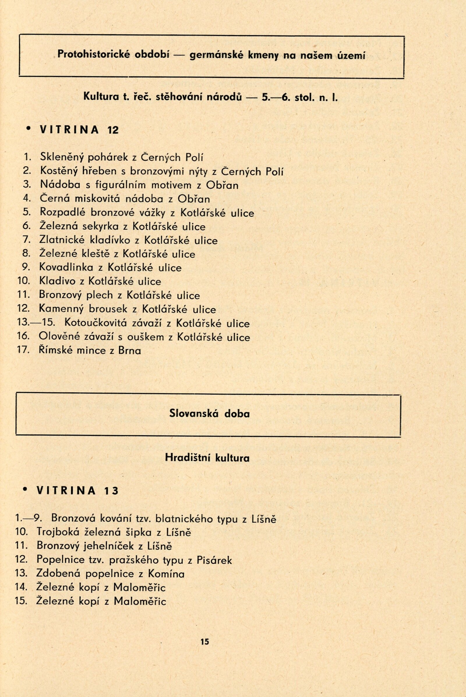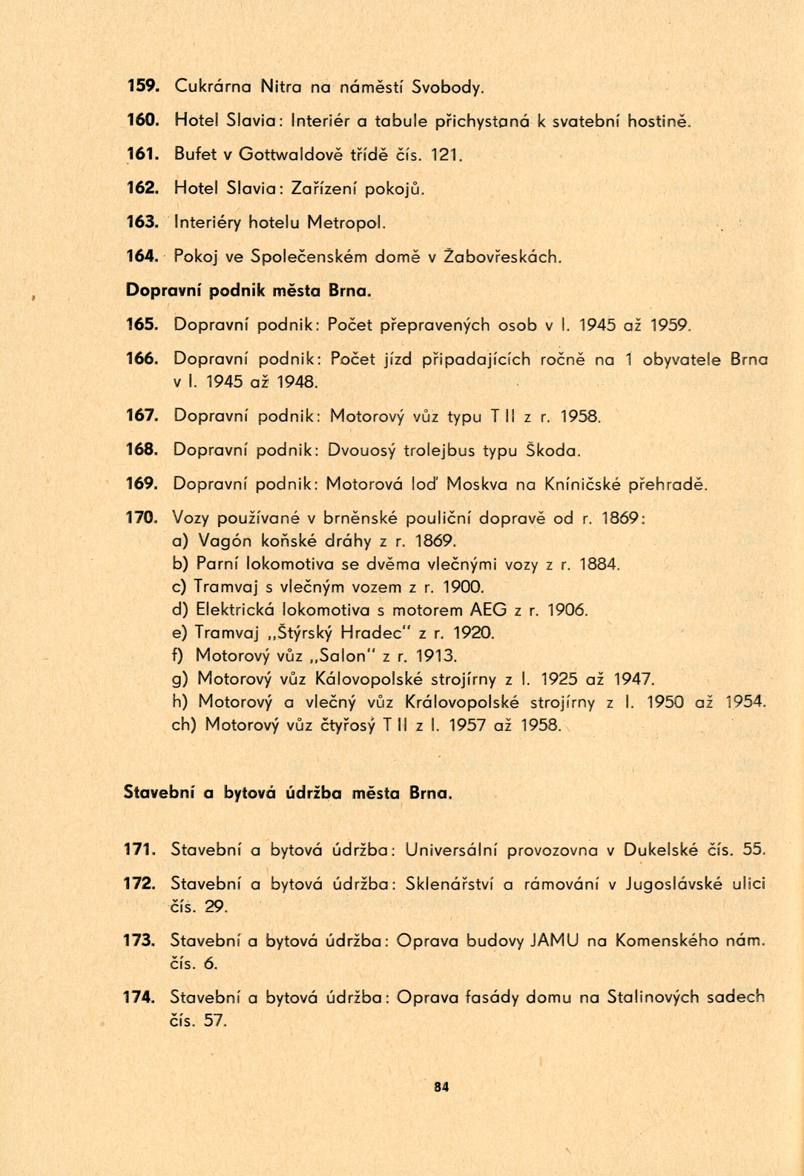 Brno od pravěku k dnešku: Dům umění města Brna / Dům pánů z Kunštátu, 6. 9. – 26. 11. 1959 / 1. Historický výklad ke katalogu výstavy pořádané v Domě pánů z Poděbrad v září až v říjnu 1959. – Brno: Krajské nakladatelství pro Archiv města Brna, 1959. – 133 s., 8 s. obr. příl. / Brno od pravěku k dnešku. 2. Seznam exponátů výstavy pořádané v Domě pánů z Poděbrad v září a v říjnu 1959. – Brno: Krajské nakladatelství pro Archiv města Brna, 1959. – 102 s., DPK 45. – MZK