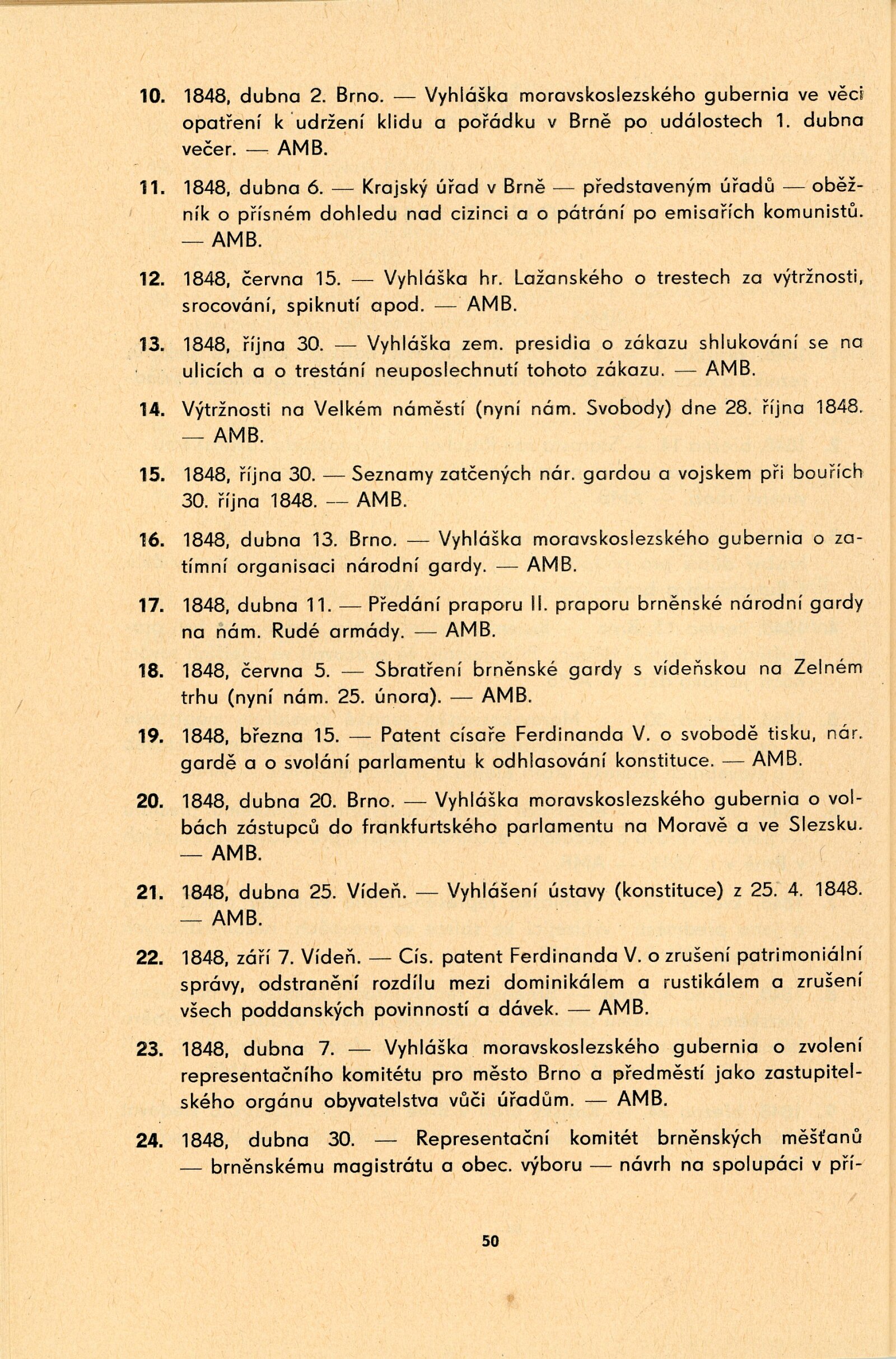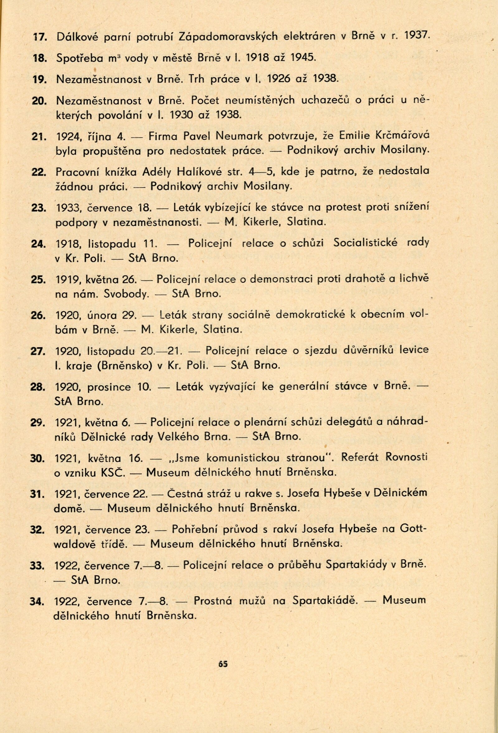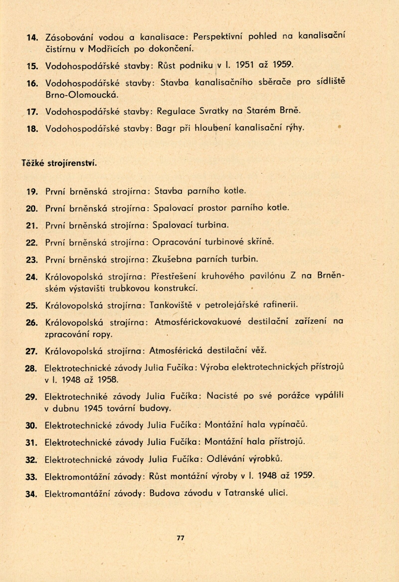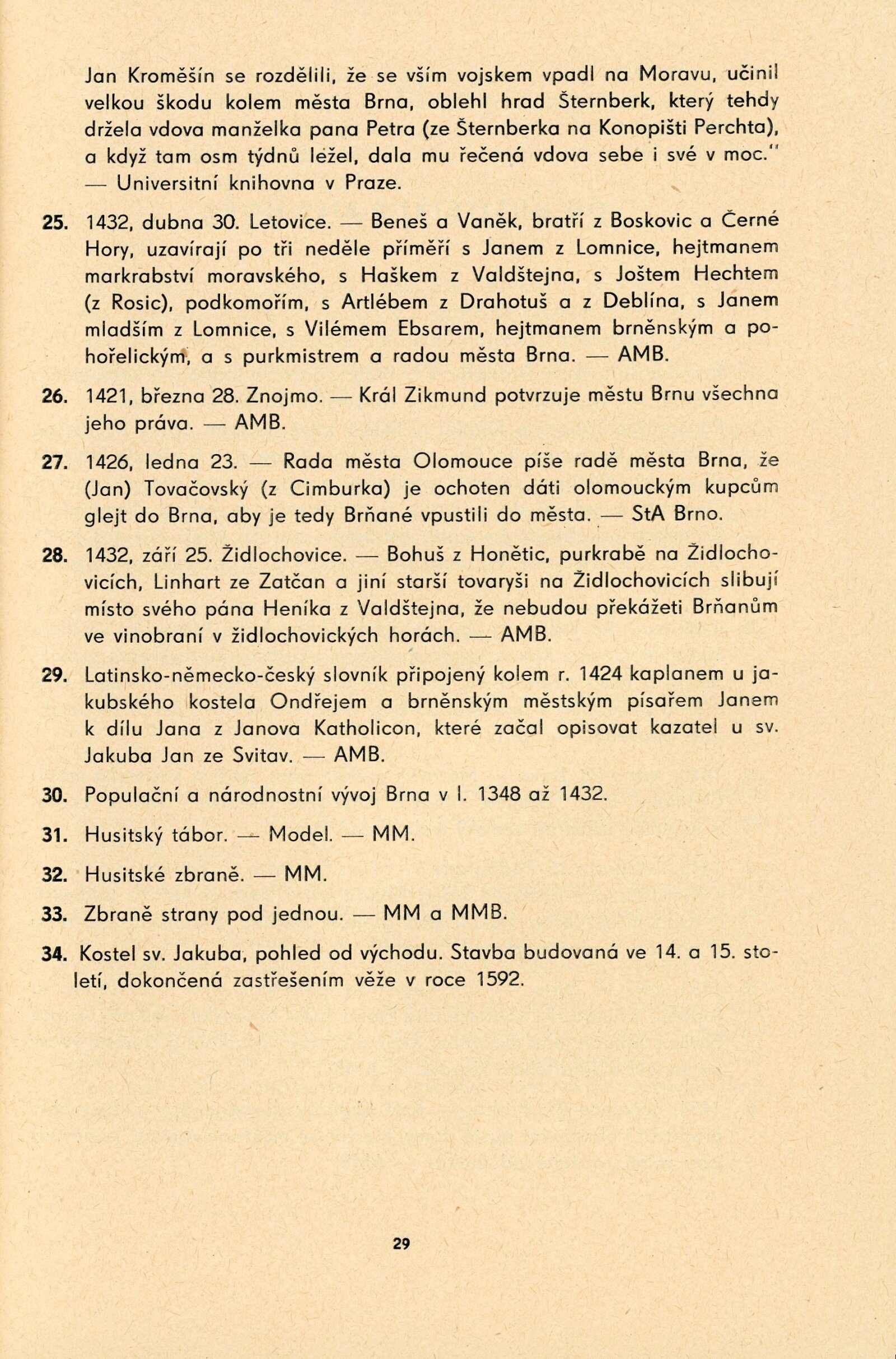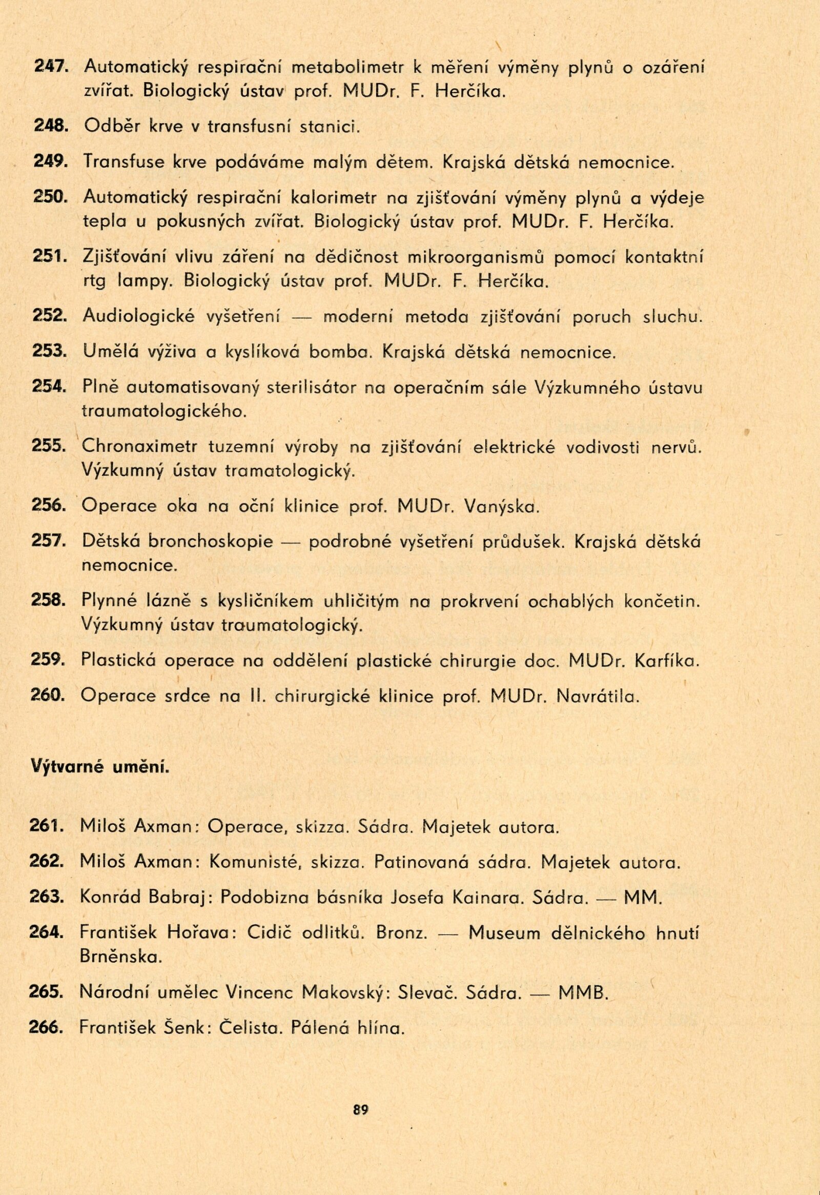 Brno od pravěku k dnešku: Dům umění města Brna / Dům pánů z Kunštátu, 6. 9. – 26. 11. 1959 / 1. Historický výklad ke katalogu výstavy pořádané v Domě pánů z Poděbrad v září až v říjnu 1959. – Brno: Krajské nakladatelství pro Archiv města Brna, 1959. – 133 s., 8 s. obr. příl. / Brno od pravěku k dnešku. 2. Seznam exponátů výstavy pořádané v Domě pánů z Poděbrad v září a v říjnu 1959. – Brno: Krajské nakladatelství pro Archiv města Brna, 1959. – 102 s., DPK 45. – MZK