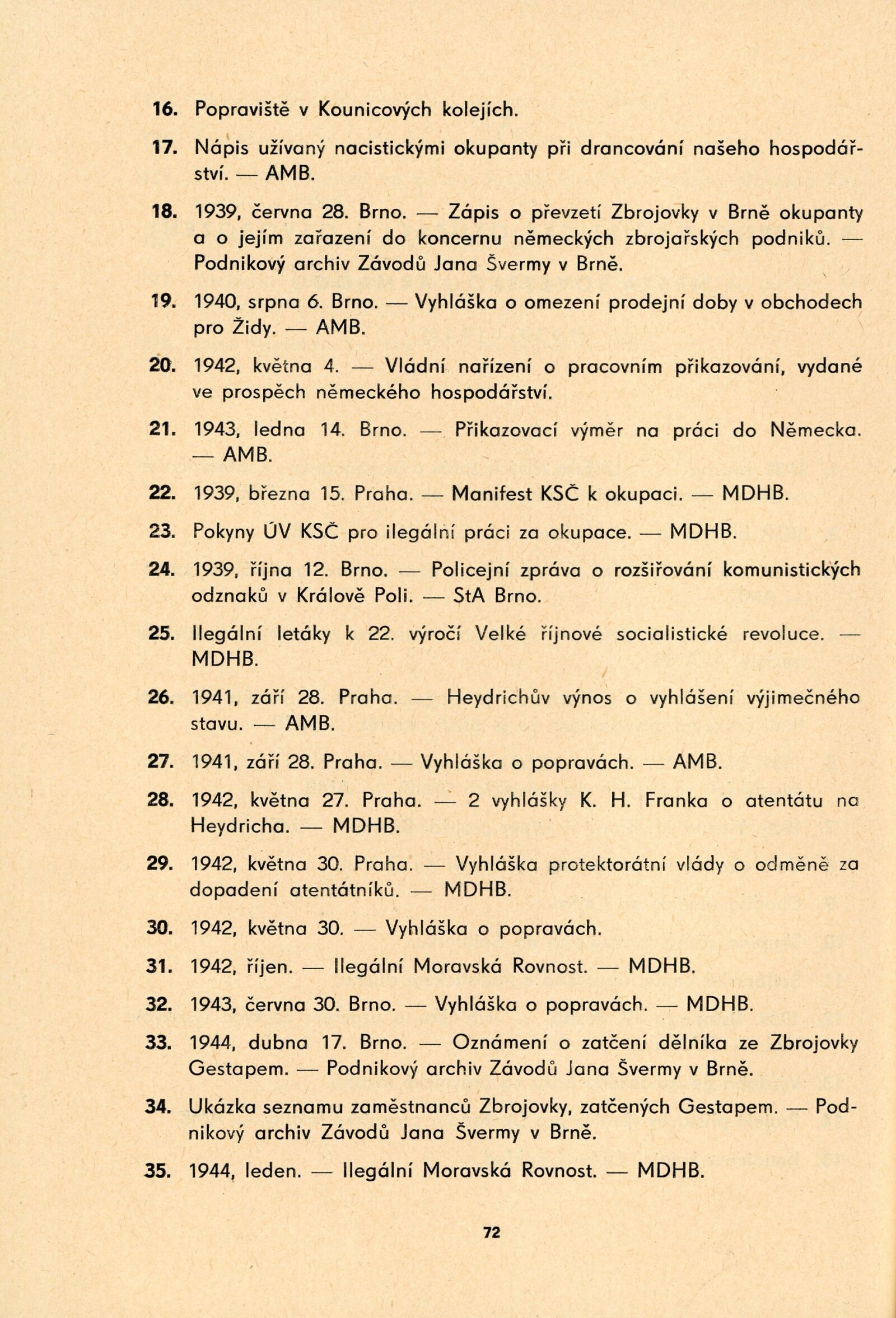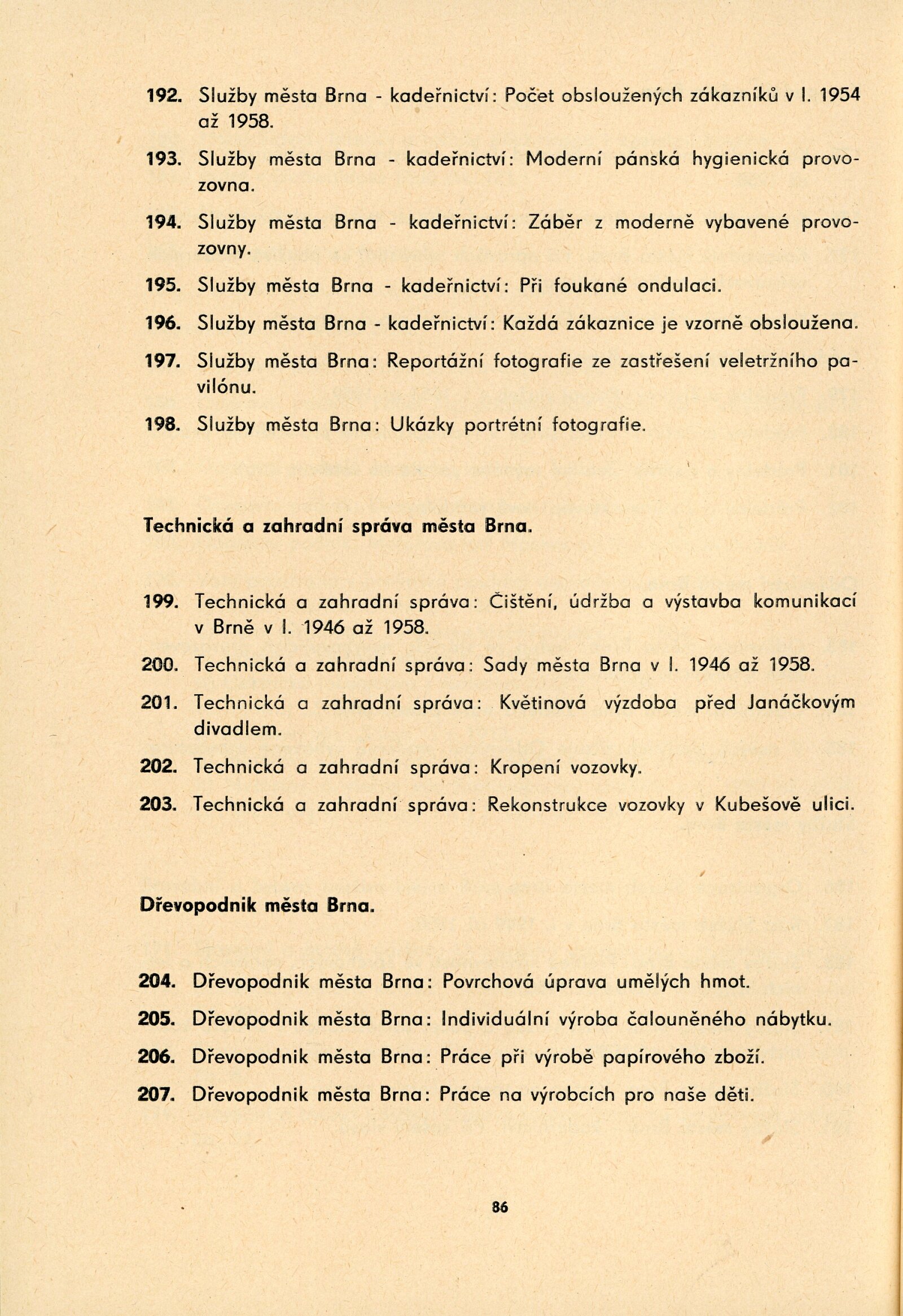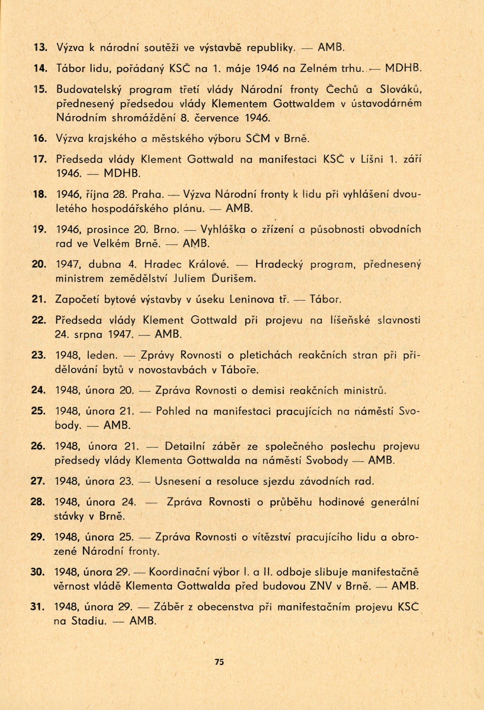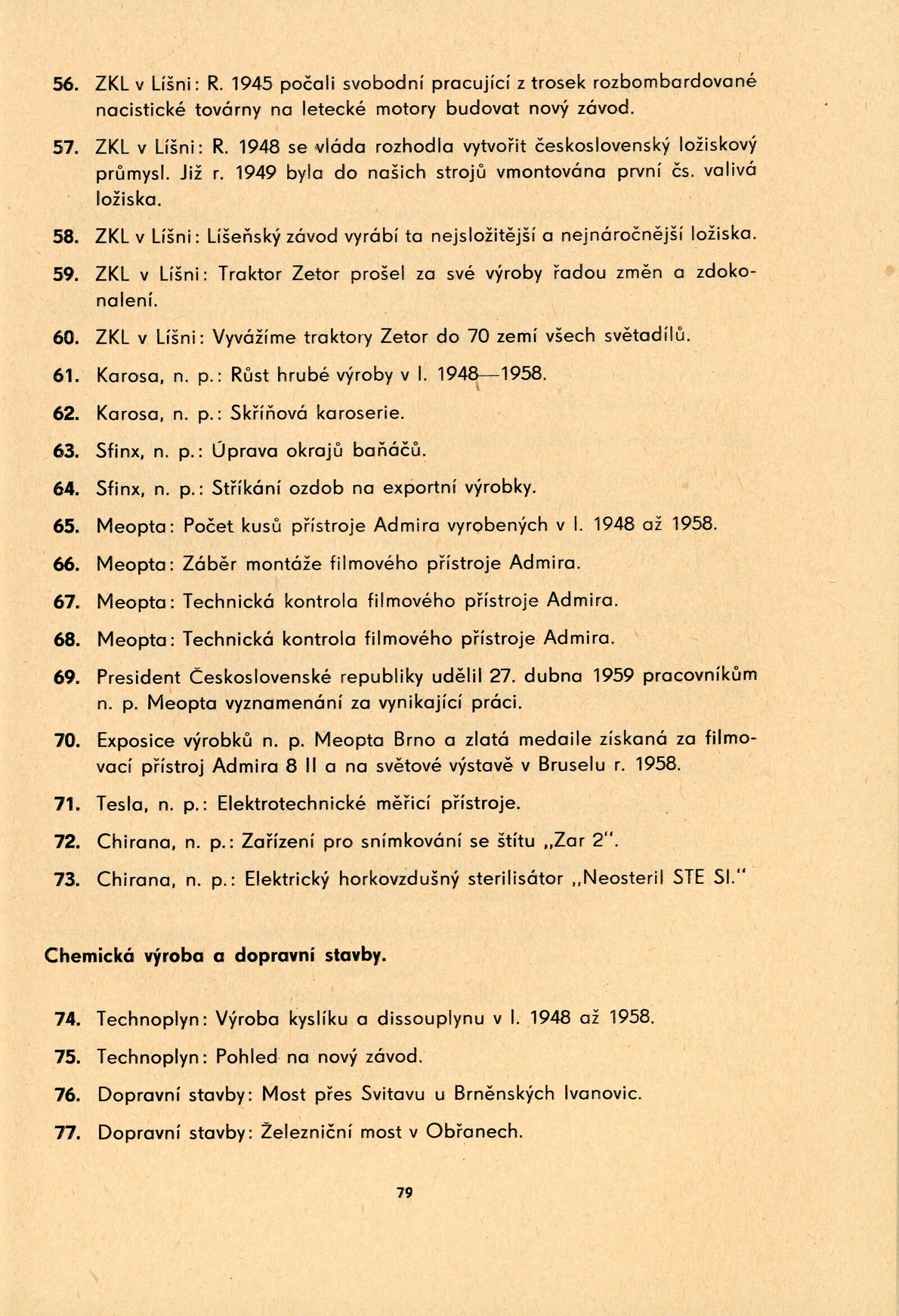 Brno od pravěku k dnešku: Dům umění města Brna / Dům pánů z Kunštátu, 6. 9. – 26. 11. 1959 / 1. Historický výklad ke katalogu výstavy pořádané v Domě pánů z Poděbrad v září až v říjnu 1959. – Brno: Krajské nakladatelství pro Archiv města Brna, 1959. – 133 s., 8 s. obr. příl. / Brno od pravěku k dnešku. 2. Seznam exponátů výstavy pořádané v Domě pánů z Poděbrad v září a v říjnu 1959. – Brno: Krajské nakladatelství pro Archiv města Brna, 1959. – 102 s., DPK 45. – MZK