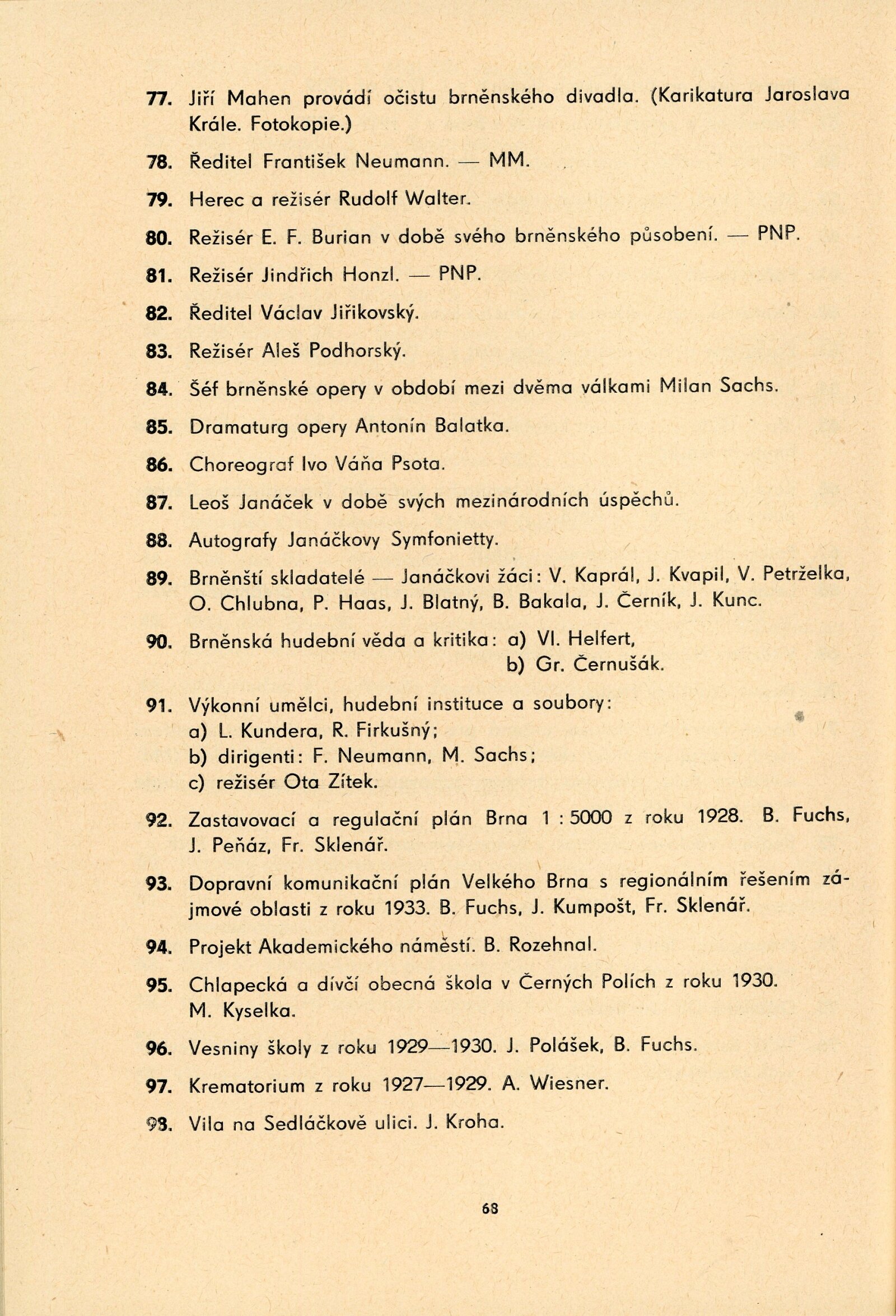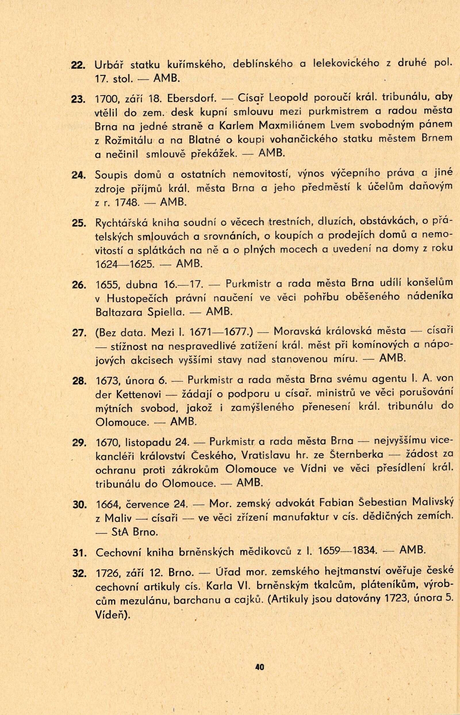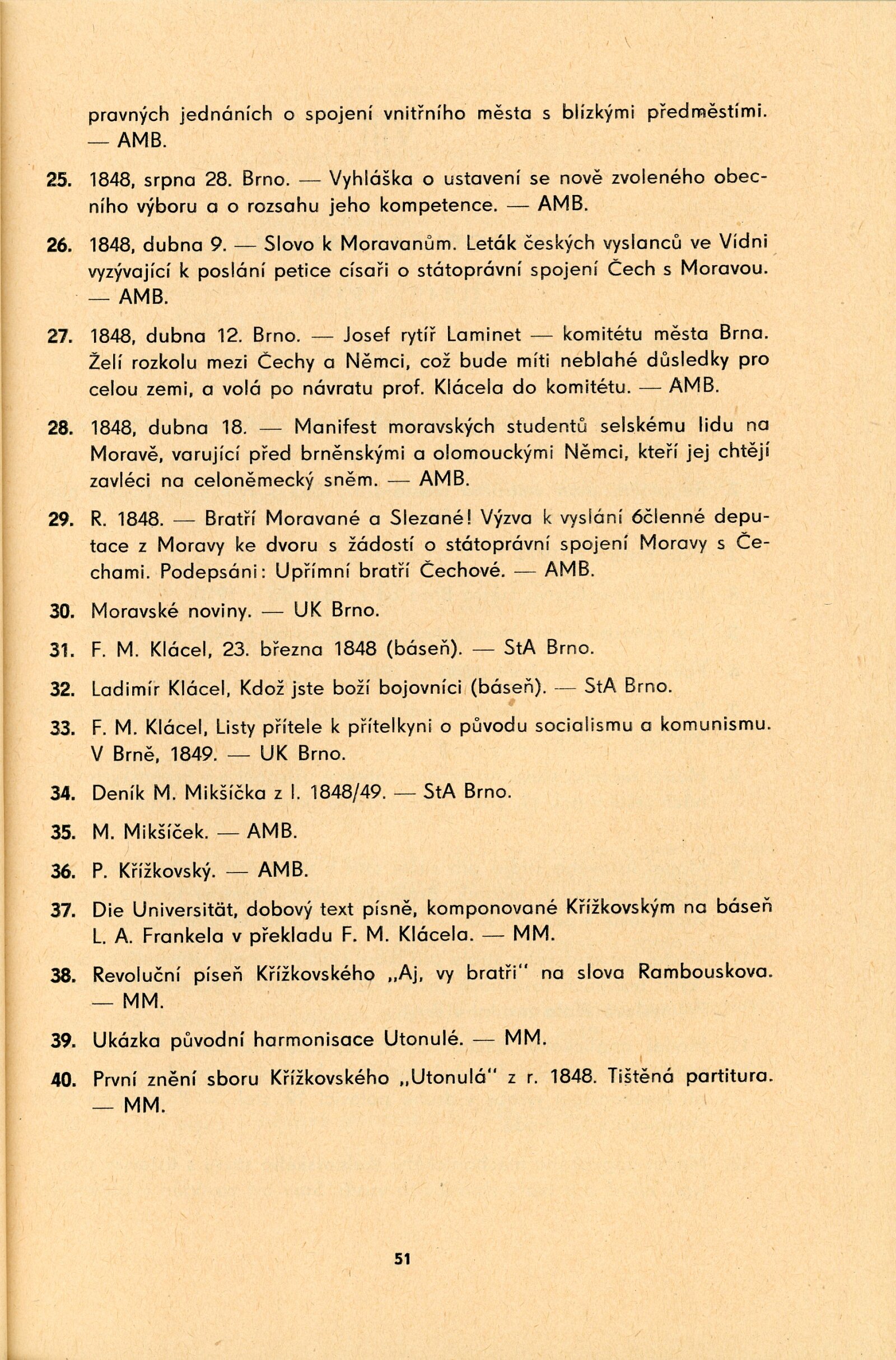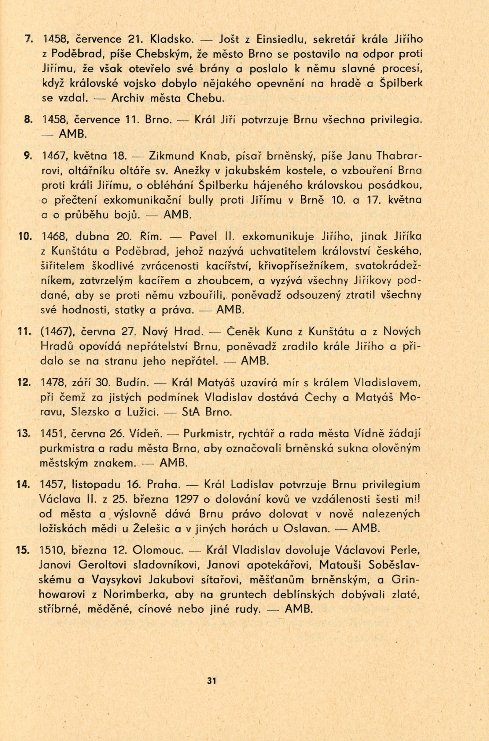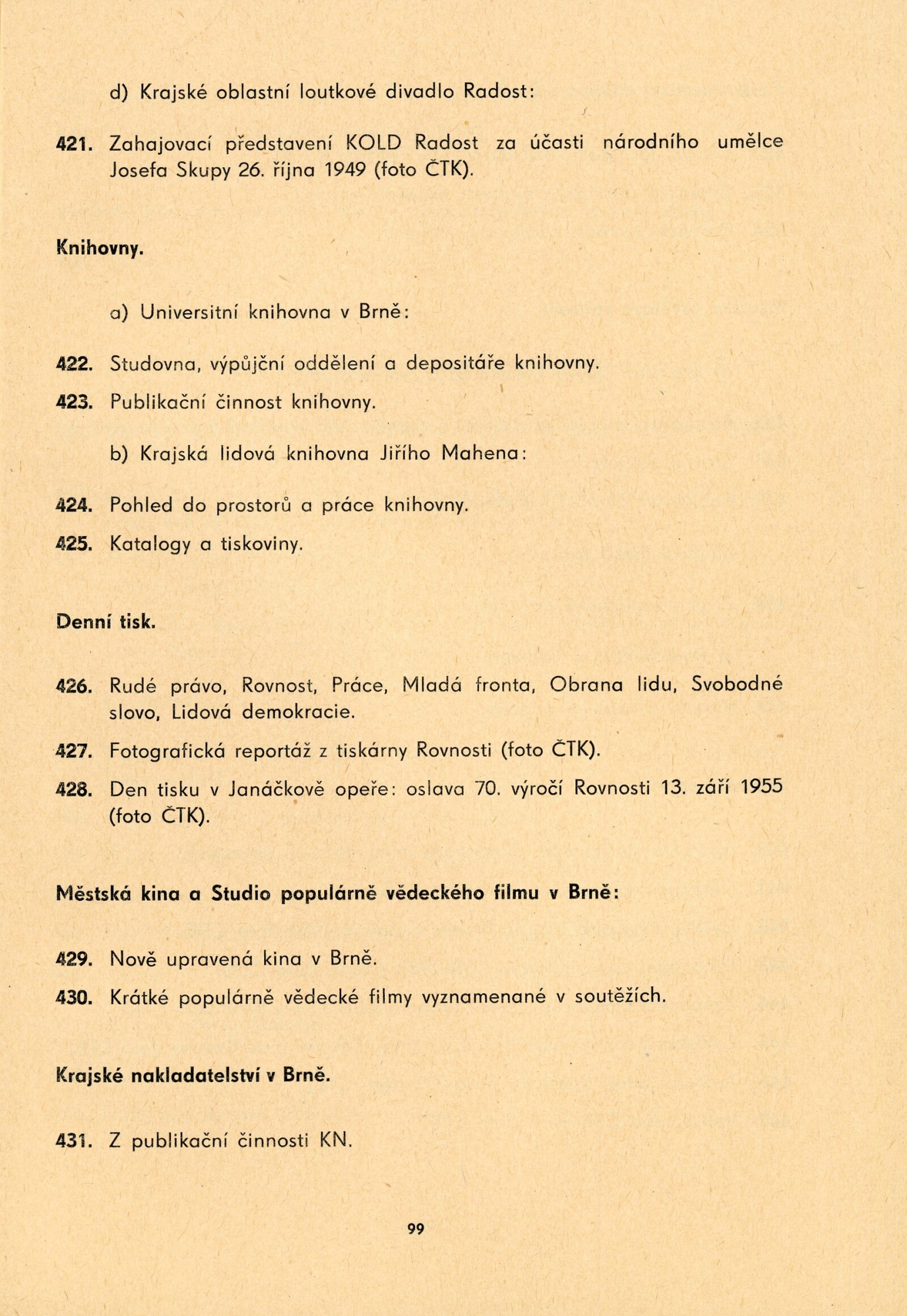 Brno od pravěku k dnešku: Dům umění města Brna / Dům pánů z Kunštátu, 6. 9. – 26. 11. 1959 / 1. Historický výklad ke katalogu výstavy pořádané v Domě pánů z Poděbrad v září až v říjnu 1959. – Brno: Krajské nakladatelství pro Archiv města Brna, 1959. – 133 s., 8 s. obr. příl. / Brno od pravěku k dnešku. 2. Seznam exponátů výstavy pořádané v Domě pánů z Poděbrad v září a v říjnu 1959. – Brno: Krajské nakladatelství pro Archiv města Brna, 1959. – 102 s., DPK 45. – MZK