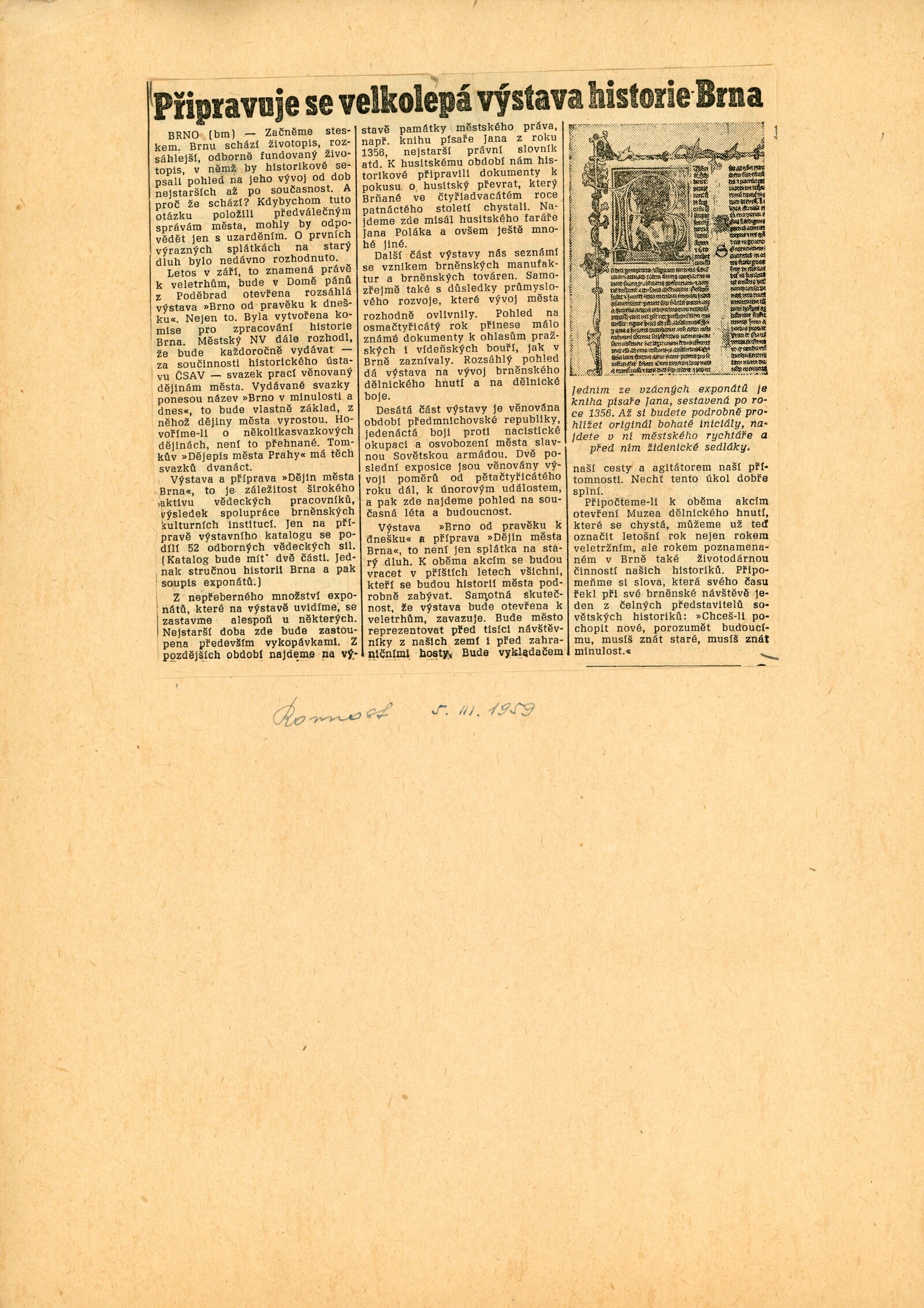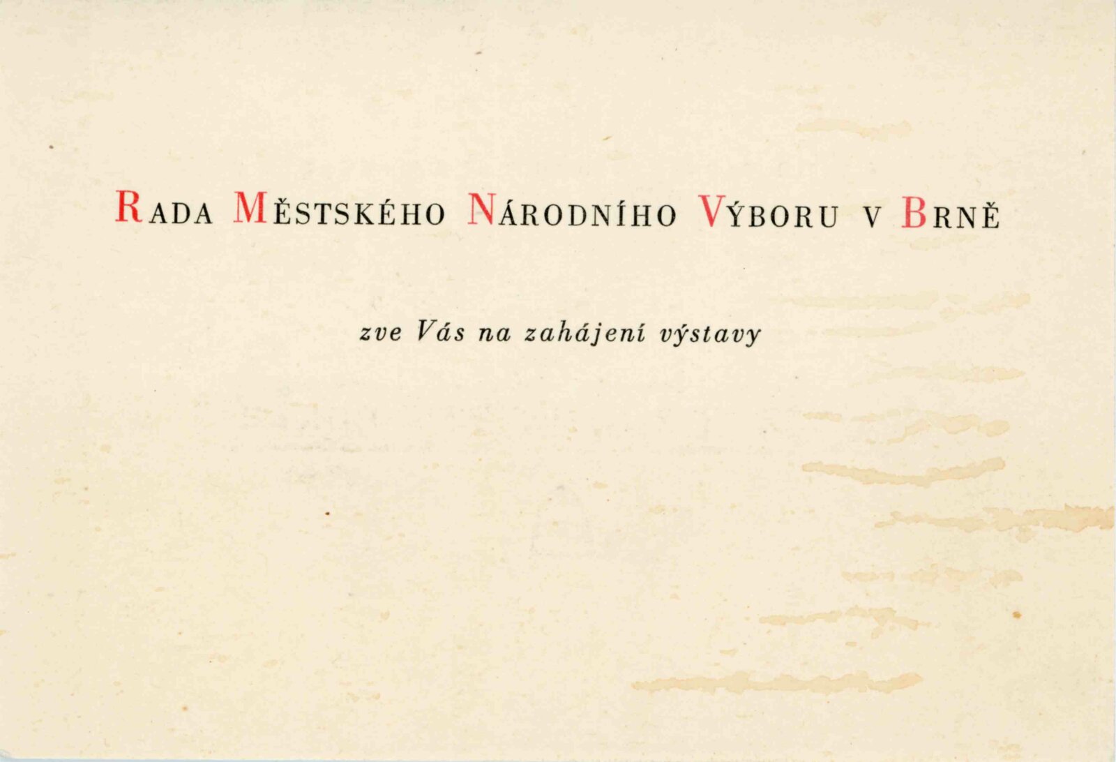 pozvánka, katalog, provozní korespondence, smlouva mezi DU a MNV Brno o pronájmu DPP pro výstavu, zápis z porady DU a Muzea města Brna, recenze v tisku