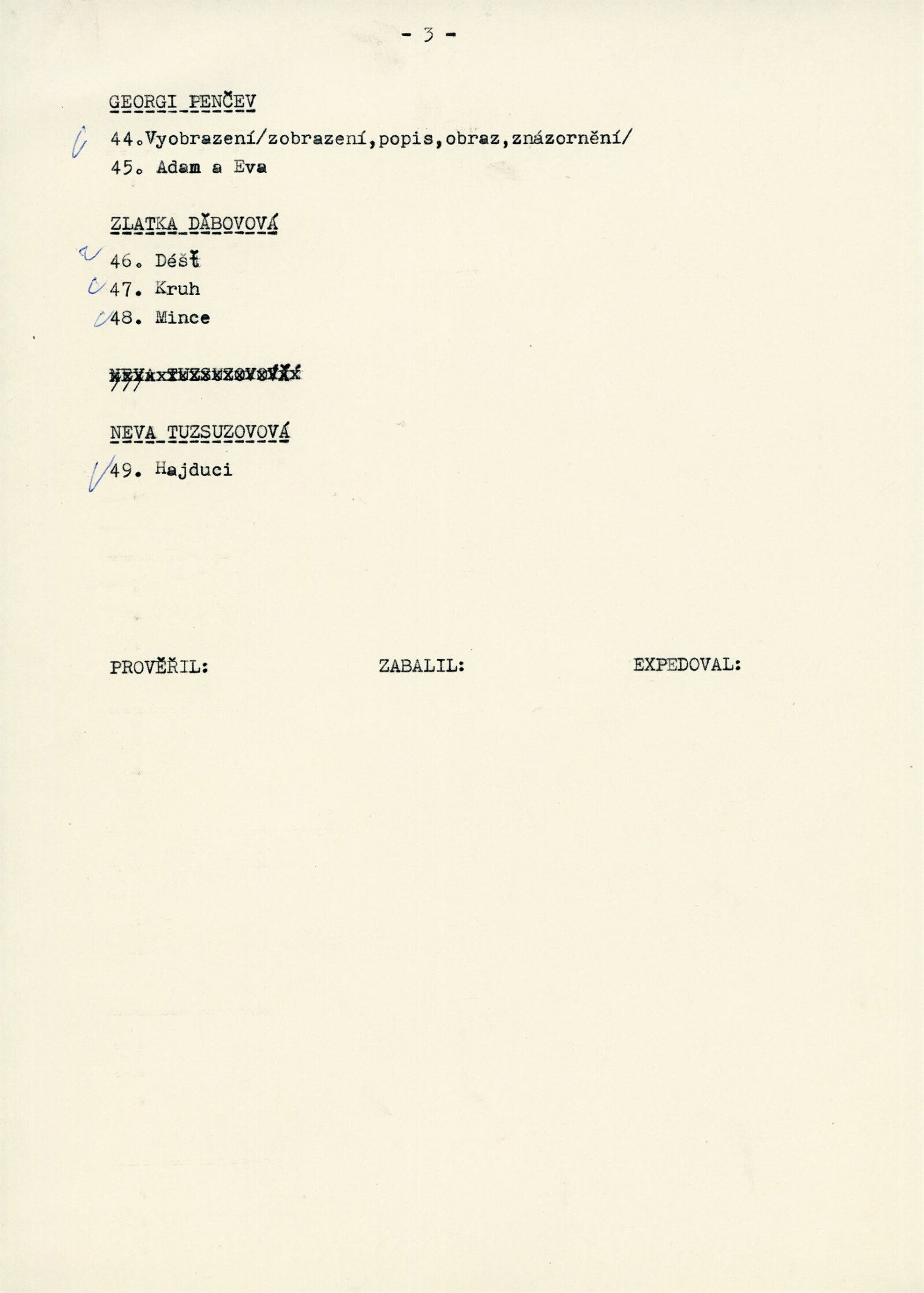 Georgi Anastasov, Penčo Balanski, Ljuben Dimanov, Zlatka Ďabovová, Žana Kosturkovová, Penčo Kulekov, Juli Minčev, Atanas Nejkov, Todor Panajotov, Anastasia Panajotová, Mana Parpulovová, Georgi Penčev, Michail Petkov, Borislav Stoev, Neva Tuzsuzovová, Vesa Vasilevová, Tanja Vladovová