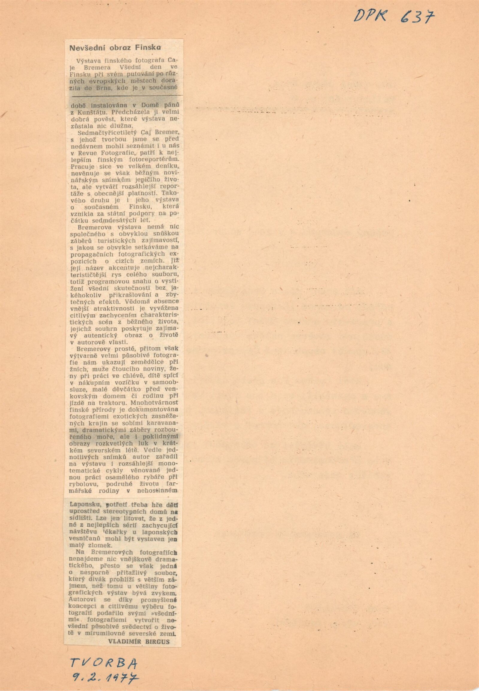 společná pozvánka pro DPK 633–638, fotografie, protokol o poškození fotografie „Všední den ve Finsku“, žádost o povolení výstavy, recenze v tisku