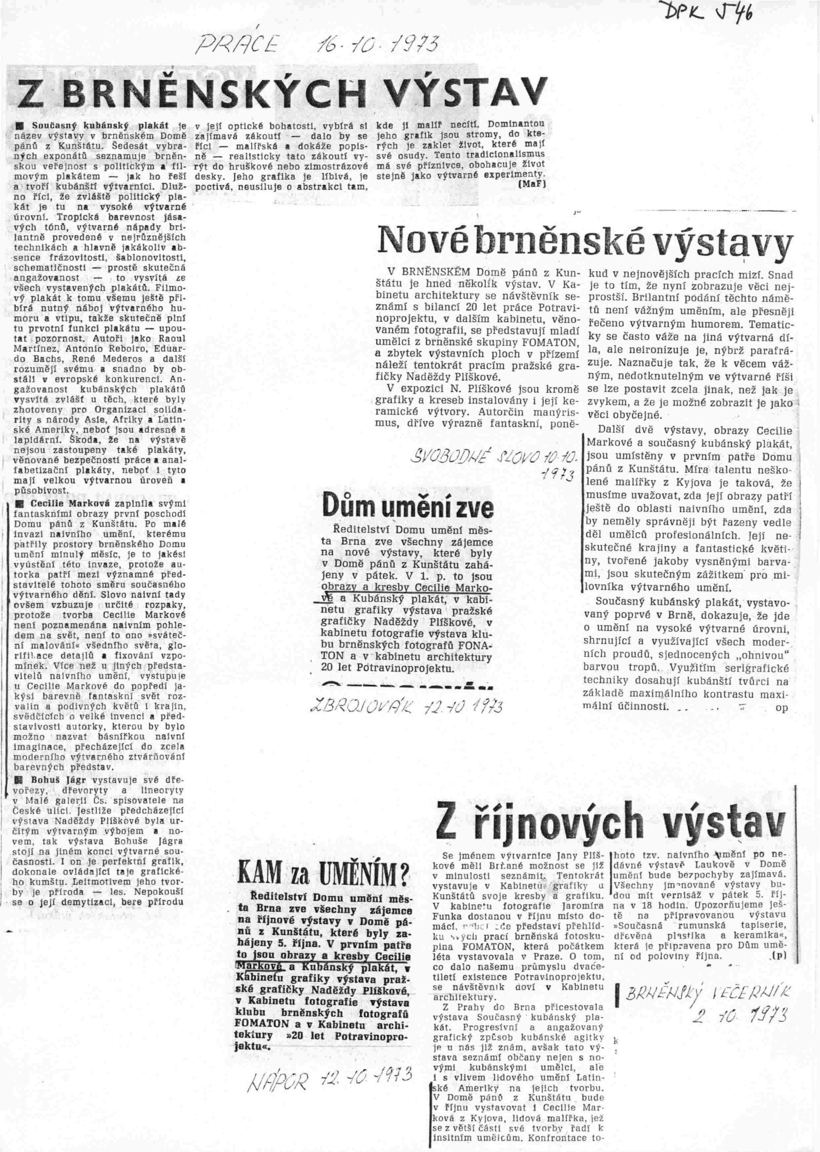 Cecilie Marková: Dům umění / Dům pánů z Kunštátu 5. 10. – 28. 10. 1973 / Text: Nina Dvořáková. – Brno: DUmB, 1973. – 6 s., obr., portrét, životní data, výstavy, zastoupení ve sbírkách, DPK 546. – MZK; MG; MMB