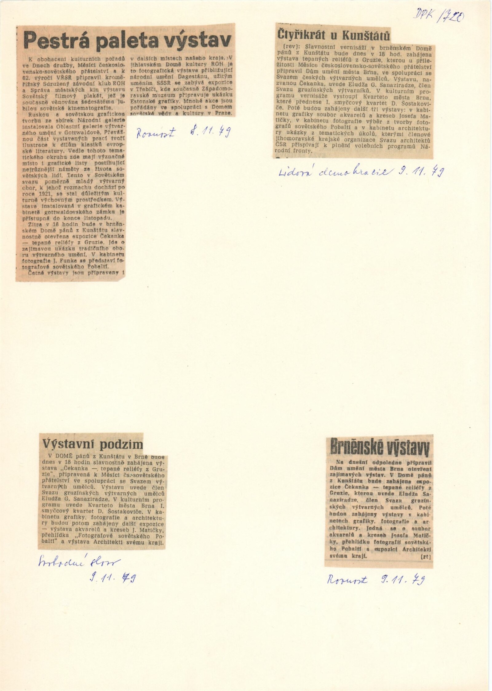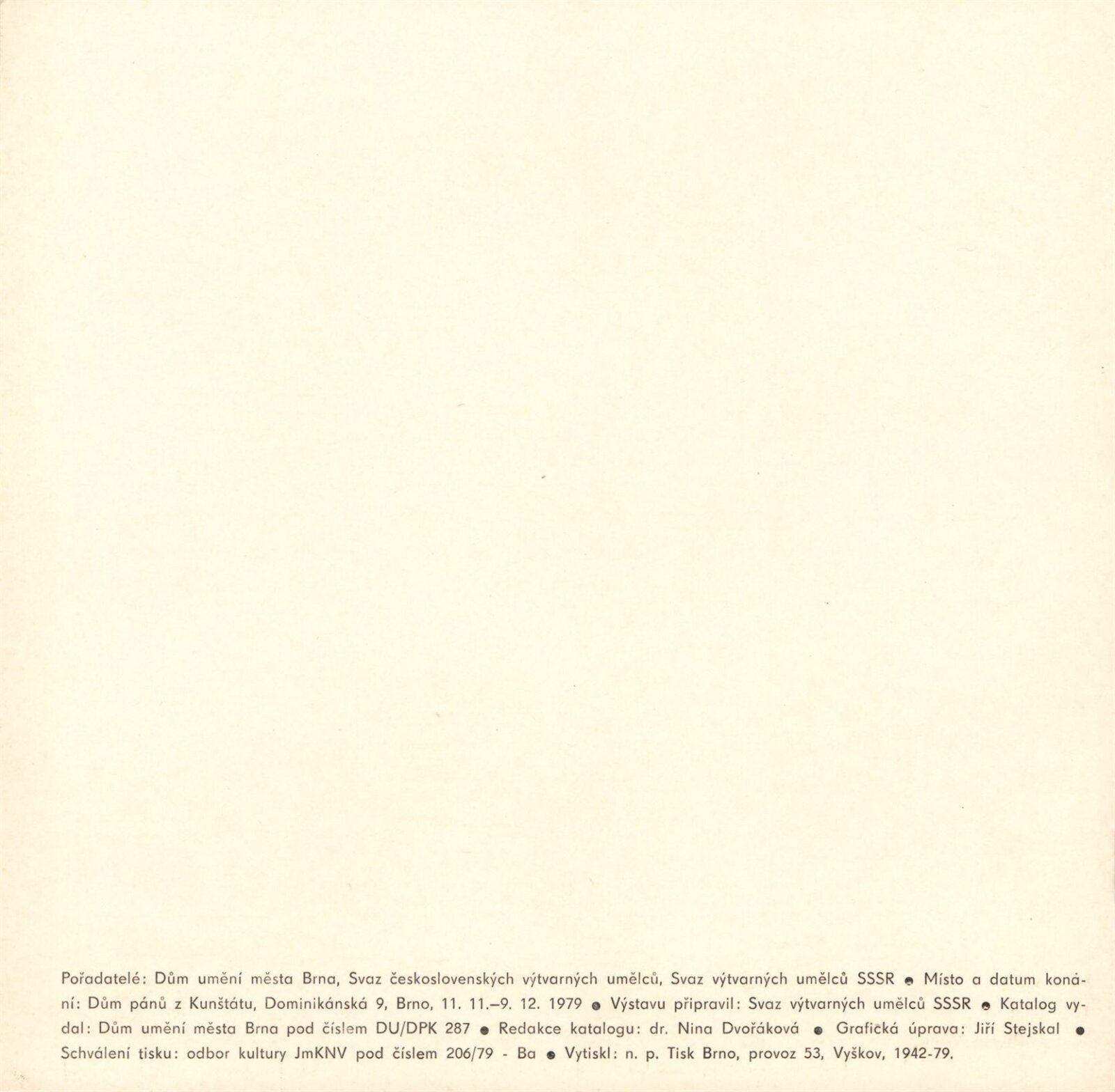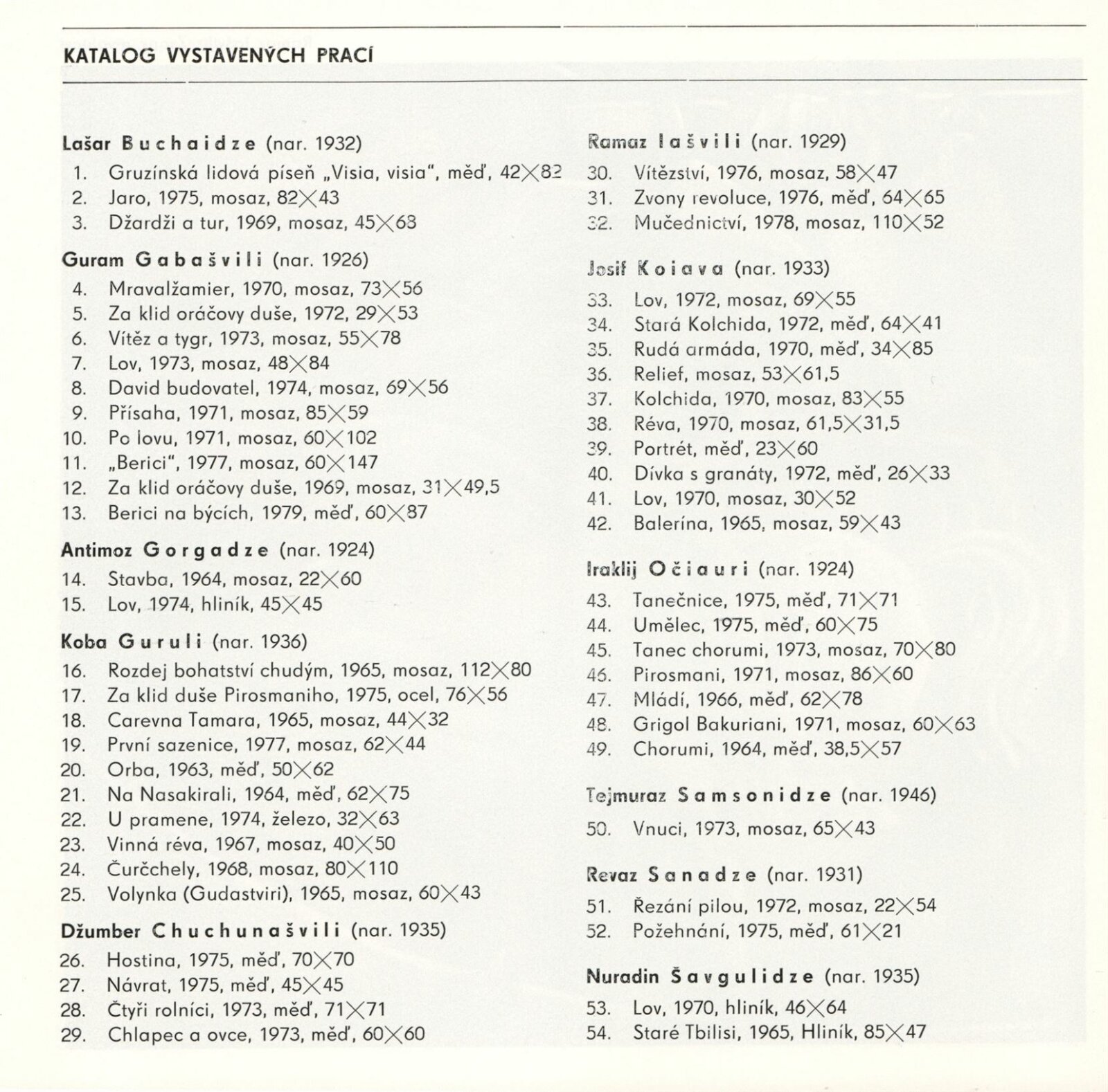 pozvánka, katalog + strojopis (ČJ, RJ), fotografie děl, fotografie z vernisáže, pozvání na výstavu pro média, seznamy exponátů, zpráva o pobytu a program delegace z Gruzie, žádost o schválení a registraci výstavy, provozní korespondence (instituce, SČVU, Svaz výtvarníků SSSR), dopis SČVU (2. 10. 1979), zápis o předání výstavy, organizační poznámky, recenze v tisku