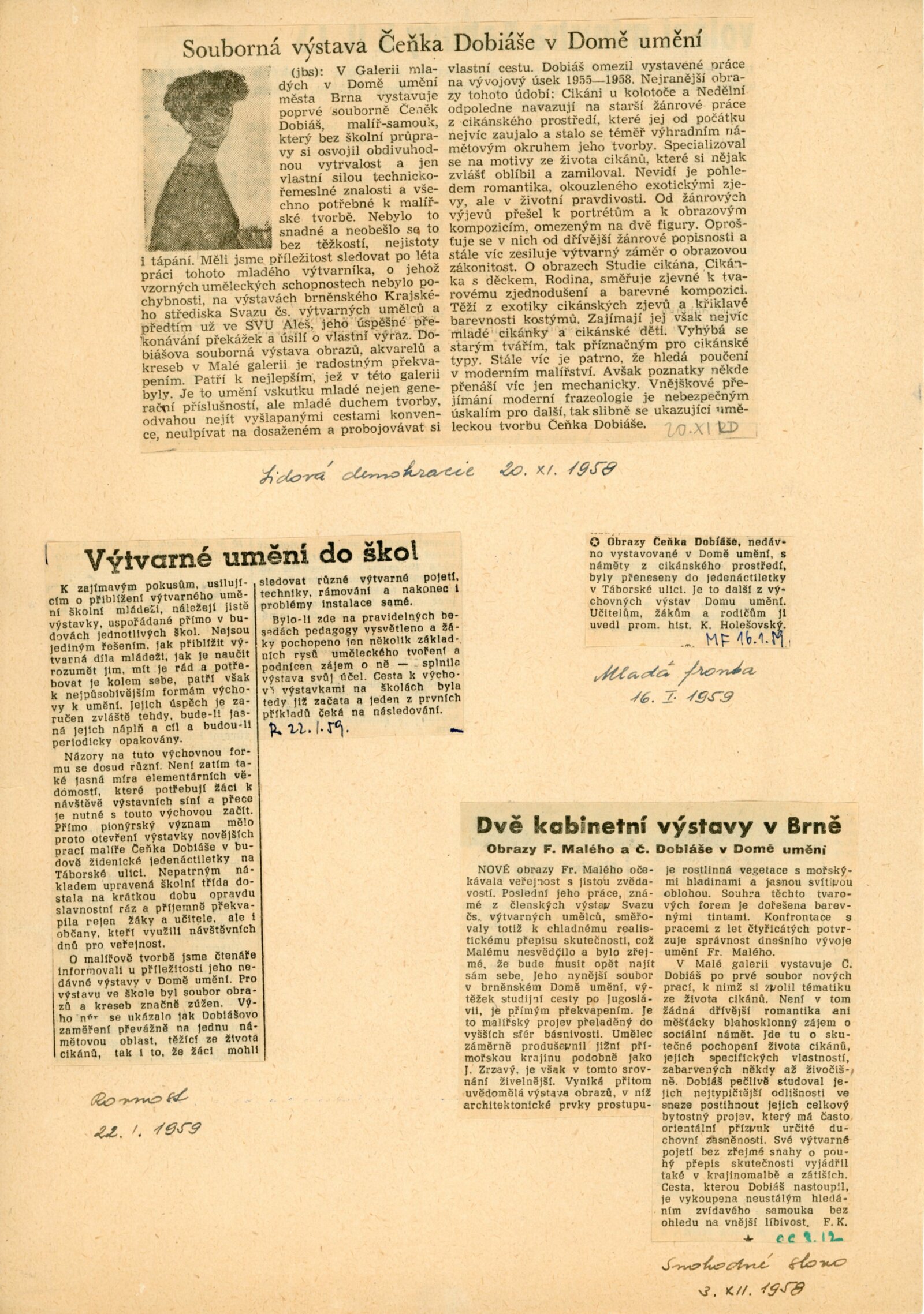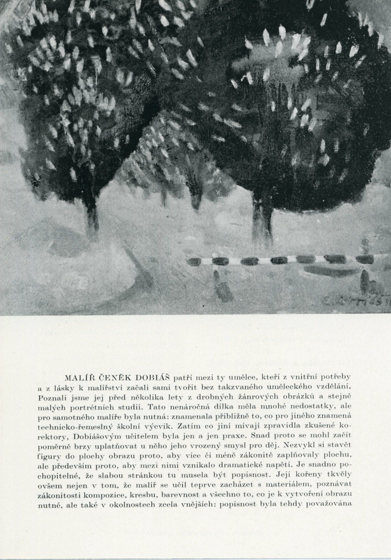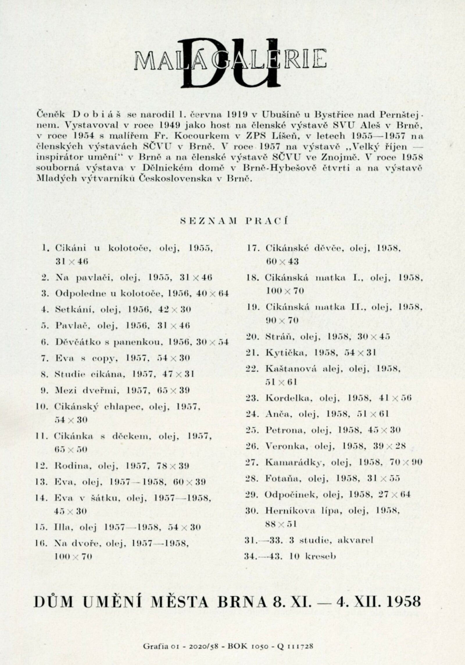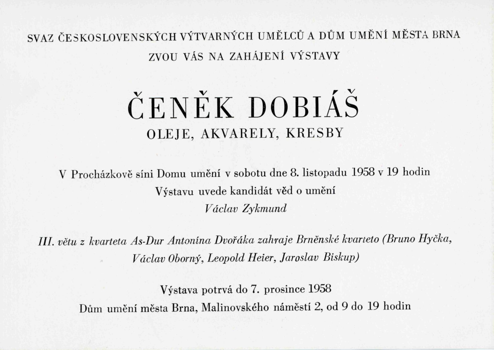 Čeněk Dobiáš. Oleje, akvarely, kresby: Dům umění, Malá galerie, 8. 11. – 7. 12. 1958 / Text: Václav Zykmund. – Brno: DUmB, 1958. – skládačka, 6 s., obr., báseň Jan Skácel, DU 318. – MZK; MG; MMB