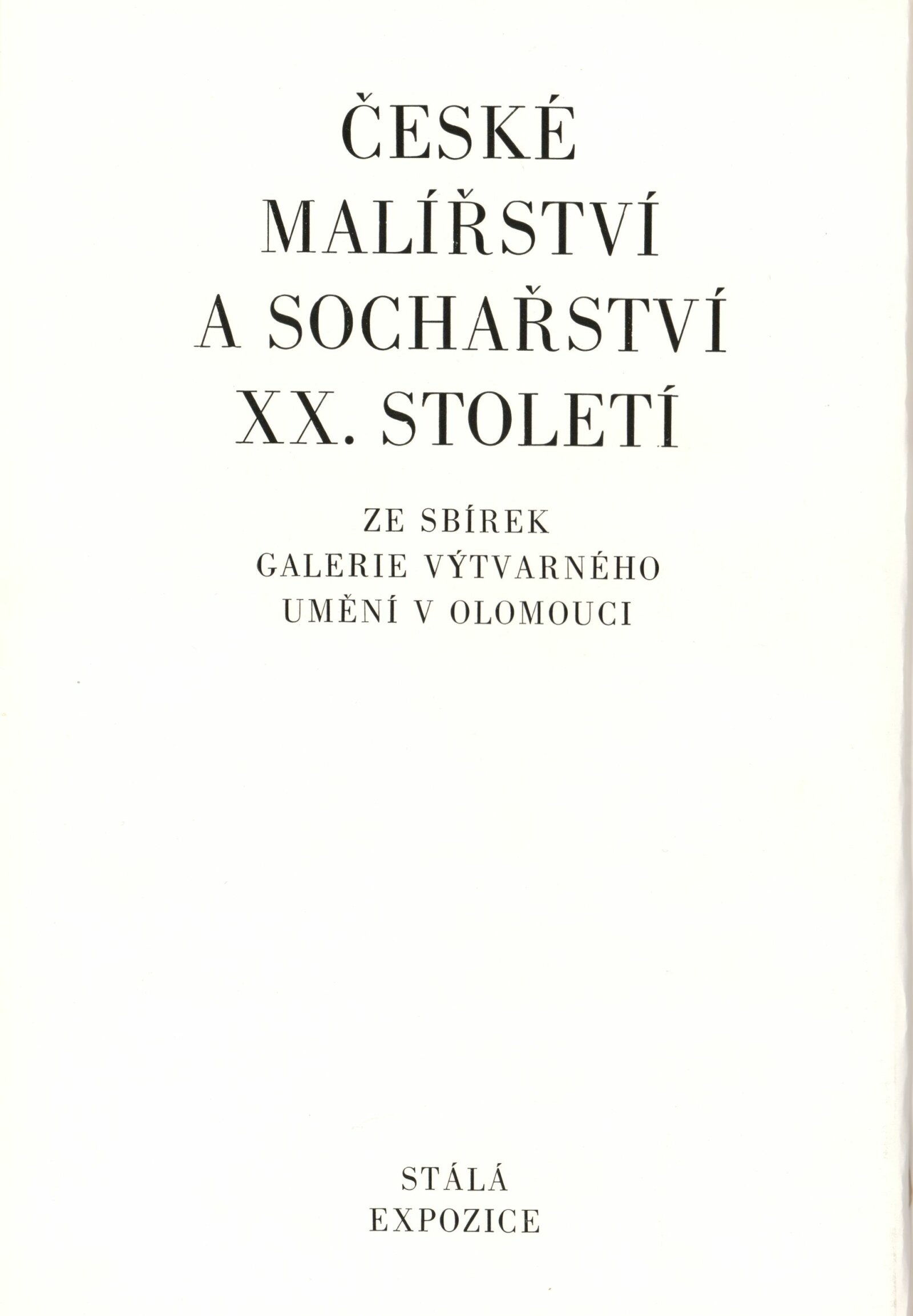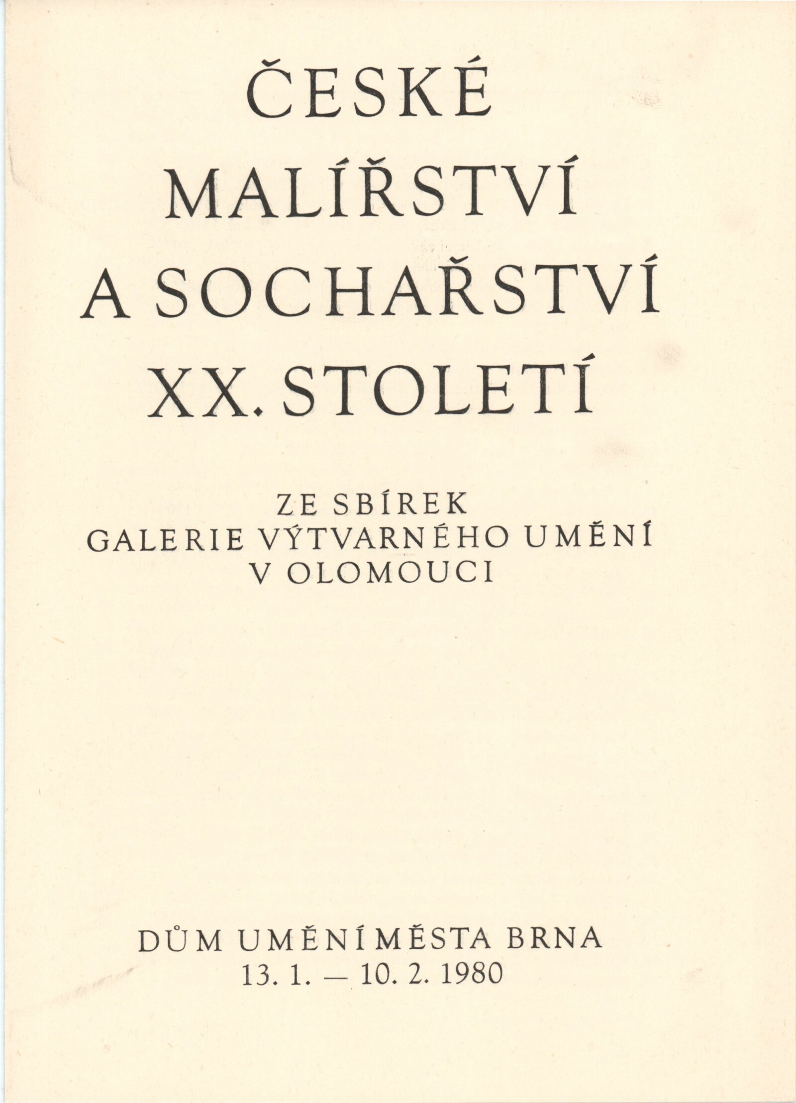 České malířství a sochařství XX. století ze sbírek Galerie výtvarného umění v Olomouci: Dům umění města Brna, 1. patro, 13. 1. – 10. 2. 1980. – Brno: DUmB, 1980. – 4 s. – Seznam exponátů jako vložka ke katalogu České malířství a sochařství XX. století ze sbírek Galerie výtvarného umění v Olomouci. Stálá expozice / Text: Eva Pazderová. – Olomouc: Oblastní galerie výtvarného umění. – 58 s., obr., DU 705