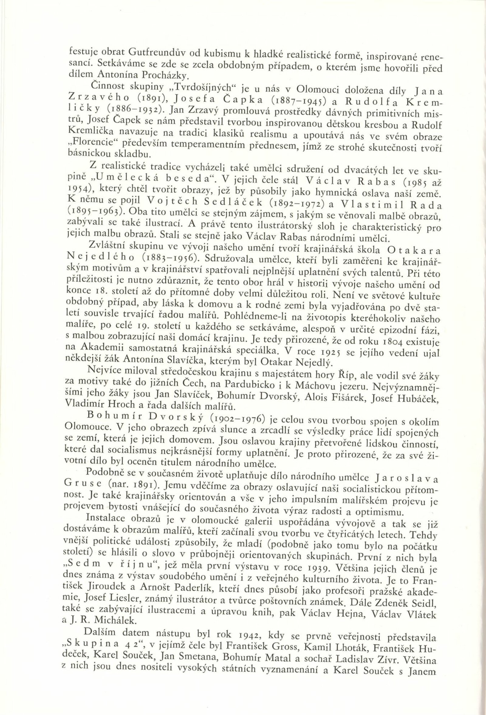 Josef Baják, Jan Bauch, Břetislav Benda, Aljo Beran, František Bílek, Josef Brož, Josef Čapek, Karel Černý, Rudolf Doležal, Bohumír Dvorský, Karel Dvořák, Emil Filla, Alois Fišárek, František Gross, Jaroslav Grus, Otto Guttfreund, Jan Habarta, Roman Havelka, Karel Hladík, Rudolf Hocke, Karel Holan, Miloslav Holý, Vojtěch Hořínek, Vladimír Hroch, Antonín Hudeček, František Hudeček, Rudolf Chorý, Ladislav Jalůvka, Miloslav Jemelka, Karel Jílek, Josef Jíra, Marta Jirásková, František Jiroudek, Bohumil Kafka, František Kavan, Miroslav Ketman, Ladislav Kofránek, Jan Kodet, Pravoslav Kotík, Jaroslav Král, Stanislav Krátký, Rudolf Kremlička, Ludvík Kuba, Otakar Kubín, Bohumil Kubišta, Bohdan Lacina, Sylva Lacinová, Josef Lada, Jan Lauda, Jindřich Lenhart, Karel Lenhart, Kamil Lhoták, Karel Lidický, Stanislav Lolek, Vincenc Makovský, Bohumír Matal, Jiří Marek, Josef Mařatka, Stanislav Menšík, Stanislav Mikuláštík, Alfons Mucha, František Muzika, Josef Václav Myslbek, Vladimír Navrátil, Vratislav Nechleba, Otakar Nejedlý, Vilém Nowak, Oldřich Peč, Antonín Pelc, Jan Preisler, Antonín Procházka, Vladimír Pukl, Václav Rabas, Vlastimil Rada, Martin Reiner, František Ronovský, Martin Salcman, Jan Sedláček, Vojtěch Sedláček, Antonín Slavíček, Jan Smetana, Karel Souček, Stanislav Sucharda, Karel Svolinský, Vladimír Sychra, T. F. Šimon, Václav Špála, Otakar Španiel, Jan Štursa, František Tichý, Jan Trampota, Joža Uprka, František Úprka, Vincenc Vingler, Josef Wagner, Marie Wagnerová, Richard Wiesner, Ladislav Zívr, Jan Zrzavý, Václav Žalud