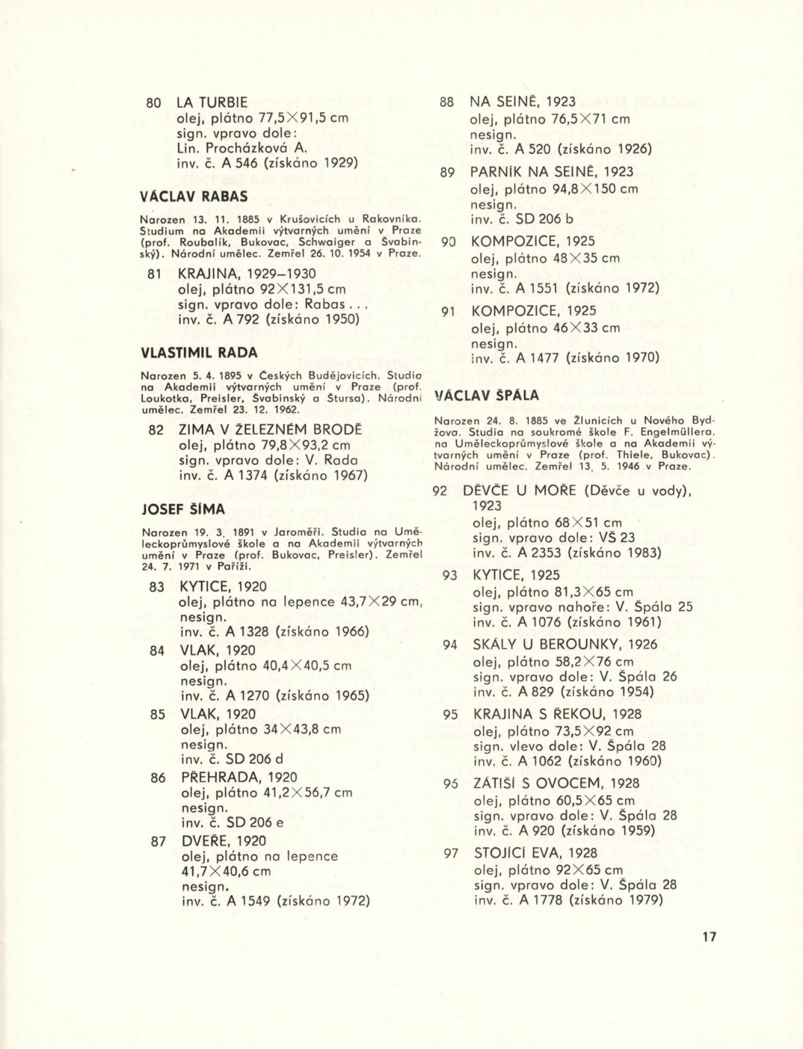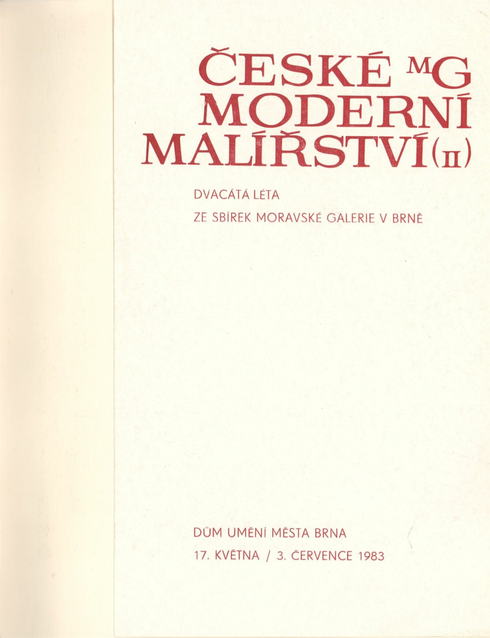 České moderní malířství II. Dvacátá léta. Ze sbírek Moravské galerie v Brně: Dům umění města Brna, 1. patro, 17. 5. – 3. 7. 1983 / Text: Jiří Hlušička. – Brno: Moravská galerie, 1983. – 20 s., 56 s. obr. příl., životní data, DU 760. – MZK; MG