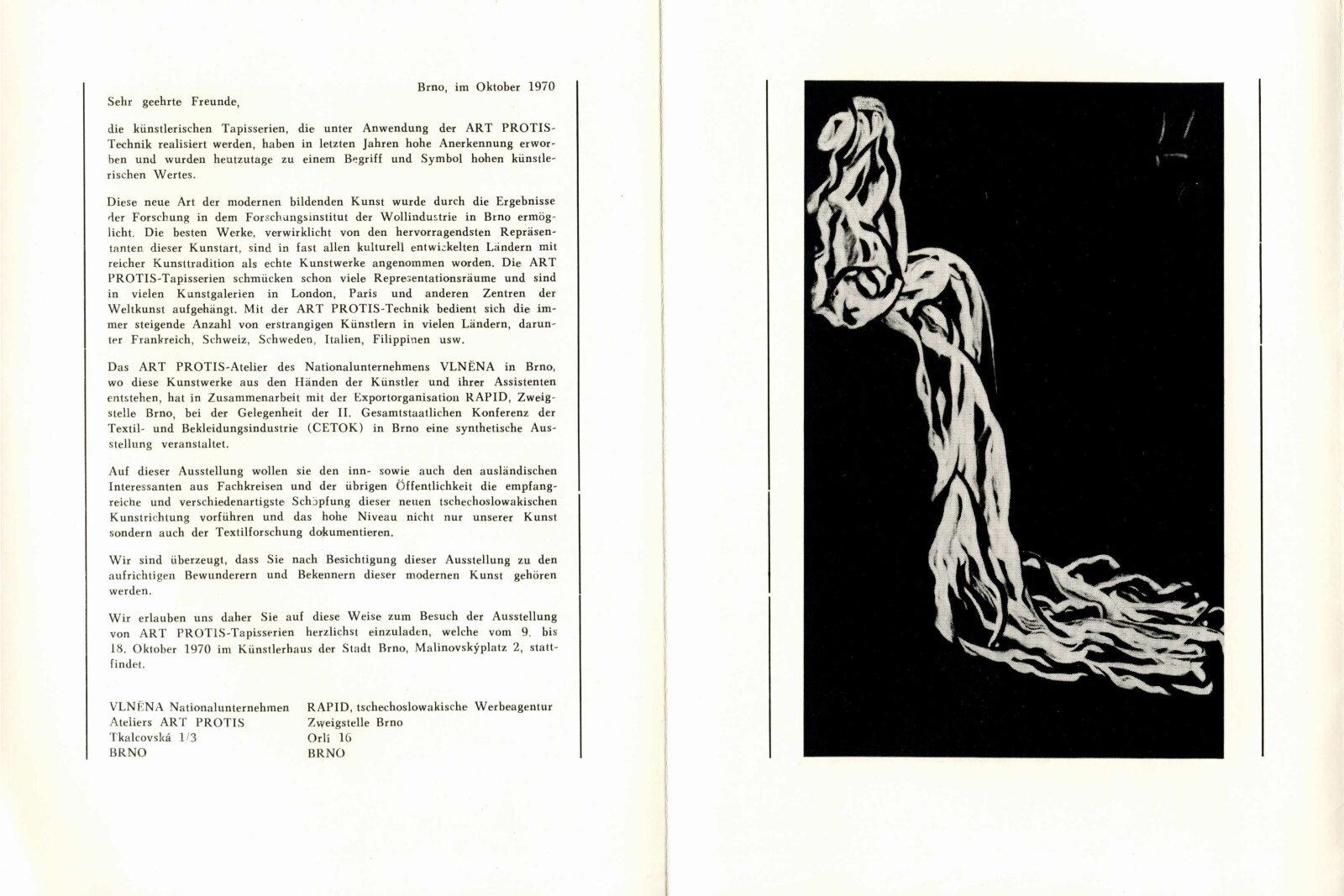 pozvánka, katalog Art Protis, katalog bavlnářského průmyslu (RJ, FJ, NJ), katalog Textilní a oděvní konference, plány rozvržení instalace na půdorysu DU, prodejní katalogy a reklamní materiály textilního průmyslu, zprávy v tisku