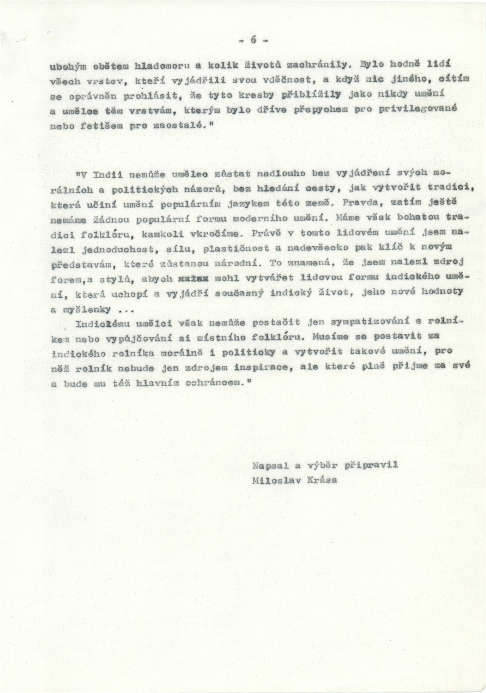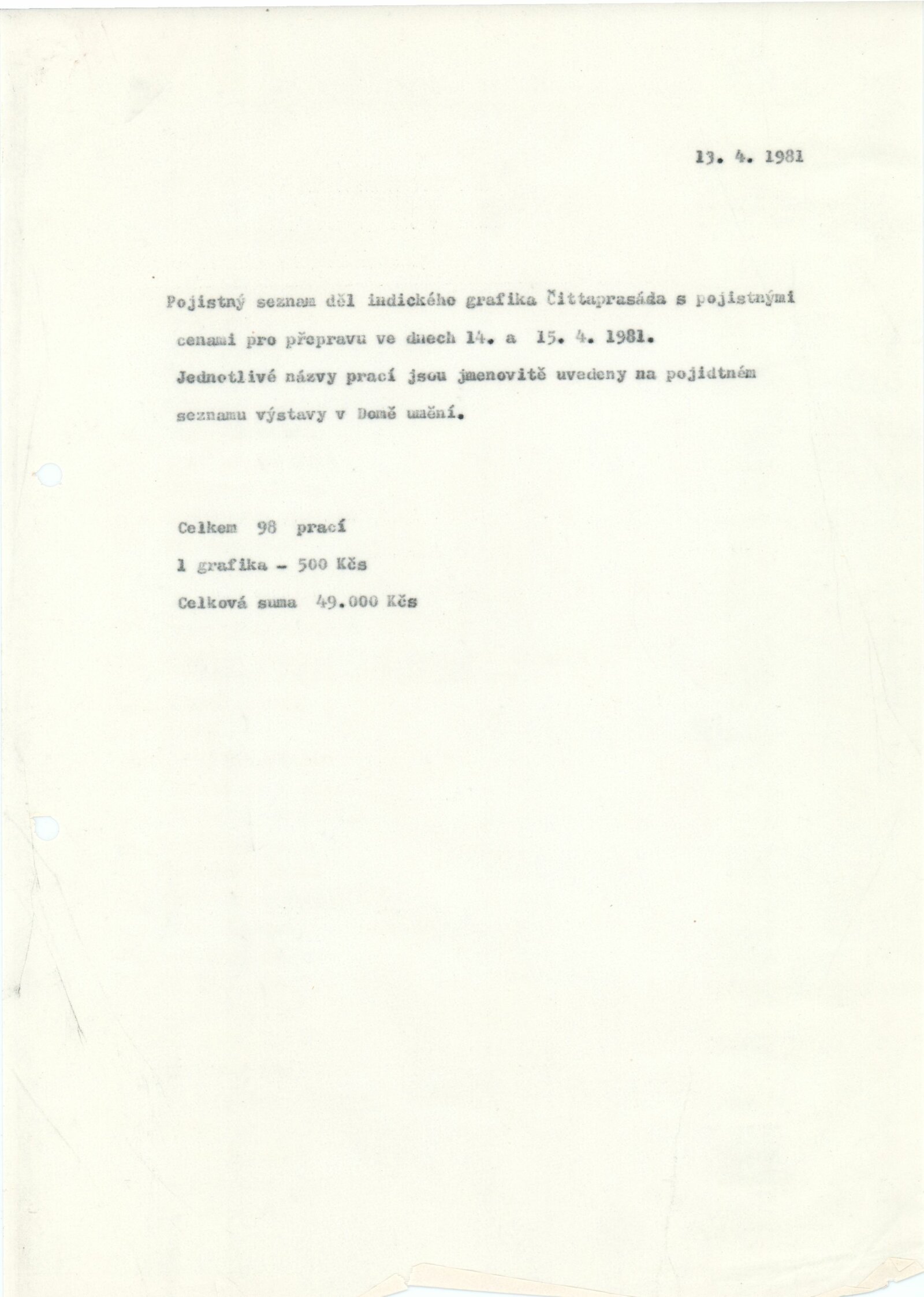 pozvánka, katalog, strojopis, fotografie děl a instalace, fotografie autora, pojistné seznamy, dopis v hindštině, korespondence (Čsl. spol. pro mezinárodní styky 6. 6. 1979, Sbírka orientálního umění NG), pozvání na vernisáž veřejným činitelům a primátorovi, smlouva o dočasném užívání s NG a potvrzení o převzetí, recenze v tisku, pozvánka na autorovu výstavu v Litoměřicích (1980), katalog výstavy autora ve výst. síni FRONTA (1979)