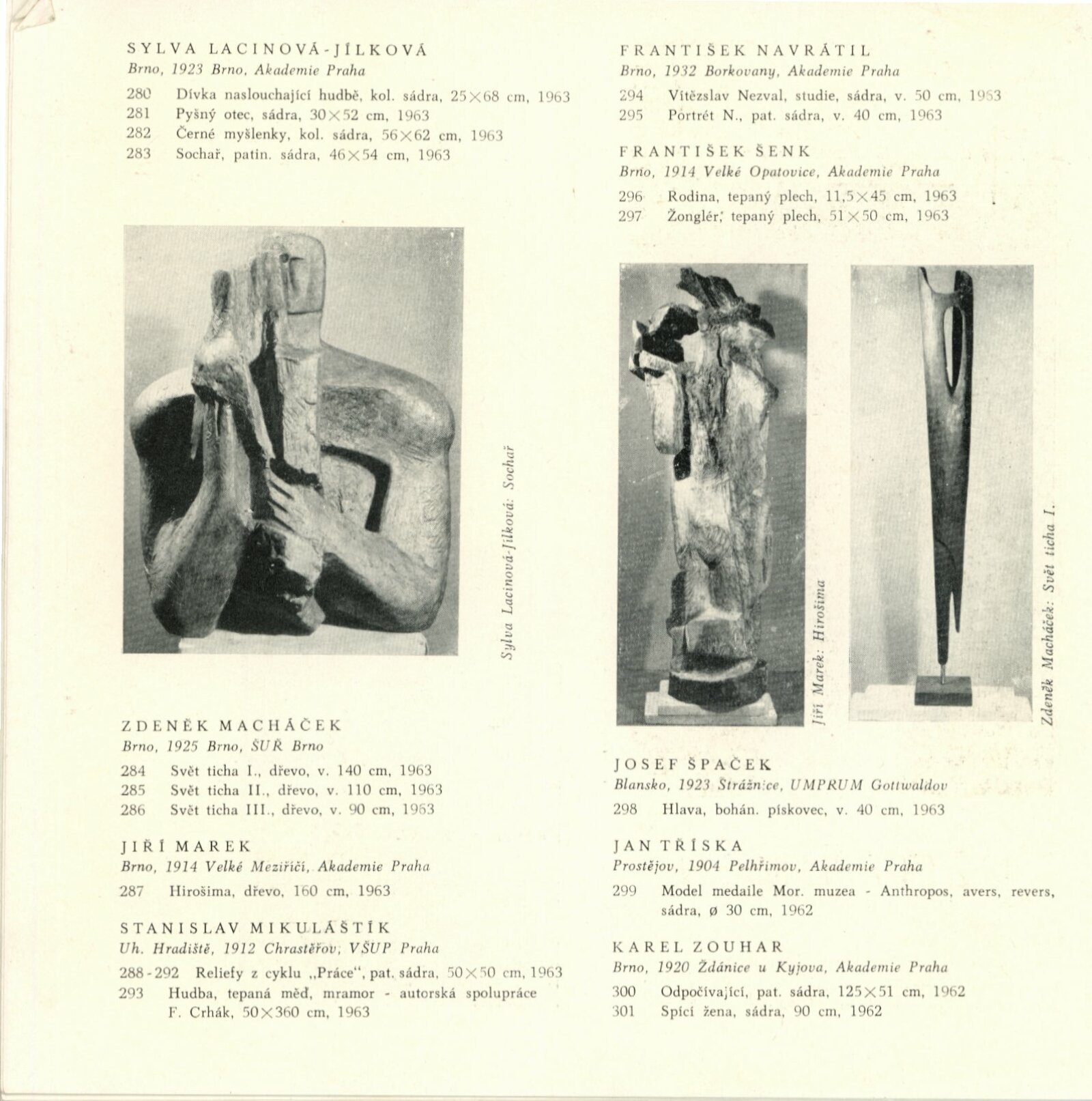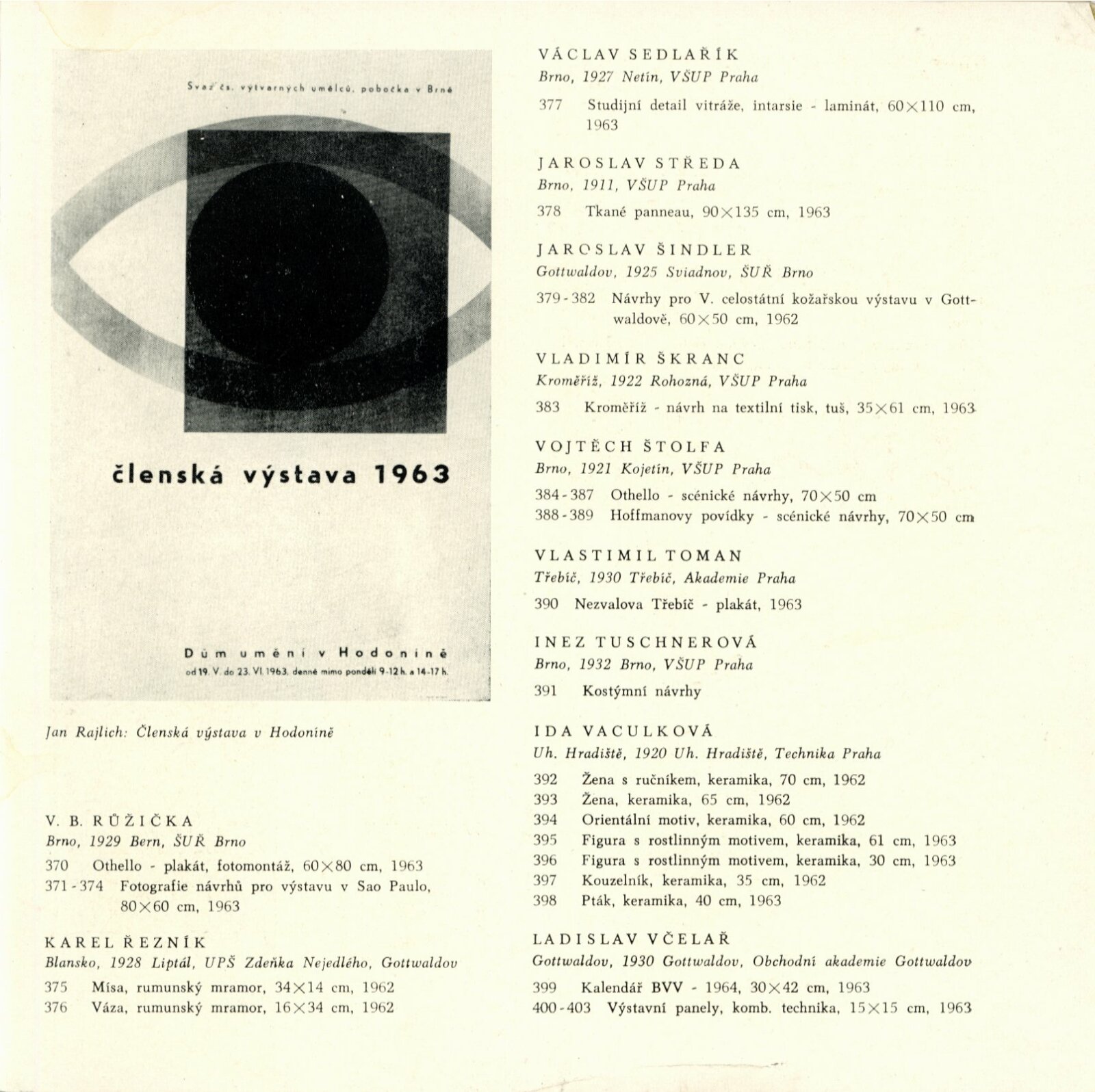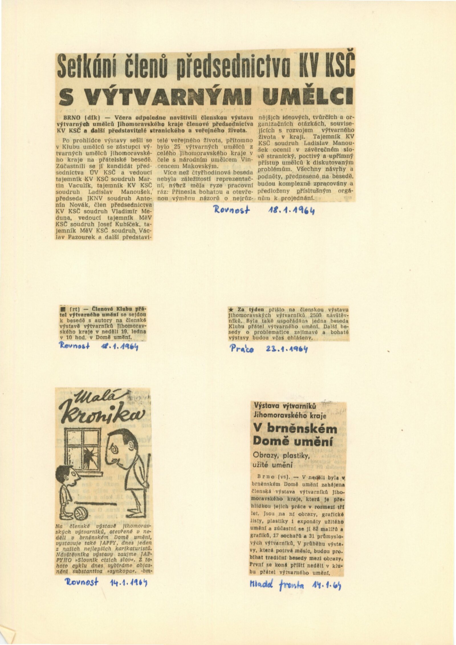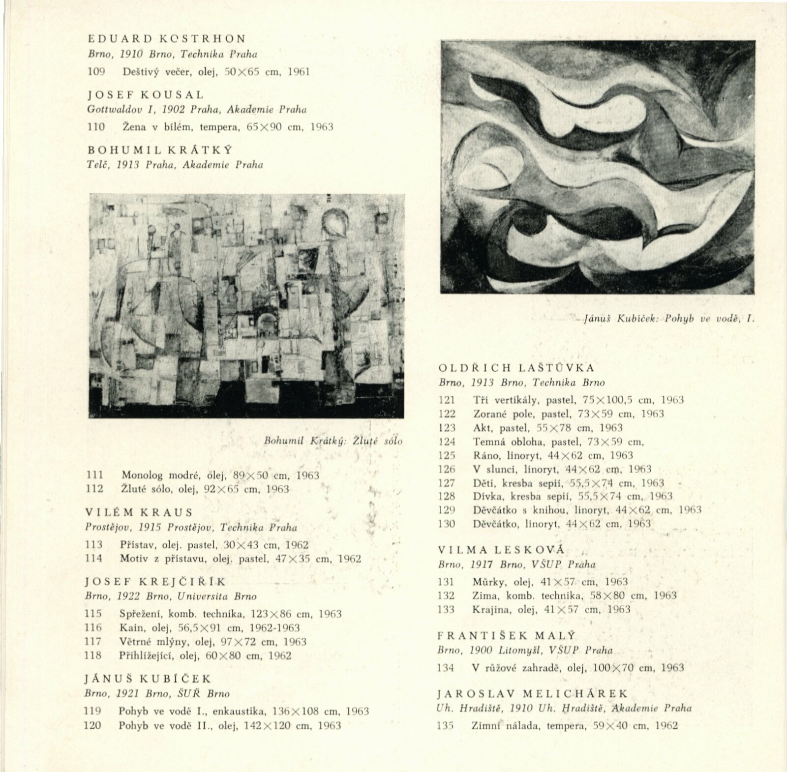 Členská výstava 1964 výtvarných umělců Jihomoravského kraje: Dům umění města Brna, 12. 1. – 16. 2. 1964 / Text: Ivo Krsek. – Brno: SČSVU, 1964. – 22 s., obr., životní data vystavujících, DU 428. – MZK; MG; MMB