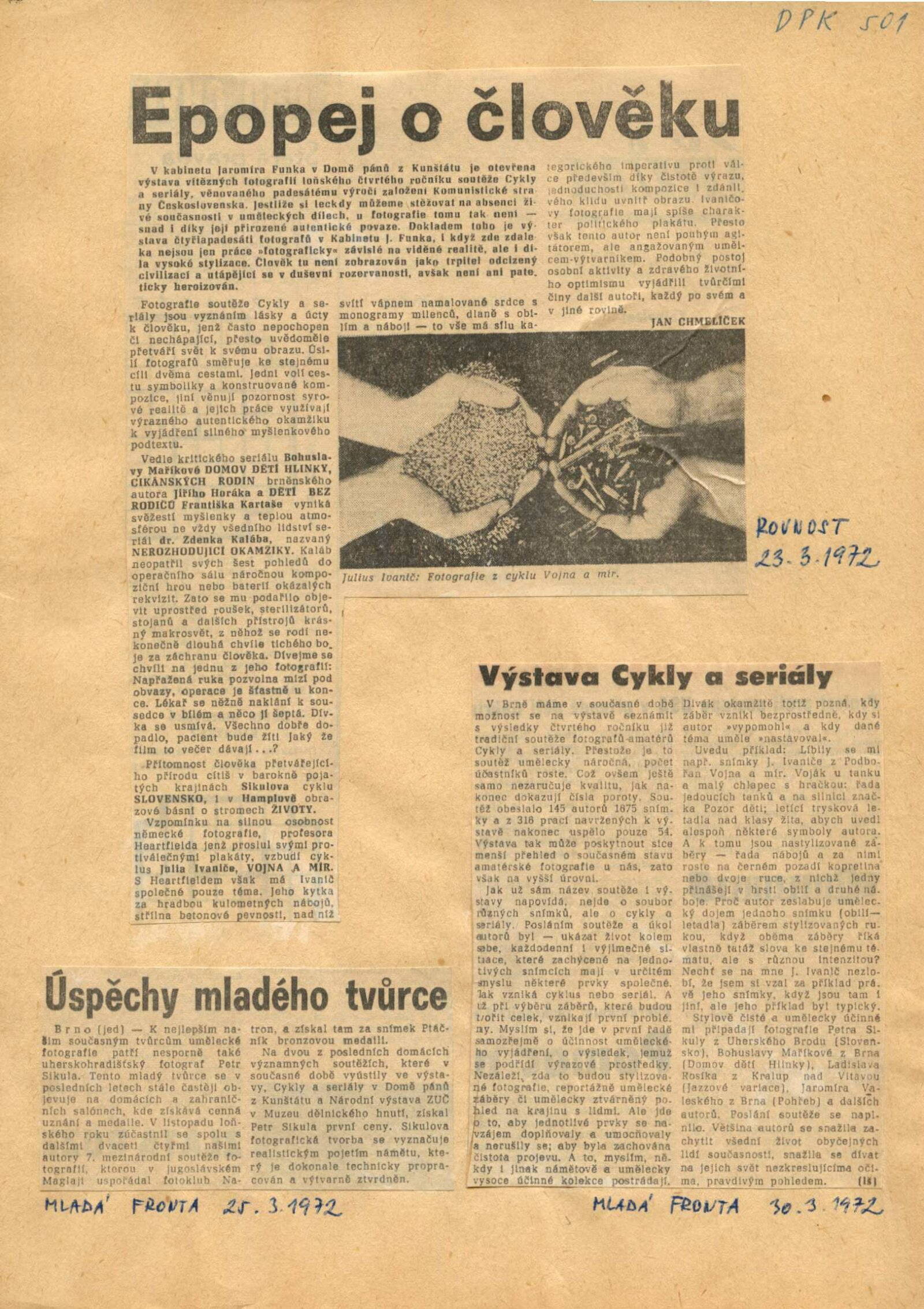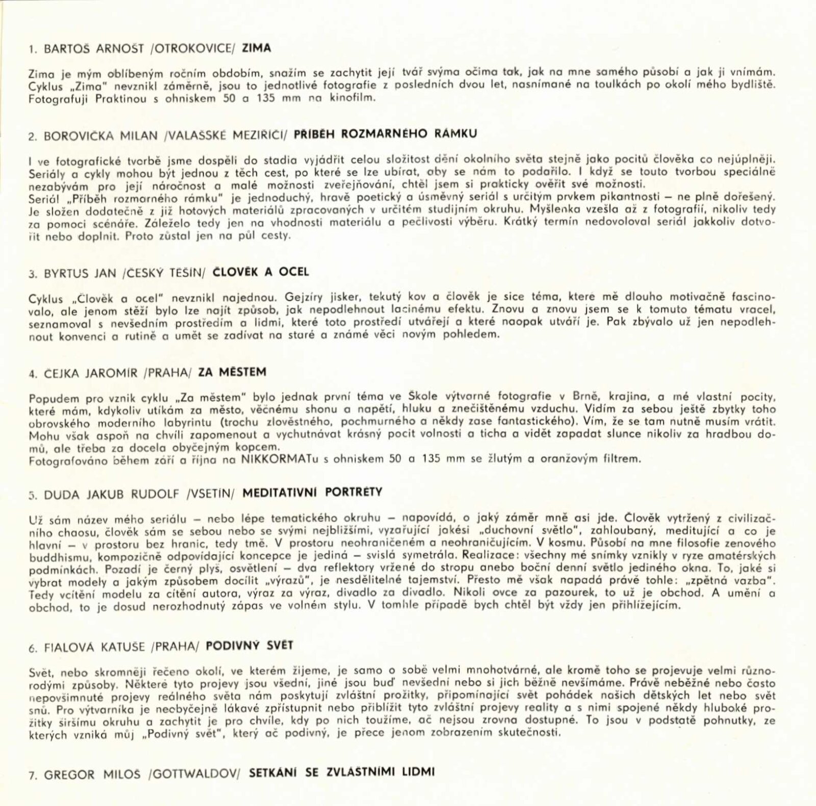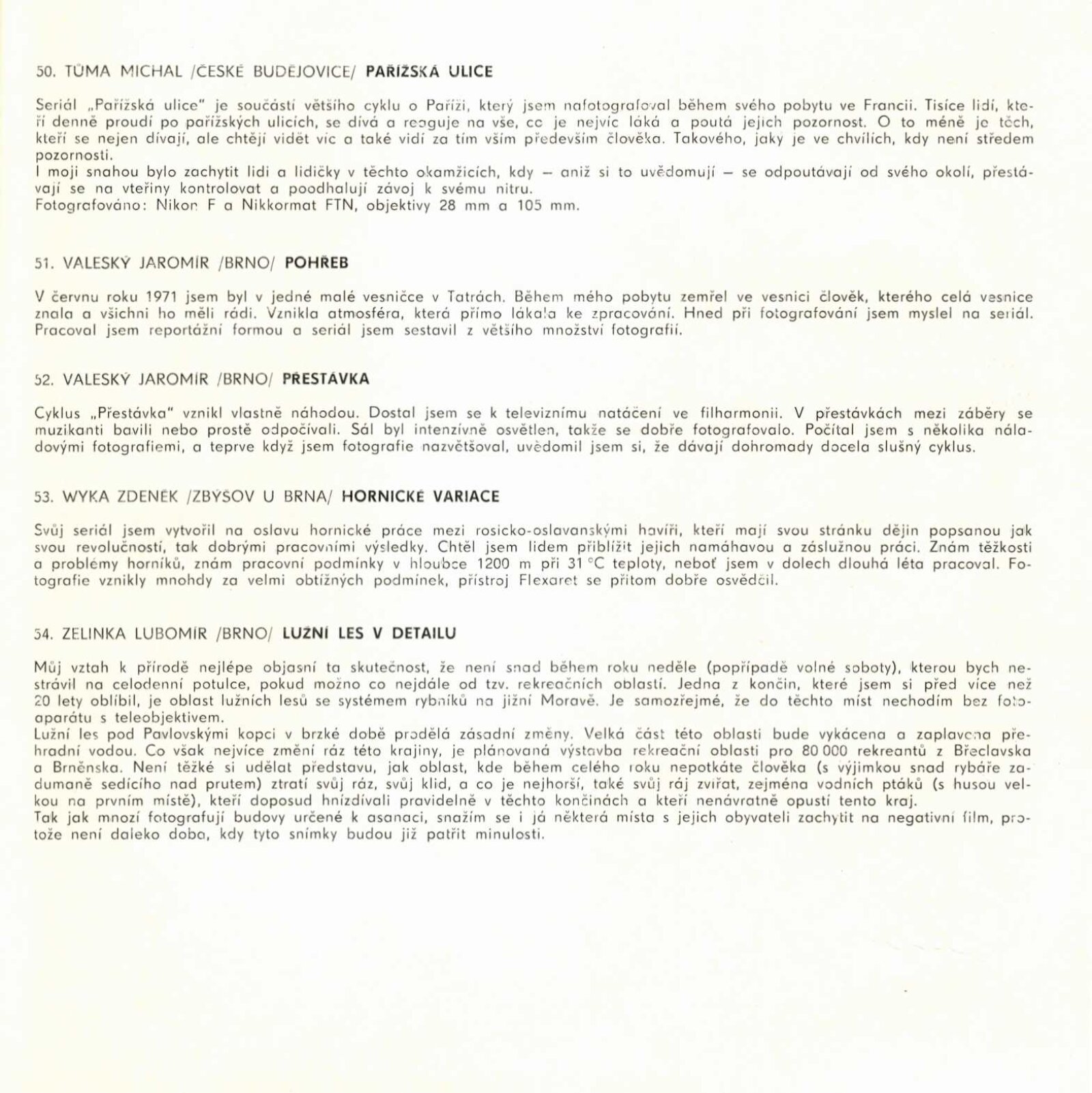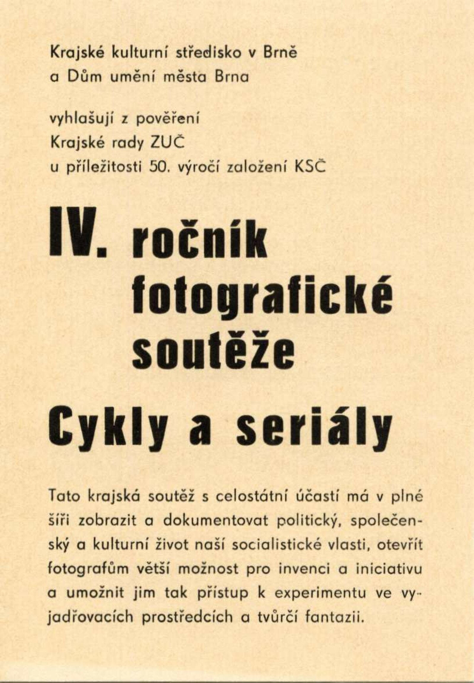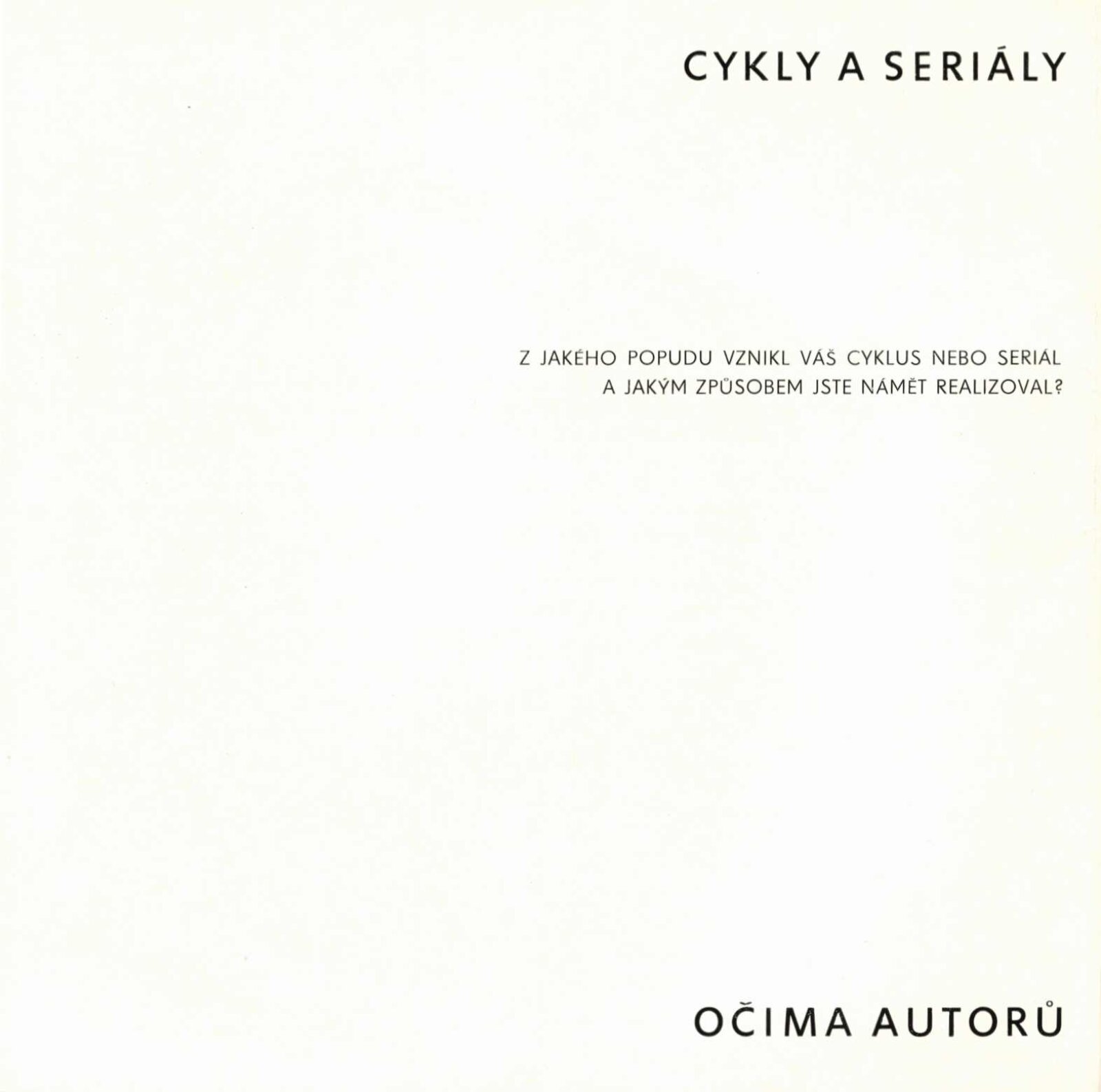 Cykly a seriály. Katalog výstavy: Dům umění města Brna / Dům pánů z Kunštátu, 120. výstava Kabinetu fotografie Jaromíra Funka, 3. 3. – 26. 3. 1972 / Texty: Antonín Koutník, autoři fotografií. – Brno: Krajské kulturní středisko, 1972. – 30 s., obr., DPK 501. – MZK
