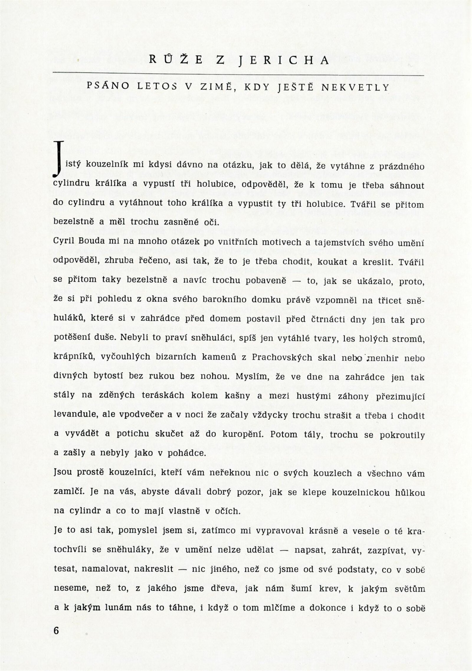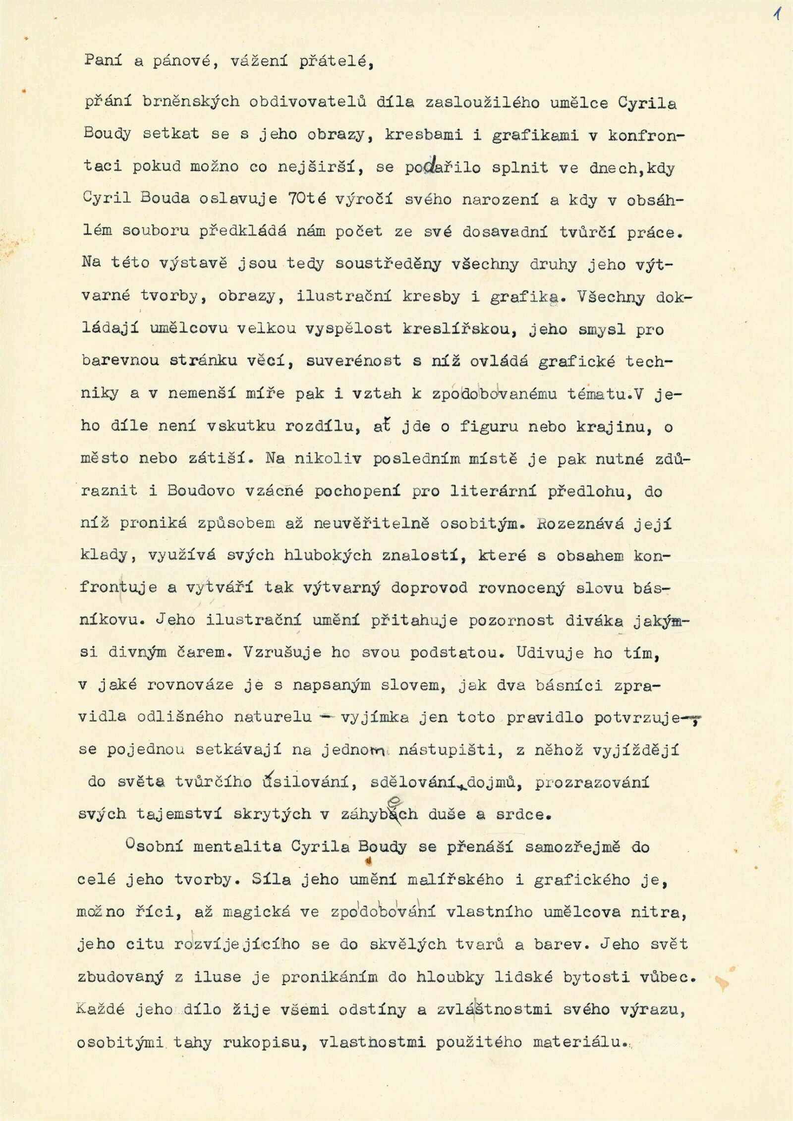 pozvánka, katalog DPK (společný s GVŠ Praha), úvodní slovo na vernisáži (Helena Kusáková-Knozová), seznam prací pro GVŠ Praha, provozní korespondence (SČVU, NG, DU), korespondence o převzetí výstavy (SČVU), žádost o povolení výstavy, recenze v tisku, parte Cyrila Boudy, pozvánka převzaté výstavy (Galerie Václava Špály v Praze), informační leták, katalog (Galerie Josefa R. Vilímka), leták k výstavě v Boskovicích (1976)