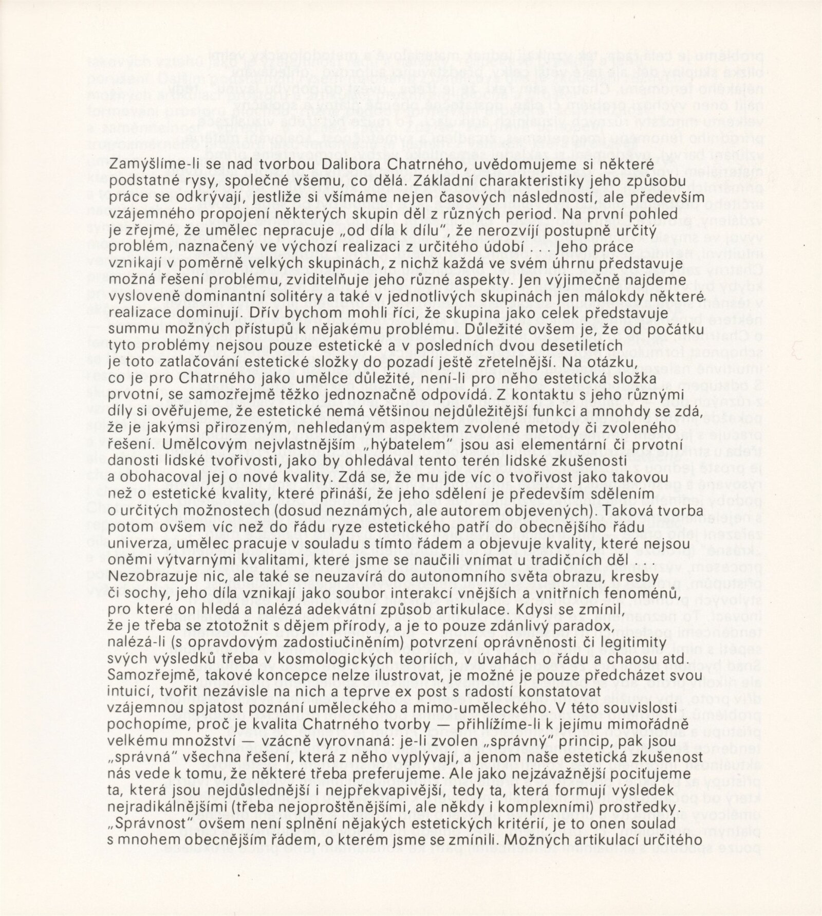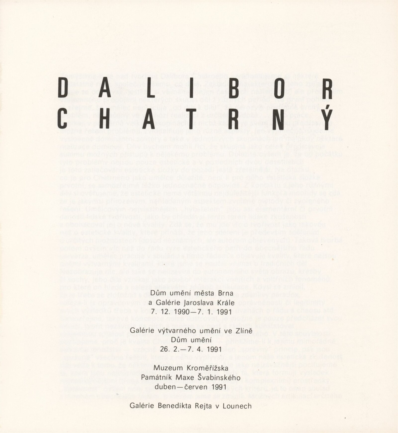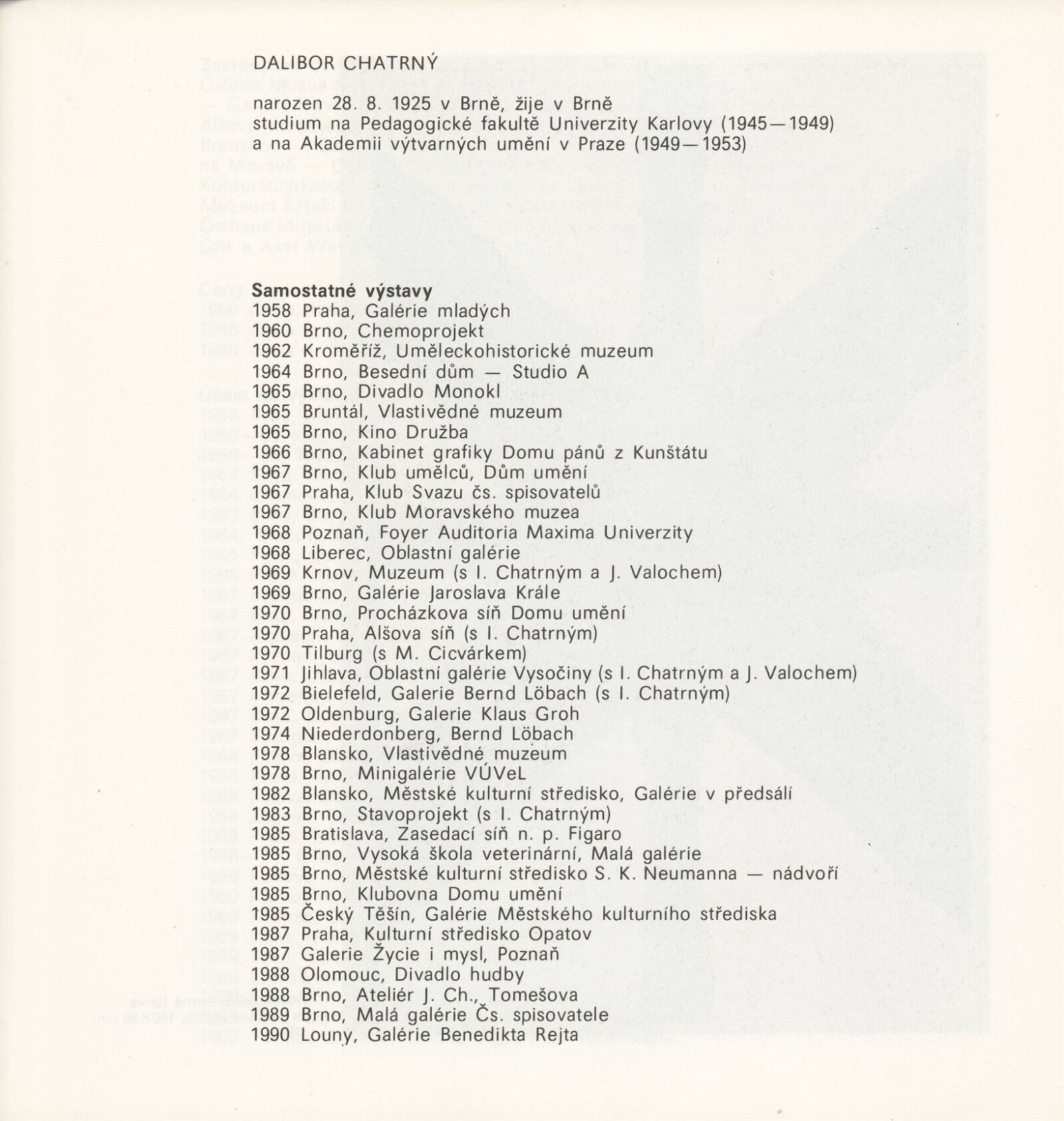 Dalibor Chatrný: Dům umění města Brna, Galerie Jaroslava Krále, 1. patro, 7. 12. 1990 – 7. 1. 1991 / Text: Jiří Valoch. – Brno: DUmB, 1990. – [66] s., obr., životní data, výstavy, zastoupení ve sbírkách, ceny, soukromé publikace, realizace, DU 890. – MZK; MG; MMB