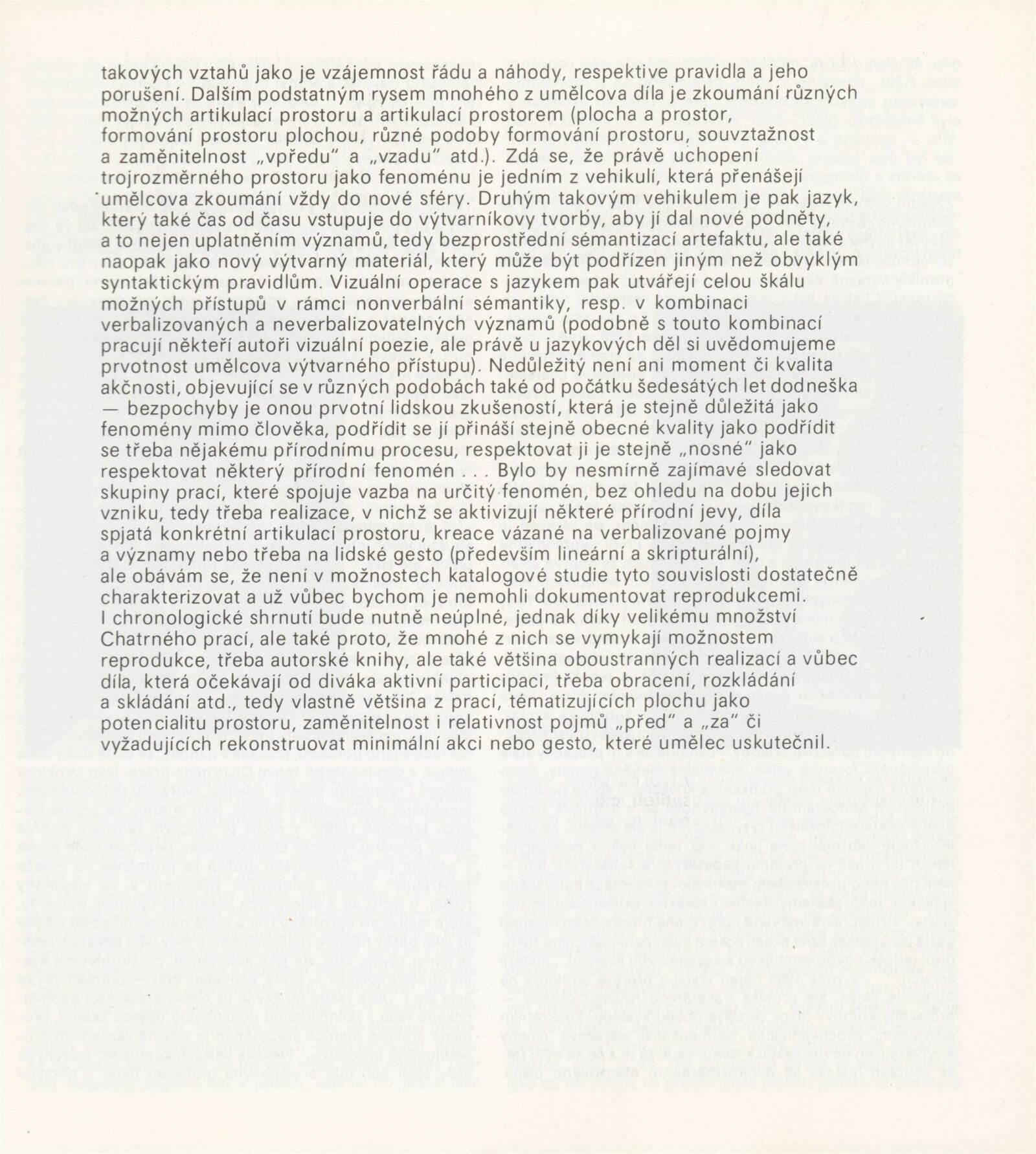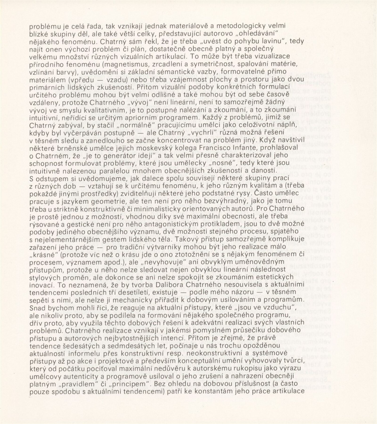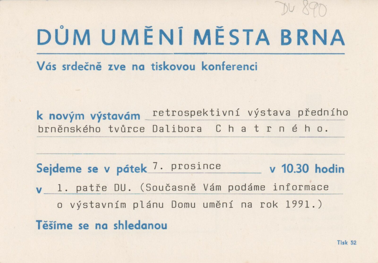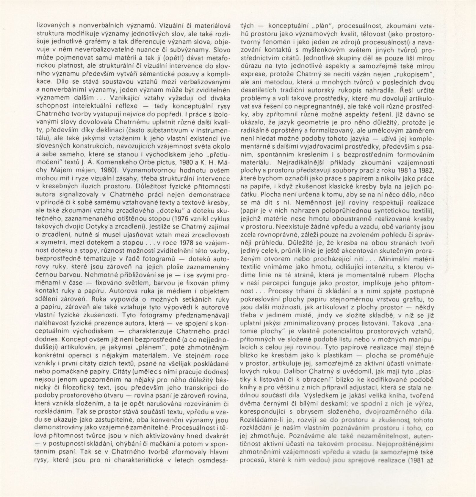 Dalibor Chatrný: Dům umění města Brna, Galerie Jaroslava Krále, 1. patro, 7. 12. 1990 – 7. 1. 1991 / Text: Jiří Valoch. – Brno: DUmB, 1990. – [66] s., obr., životní data, výstavy, zastoupení ve sbírkách, ceny, soukromé publikace, realizace, DU 890. – MZK; MG; MMB