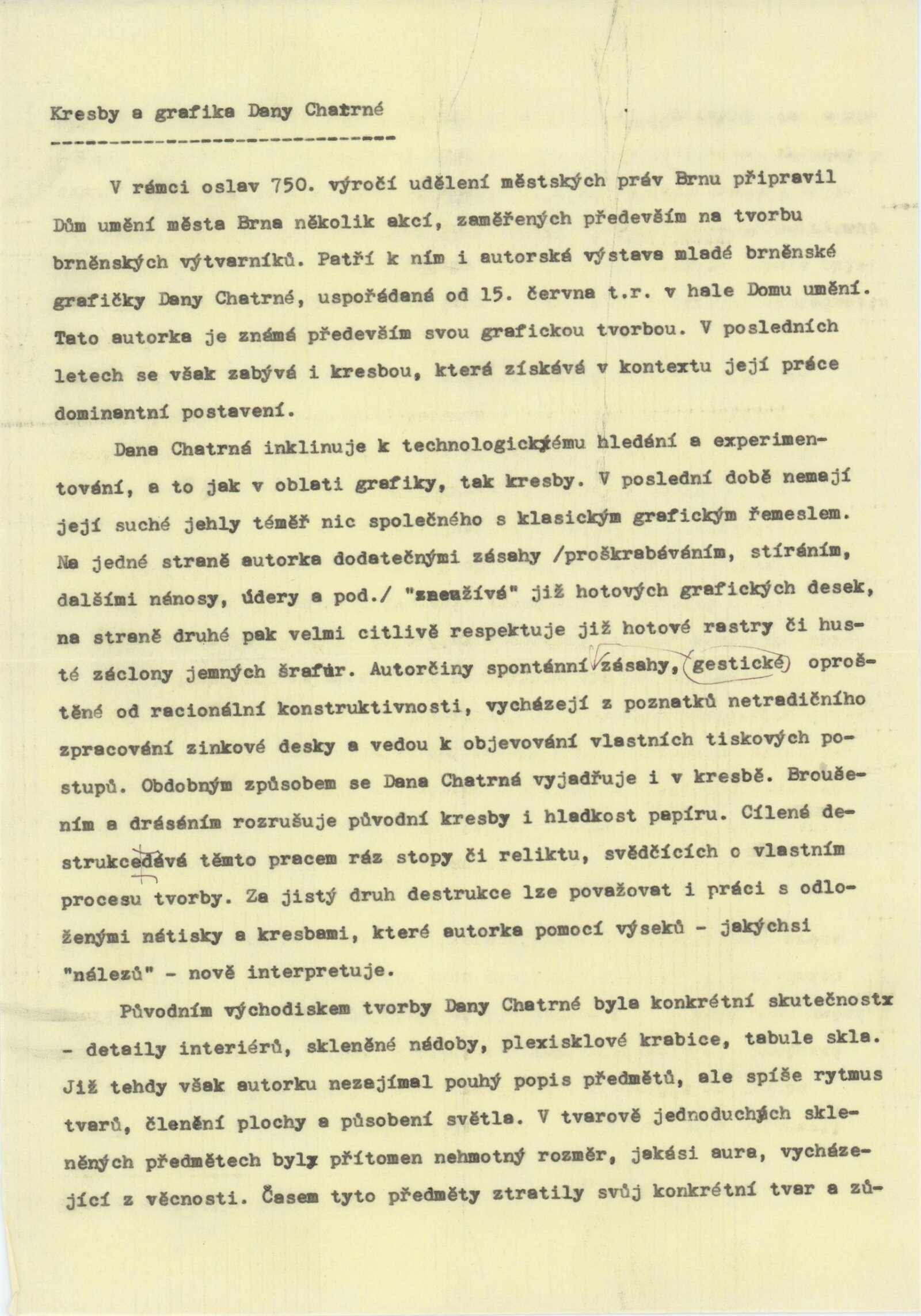 Dana Chatrná. Kresby a grafika: Dům umění města Brna, hala 15. 6. – 18. 7. 1993 / Text Jiřina Hockeová. - Brno: TT klub výtvarných umělců, - [4] s., obr. v 6 stránkovém obalu, obr. Portrét, životní data, výstavy DU 947; MG