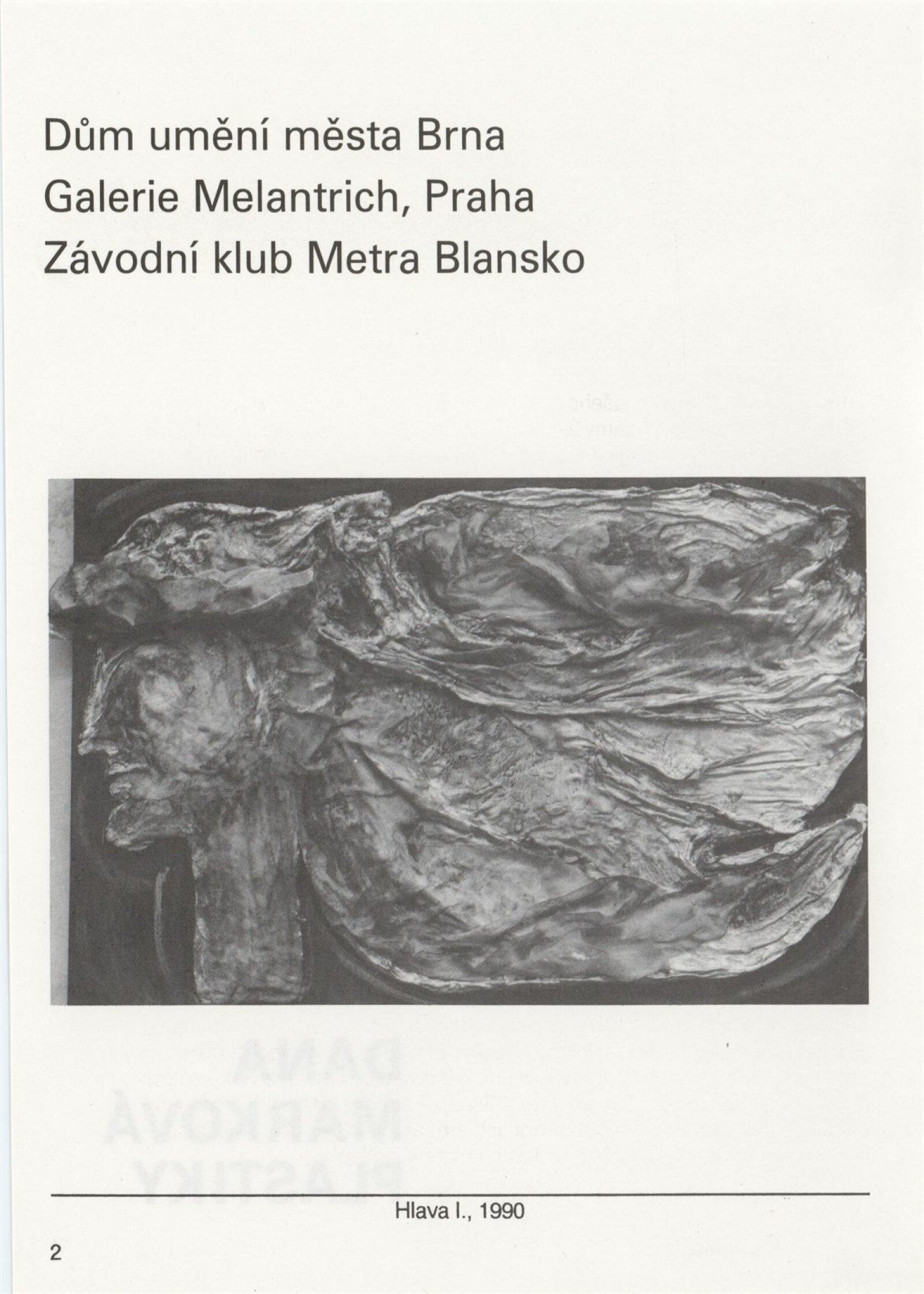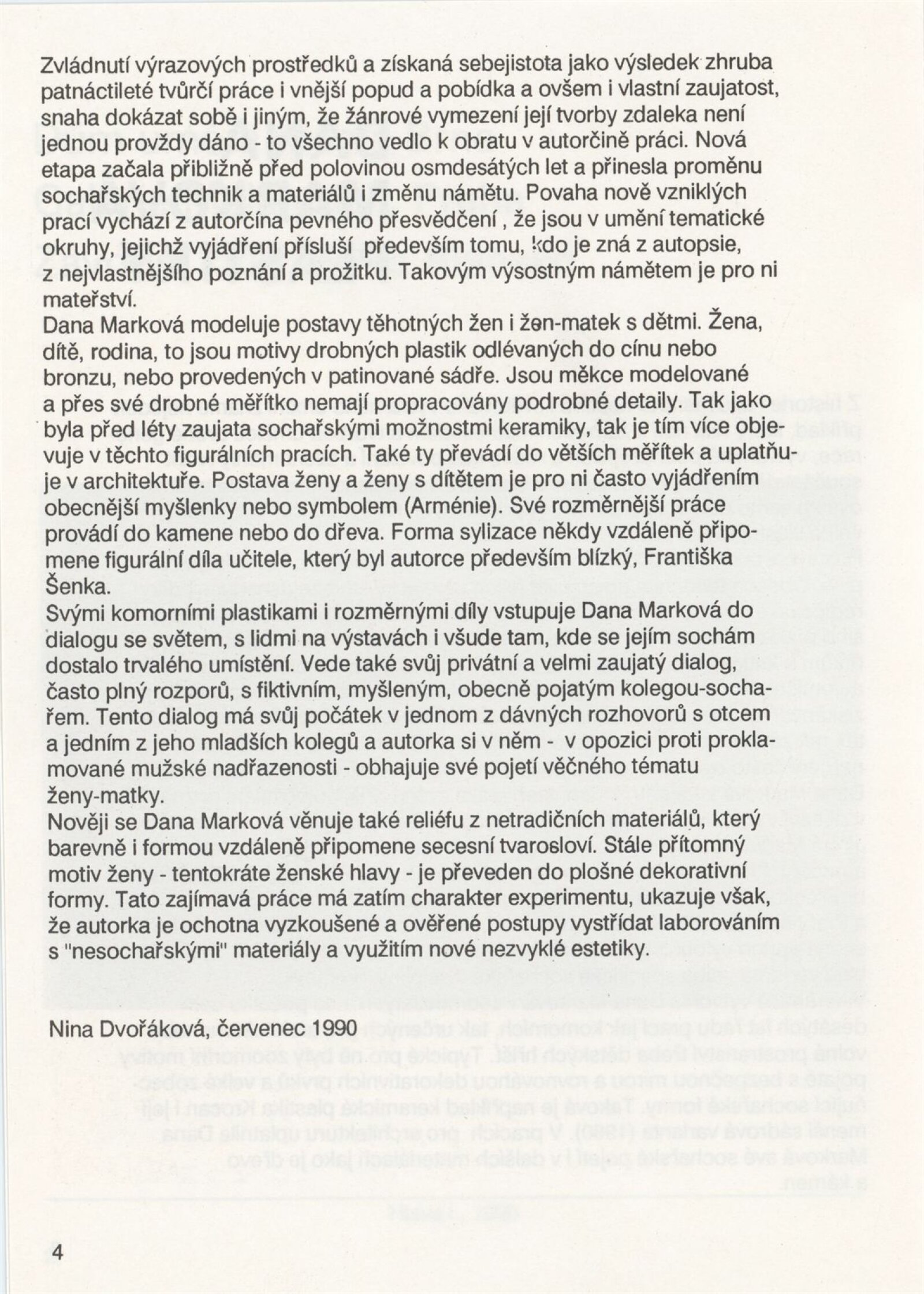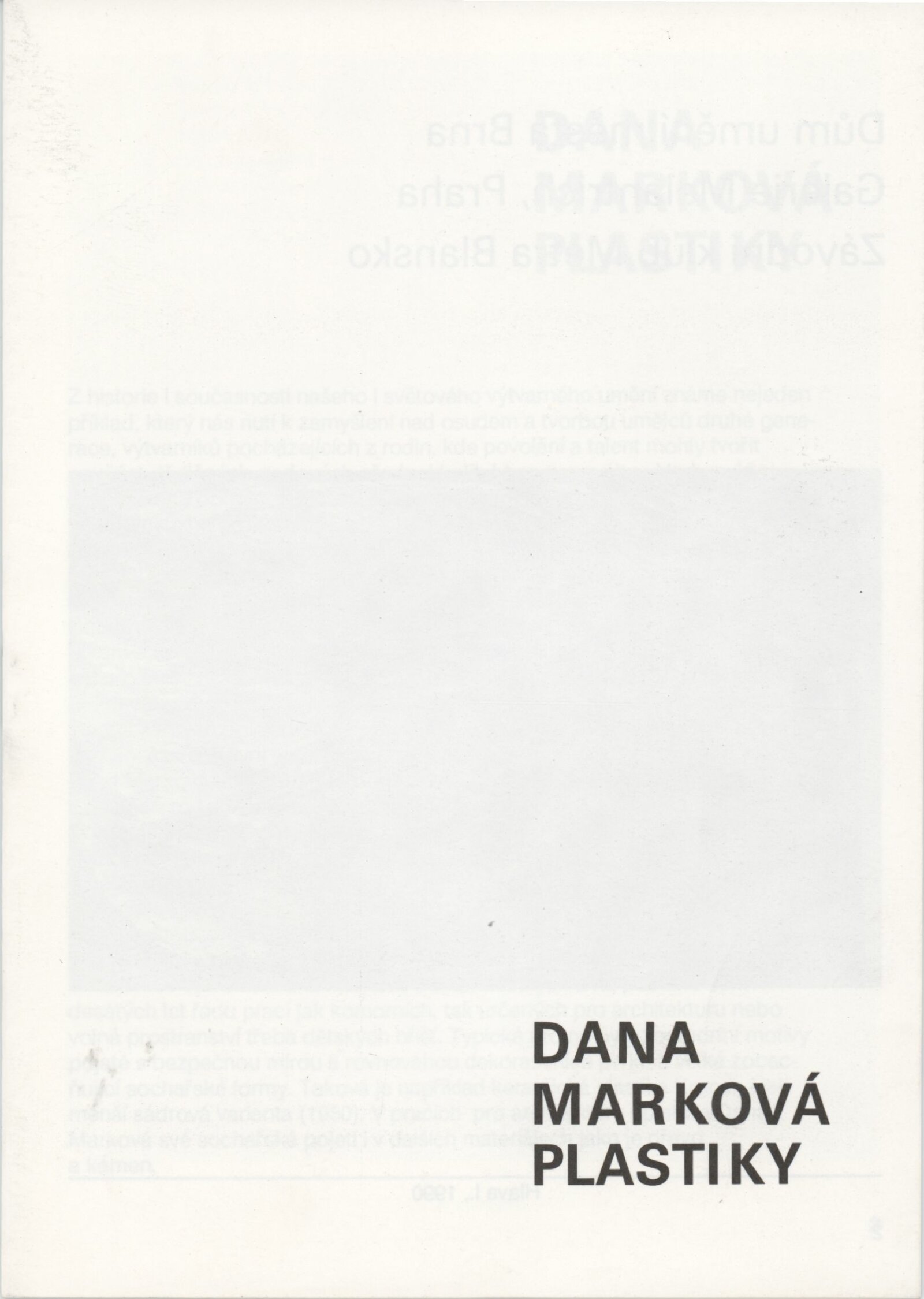 Dana Marková. Plastiky: Galerie Stará radnice, podkroví, 8. 1. – 3. 2. 1991 / Text: Nina Dvořáková. – Brno: DUmB, 1991. – 23 s., obr., GSR 90. – MZK; MG