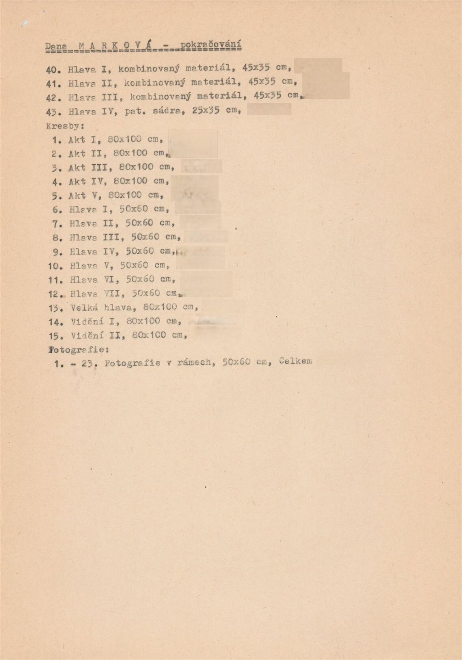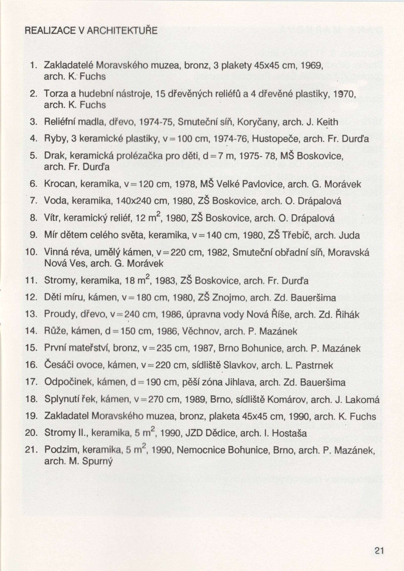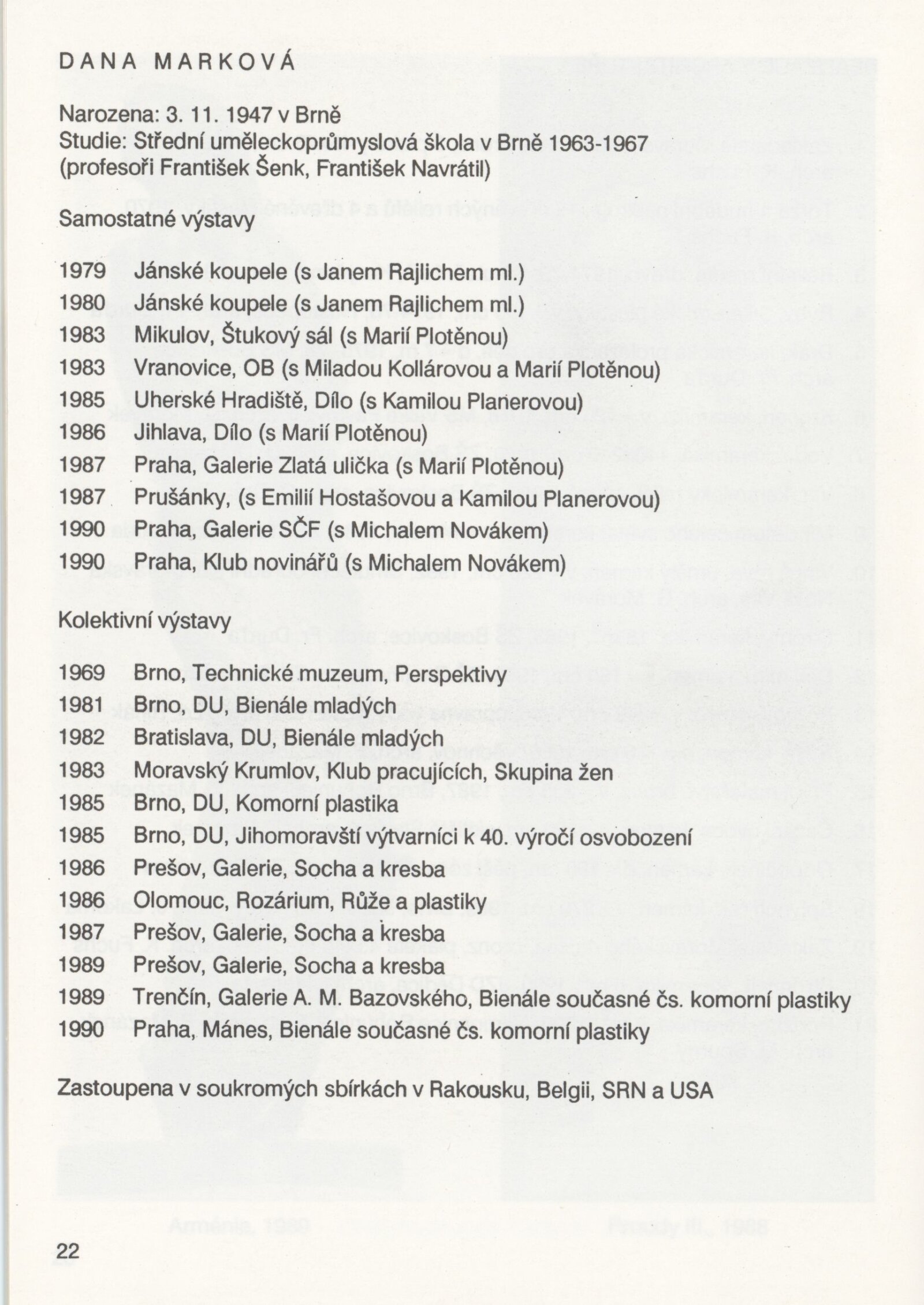 Dana Marková. Plastiky: Galerie Stará radnice, podkroví, 8. 1. – 3. 2. 1991 / Text: Nina Dvořáková. – Brno: DUmB, 1991. – 23 s., obr., GSR 90. – MZK; MG