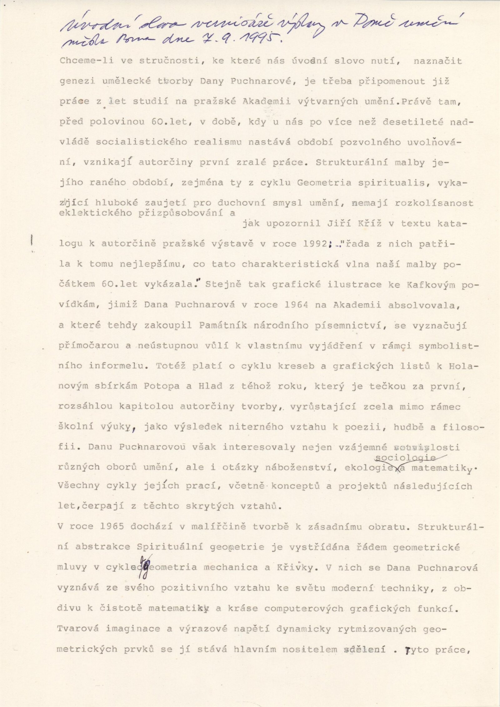 Dana Puchnarová: hala Du 7. 9. – 8. 10. 1995. Převzatý katalog Dana Puchnarová. Dvě tváře utopie: Galerie bratří Čapků, Praha 22. 10. – 22. 11. 1992 / Text Jan Kříž. - Praha: UVU, - [14] s., obr. DU 1003