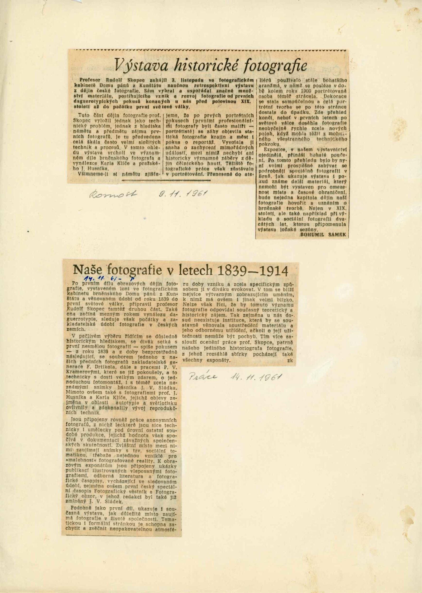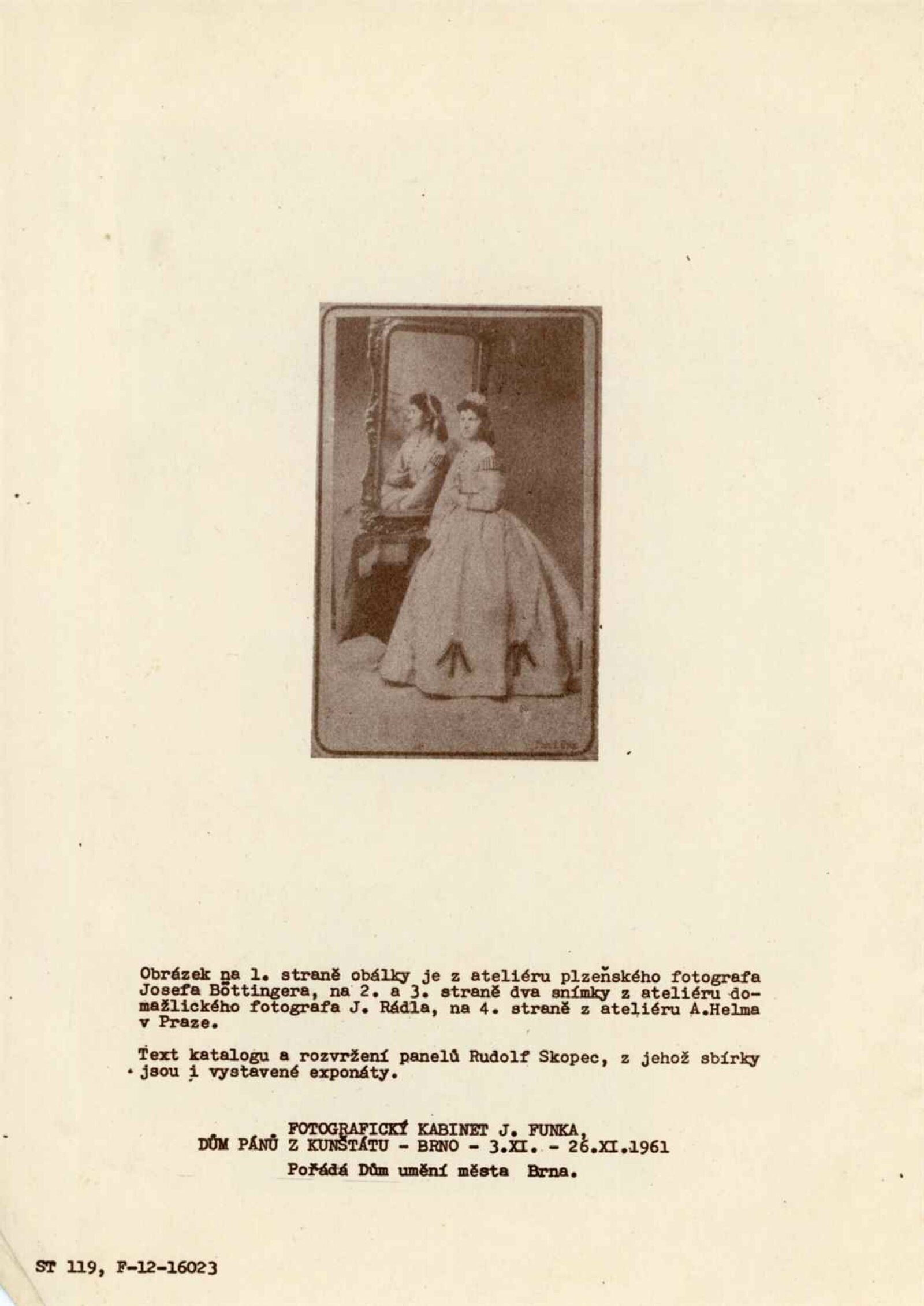 Dějiny fotografie II. 1839–1914: Dům umění města Brna / Dům pánů z Kunštátu, 26. výstava Kabinetu fotografie Jaromíra Funka, 3. 11. – 26. 11. 1961 / Text: Rudolf Skopec. – Brno: DUmB, 1961. – 8 s., DPK 127. – MZK; MG; MMB