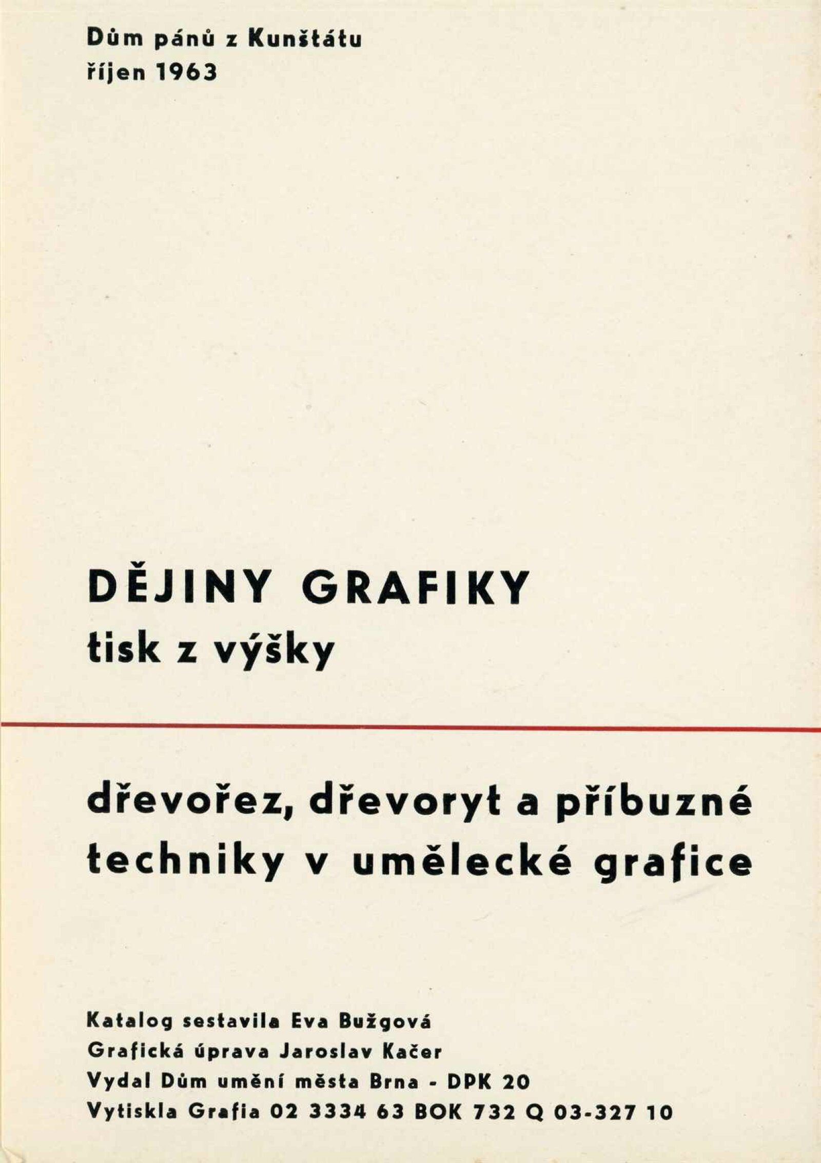 Dějiny grafiky. Tisk z výšky. Dřevořez, dřevoryt, a příbuzné techniky v umělecké grafice: Dům umění města Brna / Dům pánů z Kunštátu, 48. výstava Kabinetu grafiky, 4. 9. – 3. 11. 1963 / Text: Eva Bužgová. – Brno: DUmB, 1963. – 16 s., obr., DPK 205. – MZK; MG