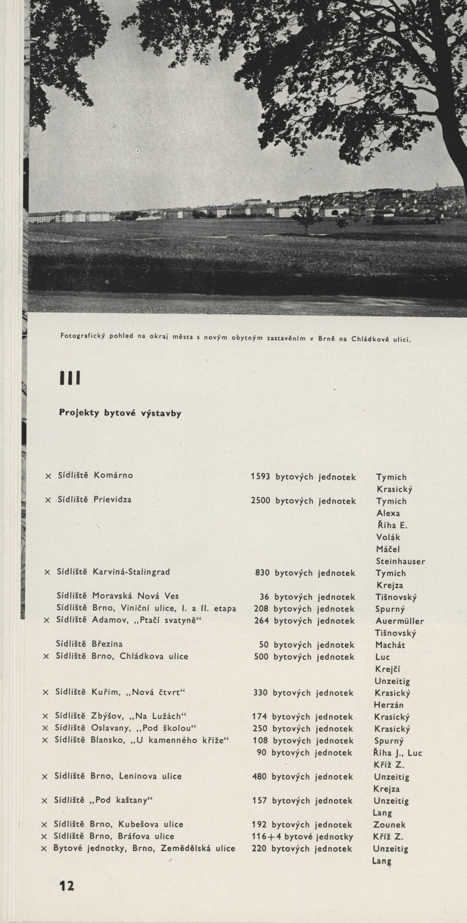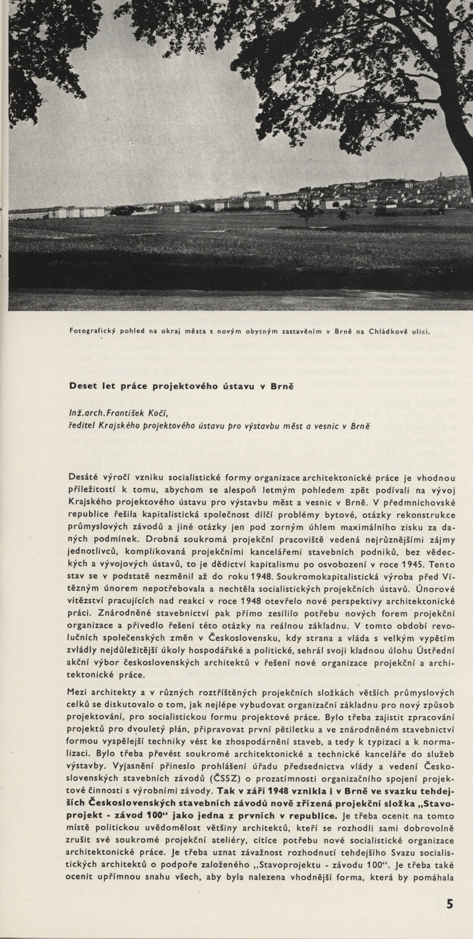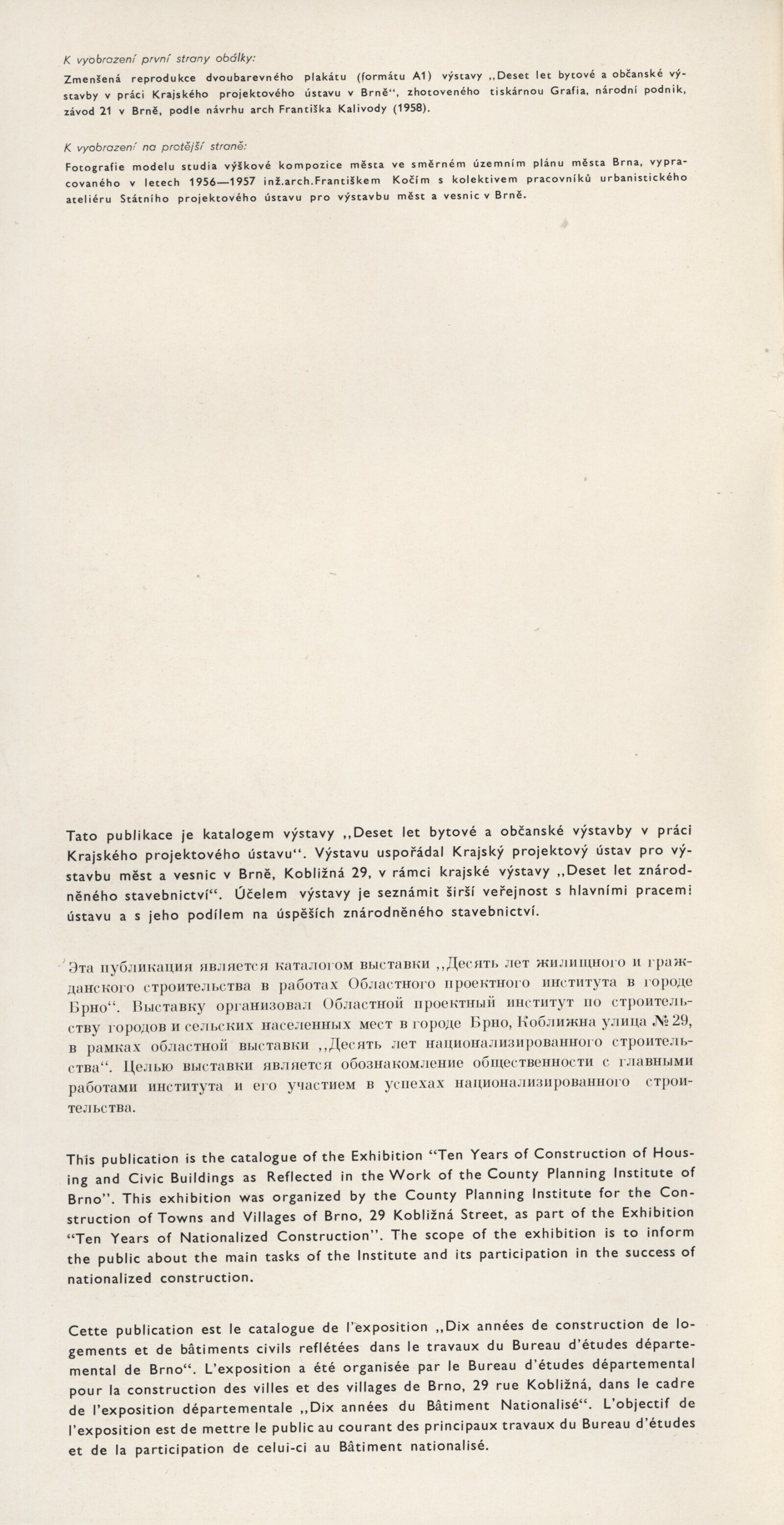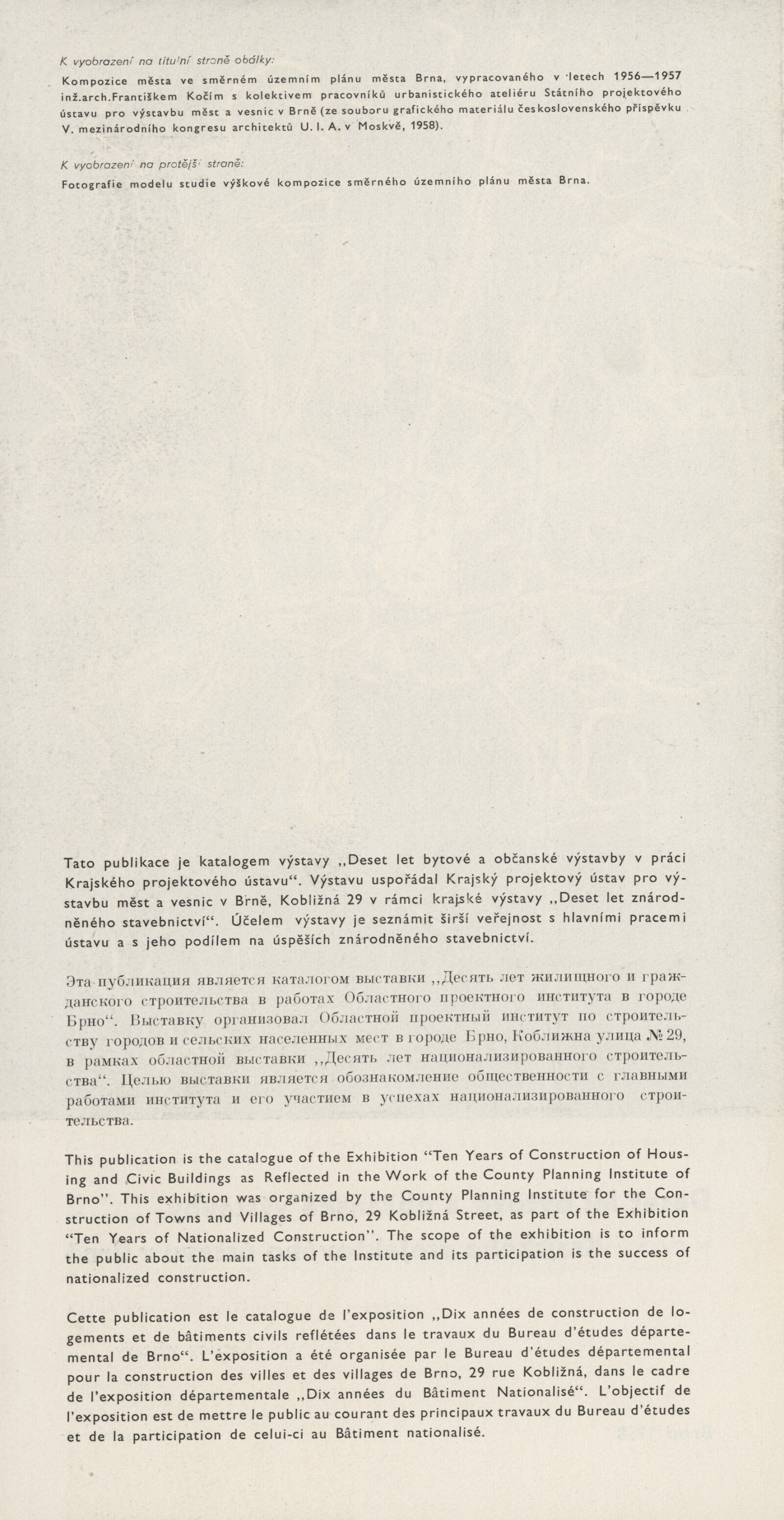 Deset let bytové a občanské výstavby v práci Krajského projektového ústavu v Brně, Dům umění města Brna, 30. 8. – 21. 9. 1958 / Text: František Kočí. – Brno: Krajský projektový ústav pro výstavbu měst a vesnic, 1958. – 2 vyd. s tímtéž textem, 2. vydání je doplněné, 30 s. a 31 s., obr., DU 311. – MZK