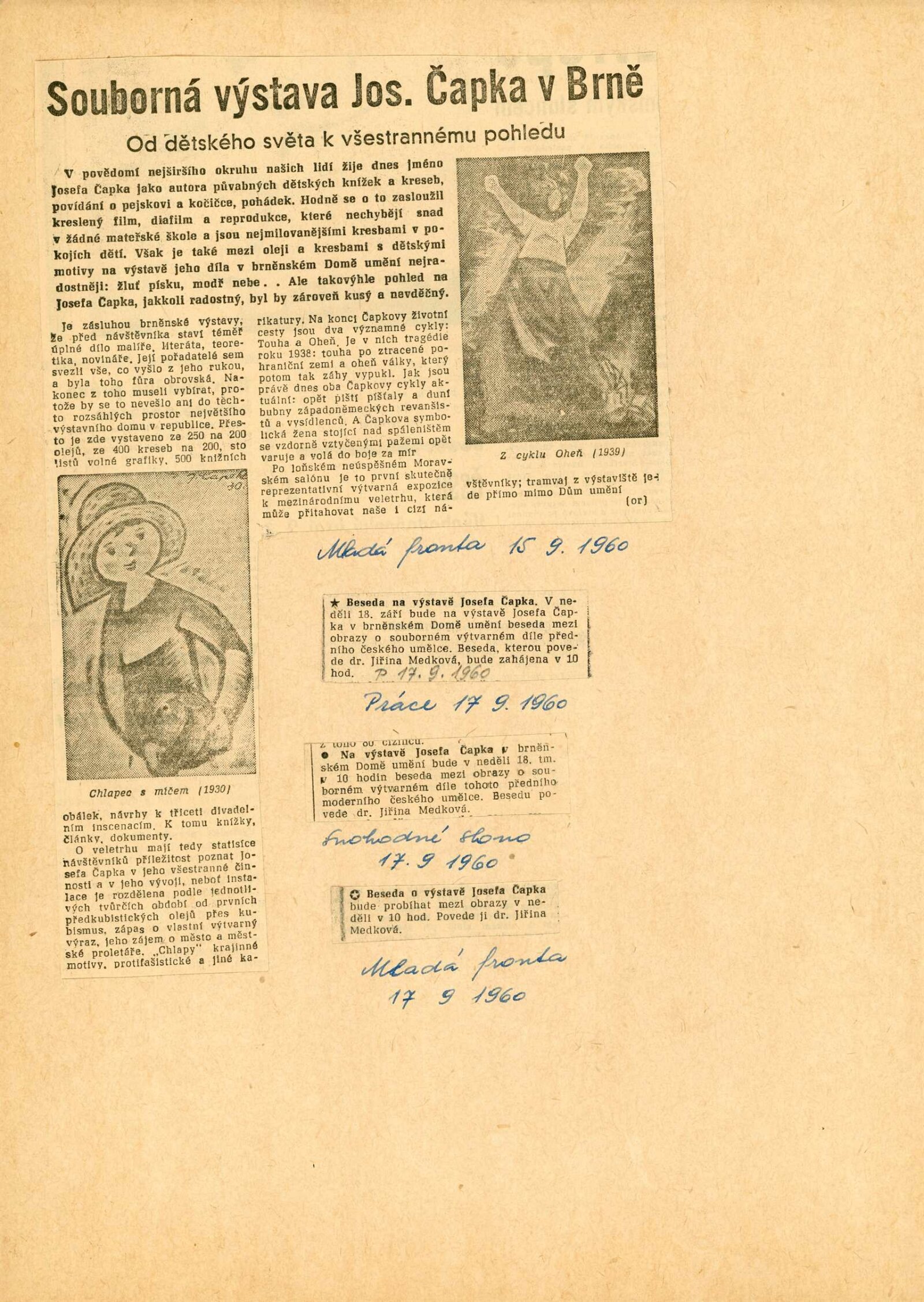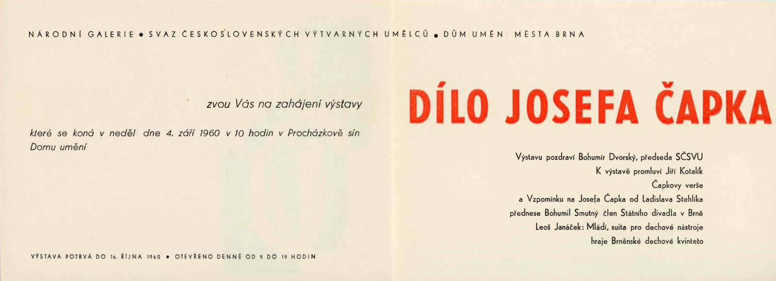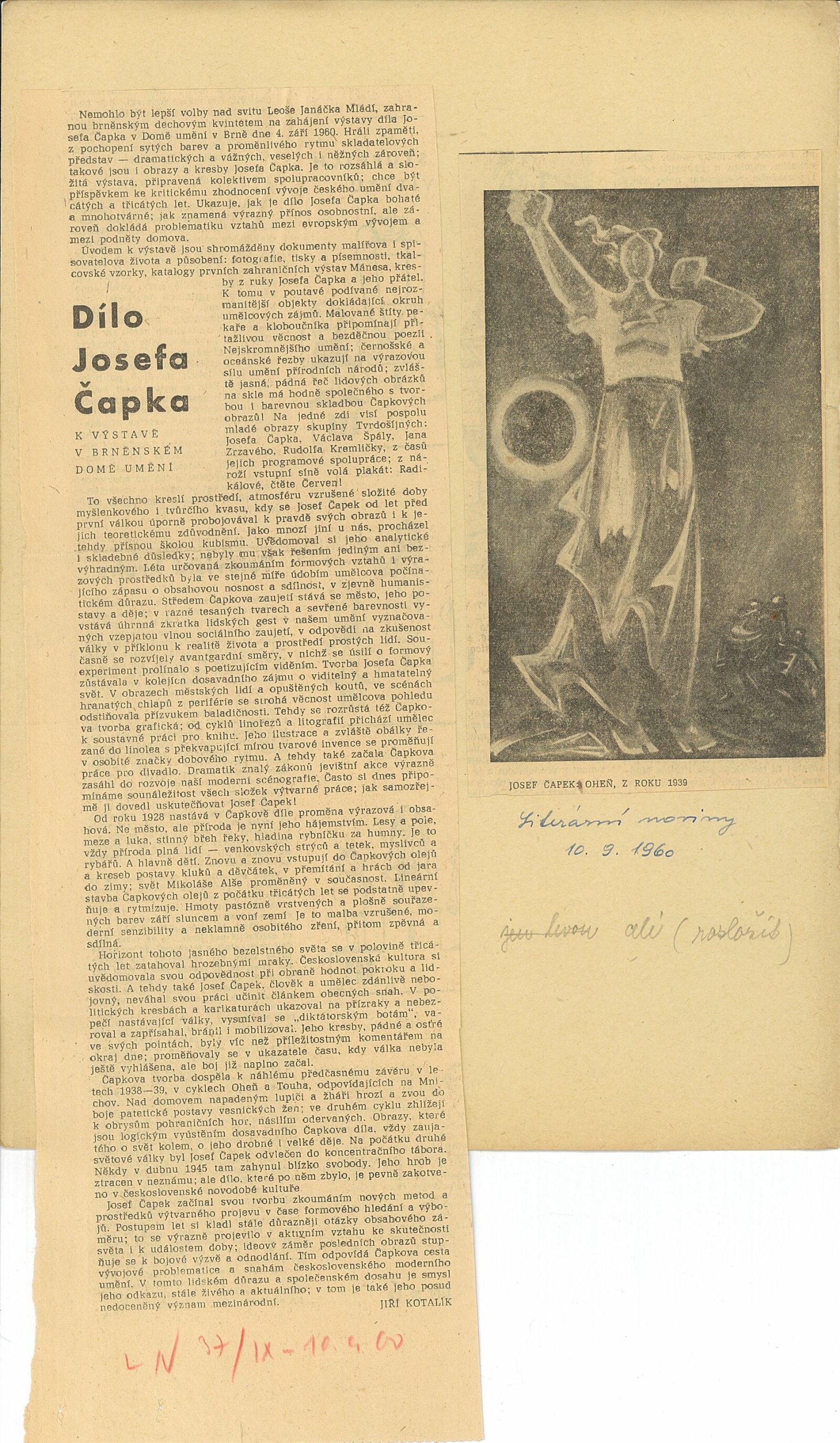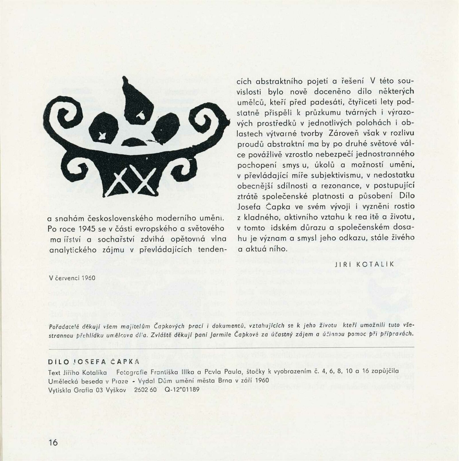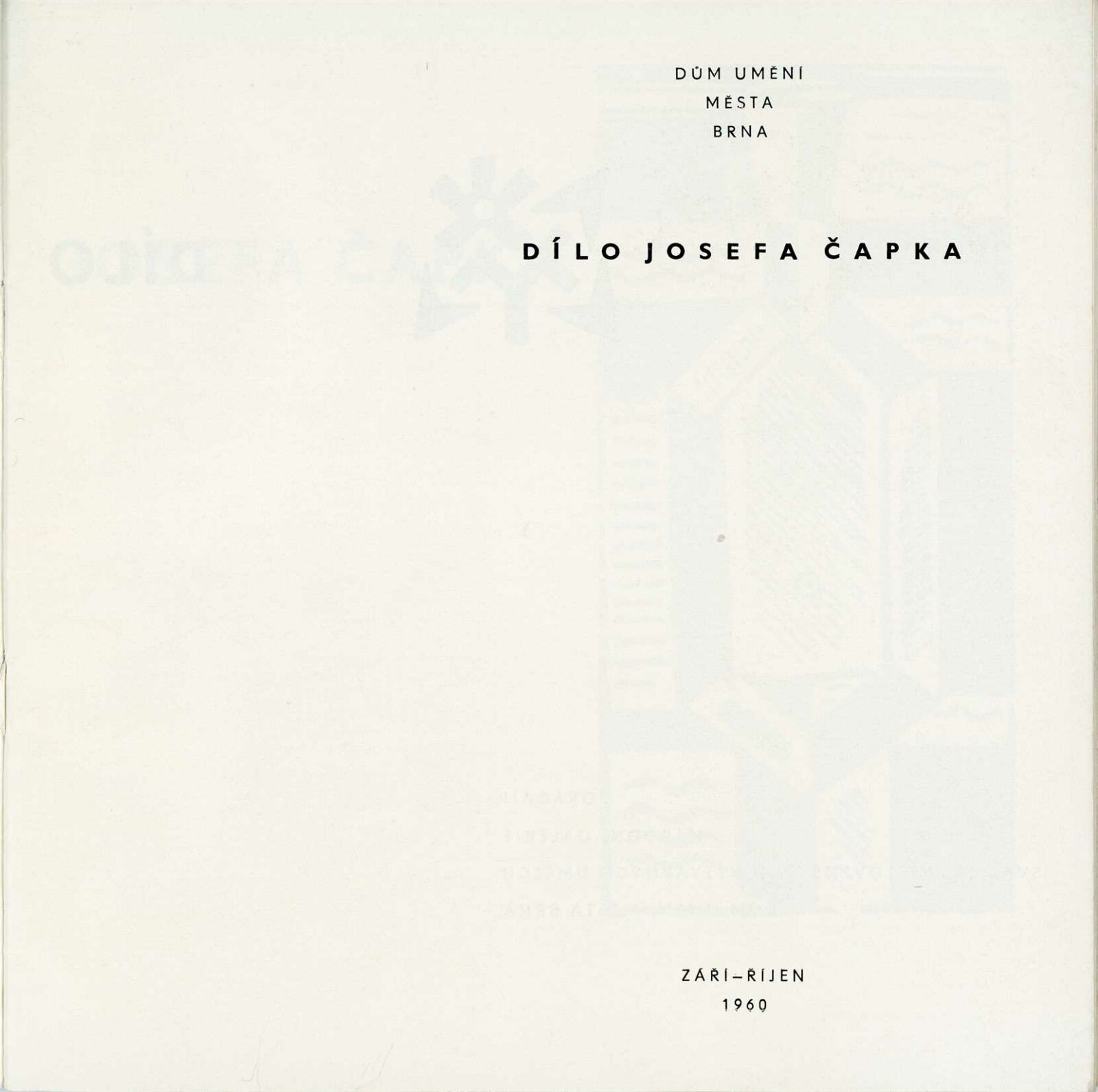 Dílo Josefa Čapka: Dům umění města Brna, 4. 9. – 16. 10. 1960 / Text: Jiří Kotalík. – Brno: DUmB, 1960. – 32 s., obr., seznam exponátů 6 s., DU 379. – MG; MMB