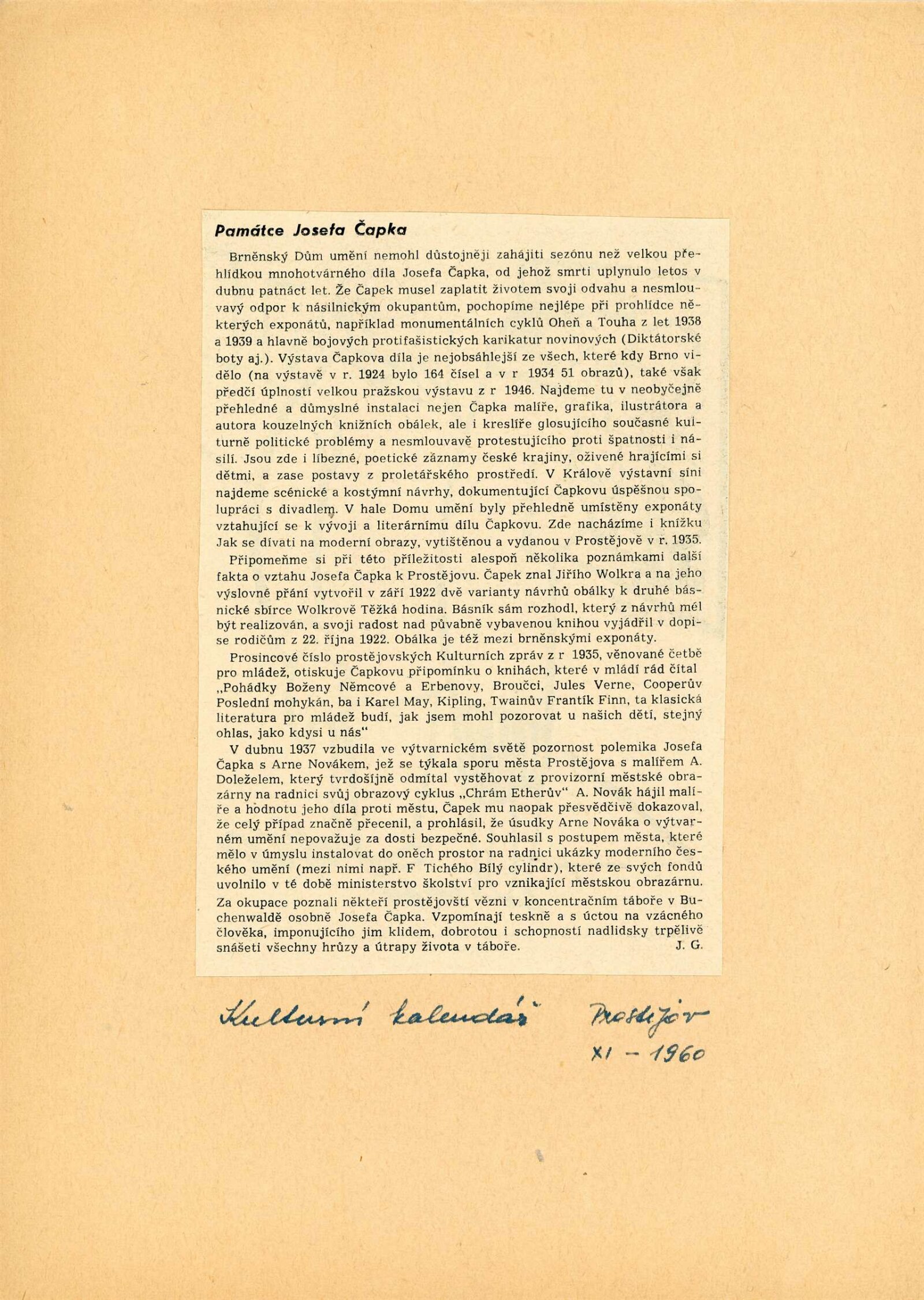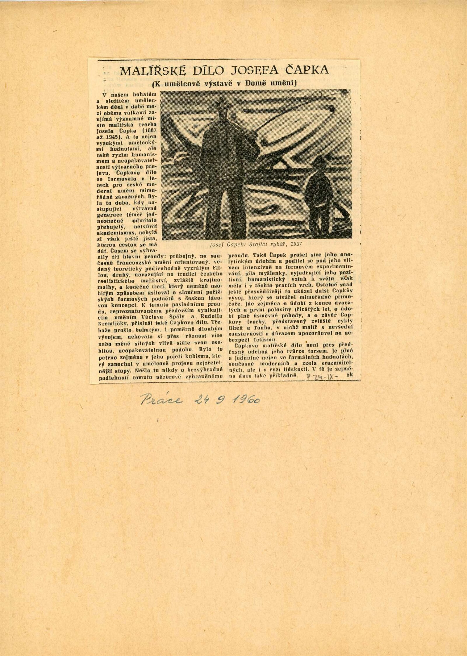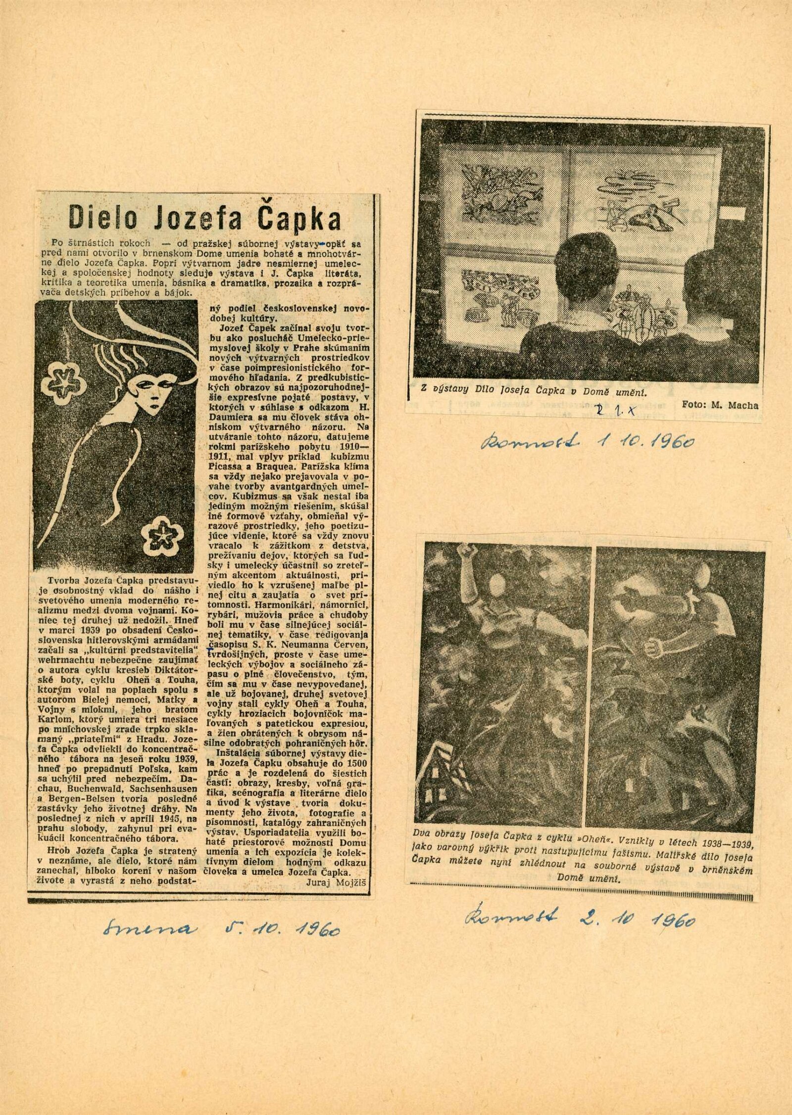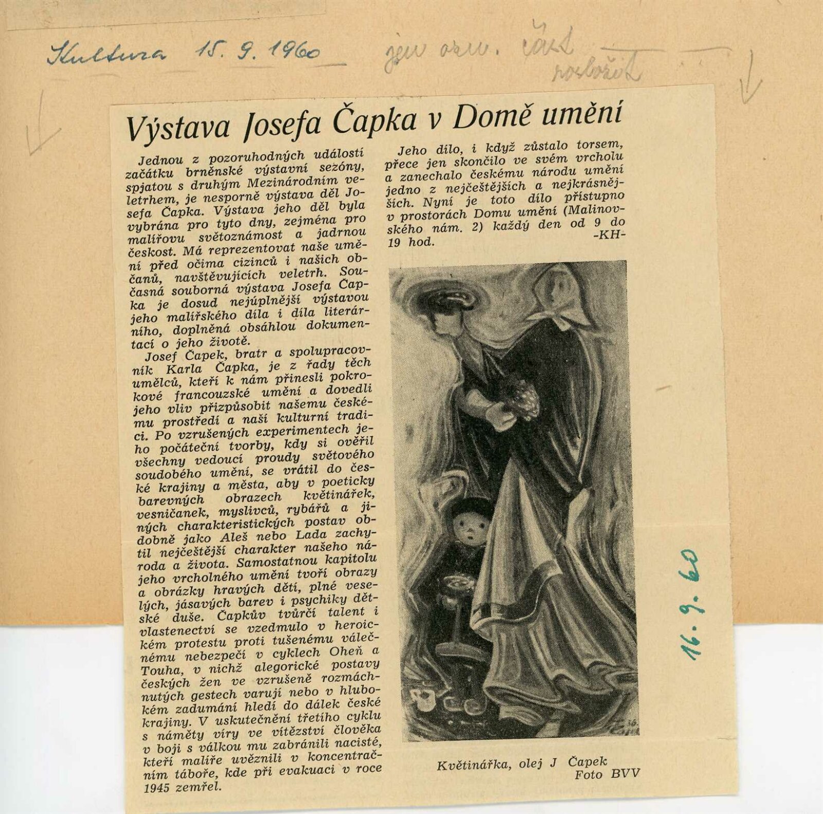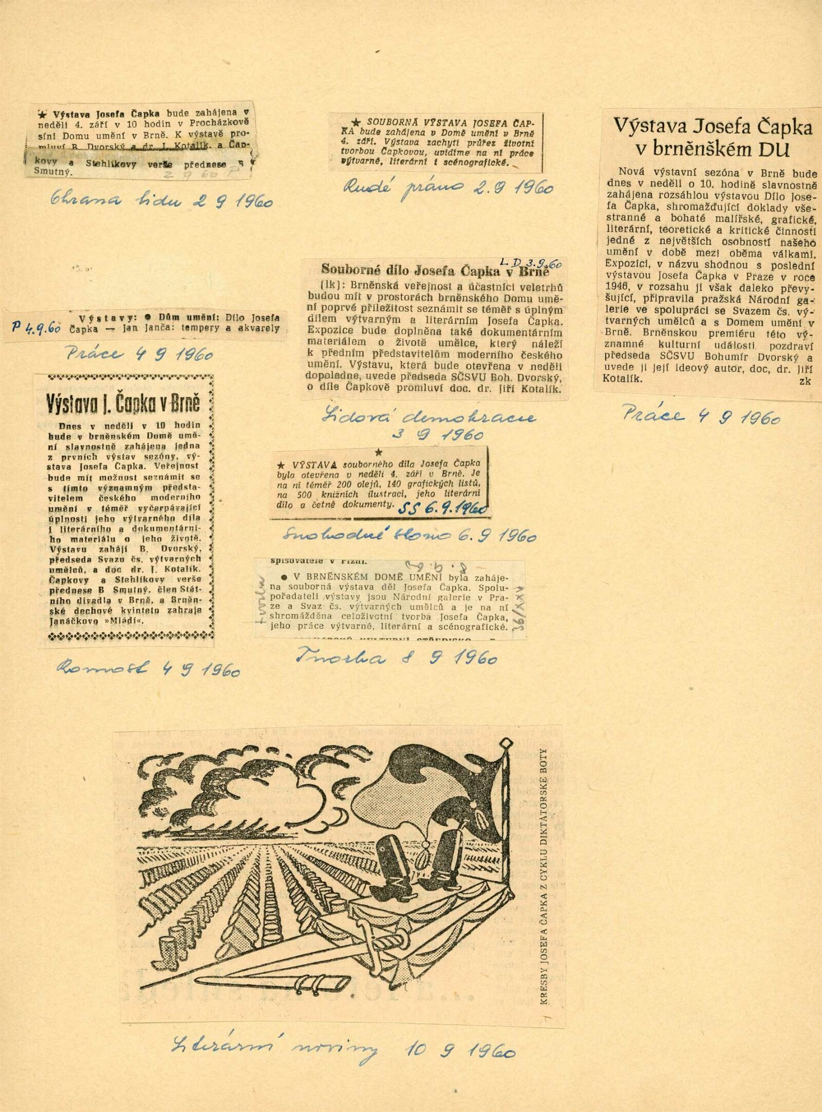 Dílo Josefa Čapka: Dům umění města Brna, 4. 9. – 16. 10. 1960 / Text: Jiří Kotalík. – Brno: DUmB, 1960. – 32 s., obr., seznam exponátů 6 s., DU 379. – MG; MMB