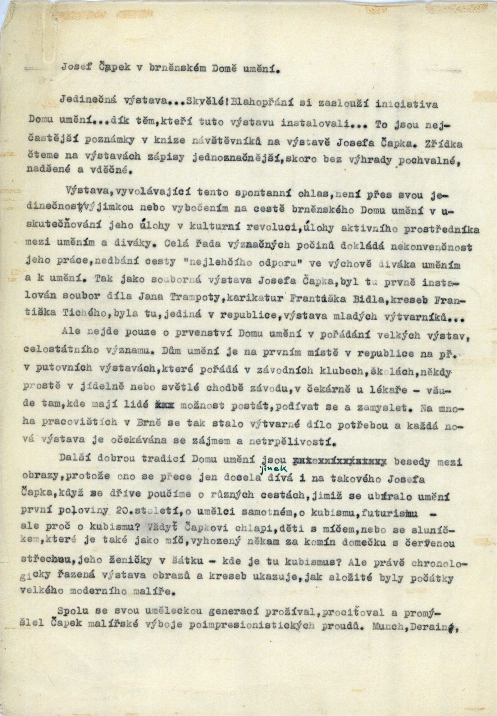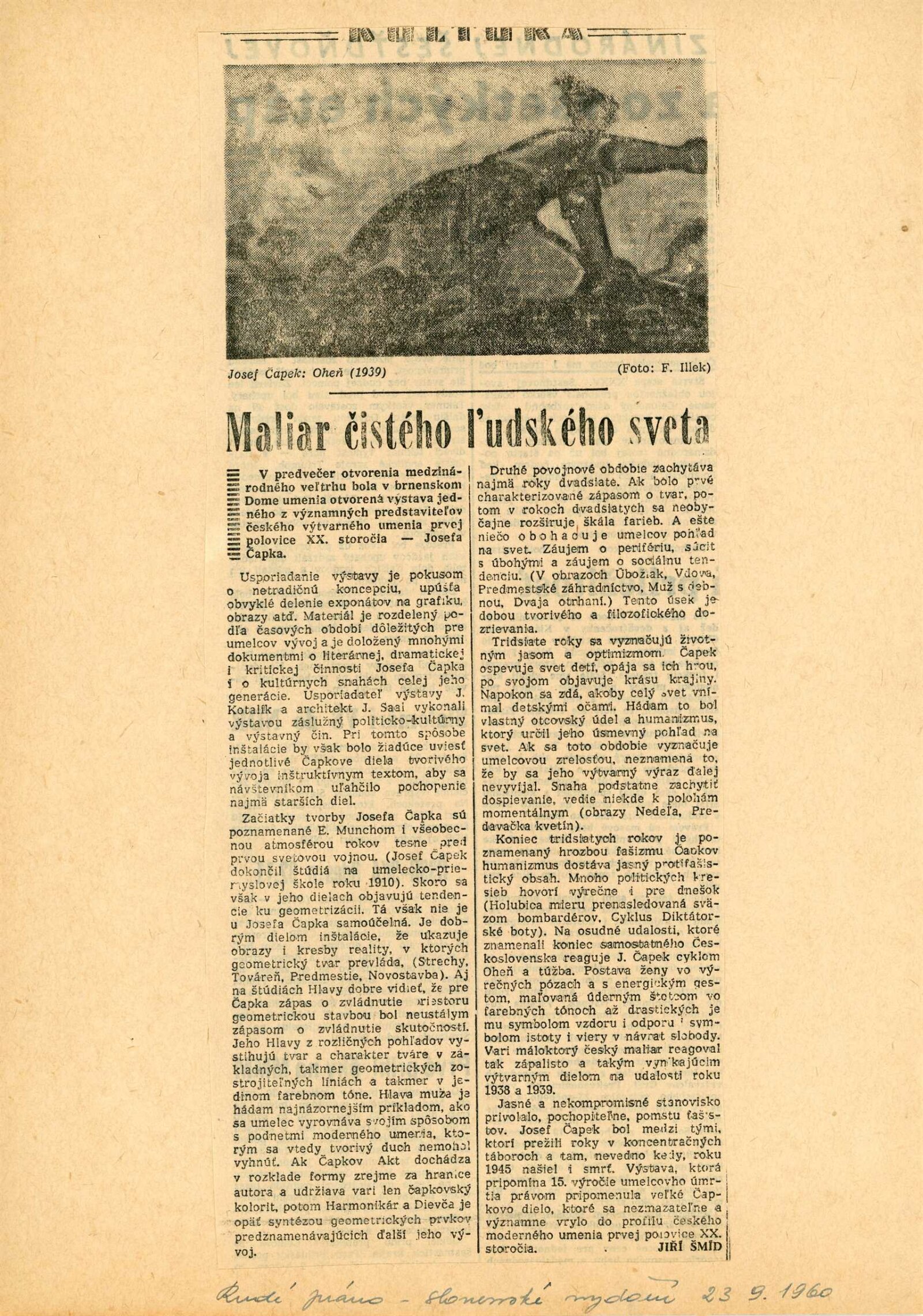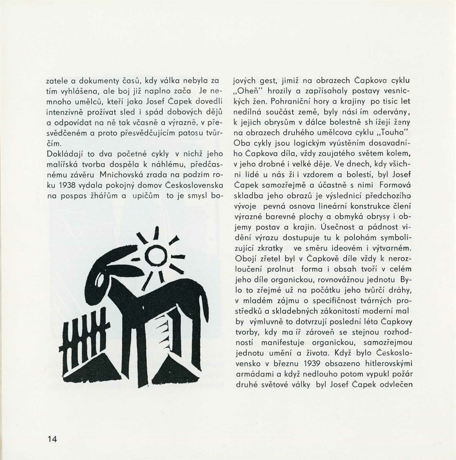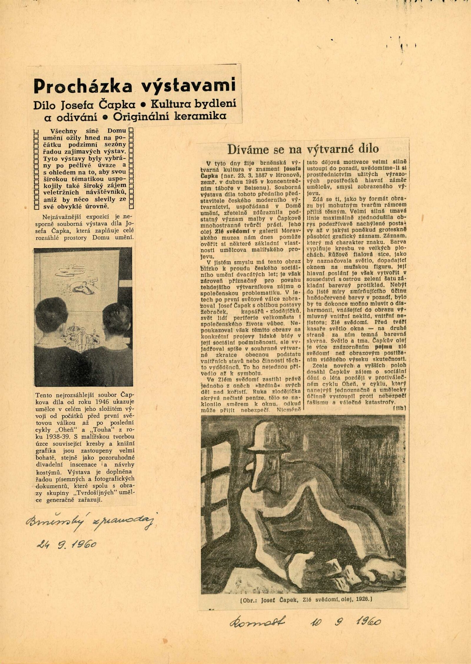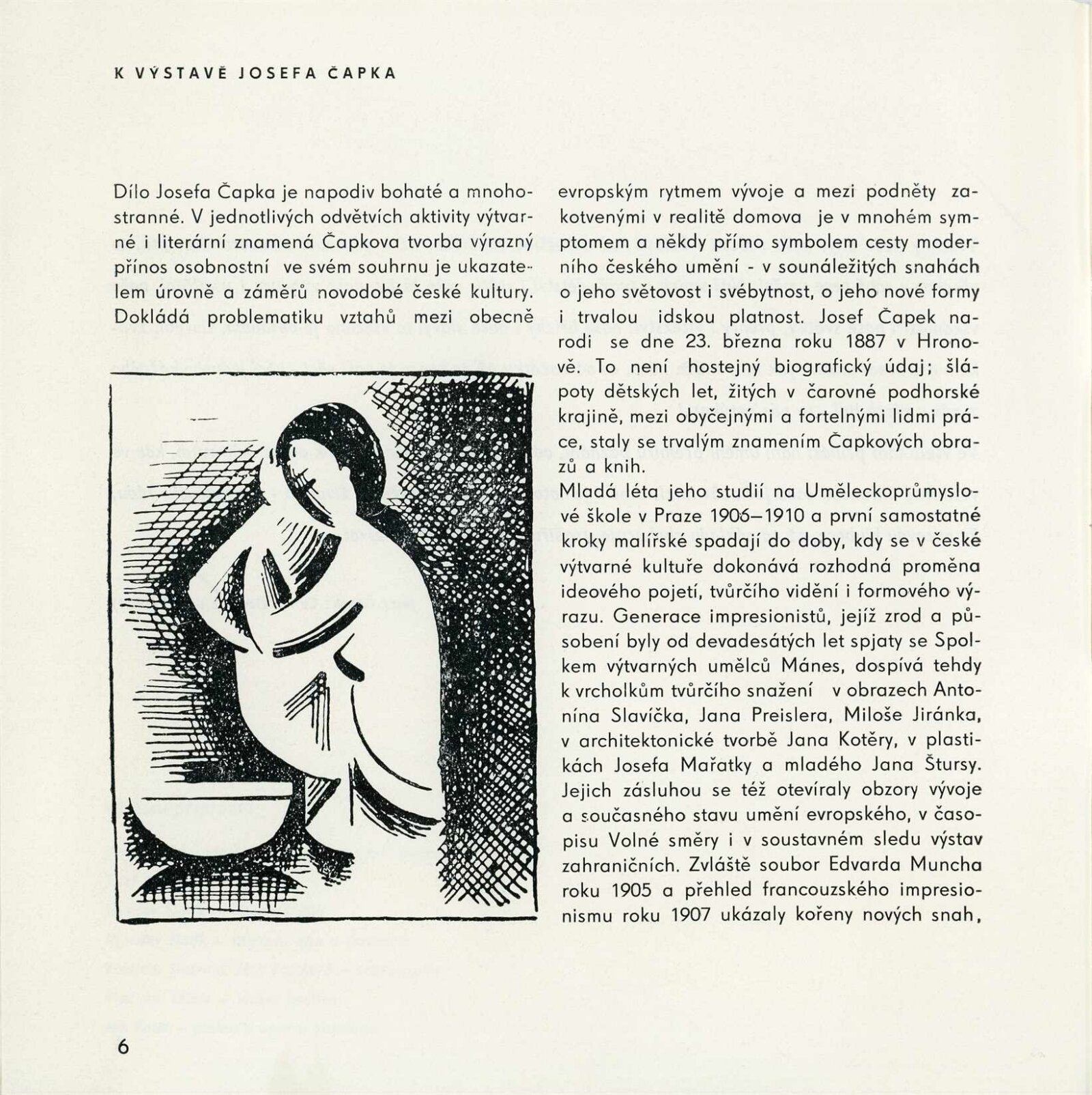 Dílo Josefa Čapka: Dům umění města Brna, 4. 9. – 16. 10. 1960 / Text: Jiří Kotalík. – Brno: DUmB, 1960. – 32 s., obr., seznam exponátů 6 s., DU 379. – MG; MMB