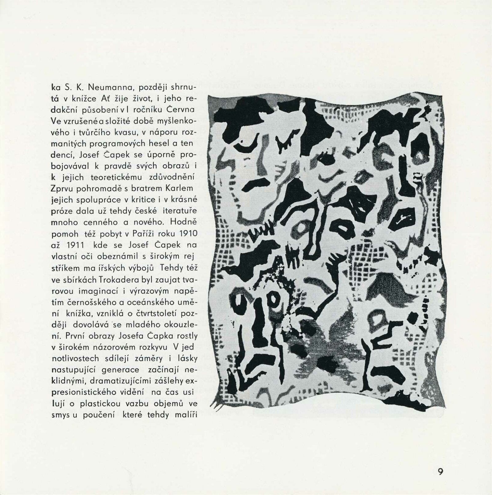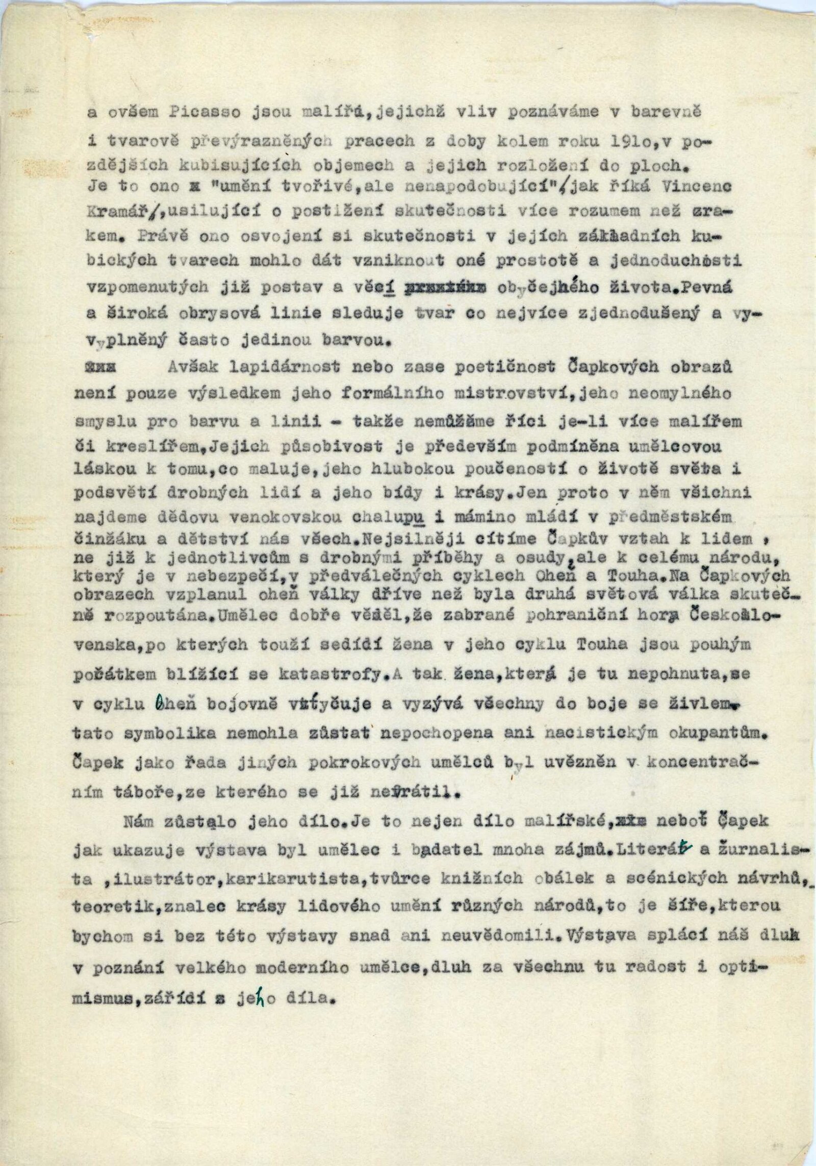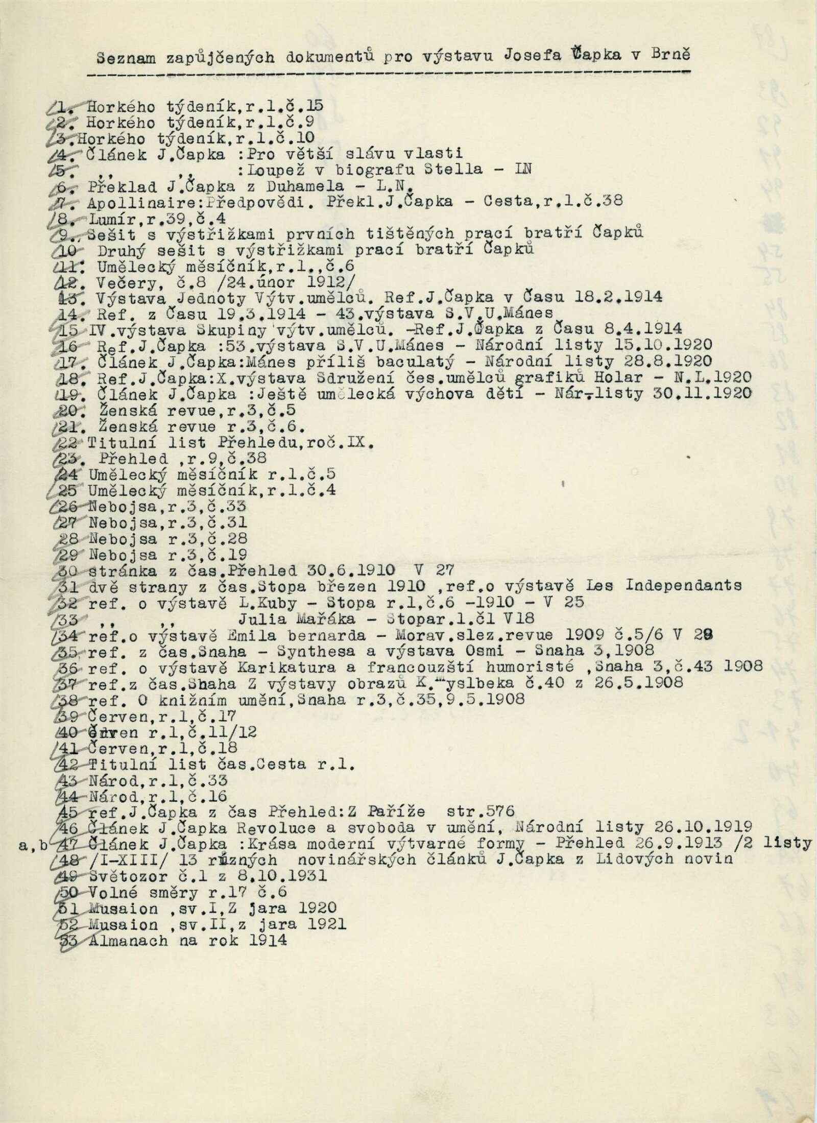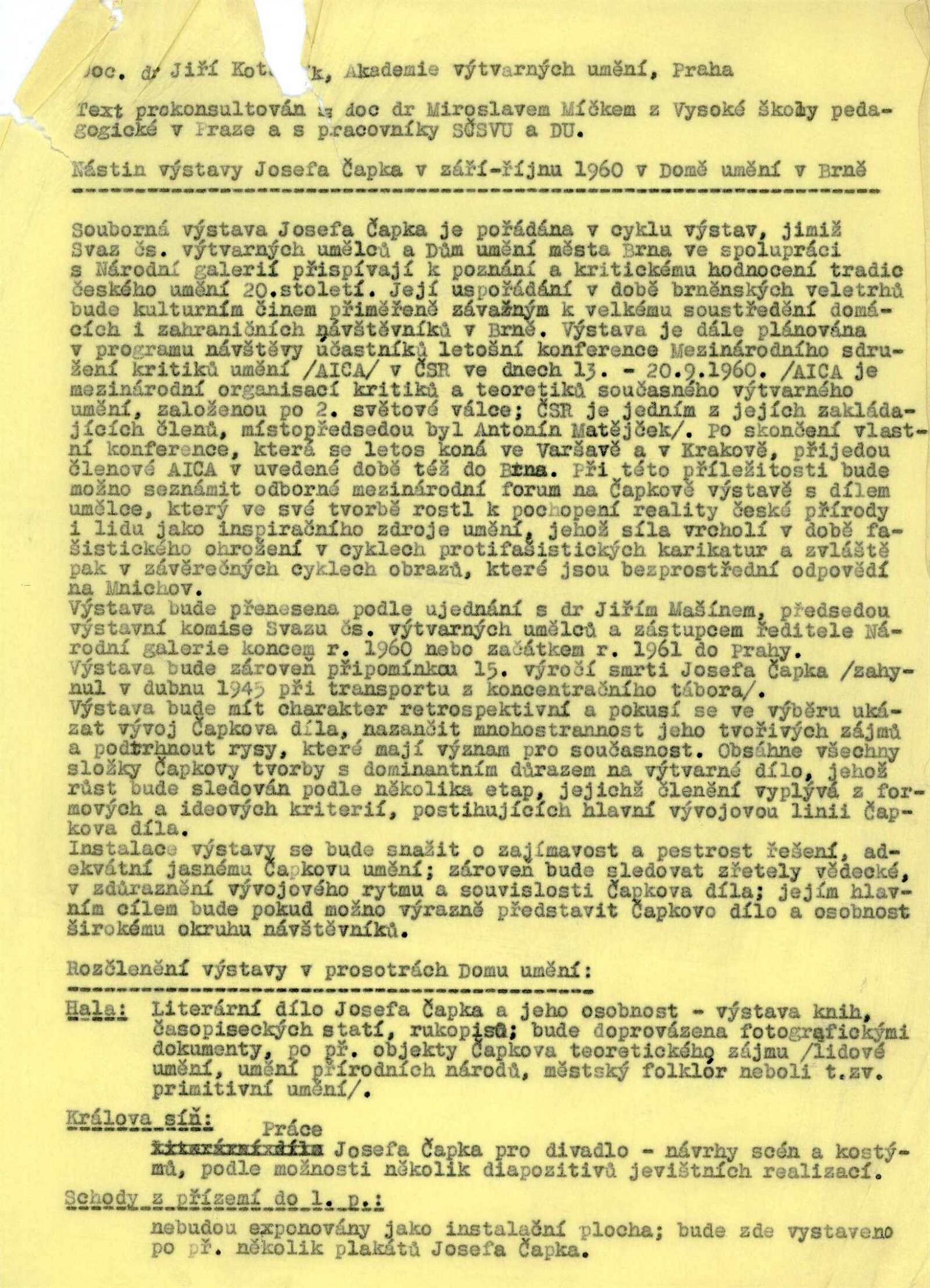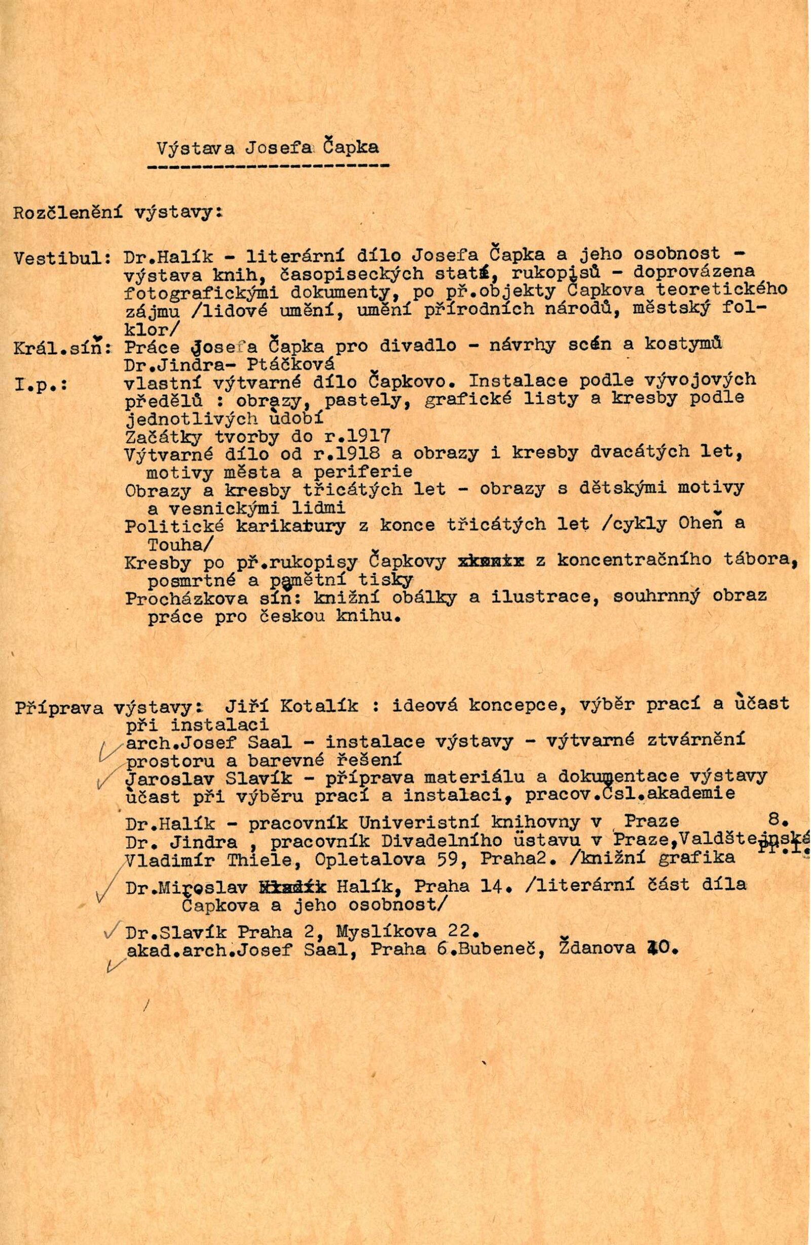 pozvánka, katalog, text přivítání na vernisáži (Gerta Pospíšilová), texty k výstavě (básně Josefa Čapka, L. Stehlíka, texty ČJ, AJ, FJ, RJ), popisky, seznam exponátů, fotografie děl pro katalog, foto Jiřího Kotalíka z vernisáže, seznam zápůjček (dokumenty, knihy, předměty, seznam knih Čapkem graficky upravovaných), korespondence (o rozpočtu s SČSVU a o financování výstavy, provozní korespondence, dopisy Dr. Slavíka, M. Míčka), seznam adres pro pozvánky, zápisy z přípravných schůzí a jednání s Jiřím Kotalíkem, koncepce výstavy a její členění, rozpočet, přihlášky pro výstavu, potvrzení o převzetí děl, reverzy, pojištění výstavy, zápisy z jednání a nástin výstavy (Jiří Kotalík), smlouvy o dílo (překlady, instalace atd.), rozpočet, recenze v tisku, podpisová kniha z výstavy (asi 60 stran)