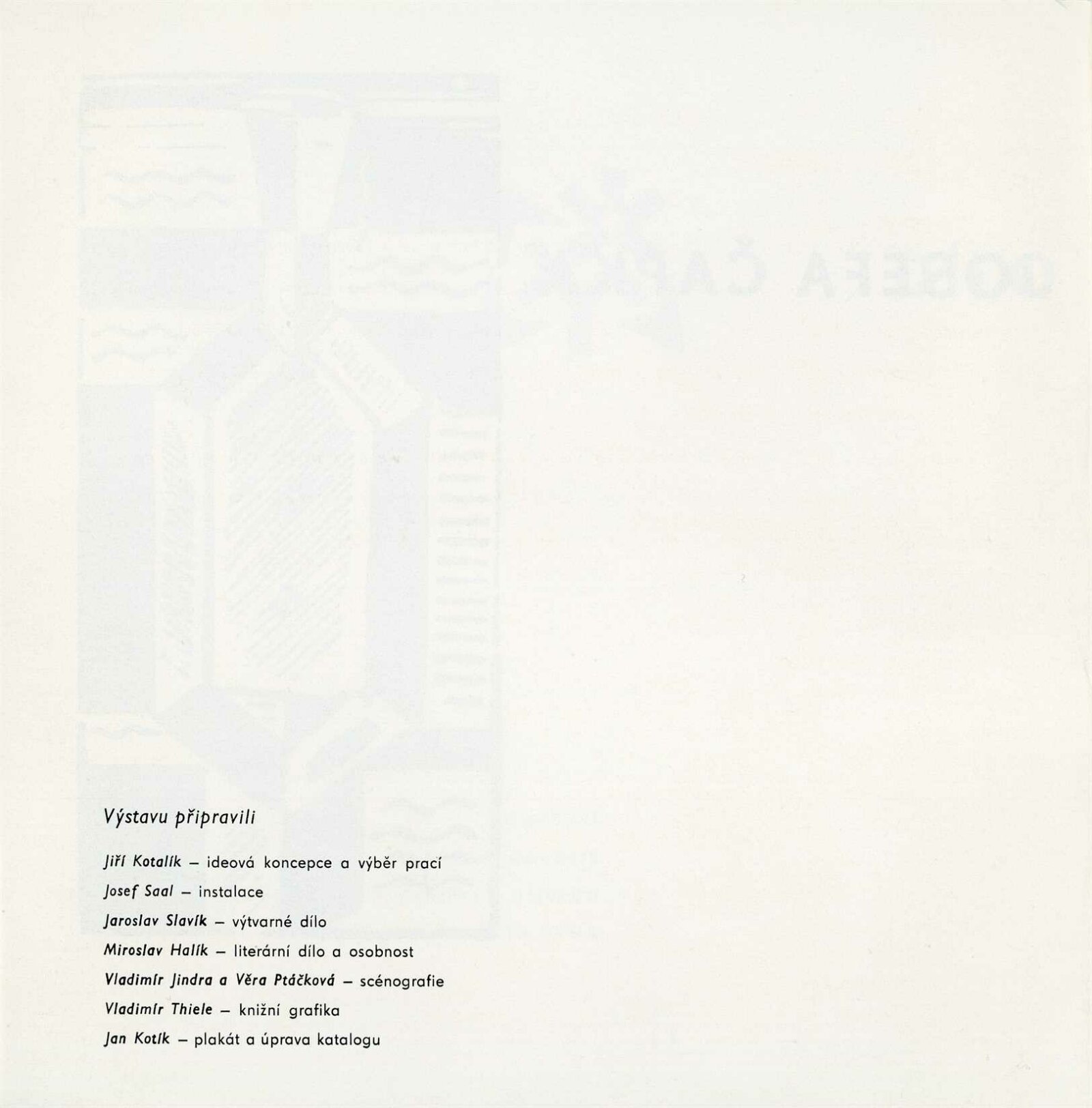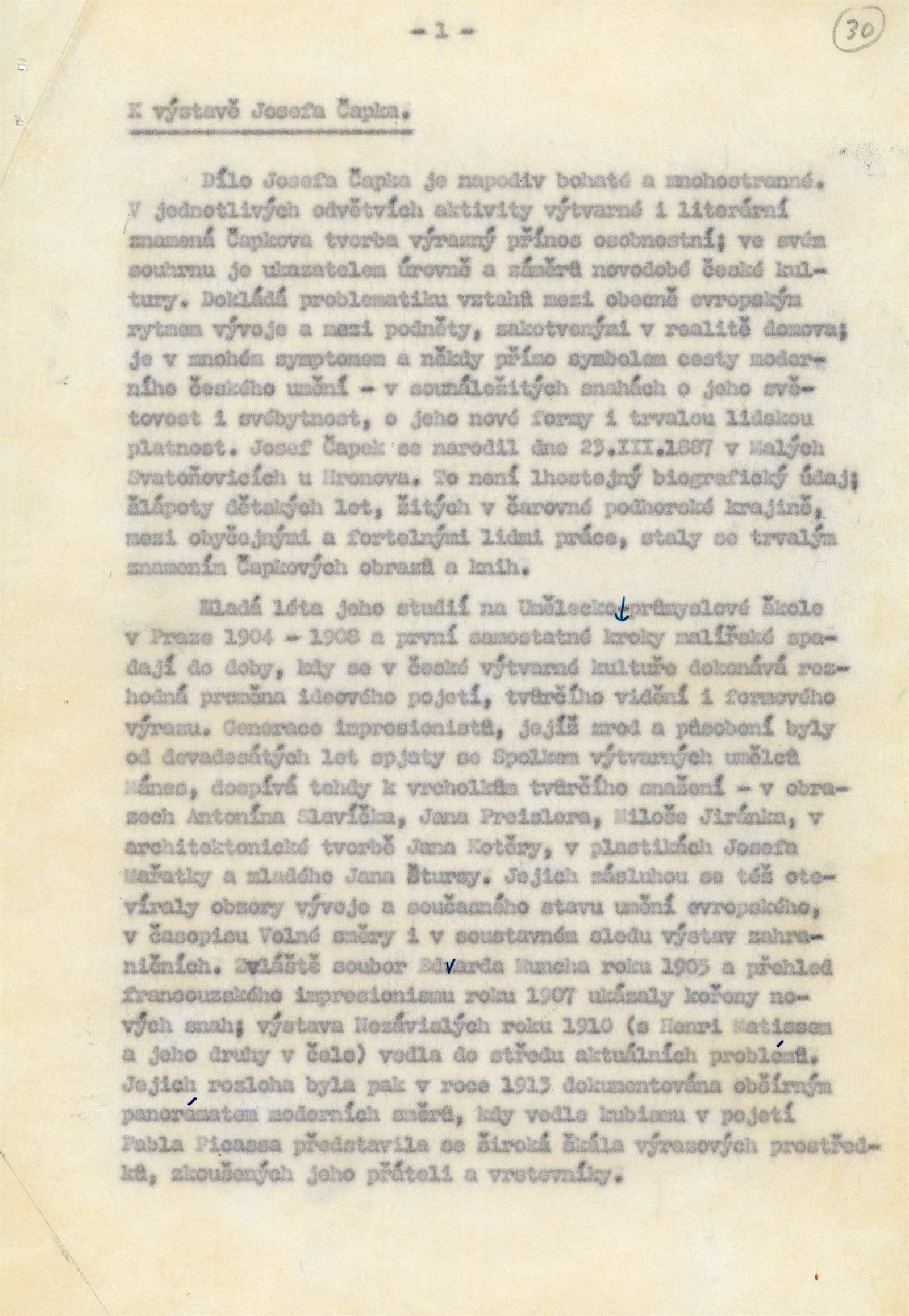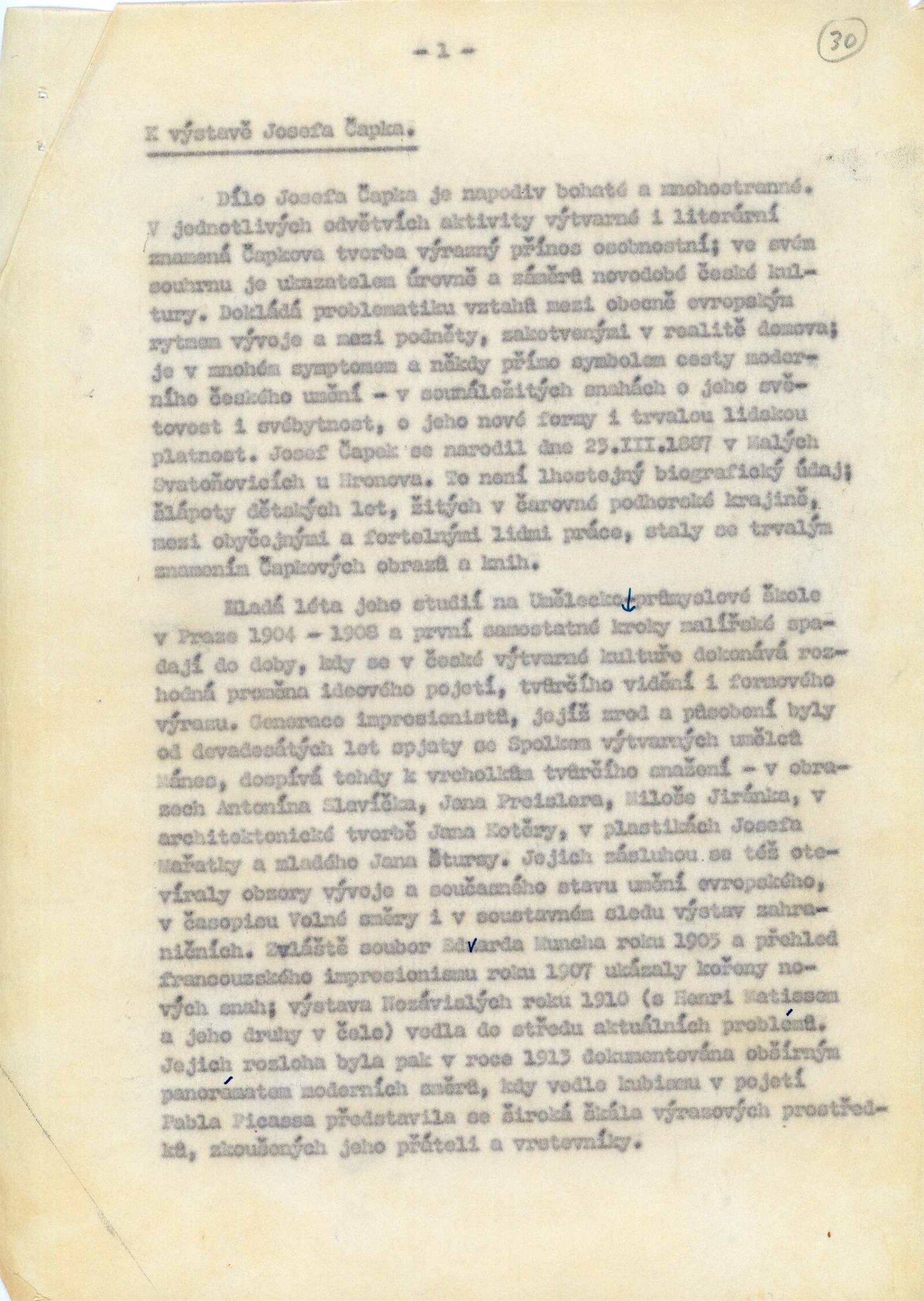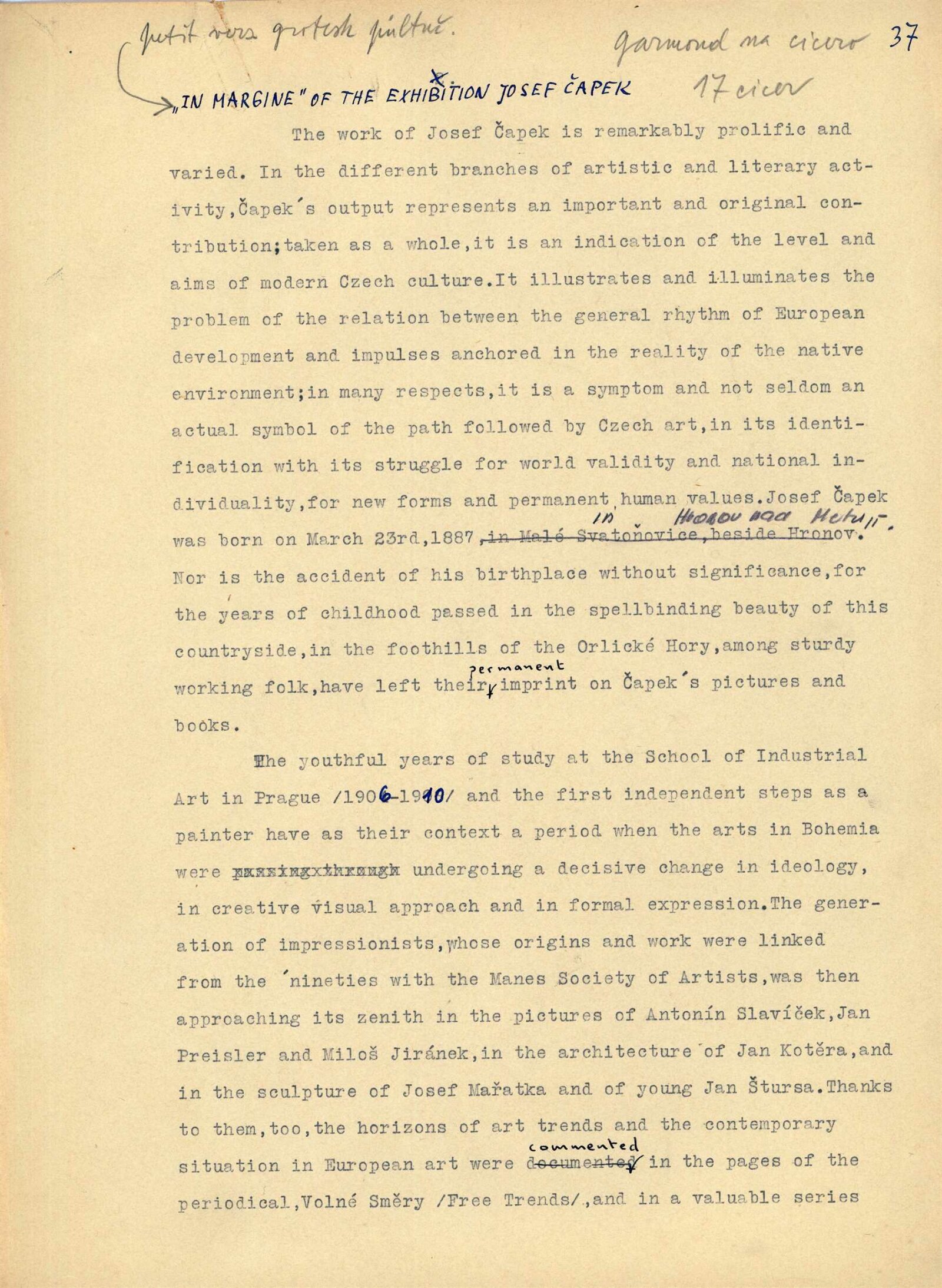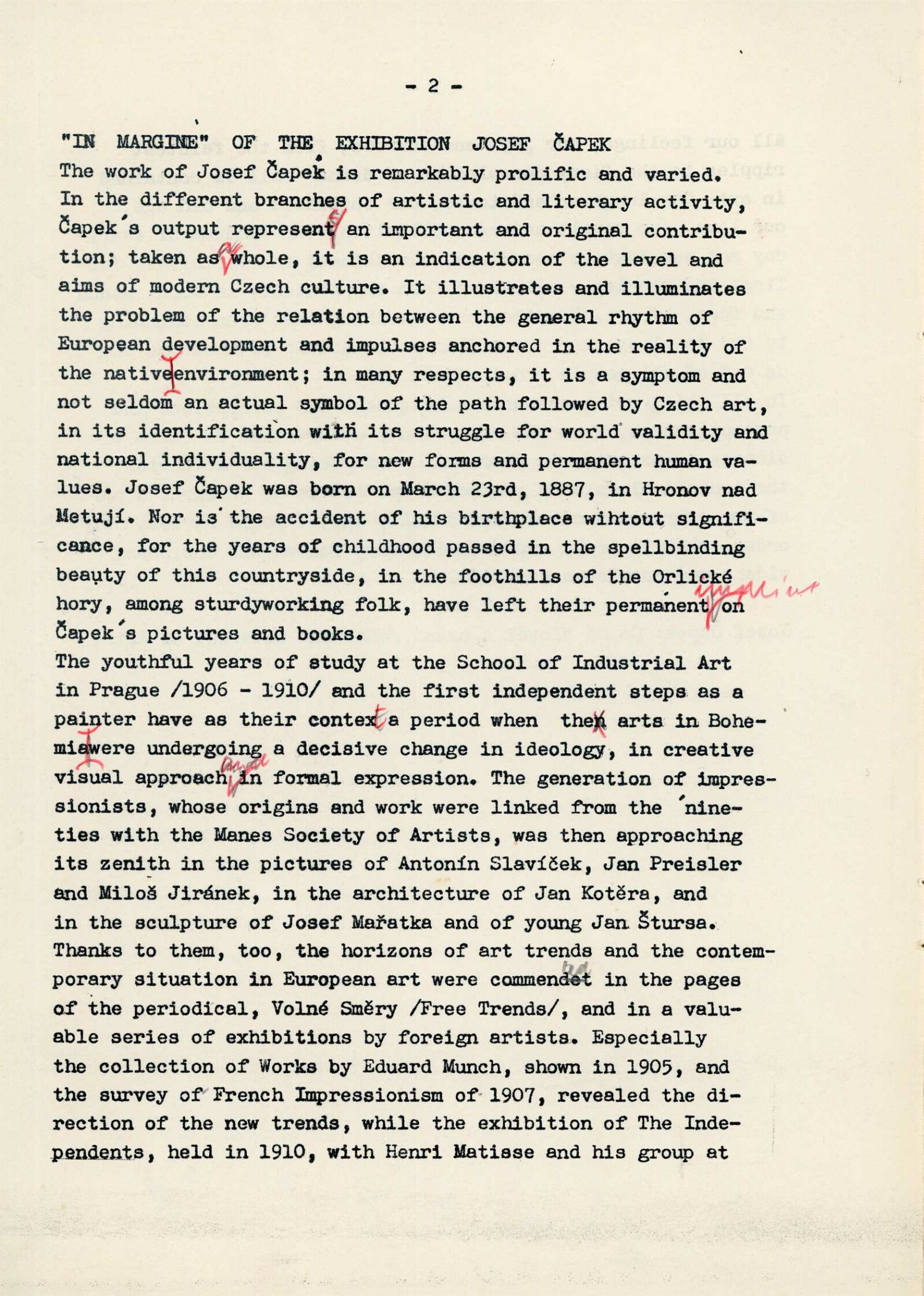 pozvánka, katalog, text přivítání na vernisáži (Gerta Pospíšilová), texty k výstavě (básně Josefa Čapka, L. Stehlíka, texty ČJ, AJ, FJ, RJ), popisky, seznam exponátů, fotografie děl pro katalog, foto Jiřího Kotalíka z vernisáže, seznam zápůjček (dokumenty, knihy, předměty, seznam knih Čapkem graficky upravovaných), korespondence (o rozpočtu s SČSVU a o financování výstavy, provozní korespondence, dopisy Dr. Slavíka, M. Míčka), seznam adres pro pozvánky, zápisy z přípravných schůzí a jednání s Jiřím Kotalíkem, koncepce výstavy a její členění, rozpočet, přihlášky pro výstavu, potvrzení o převzetí děl, reverzy, pojištění výstavy, zápisy z jednání a nástin výstavy (Jiří Kotalík), smlouvy o dílo (překlady, instalace atd.), rozpočet, recenze v tisku, podpisová kniha z výstavy (asi 60 stran)