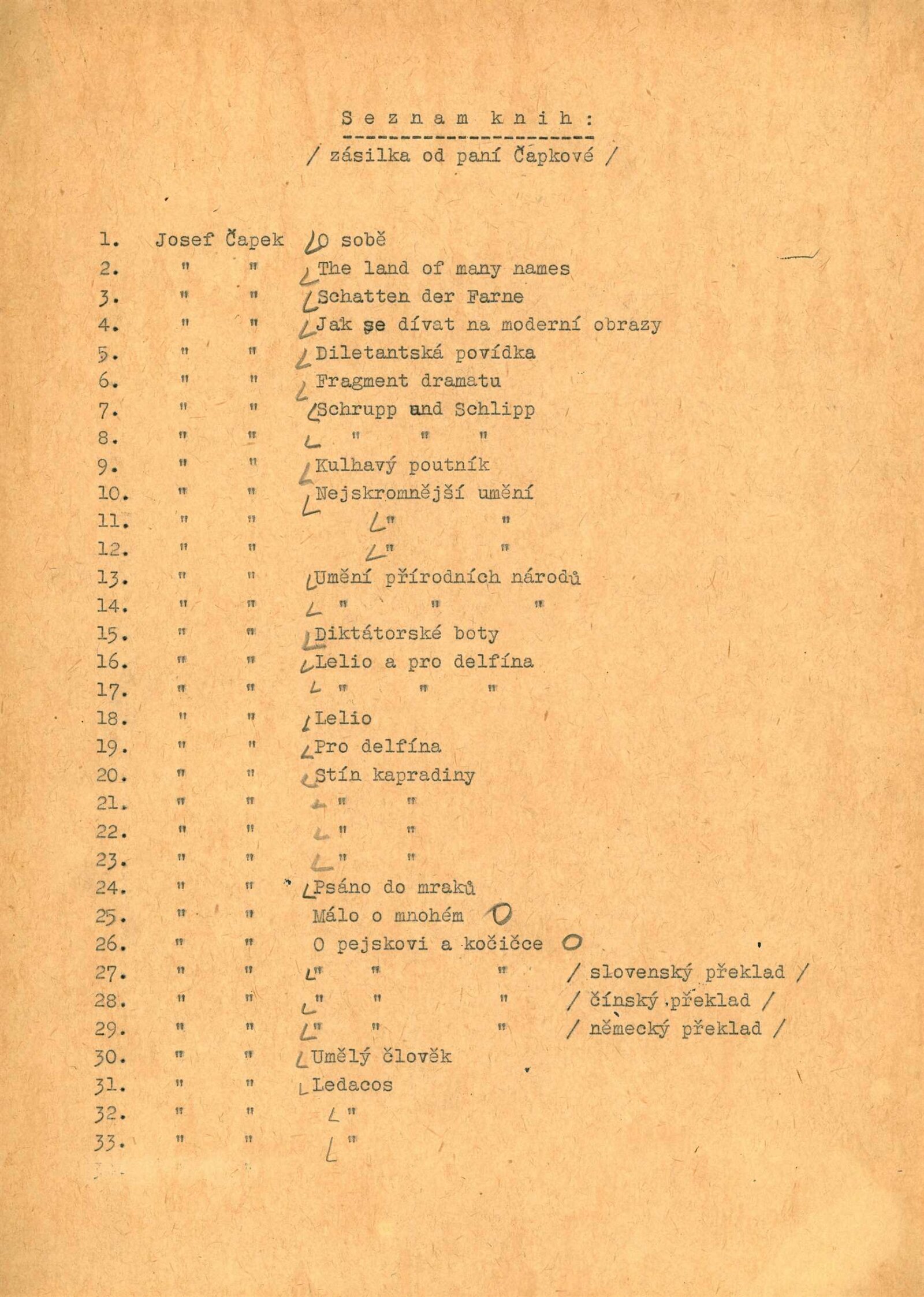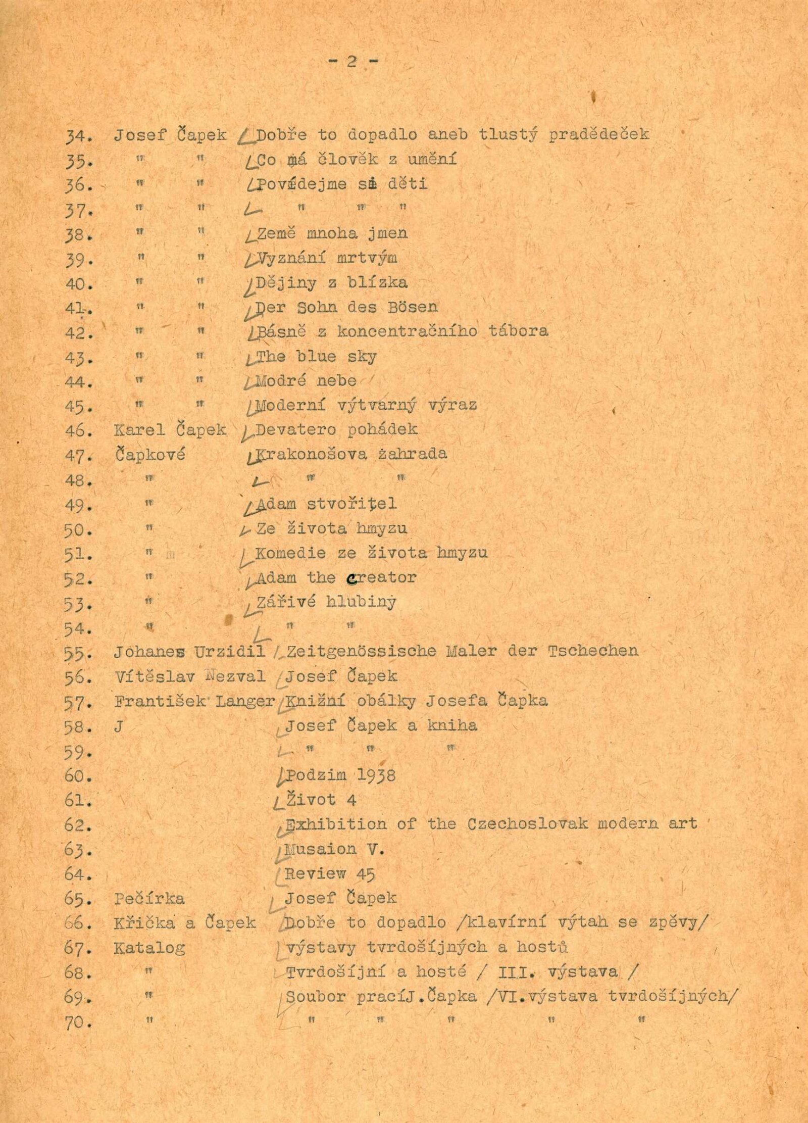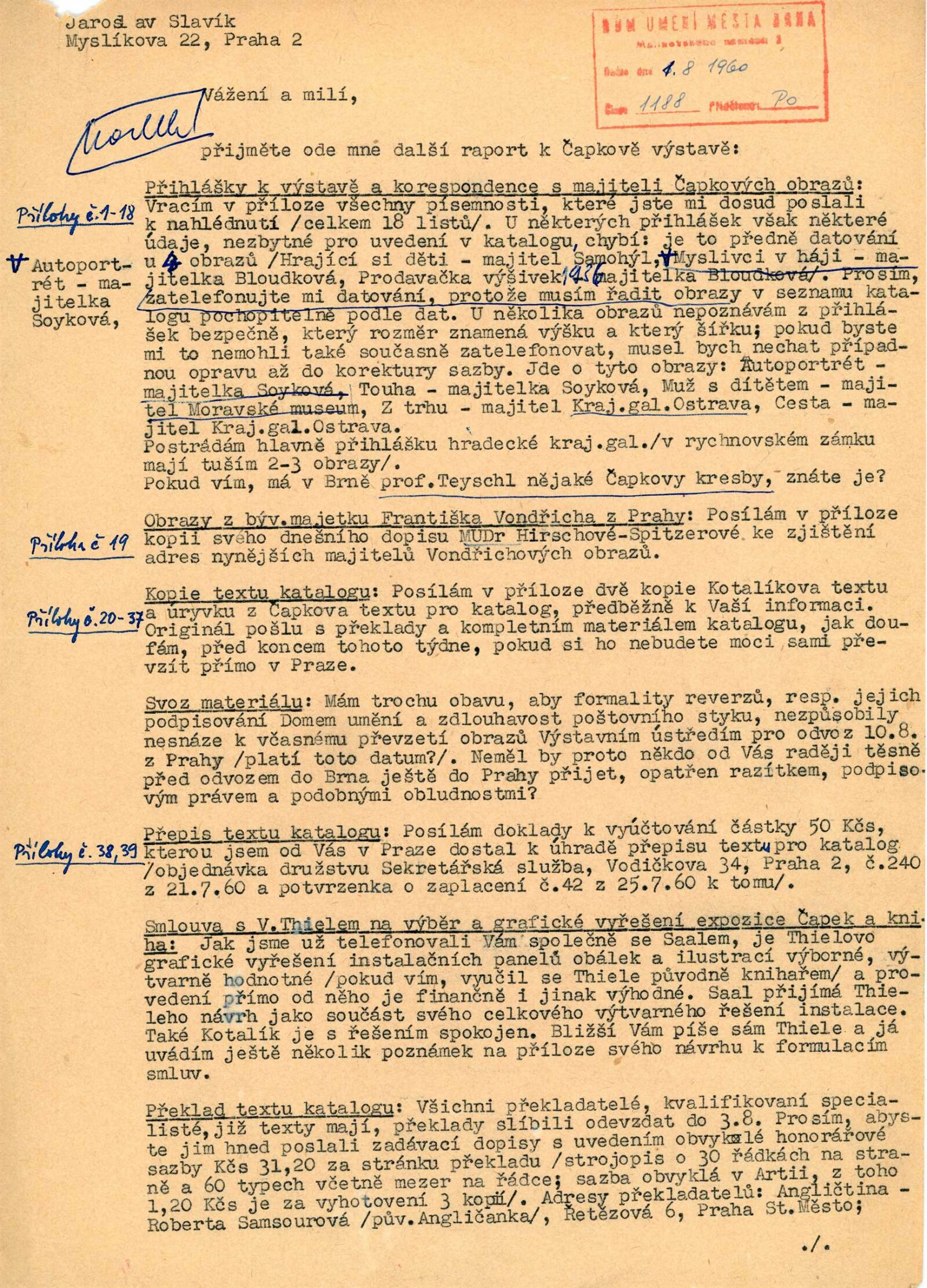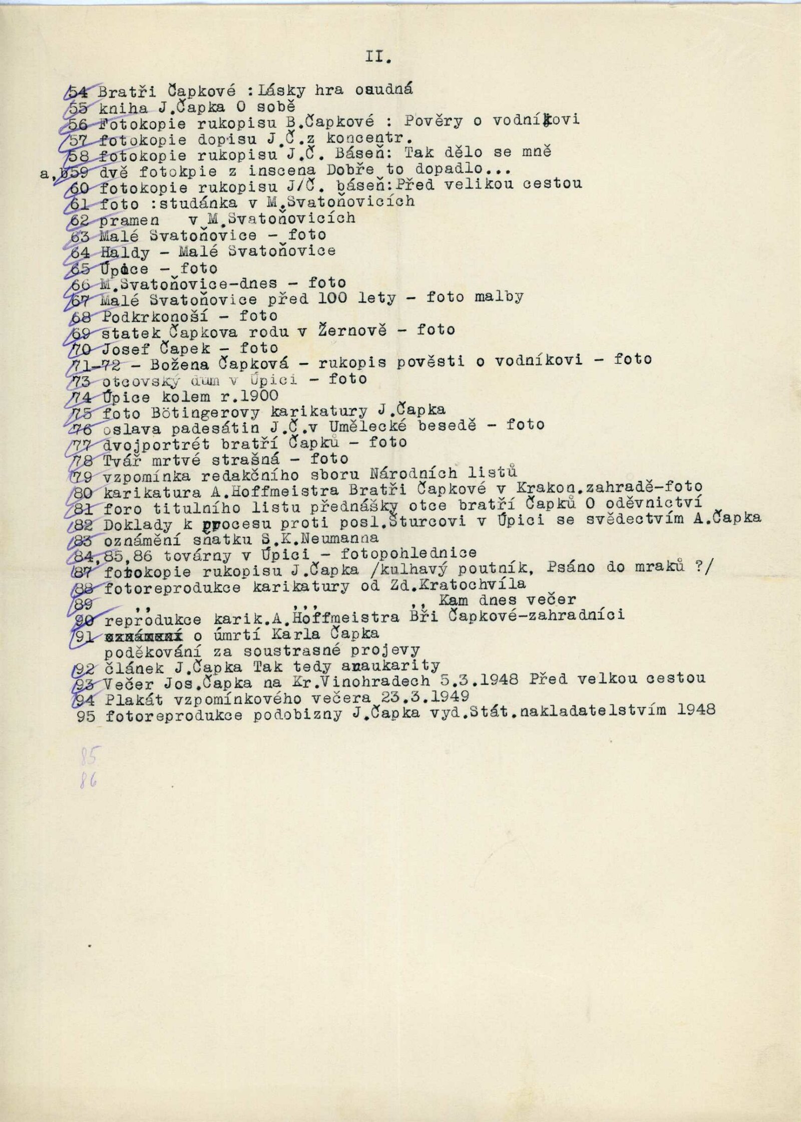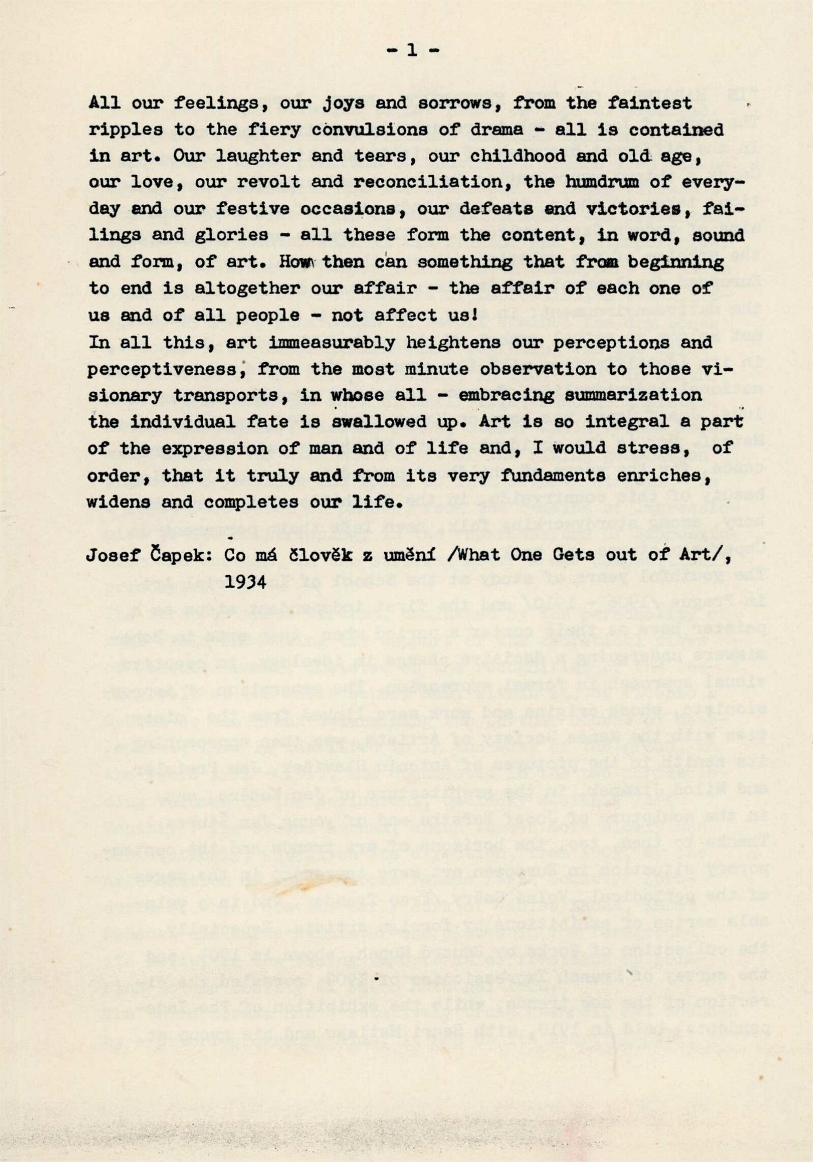 pozvánka, katalog, text přivítání na vernisáži (Gerta Pospíšilová), texty k výstavě (básně Josefa Čapka, L. Stehlíka, texty ČJ, AJ, FJ, RJ), popisky, seznam exponátů, fotografie děl pro katalog, foto Jiřího Kotalíka z vernisáže, seznam zápůjček (dokumenty, knihy, předměty, seznam knih Čapkem graficky upravovaných), korespondence (o rozpočtu s SČSVU a o financování výstavy, provozní korespondence, dopisy Dr. Slavíka, M. Míčka), seznam adres pro pozvánky, zápisy z přípravných schůzí a jednání s Jiřím Kotalíkem, koncepce výstavy a její členění, rozpočet, přihlášky pro výstavu, potvrzení o převzetí děl, reverzy, pojištění výstavy, zápisy z jednání a nástin výstavy (Jiří Kotalík), smlouvy o dílo (překlady, instalace atd.), rozpočet, recenze v tisku, podpisová kniha z výstavy (asi 60 stran)