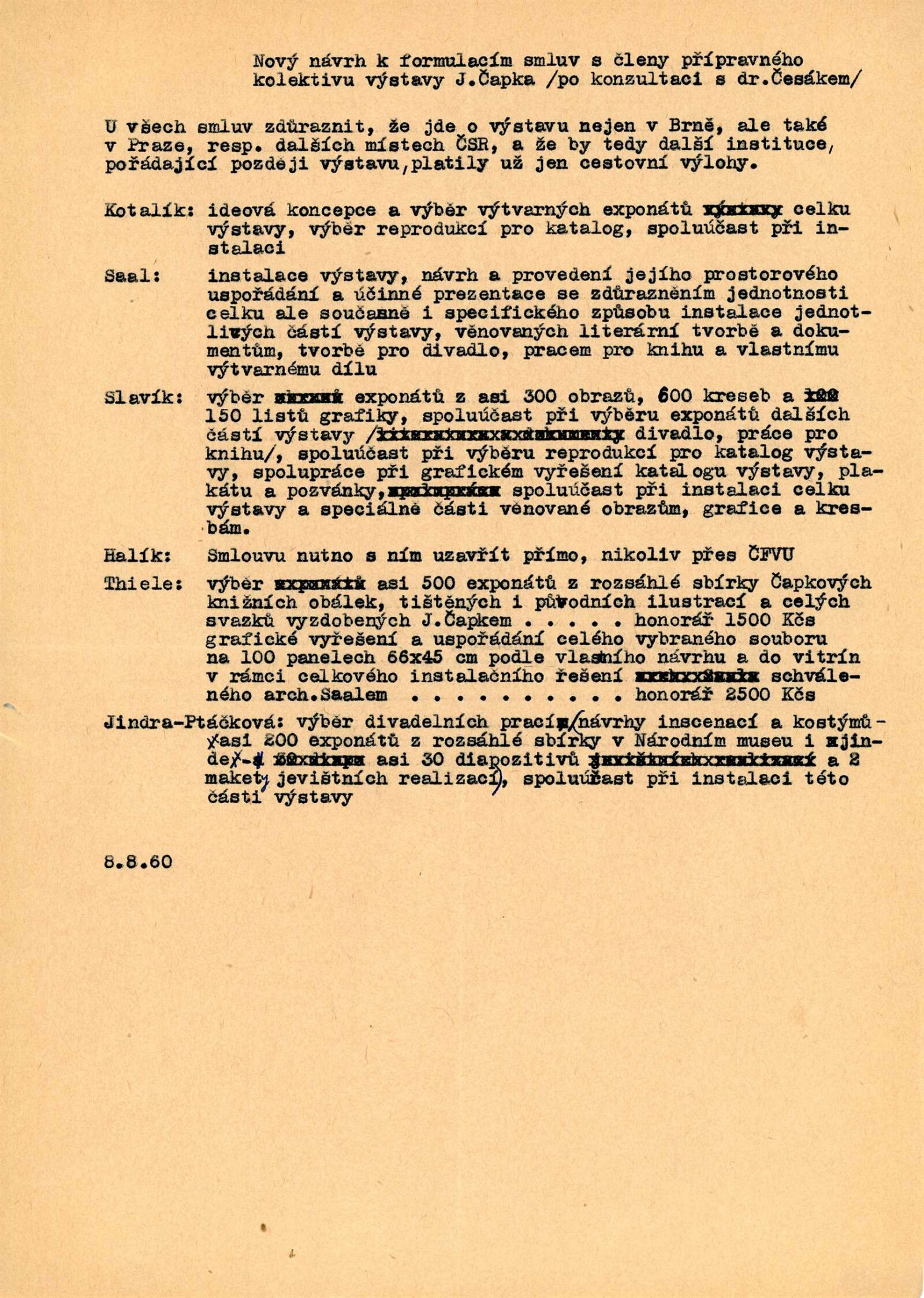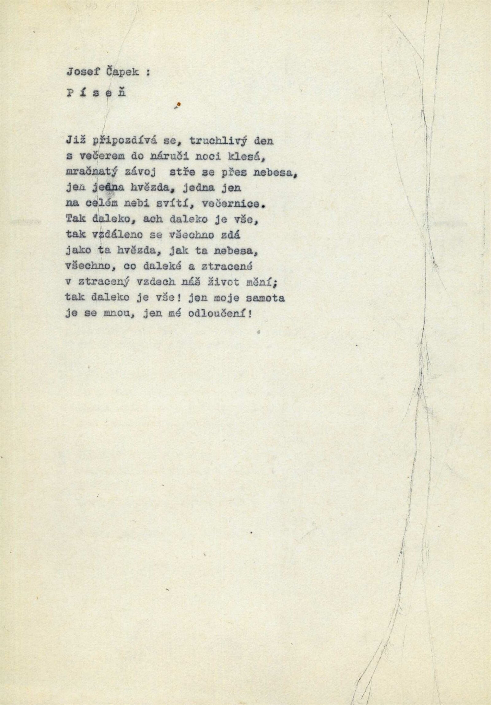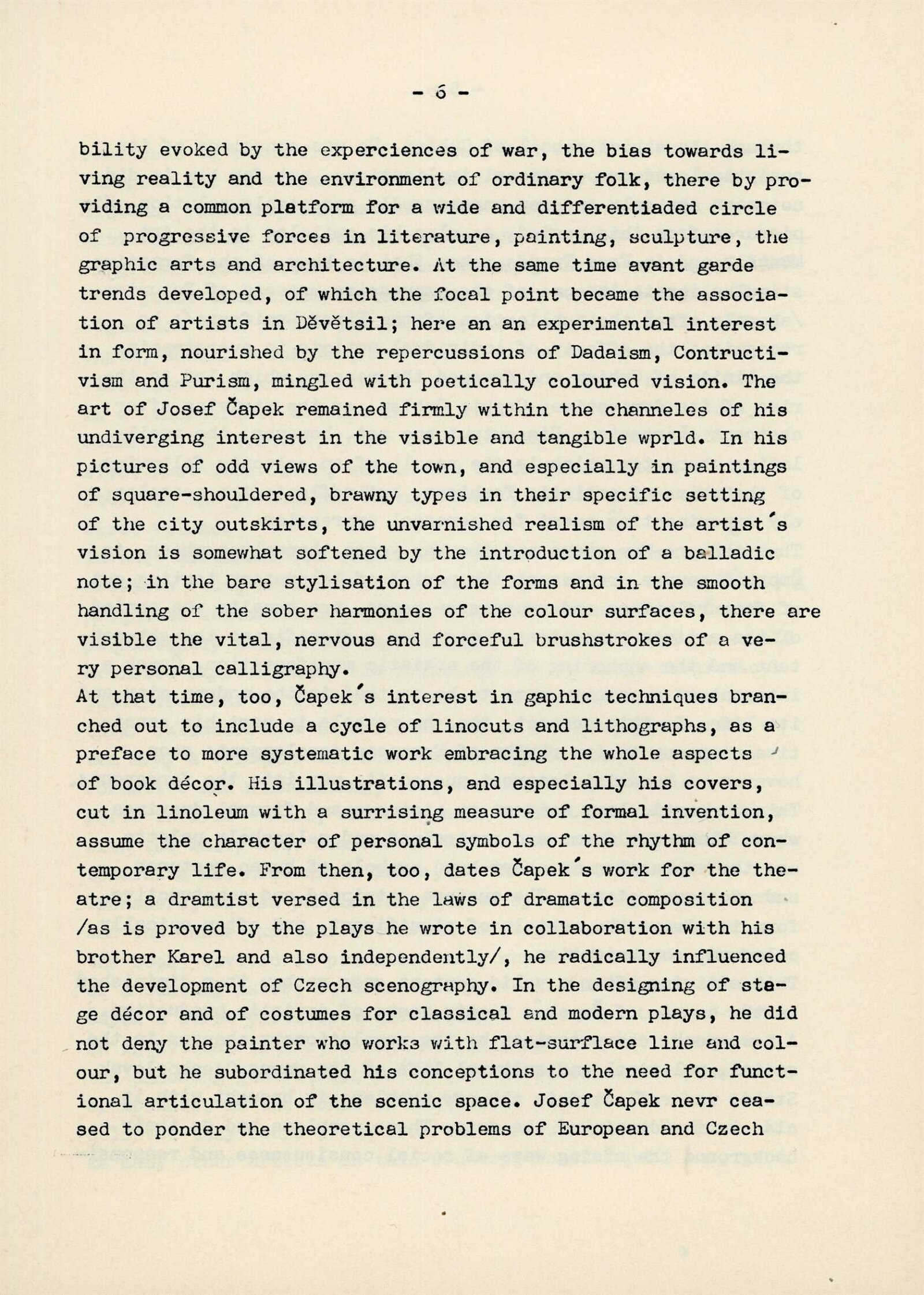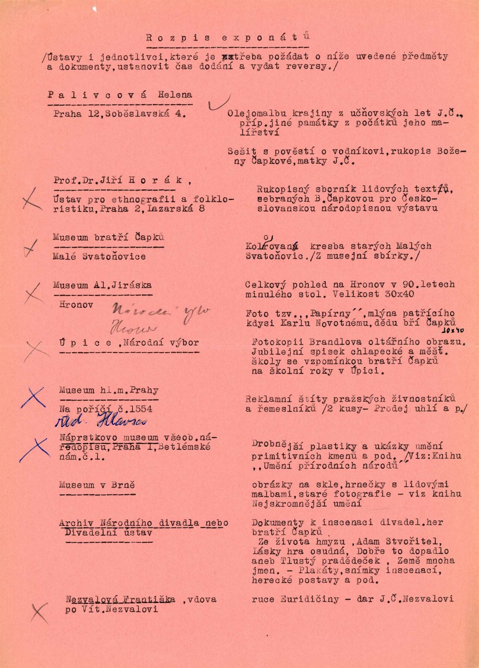 pozvánka, katalog, text přivítání na vernisáži (Gerta Pospíšilová), texty k výstavě (básně Josefa Čapka, L. Stehlíka, texty ČJ, AJ, FJ, RJ), popisky, seznam exponátů, fotografie děl pro katalog, foto Jiřího Kotalíka z vernisáže, seznam zápůjček (dokumenty, knihy, předměty, seznam knih Čapkem graficky upravovaných), korespondence (o rozpočtu s SČSVU a o financování výstavy, provozní korespondence, dopisy Dr. Slavíka, M. Míčka), seznam adres pro pozvánky, zápisy z přípravných schůzí a jednání s Jiřím Kotalíkem, koncepce výstavy a její členění, rozpočet, přihlášky pro výstavu, potvrzení o převzetí děl, reverzy, pojištění výstavy, zápisy z jednání a nástin výstavy (Jiří Kotalík), smlouvy o dílo (překlady, instalace atd.), rozpočet, recenze v tisku, podpisová kniha z výstavy (asi 60 stran)