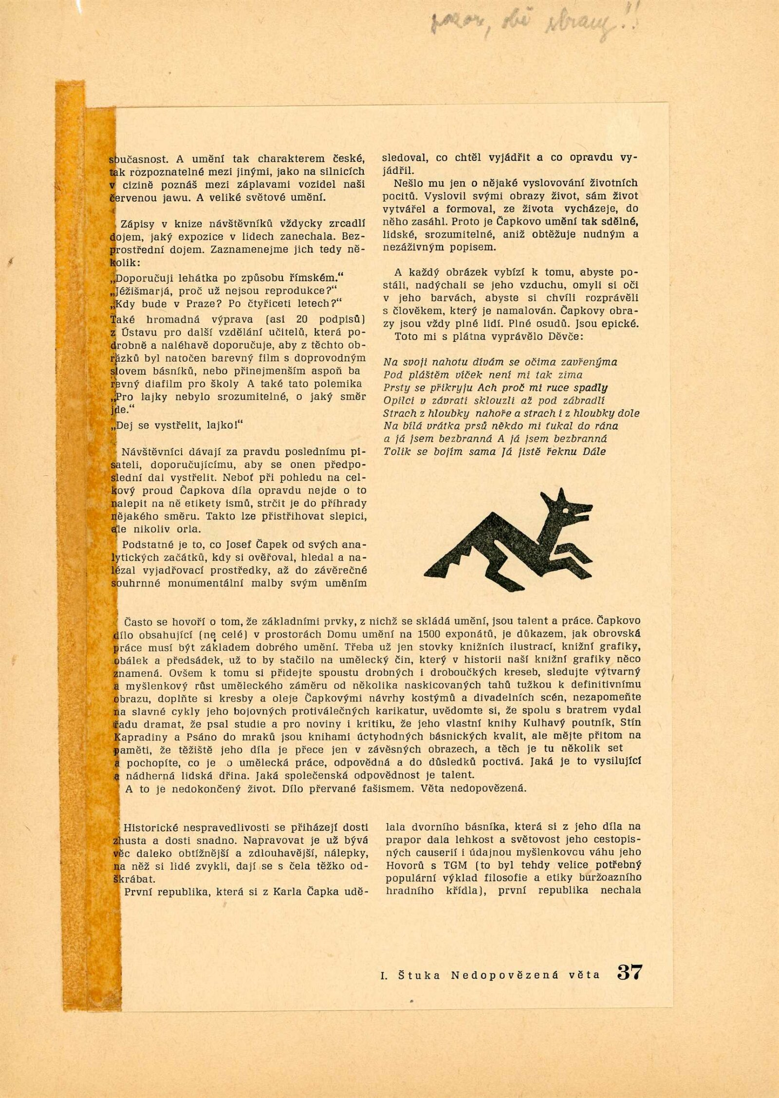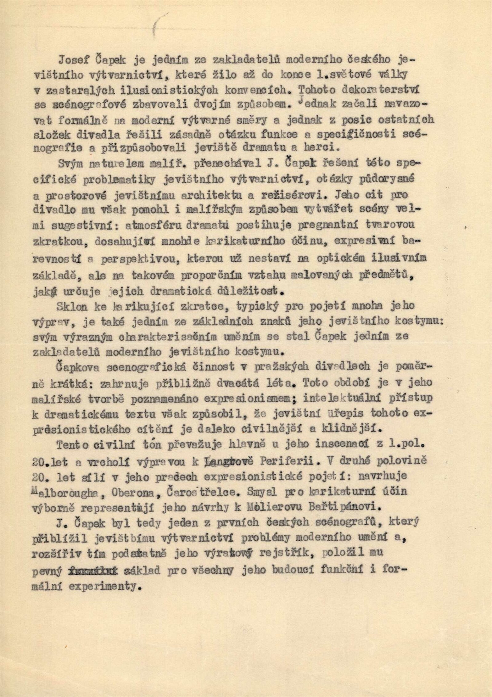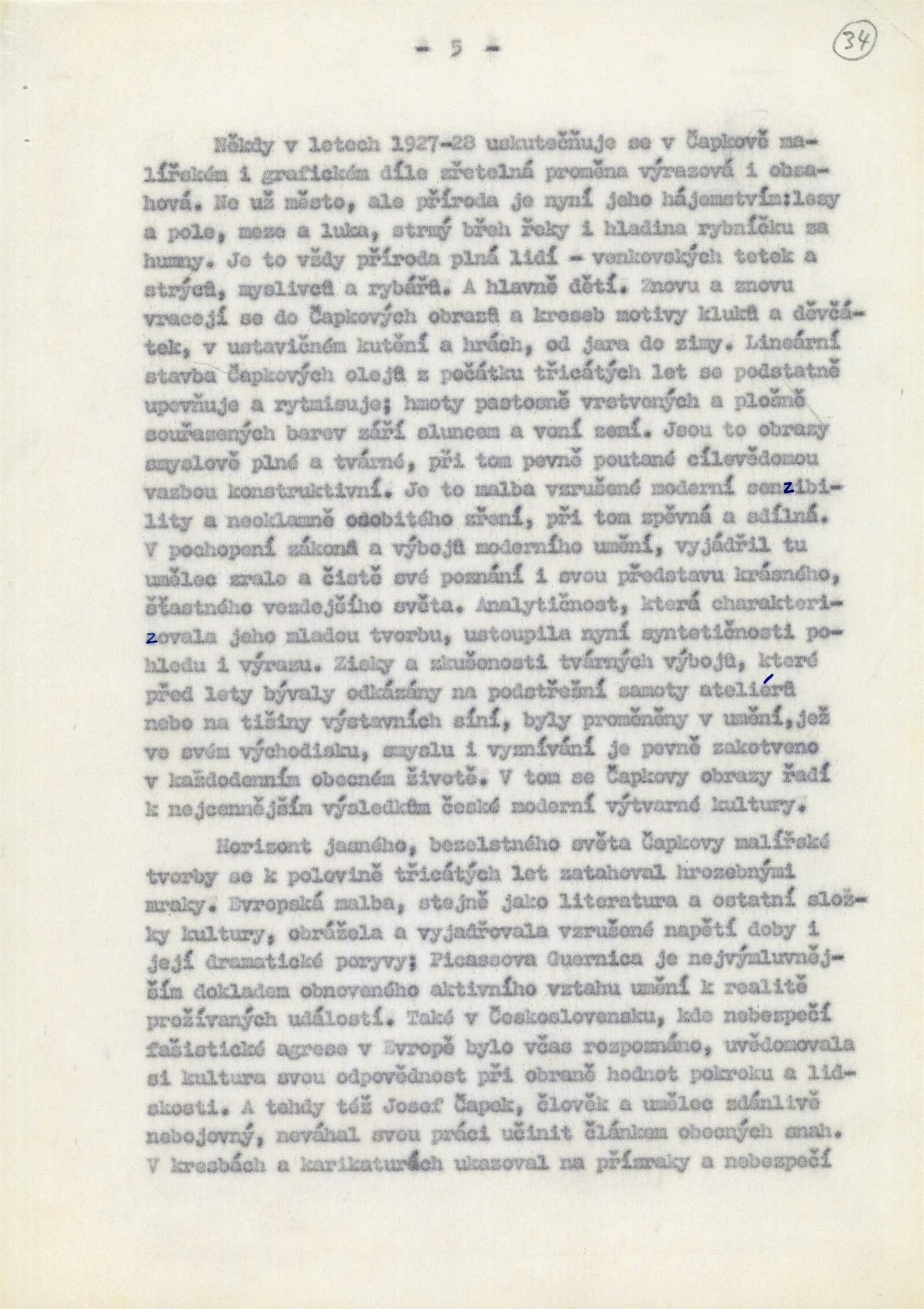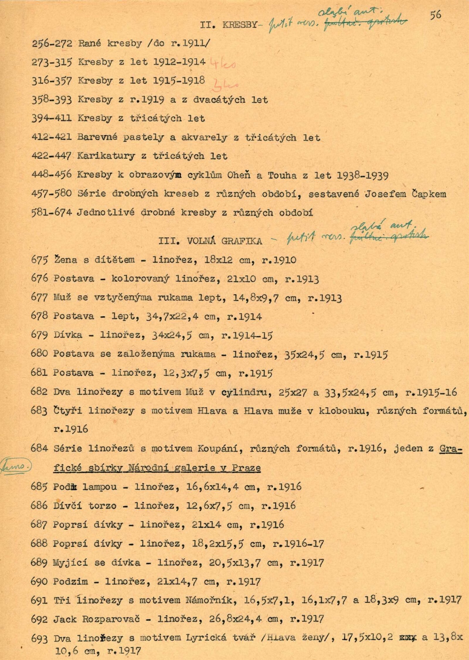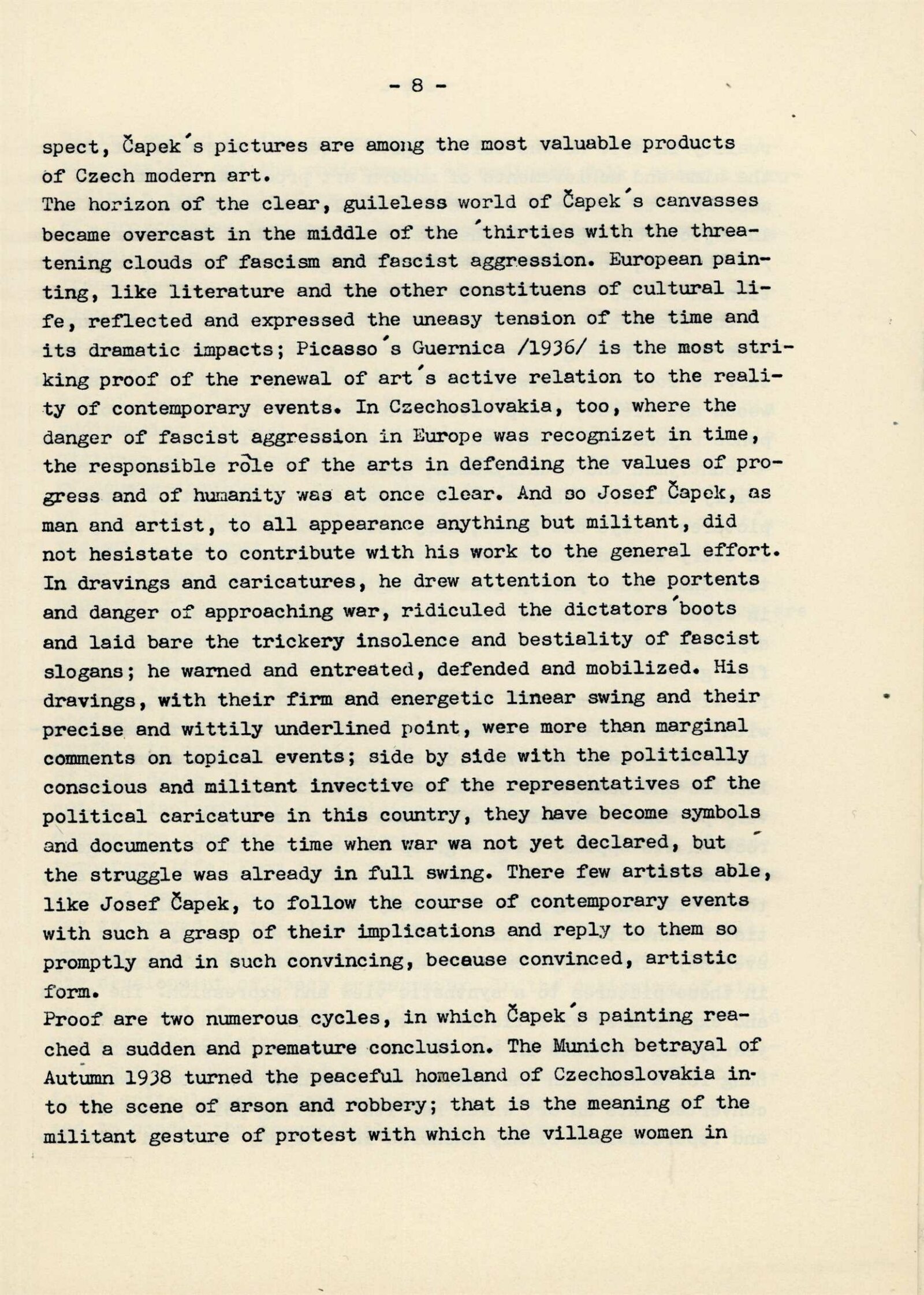 pozvánka, katalog, text přivítání na vernisáži (Gerta Pospíšilová), texty k výstavě (básně Josefa Čapka, L. Stehlíka, texty ČJ, AJ, FJ, RJ), popisky, seznam exponátů, fotografie děl pro katalog, foto Jiřího Kotalíka z vernisáže, seznam zápůjček (dokumenty, knihy, předměty, seznam knih Čapkem graficky upravovaných), korespondence (o rozpočtu s SČSVU a o financování výstavy, provozní korespondence, dopisy Dr. Slavíka, M. Míčka), seznam adres pro pozvánky, zápisy z přípravných schůzí a jednání s Jiřím Kotalíkem, koncepce výstavy a její členění, rozpočet, přihlášky pro výstavu, potvrzení o převzetí děl, reverzy, pojištění výstavy, zápisy z jednání a nástin výstavy (Jiří Kotalík), smlouvy o dílo (překlady, instalace atd.), rozpočet, recenze v tisku, podpisová kniha z výstavy (asi 60 stran)