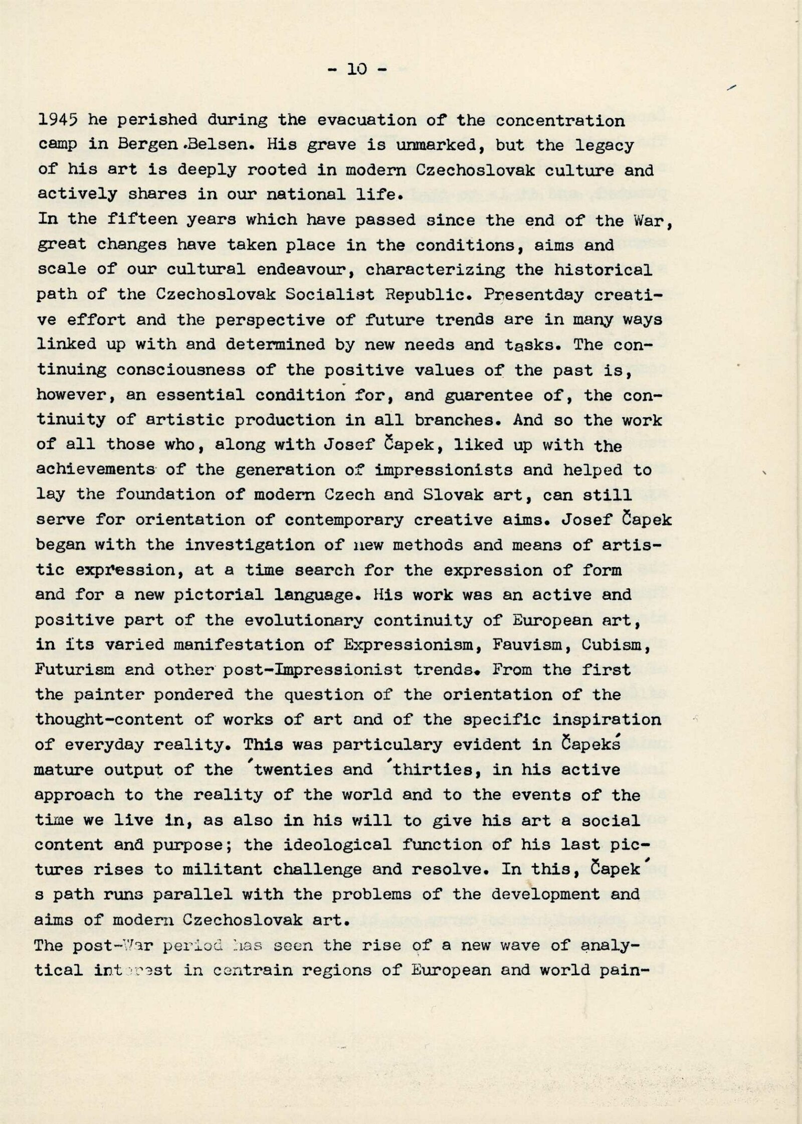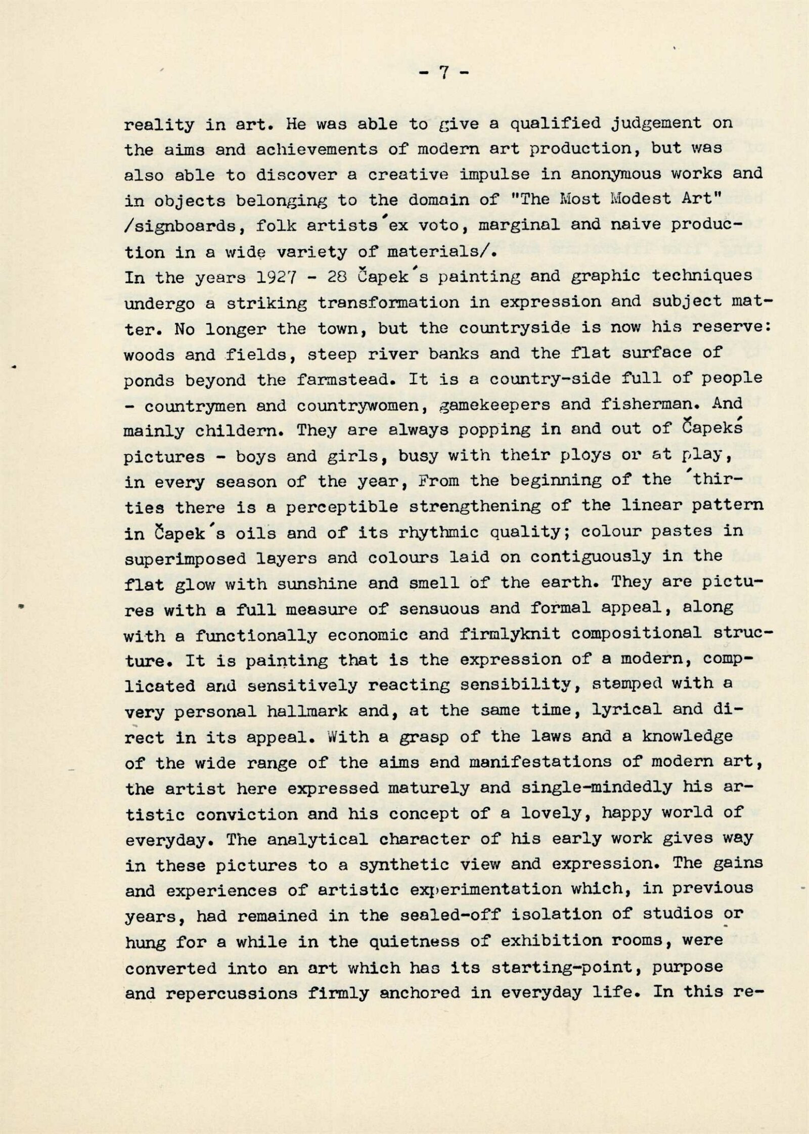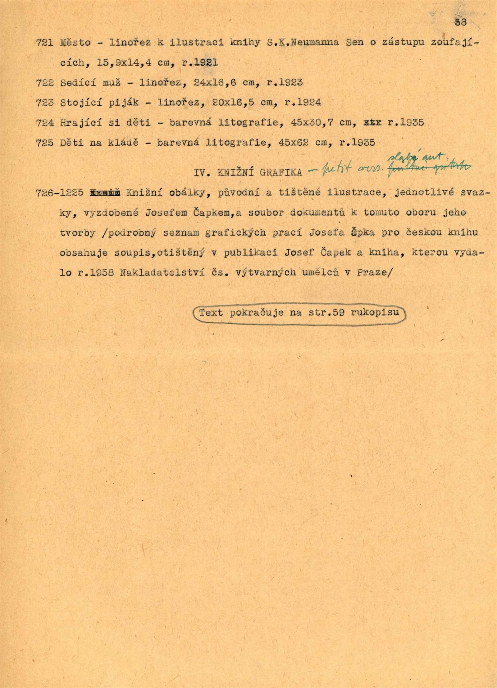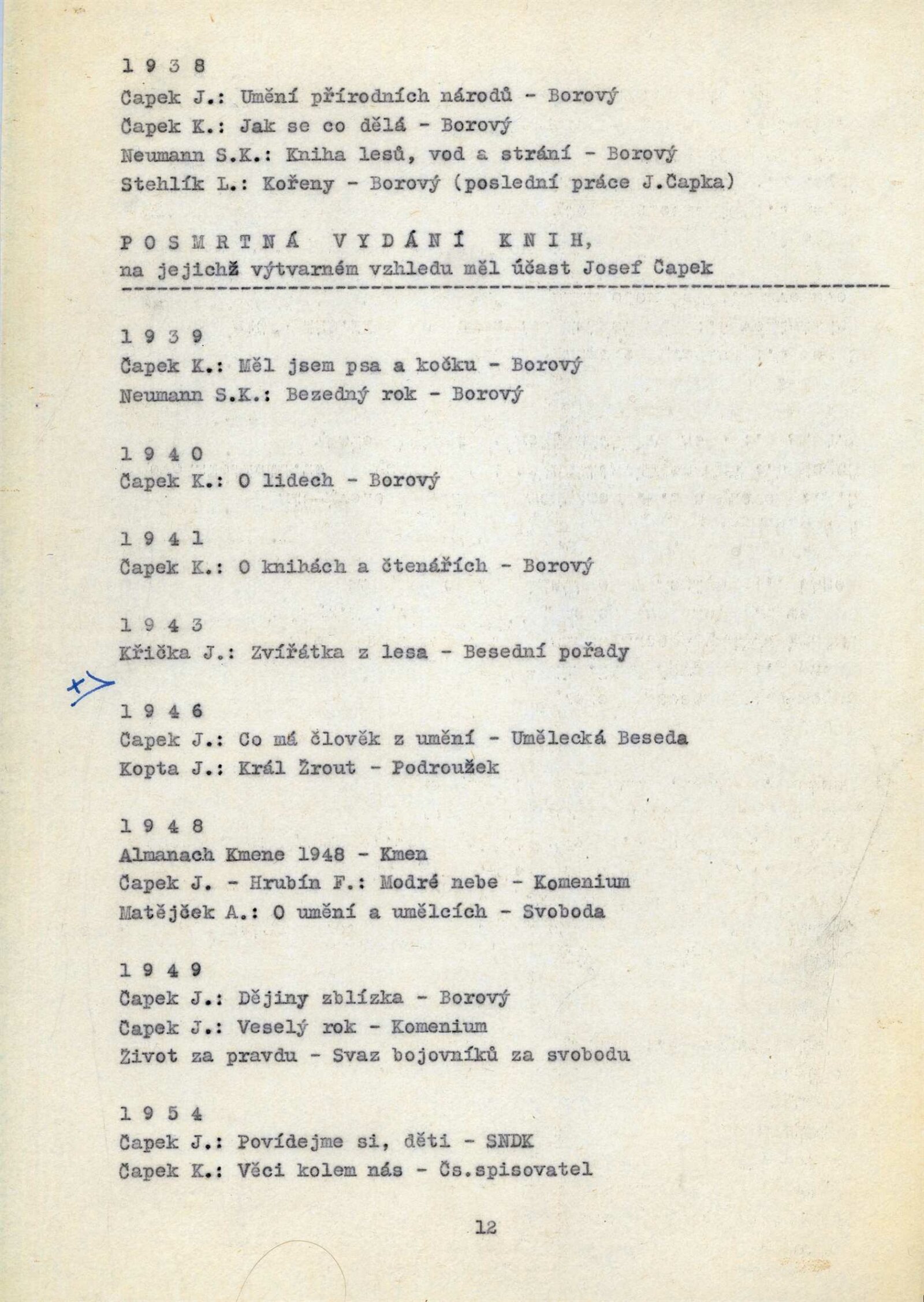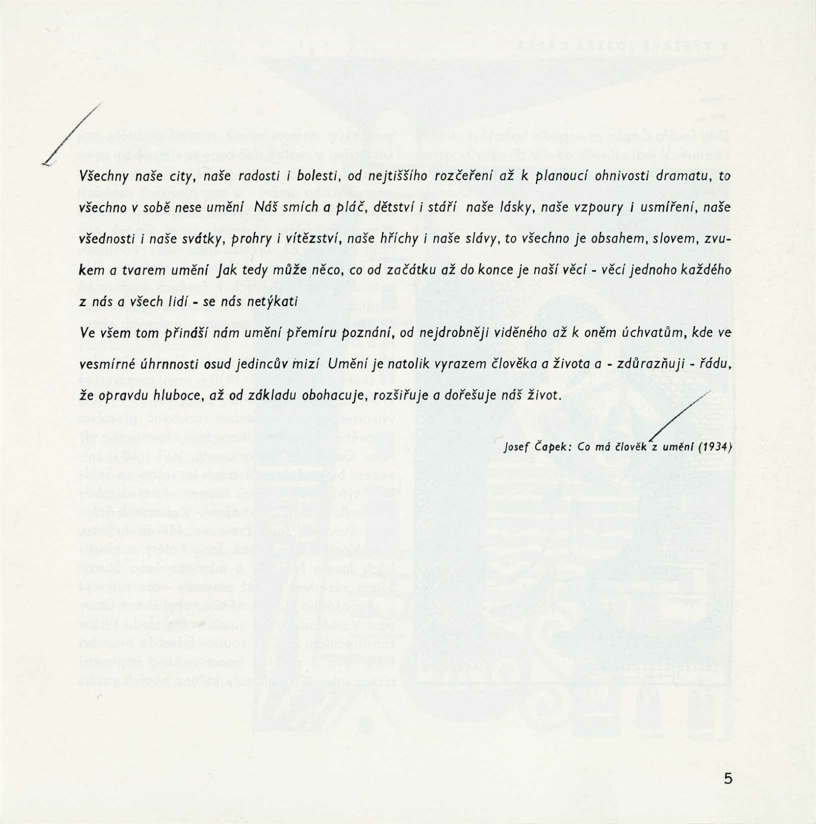 pozvánka, katalog, text přivítání na vernisáži (Gerta Pospíšilová), texty k výstavě (básně Josefa Čapka, L. Stehlíka, texty ČJ, AJ, FJ, RJ), popisky, seznam exponátů, fotografie děl pro katalog, foto Jiřího Kotalíka z vernisáže, seznam zápůjček (dokumenty, knihy, předměty, seznam knih Čapkem graficky upravovaných), korespondence (o rozpočtu s SČSVU a o financování výstavy, provozní korespondence, dopisy Dr. Slavíka, M. Míčka), seznam adres pro pozvánky, zápisy z přípravných schůzí a jednání s Jiřím Kotalíkem, koncepce výstavy a její členění, rozpočet, přihlášky pro výstavu, potvrzení o převzetí děl, reverzy, pojištění výstavy, zápisy z jednání a nástin výstavy (Jiří Kotalík), smlouvy o dílo (překlady, instalace atd.), rozpočet, recenze v tisku, podpisová kniha z výstavy (asi 60 stran)