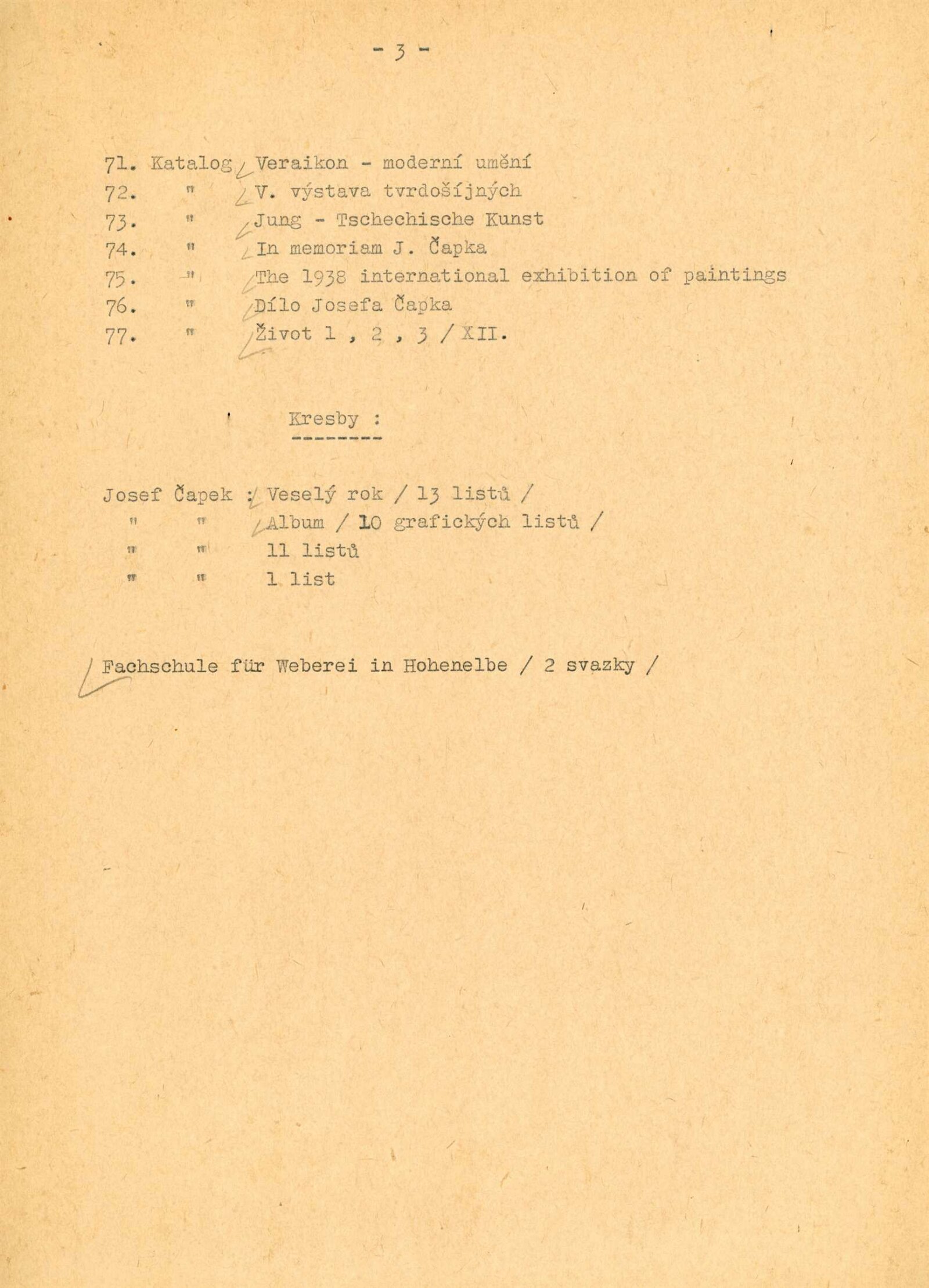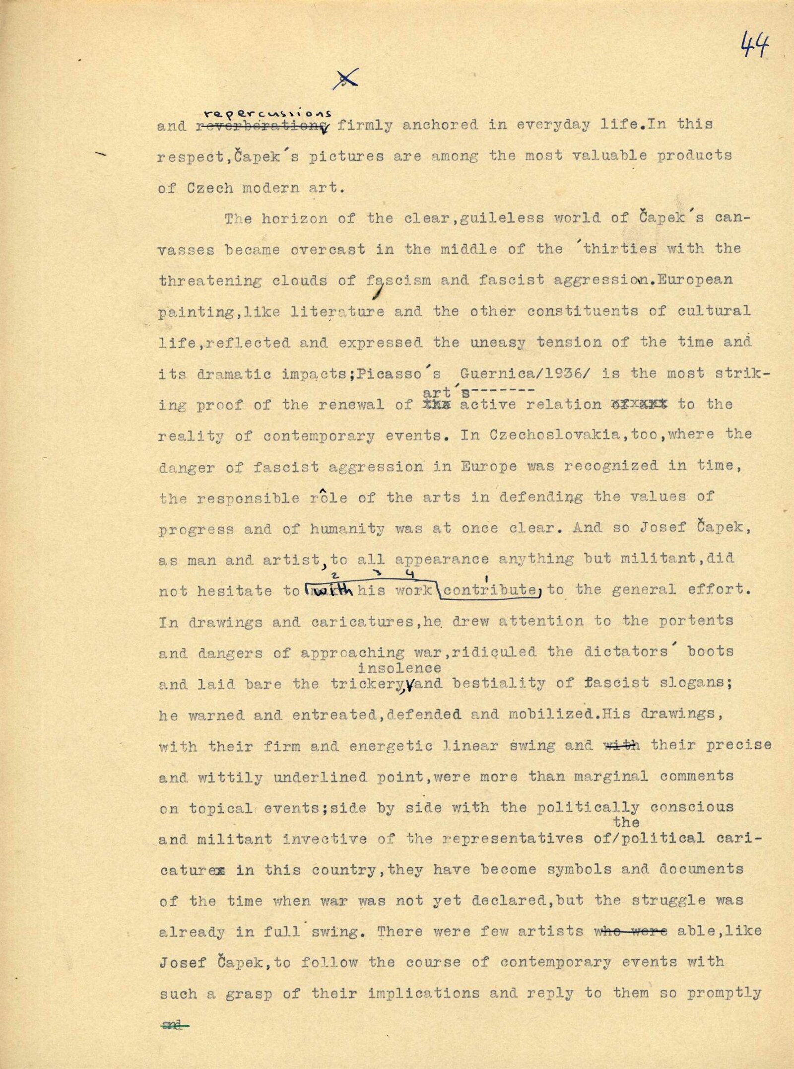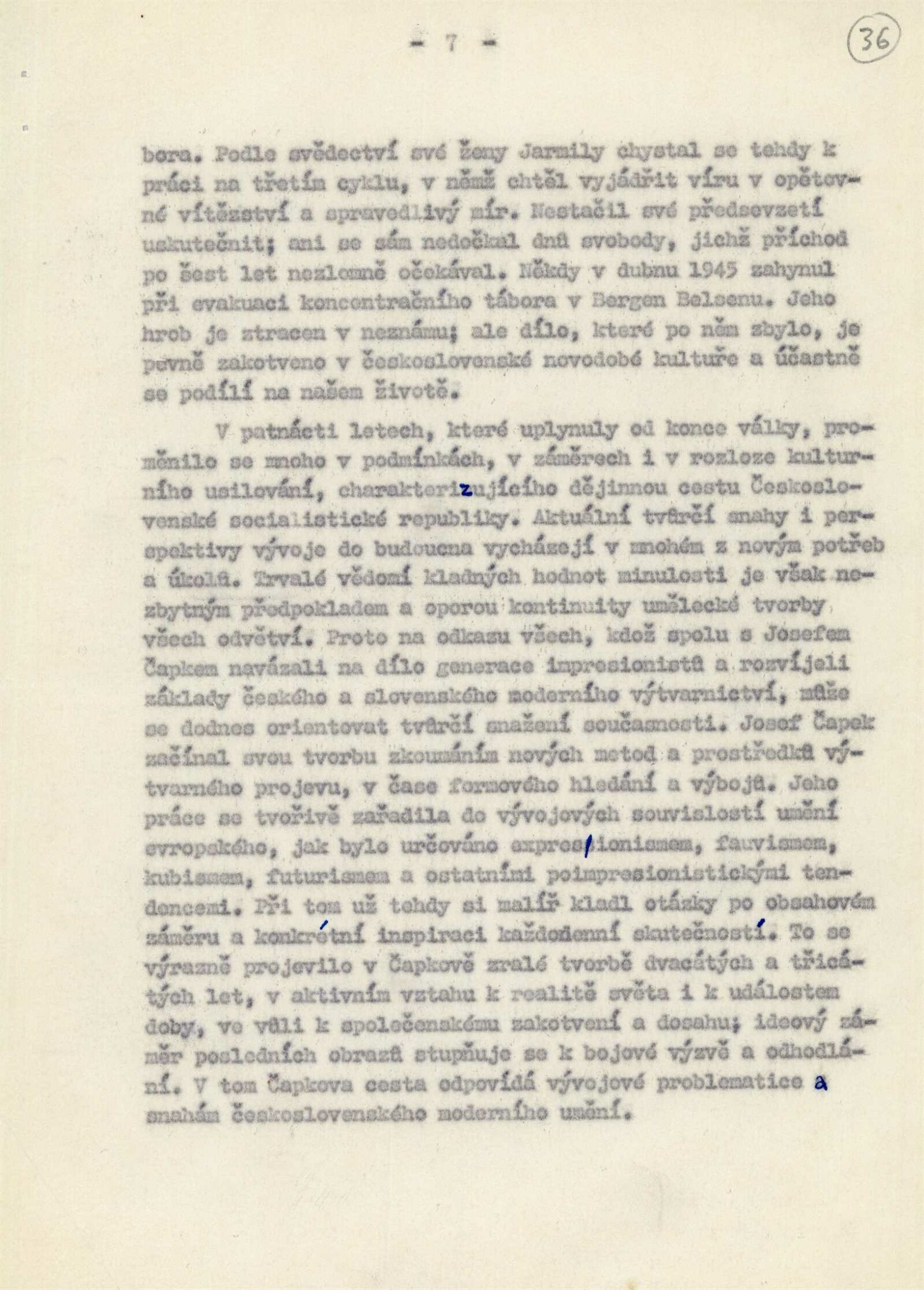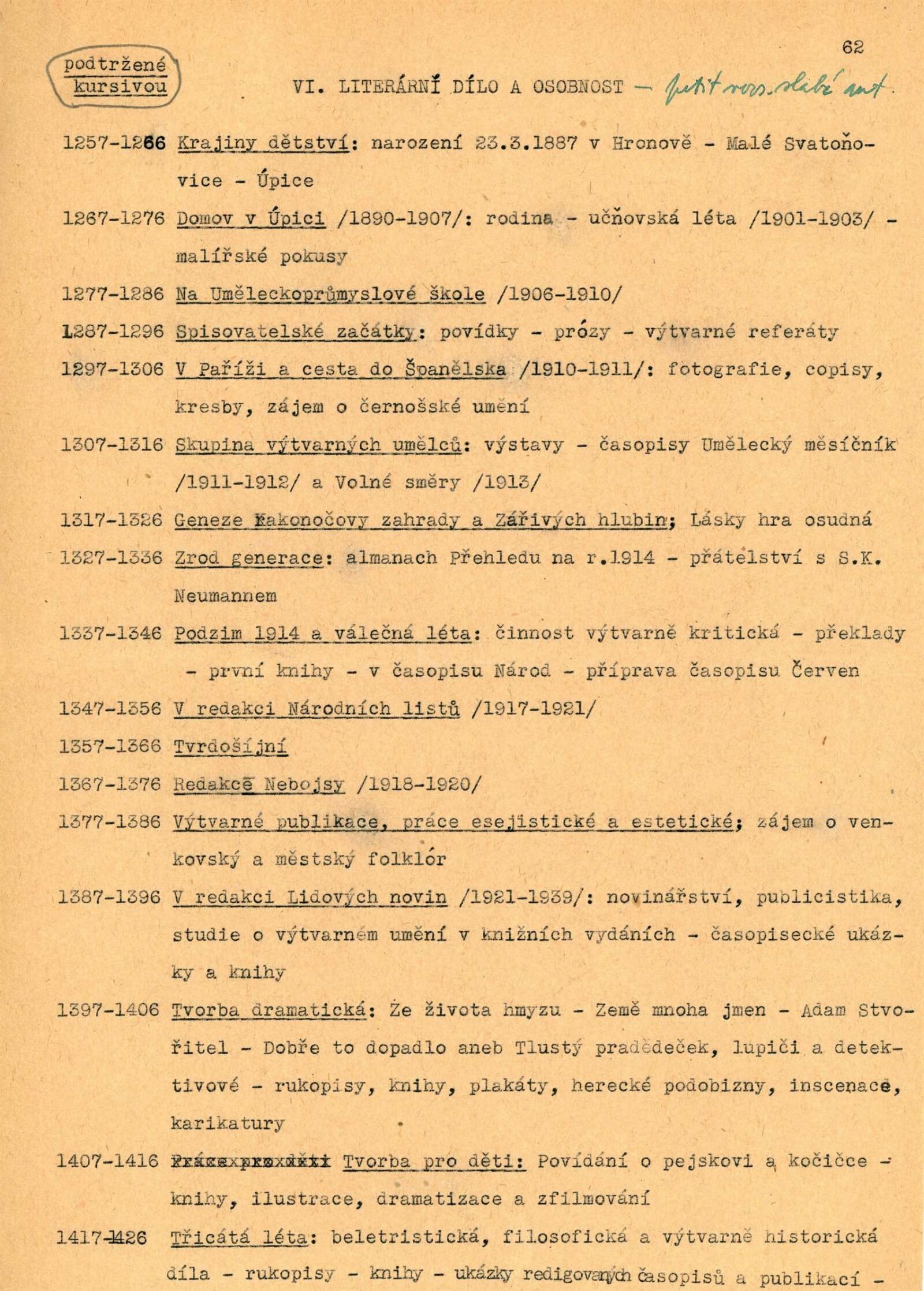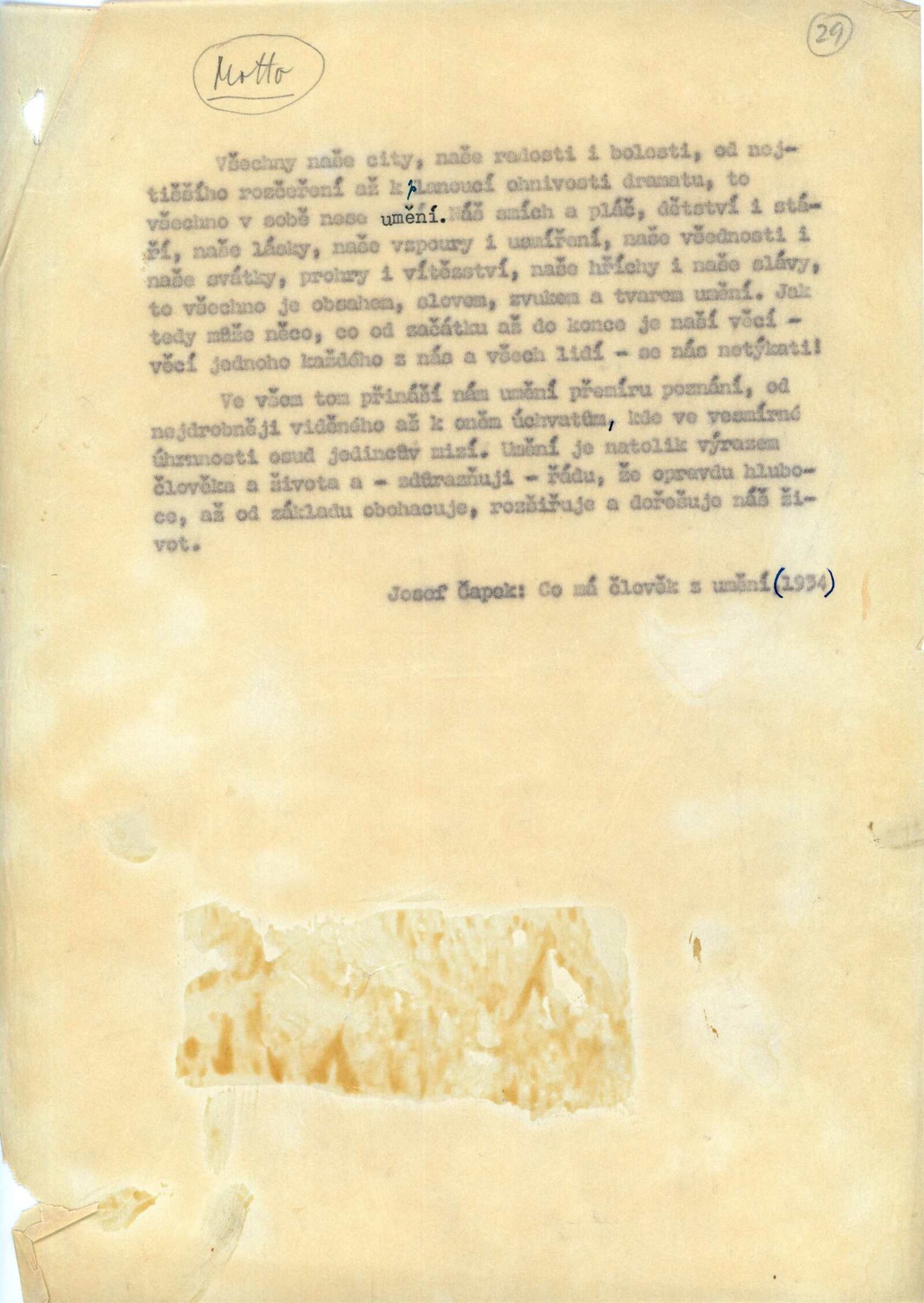 pozvánka, katalog, text přivítání na vernisáži (Gerta Pospíšilová), texty k výstavě (básně Josefa Čapka, L. Stehlíka, texty ČJ, AJ, FJ, RJ), popisky, seznam exponátů, fotografie děl pro katalog, foto Jiřího Kotalíka z vernisáže, seznam zápůjček (dokumenty, knihy, předměty, seznam knih Čapkem graficky upravovaných), korespondence (o rozpočtu s SČSVU a o financování výstavy, provozní korespondence, dopisy Dr. Slavíka, M. Míčka), seznam adres pro pozvánky, zápisy z přípravných schůzí a jednání s Jiřím Kotalíkem, koncepce výstavy a její členění, rozpočet, přihlášky pro výstavu, potvrzení o převzetí děl, reverzy, pojištění výstavy, zápisy z jednání a nástin výstavy (Jiří Kotalík), smlouvy o dílo (překlady, instalace atd.), rozpočet, recenze v tisku, podpisová kniha z výstavy (asi 60 stran)