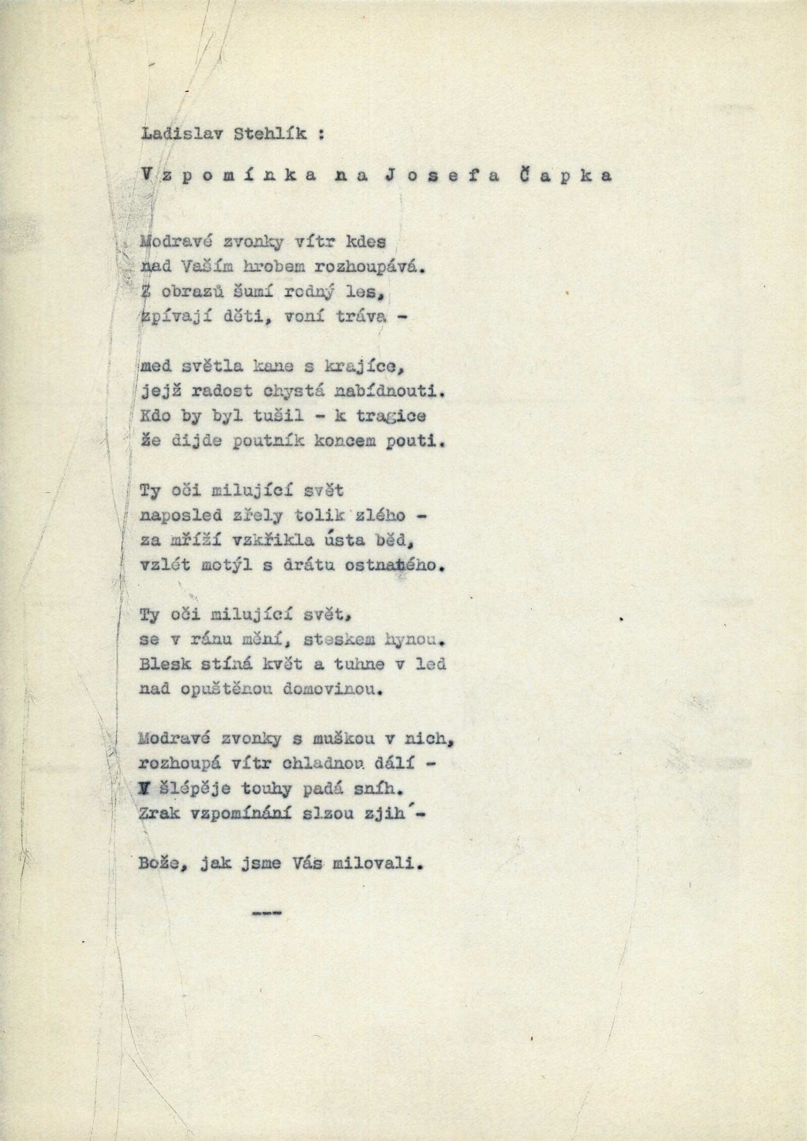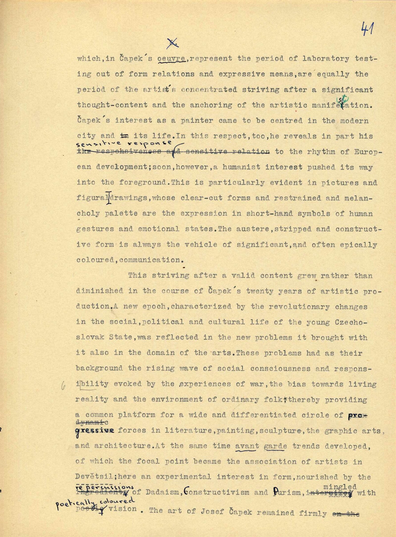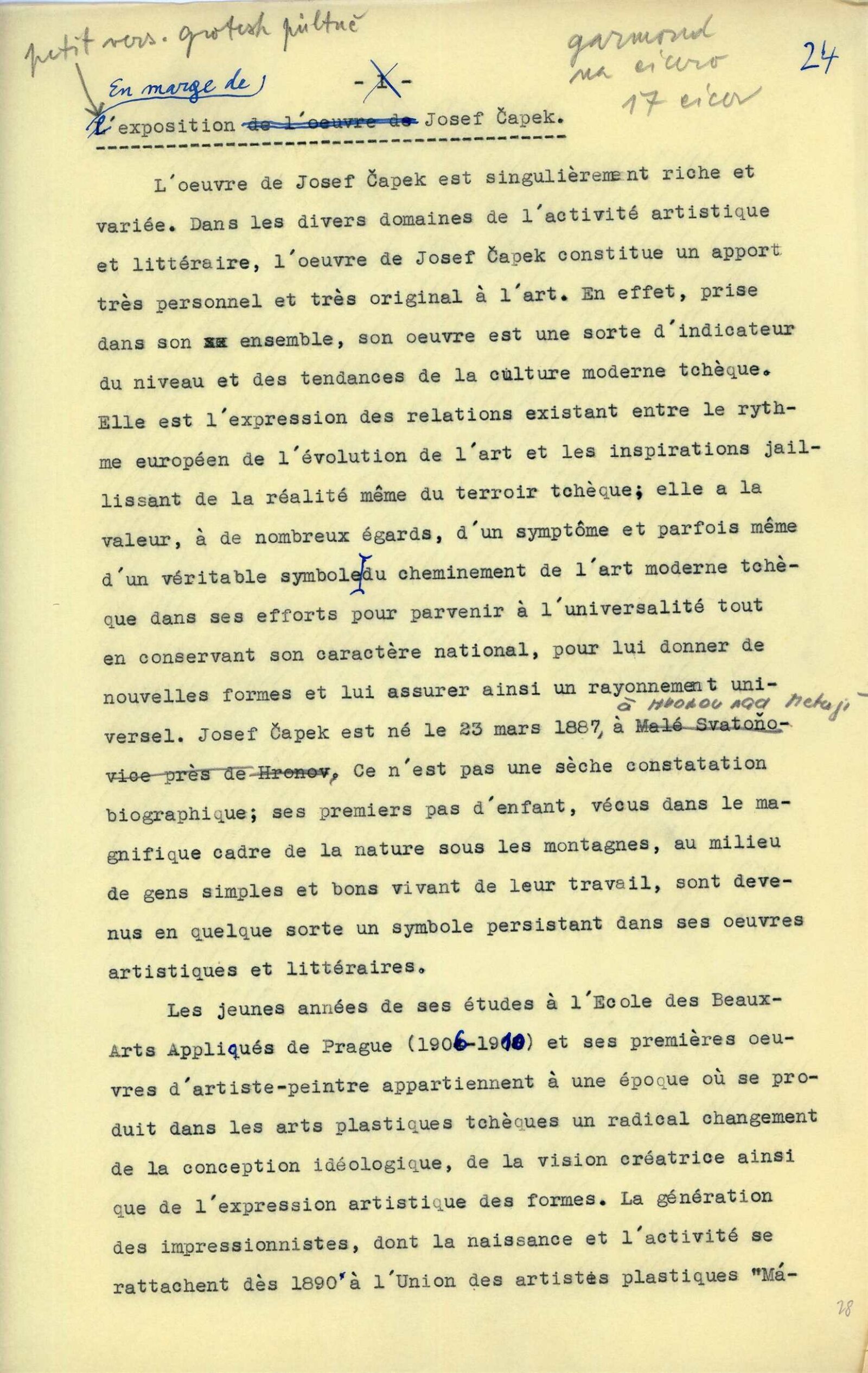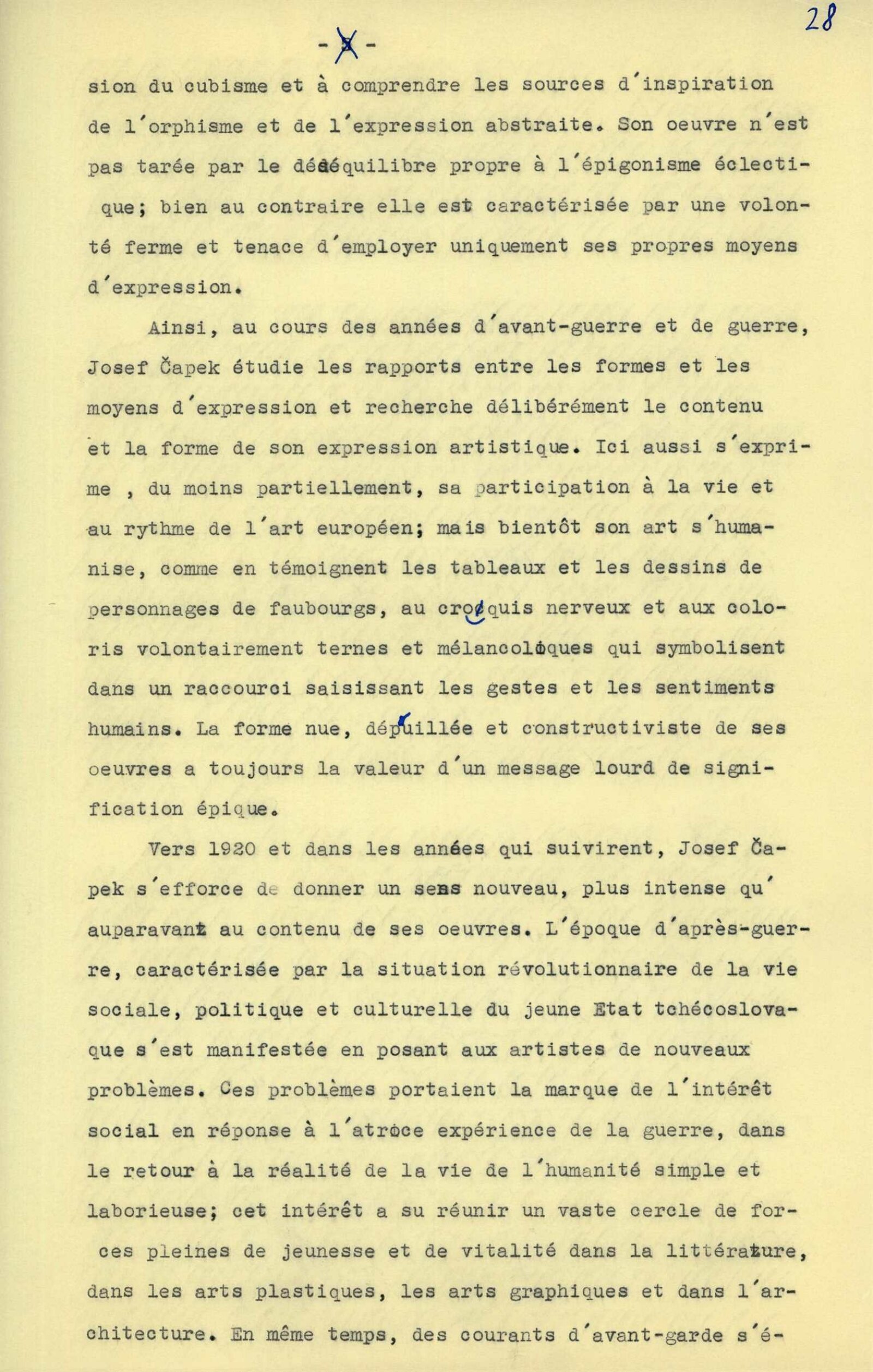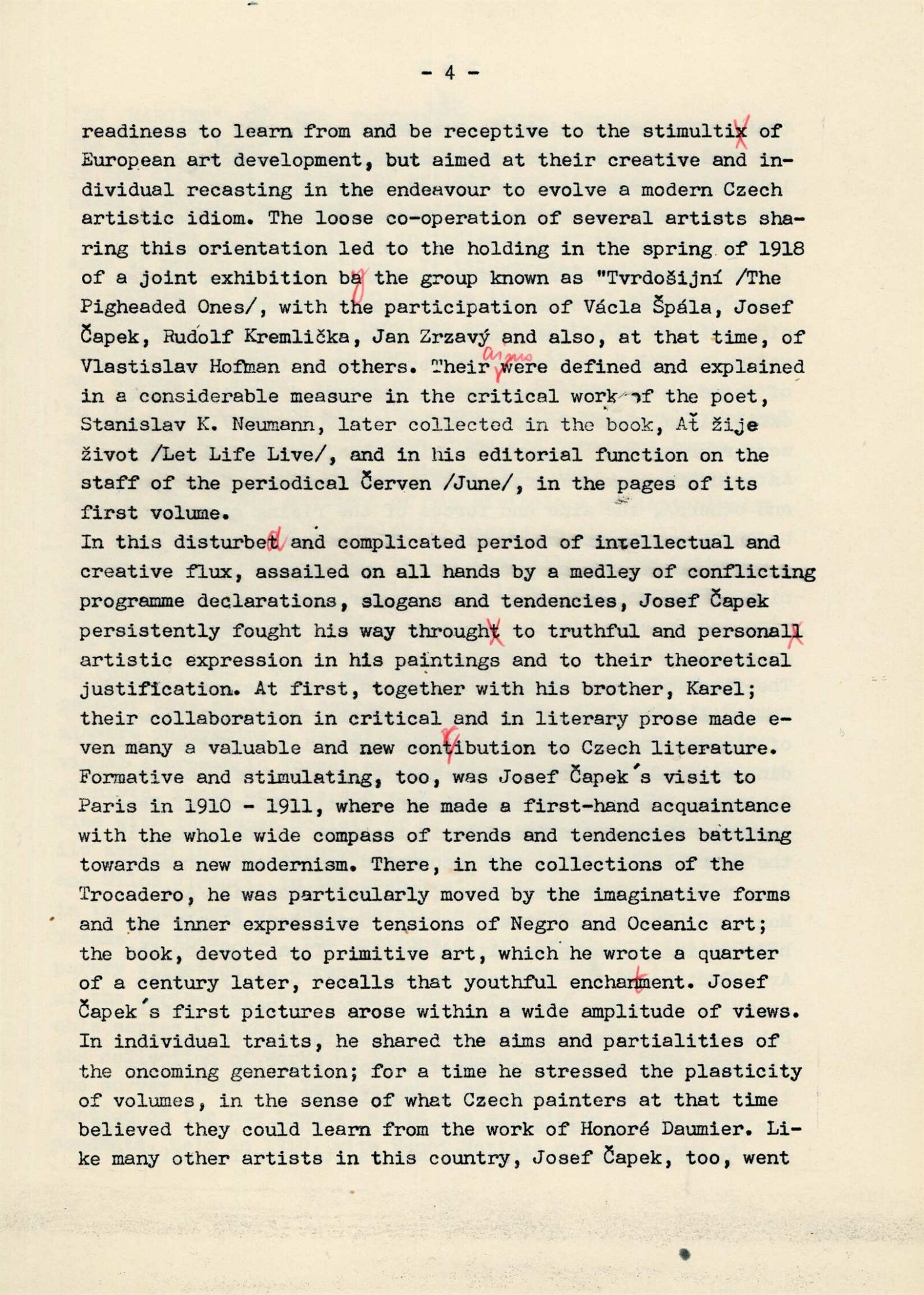 pozvánka, katalog, text přivítání na vernisáži (Gerta Pospíšilová), texty k výstavě (básně Josefa Čapka, L. Stehlíka, texty ČJ, AJ, FJ, RJ), popisky, seznam exponátů, fotografie děl pro katalog, foto Jiřího Kotalíka z vernisáže, seznam zápůjček (dokumenty, knihy, předměty, seznam knih Čapkem graficky upravovaných), korespondence (o rozpočtu s SČSVU a o financování výstavy, provozní korespondence, dopisy Dr. Slavíka, M. Míčka), seznam adres pro pozvánky, zápisy z přípravných schůzí a jednání s Jiřím Kotalíkem, koncepce výstavy a její členění, rozpočet, přihlášky pro výstavu, potvrzení o převzetí děl, reverzy, pojištění výstavy, zápisy z jednání a nástin výstavy (Jiří Kotalík), smlouvy o dílo (překlady, instalace atd.), rozpočet, recenze v tisku, podpisová kniha z výstavy (asi 60 stran)