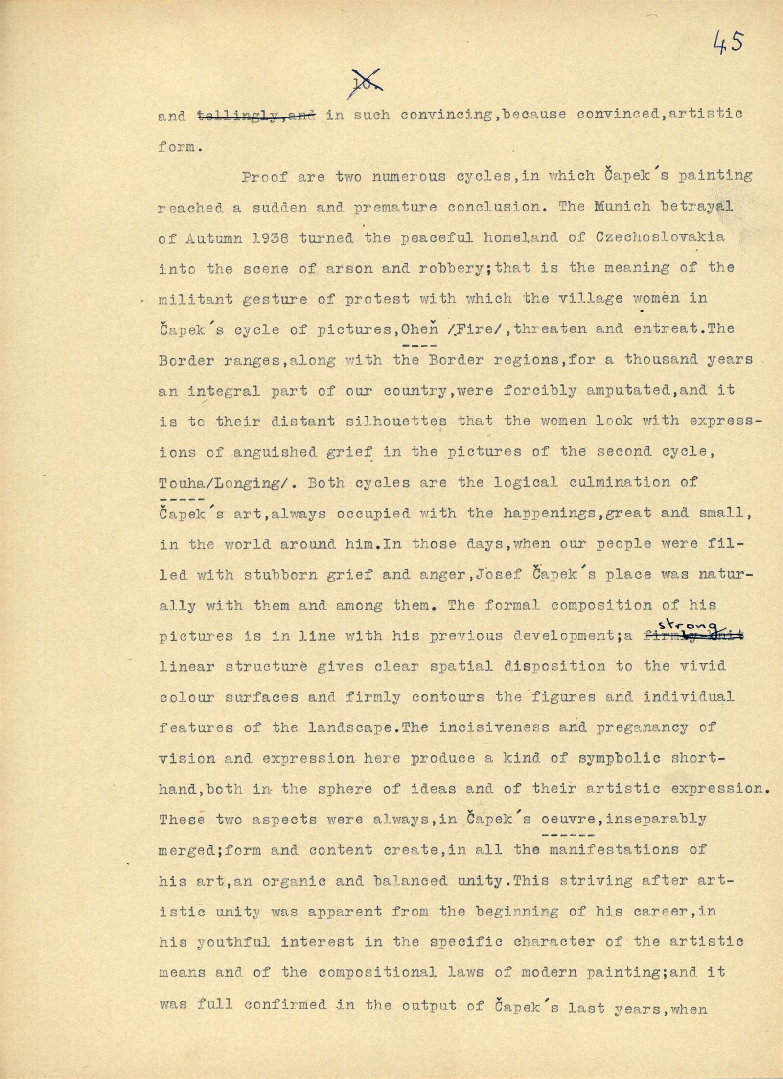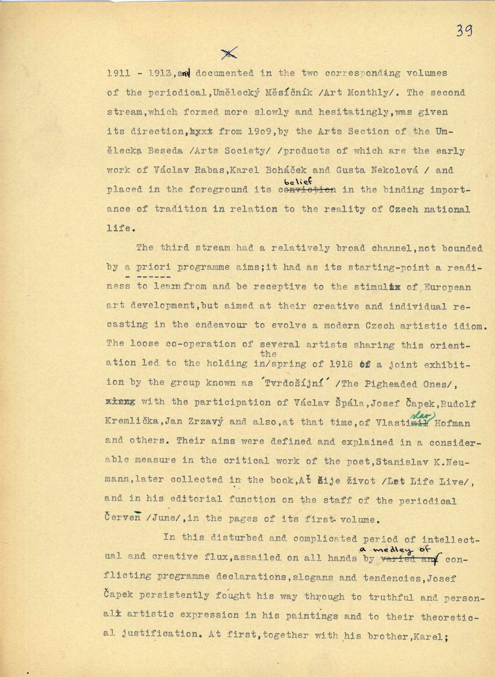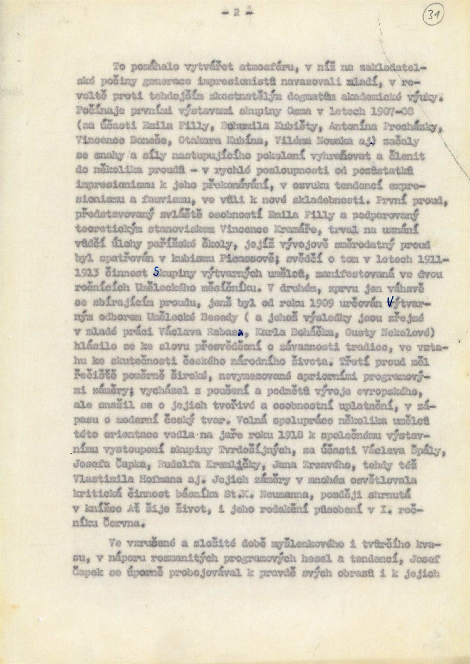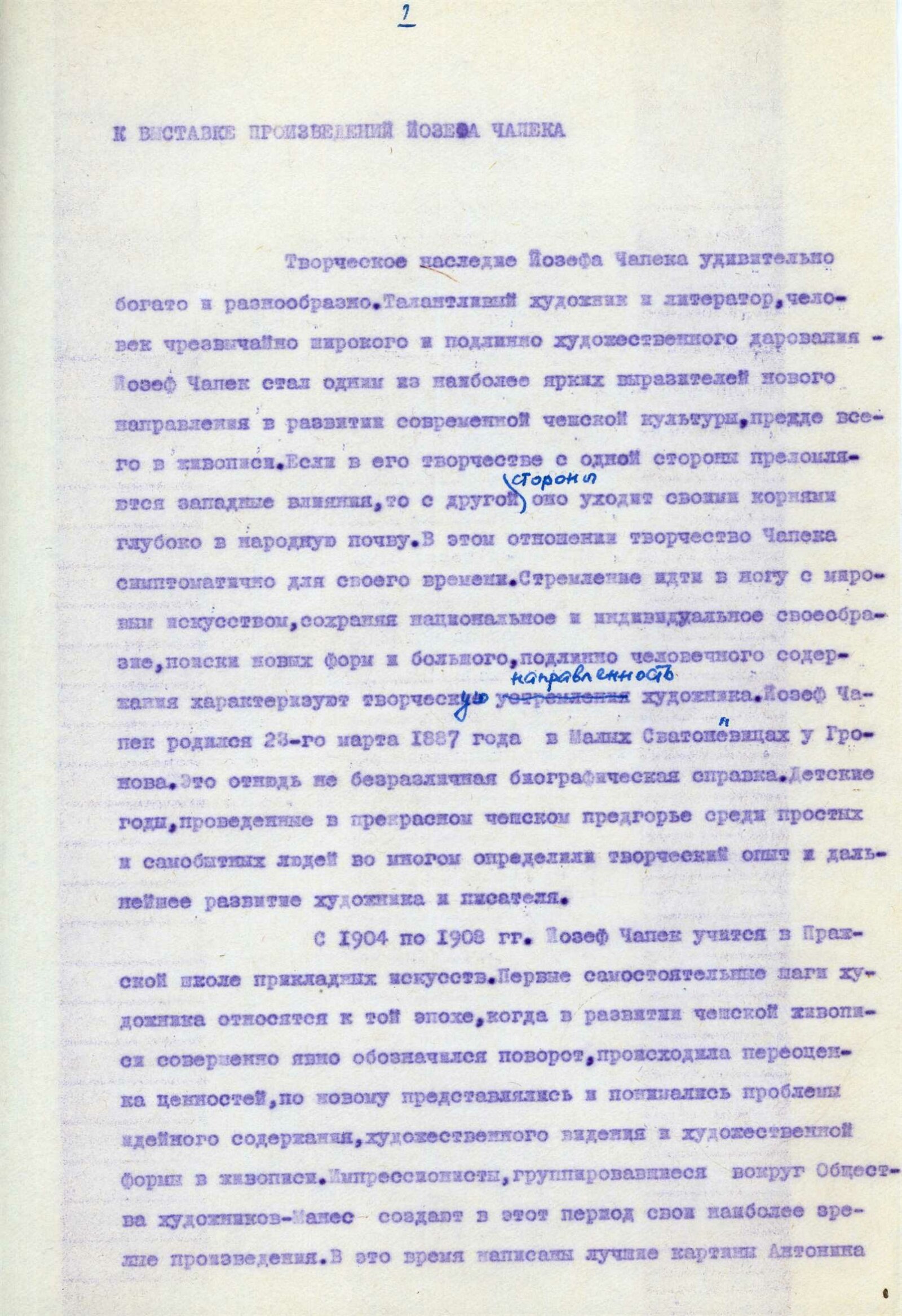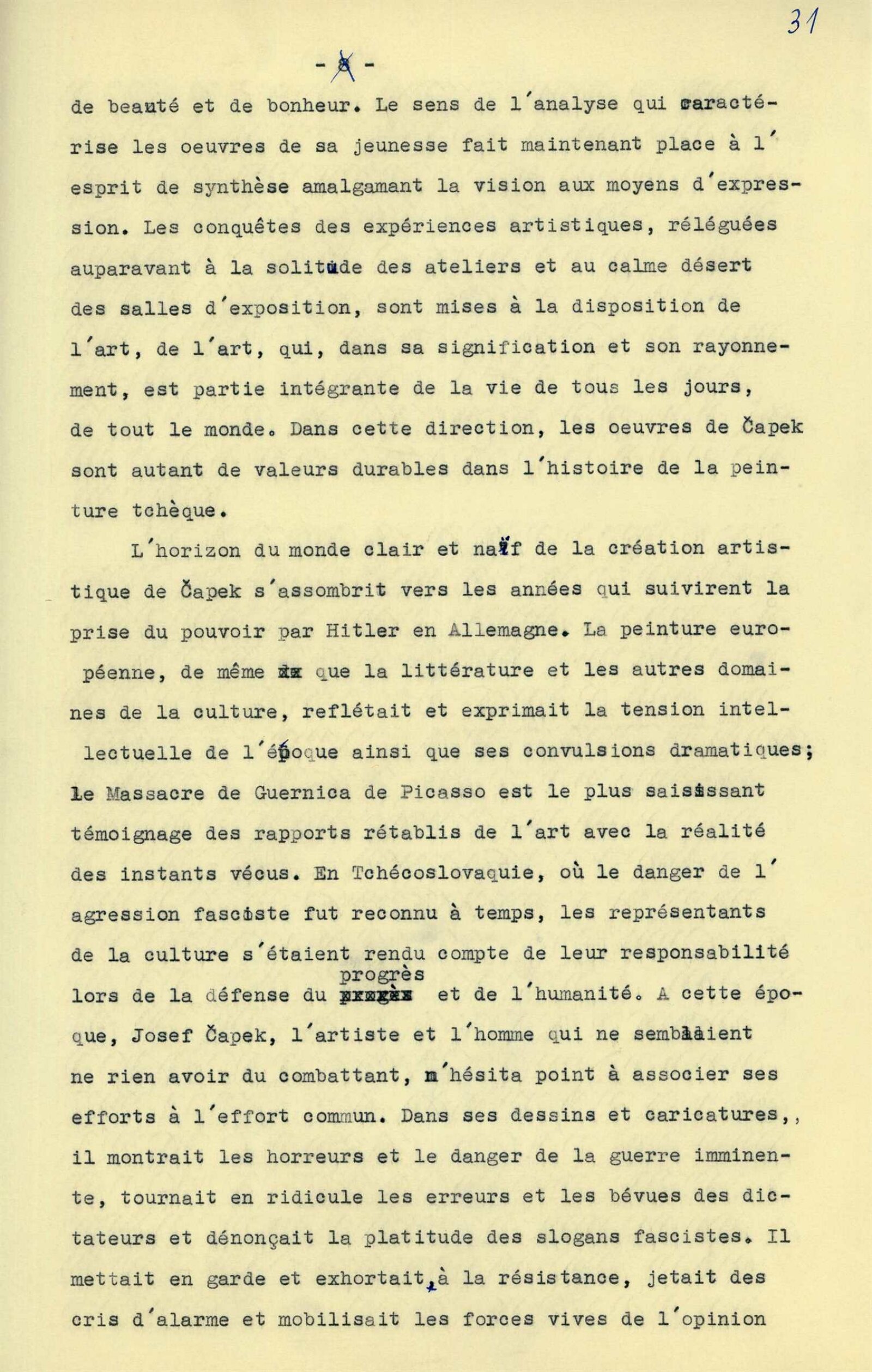 pozvánka, katalog, text přivítání na vernisáži (Gerta Pospíšilová), texty k výstavě (básně Josefa Čapka, L. Stehlíka, texty ČJ, AJ, FJ, RJ), popisky, seznam exponátů, fotografie děl pro katalog, foto Jiřího Kotalíka z vernisáže, seznam zápůjček (dokumenty, knihy, předměty, seznam knih Čapkem graficky upravovaných), korespondence (o rozpočtu s SČSVU a o financování výstavy, provozní korespondence, dopisy Dr. Slavíka, M. Míčka), seznam adres pro pozvánky, zápisy z přípravných schůzí a jednání s Jiřím Kotalíkem, koncepce výstavy a její členění, rozpočet, přihlášky pro výstavu, potvrzení o převzetí děl, reverzy, pojištění výstavy, zápisy z jednání a nástin výstavy (Jiří Kotalík), smlouvy o dílo (překlady, instalace atd.), rozpočet, recenze v tisku, podpisová kniha z výstavy (asi 60 stran)