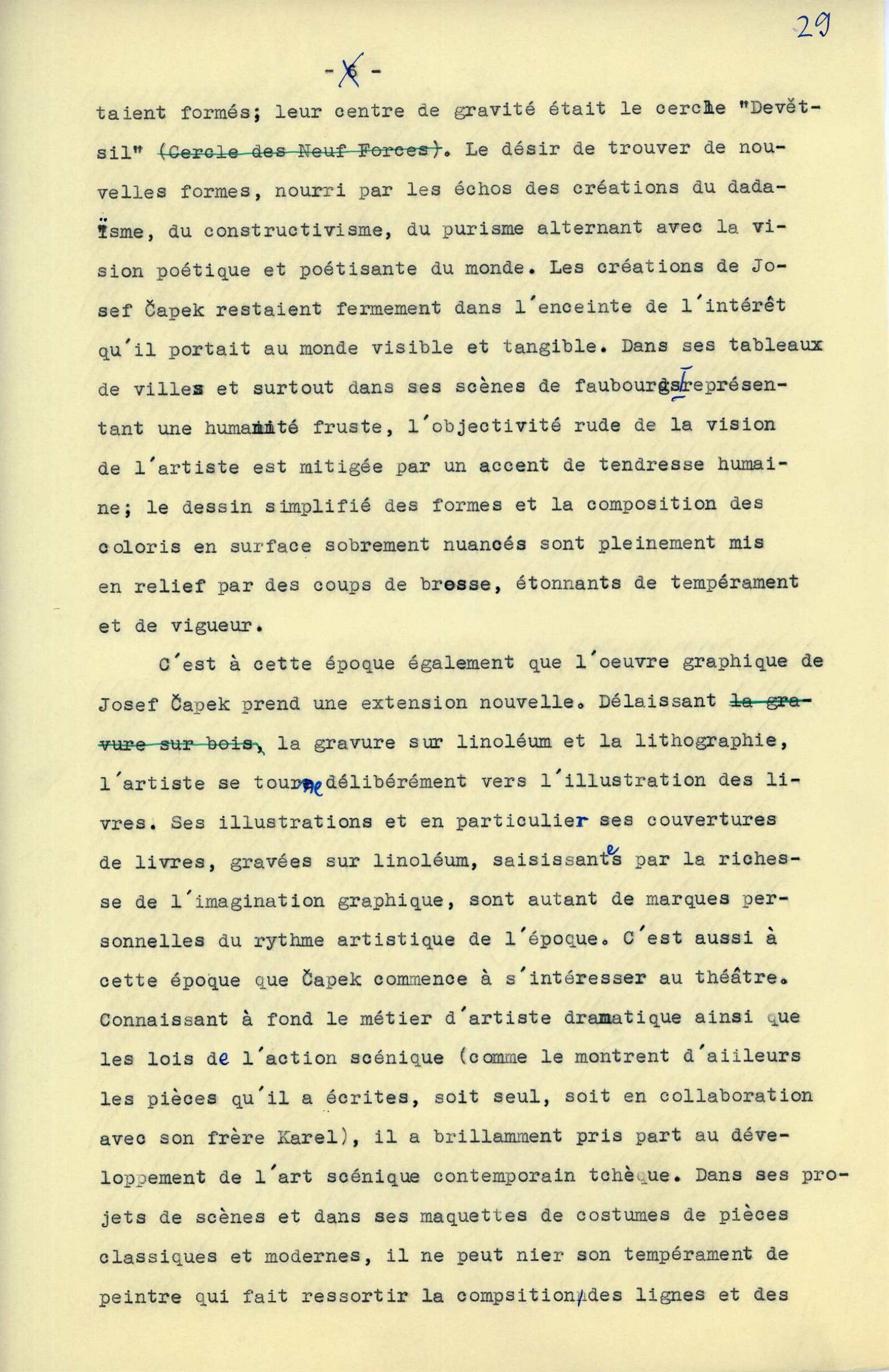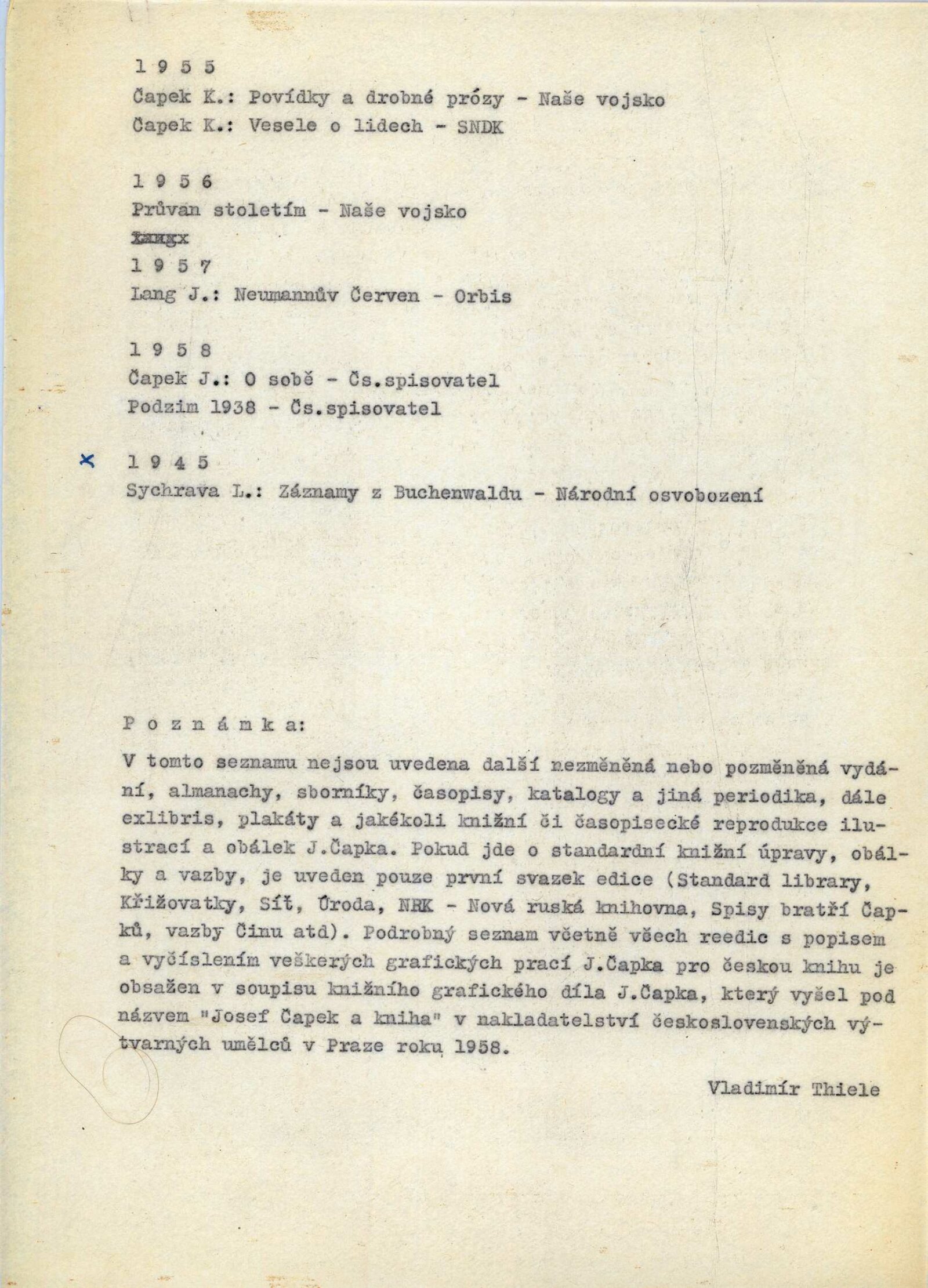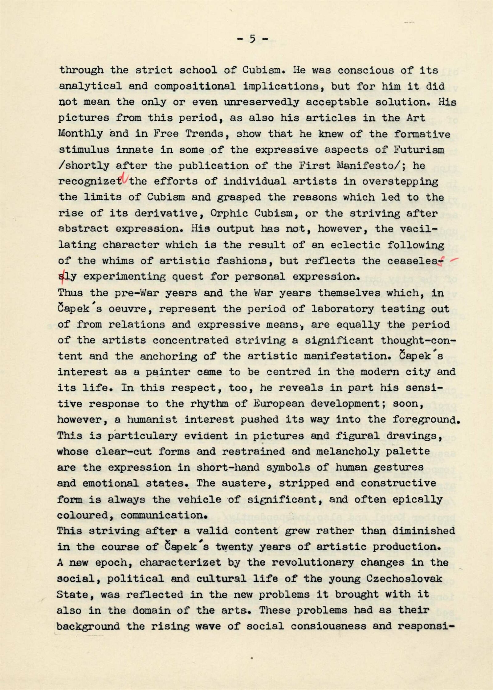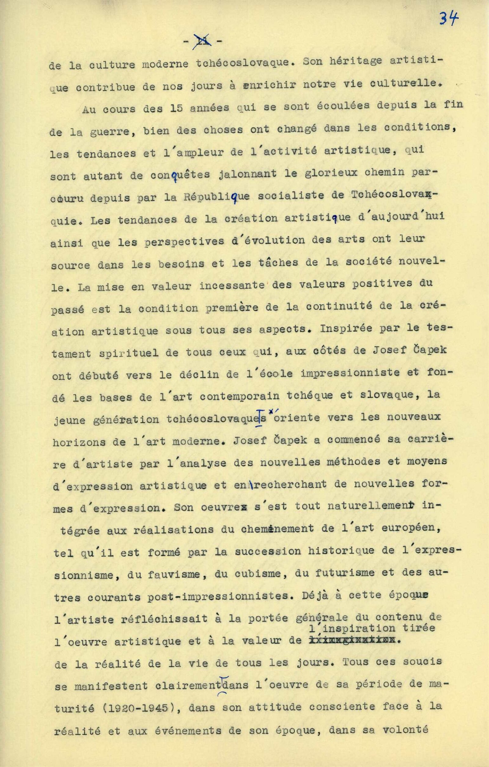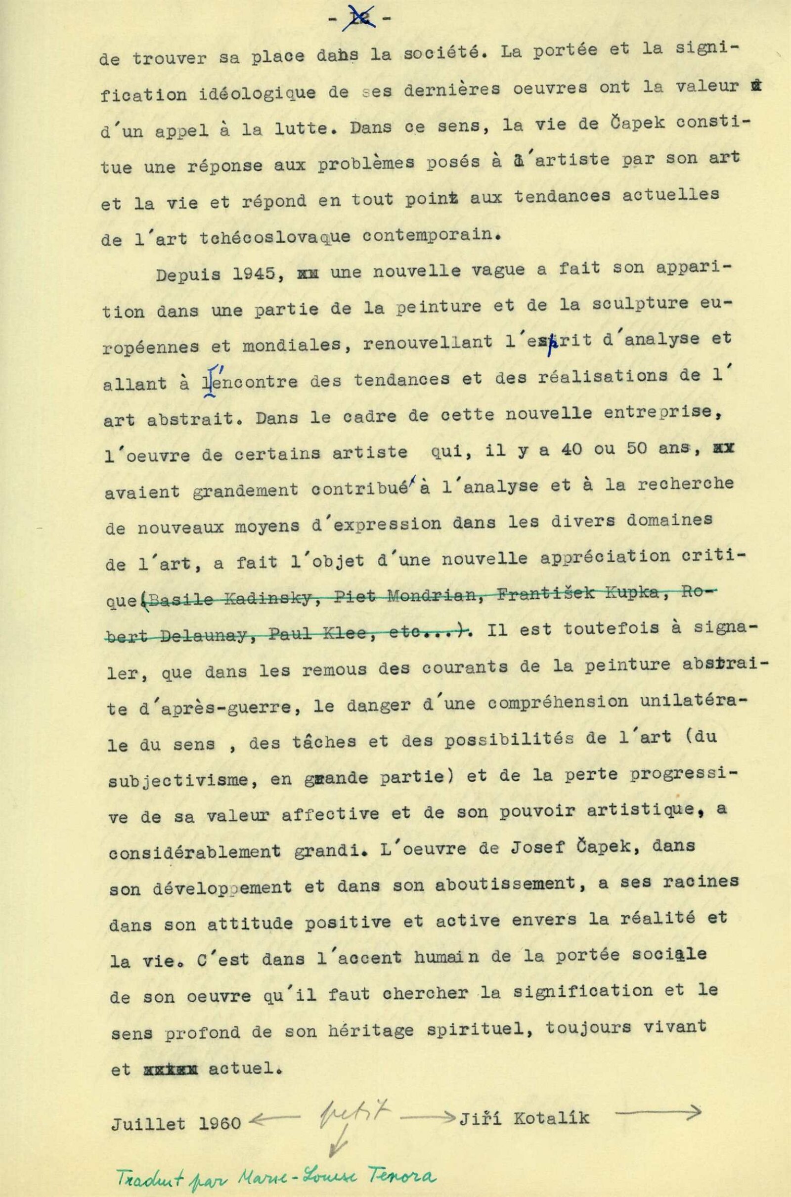 pozvánka, katalog, text přivítání na vernisáži (Gerta Pospíšilová), texty k výstavě (básně Josefa Čapka, L. Stehlíka, texty ČJ, AJ, FJ, RJ), popisky, seznam exponátů, fotografie děl pro katalog, foto Jiřího Kotalíka z vernisáže, seznam zápůjček (dokumenty, knihy, předměty, seznam knih Čapkem graficky upravovaných), korespondence (o rozpočtu s SČSVU a o financování výstavy, provozní korespondence, dopisy Dr. Slavíka, M. Míčka), seznam adres pro pozvánky, zápisy z přípravných schůzí a jednání s Jiřím Kotalíkem, koncepce výstavy a její členění, rozpočet, přihlášky pro výstavu, potvrzení o převzetí děl, reverzy, pojištění výstavy, zápisy z jednání a nástin výstavy (Jiří Kotalík), smlouvy o dílo (překlady, instalace atd.), rozpočet, recenze v tisku, podpisová kniha z výstavy (asi 60 stran)